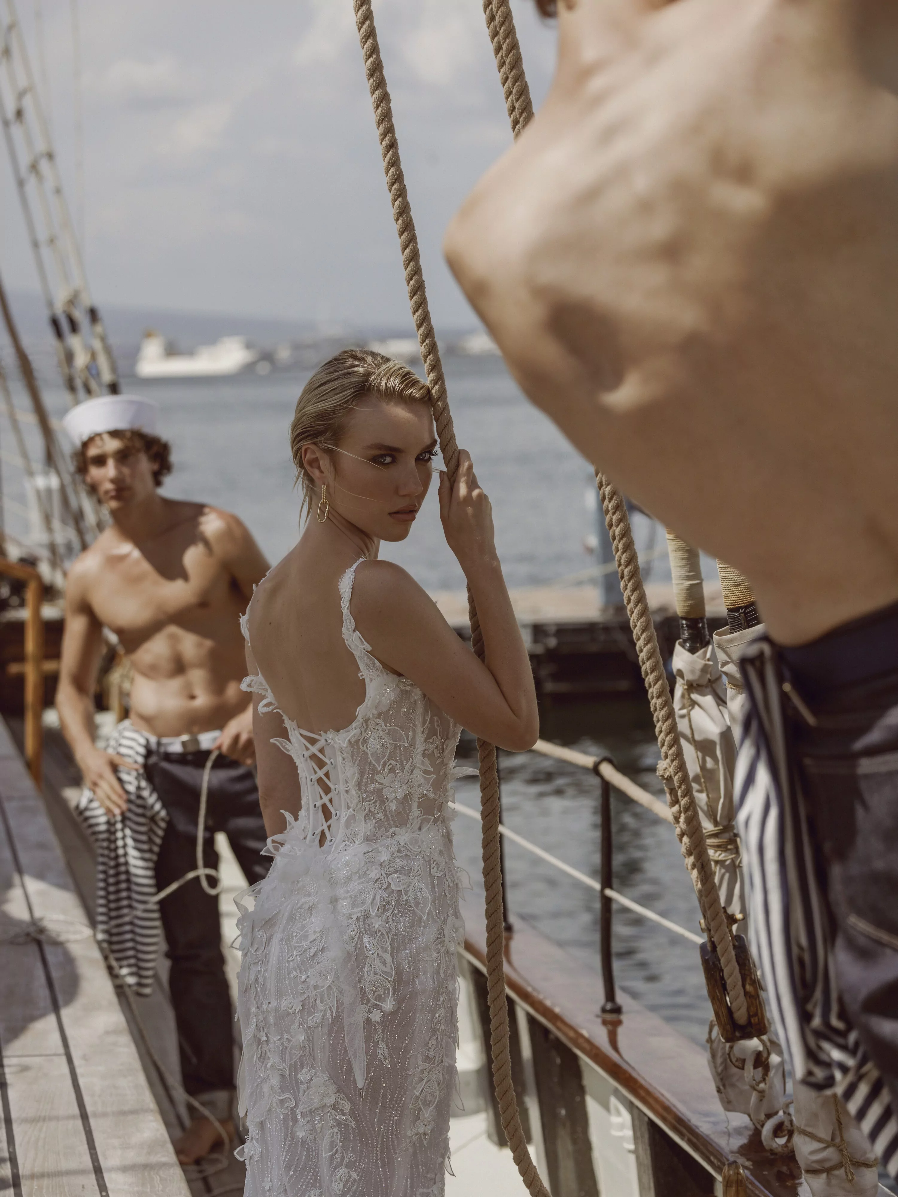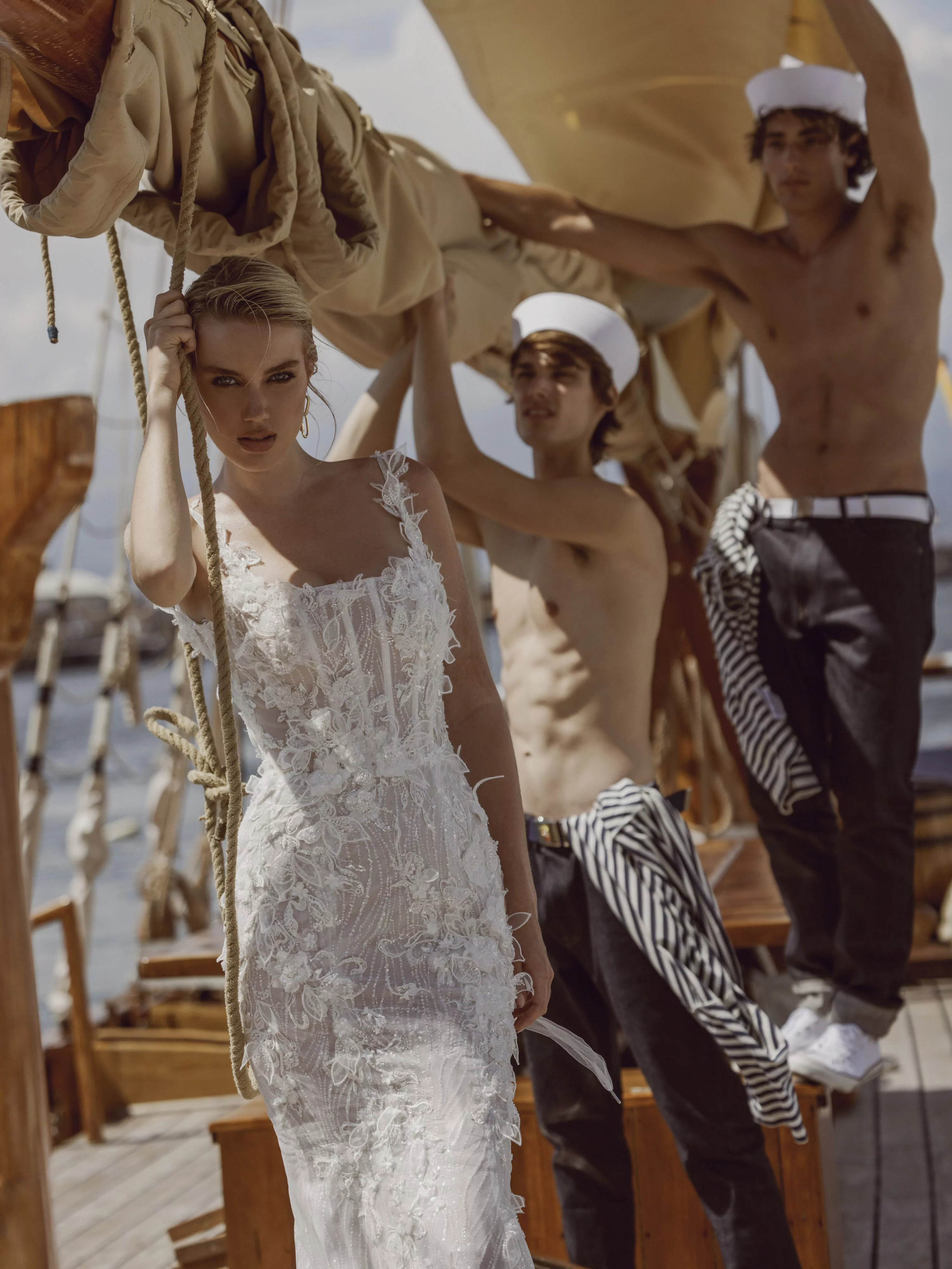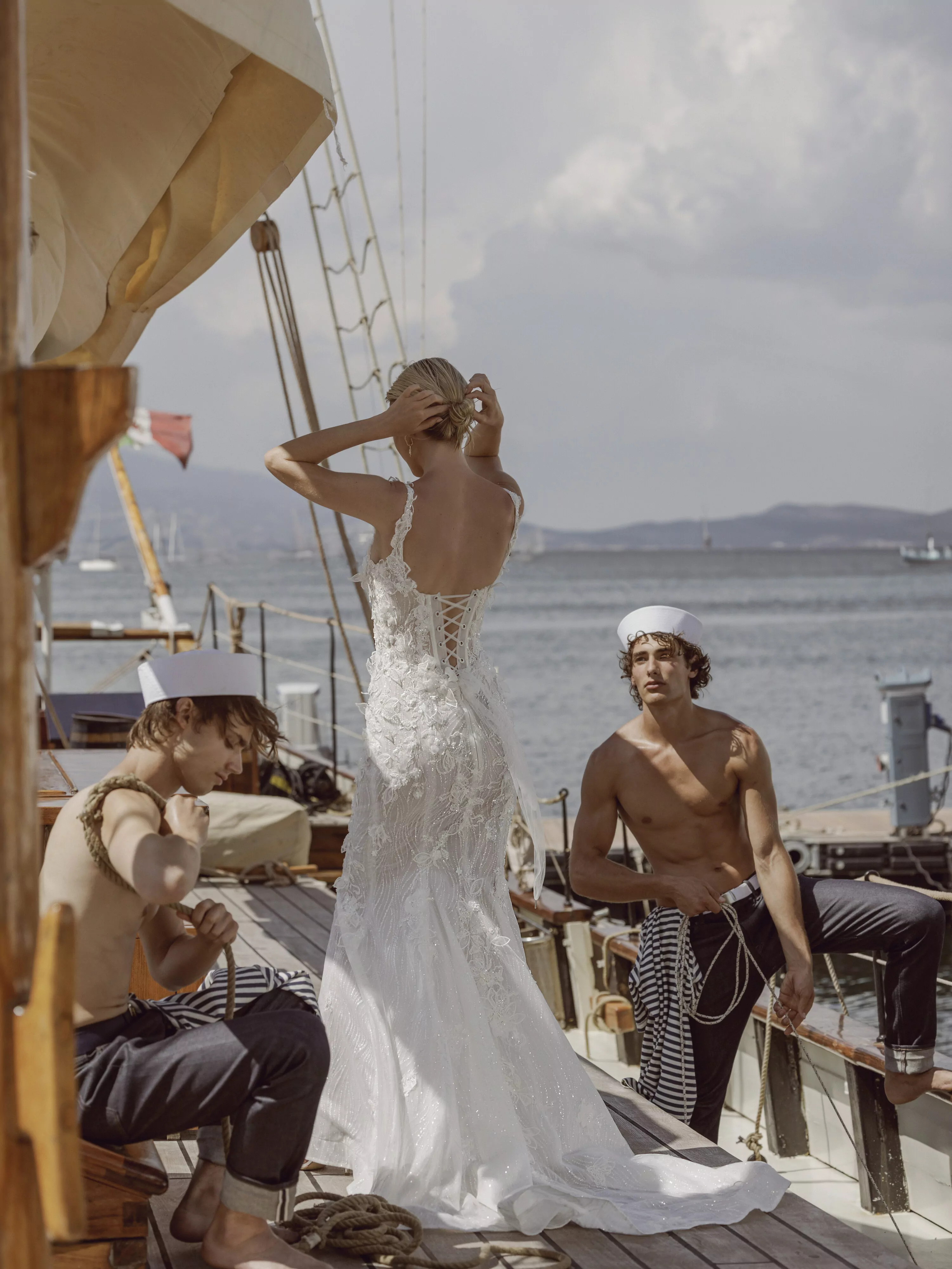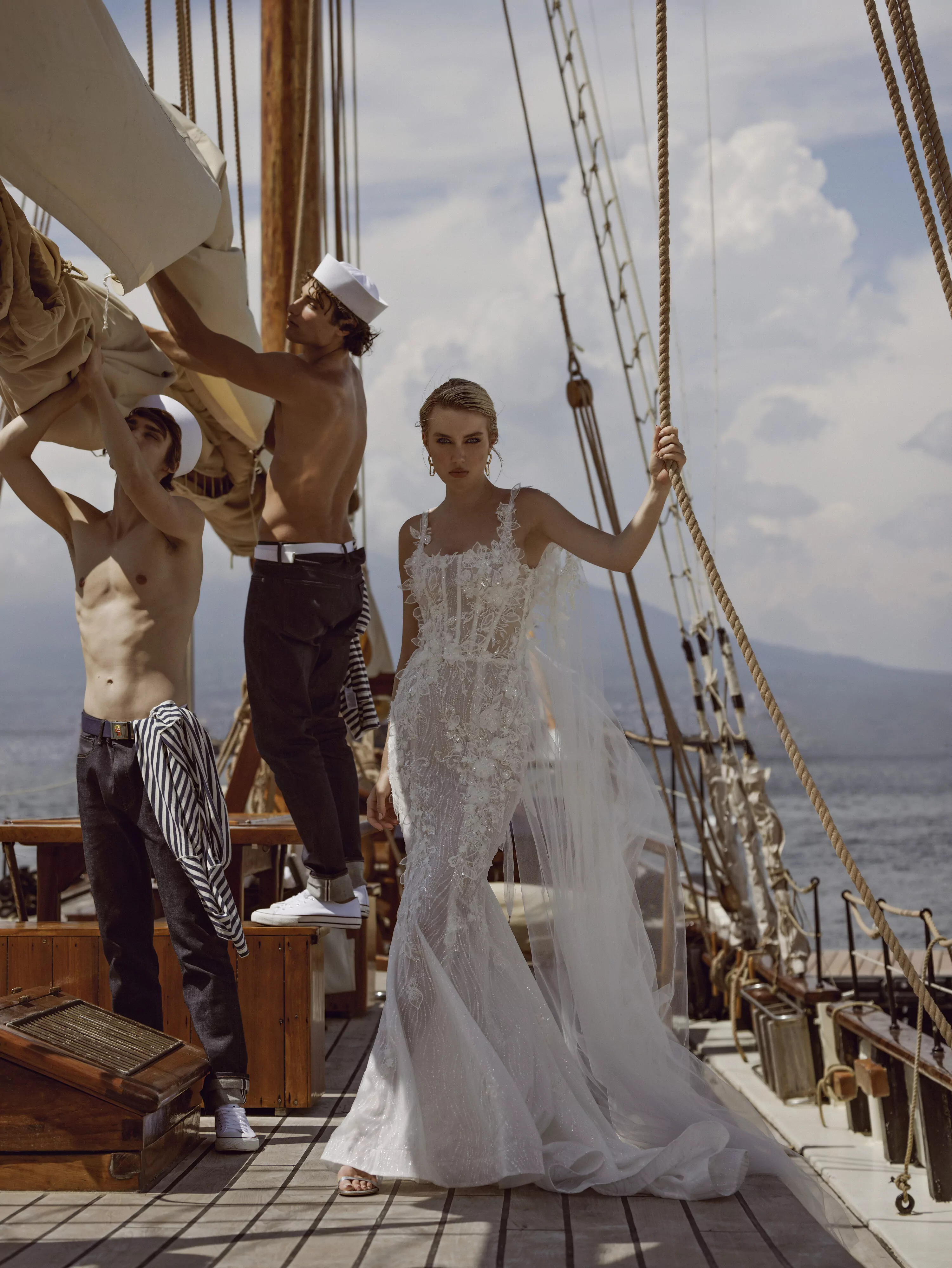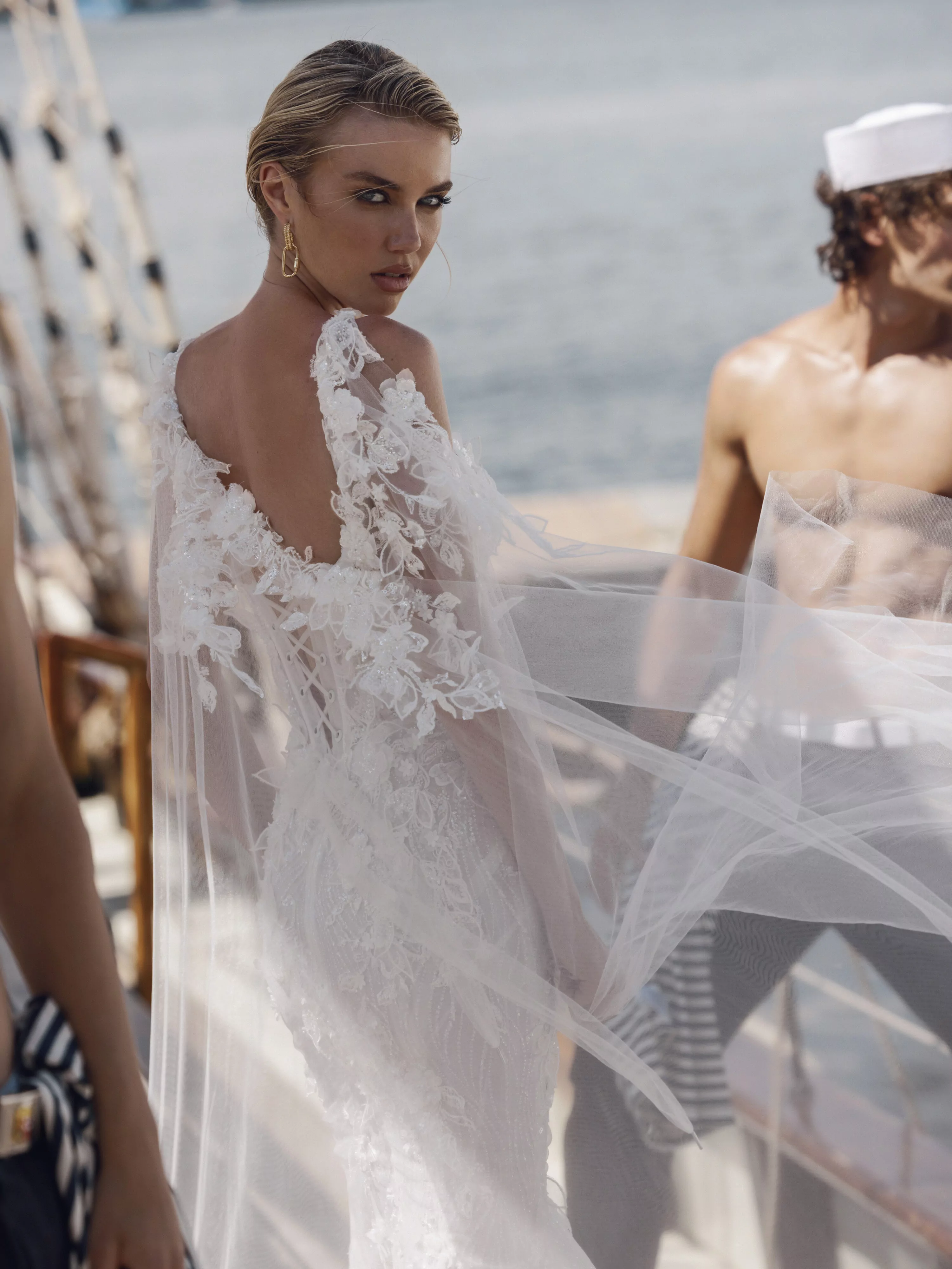 Fit and Flare dress crafted from glistening tulle and 3D floral appliques, with a mesh cape embroidered with flowers.