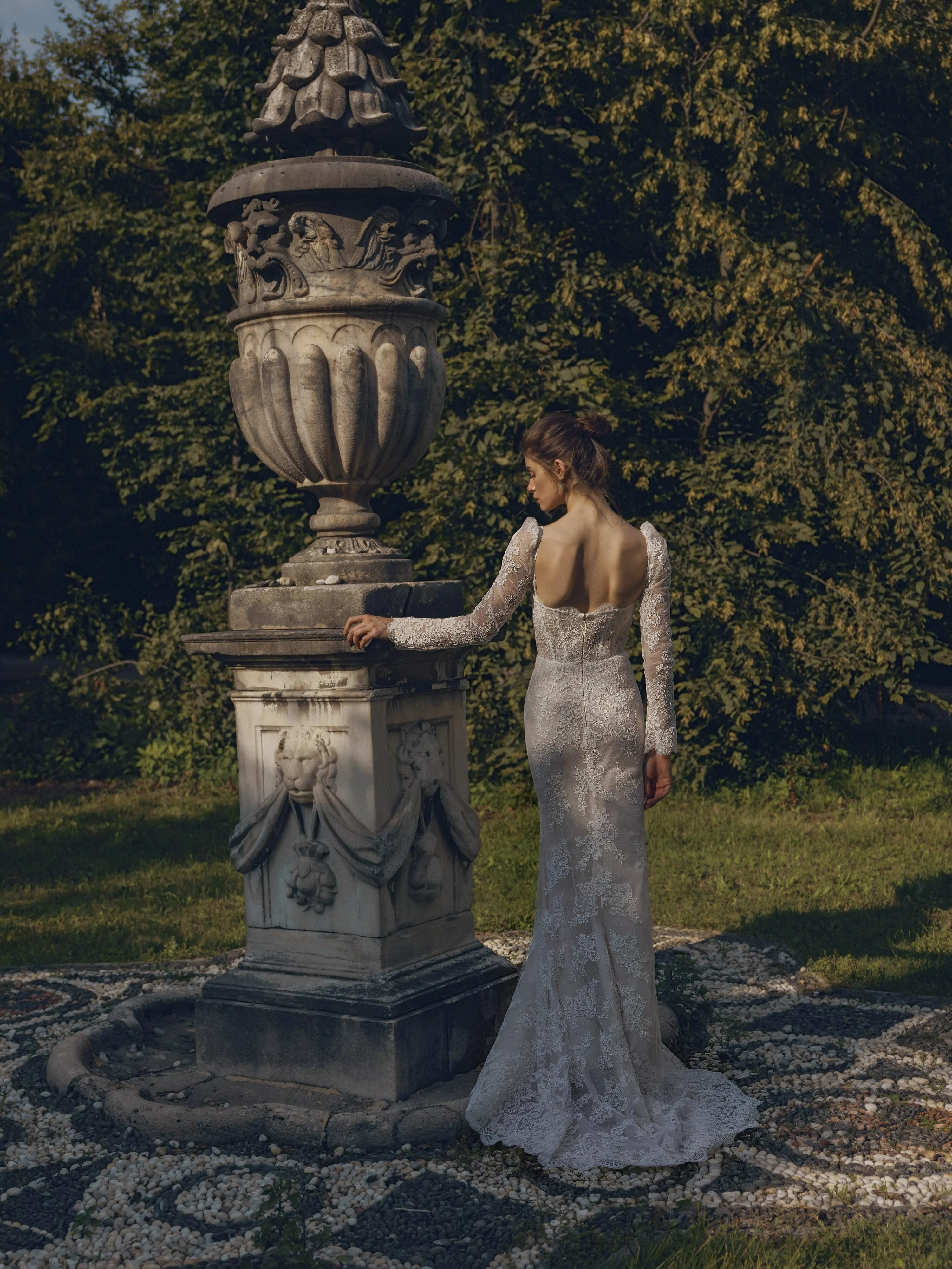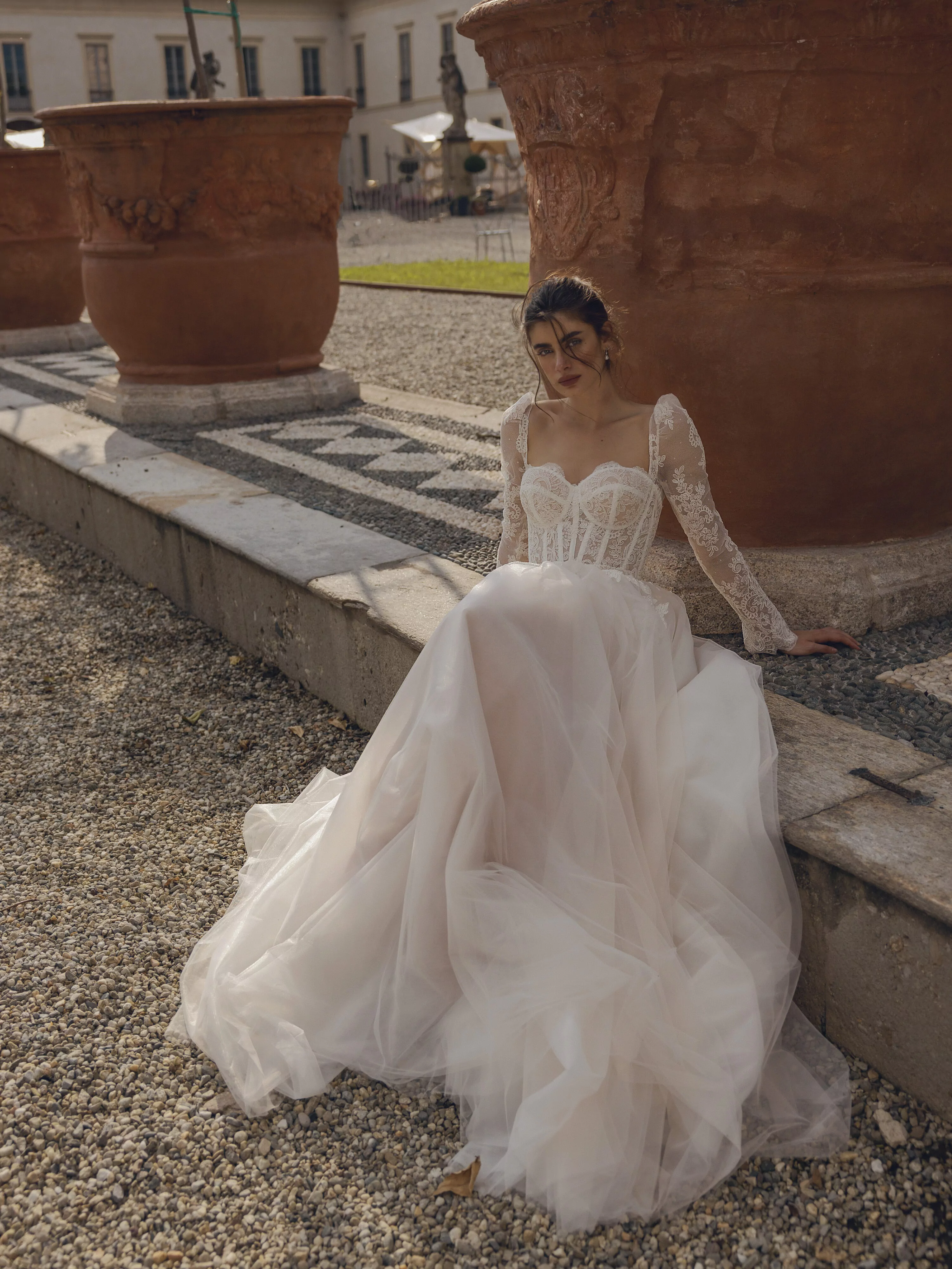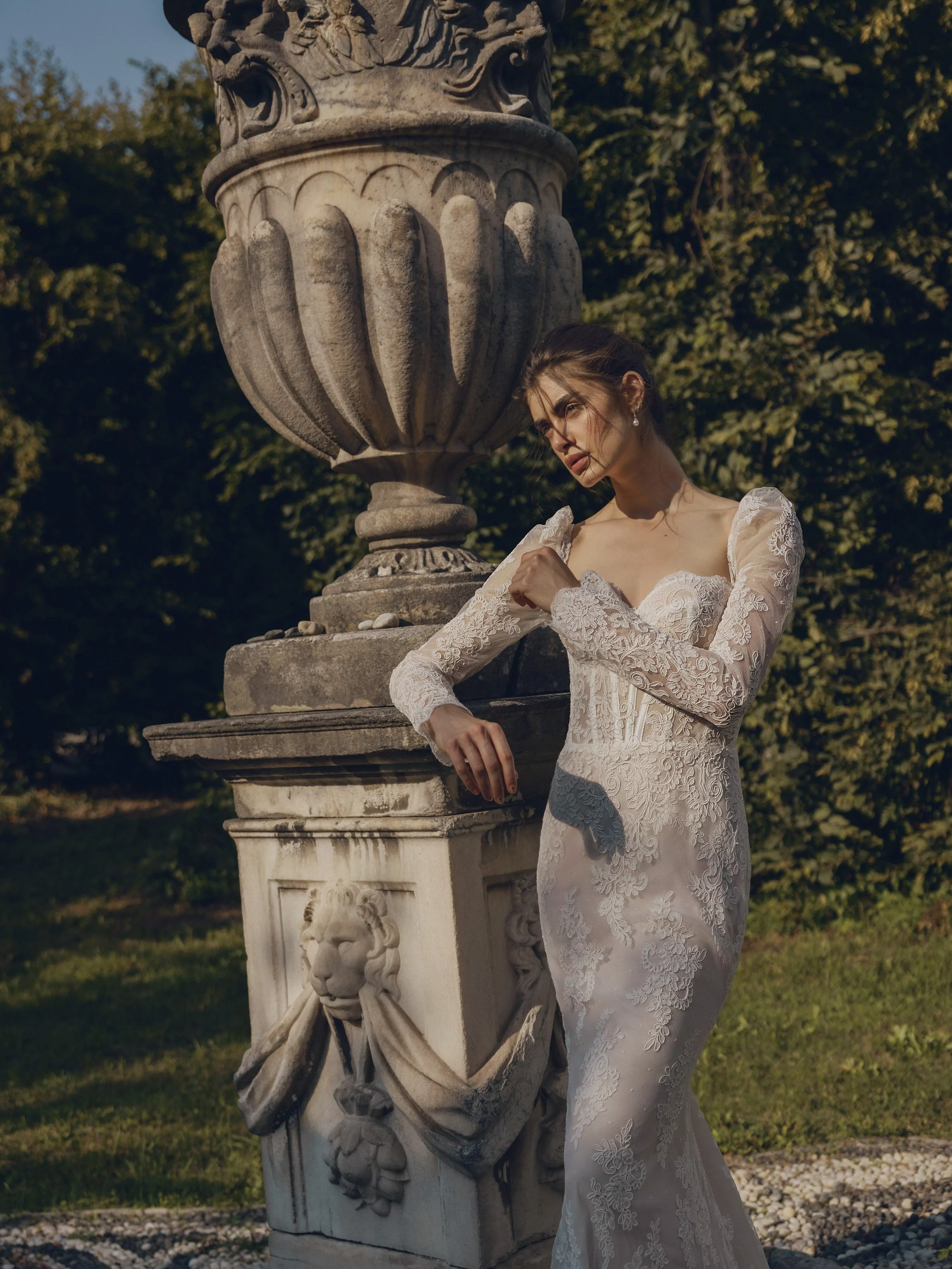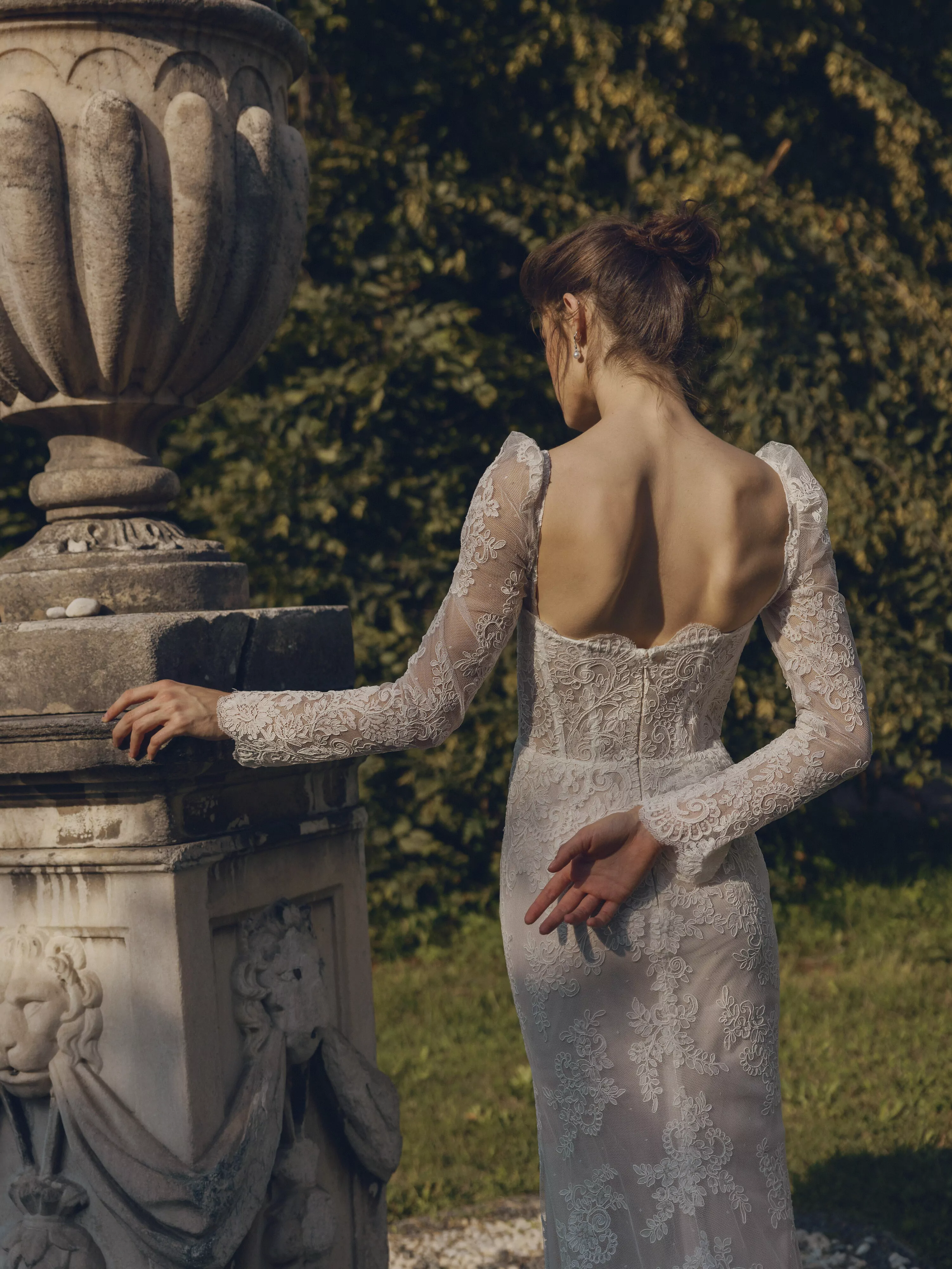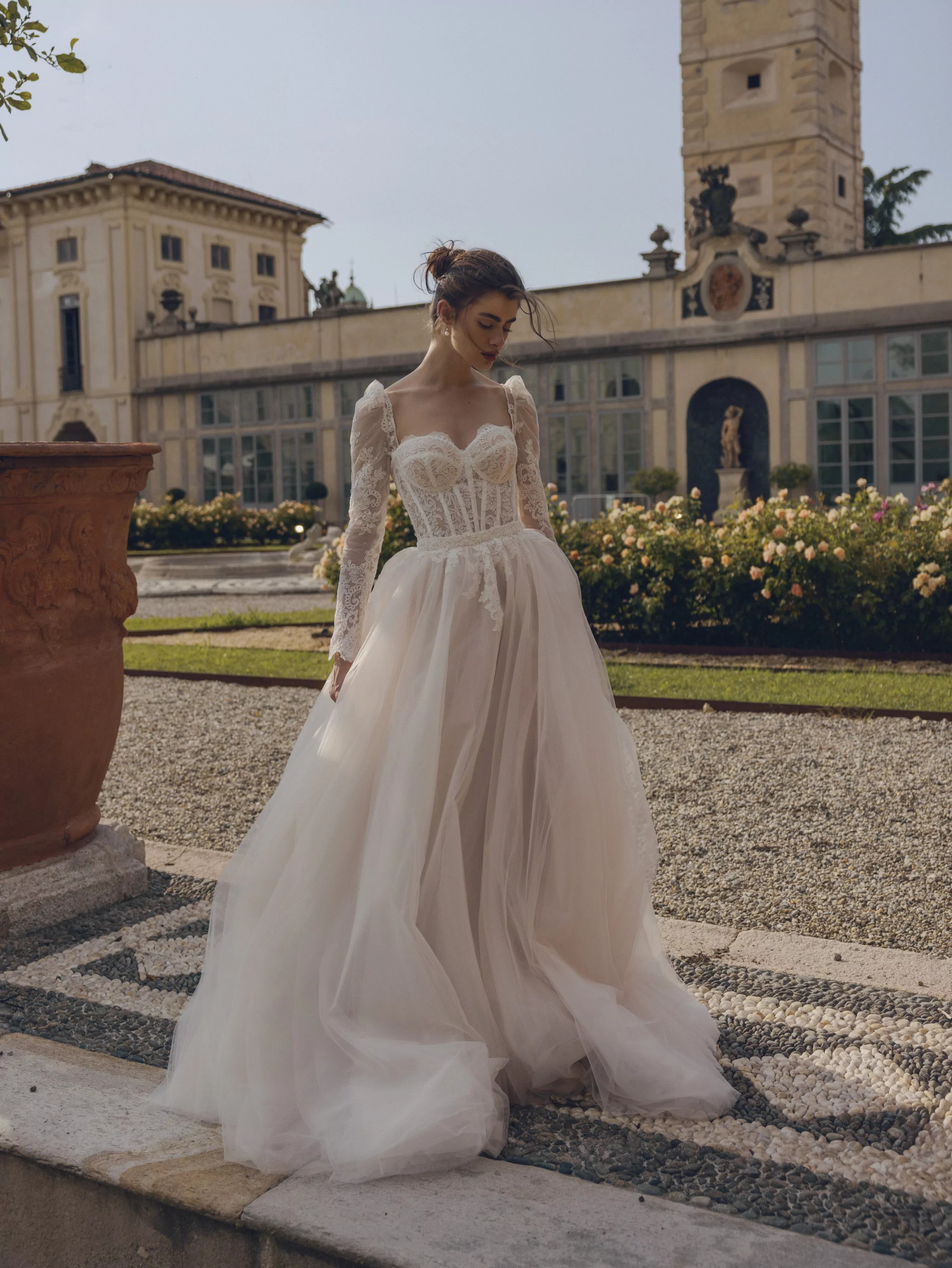 This incredible dress combines two different looks. The inside of the dress is tailored to the figure is made of cord lace and is complemented by long sleeves. A removable mesh skirt is put on top of the dress, which turns it into something completely different.