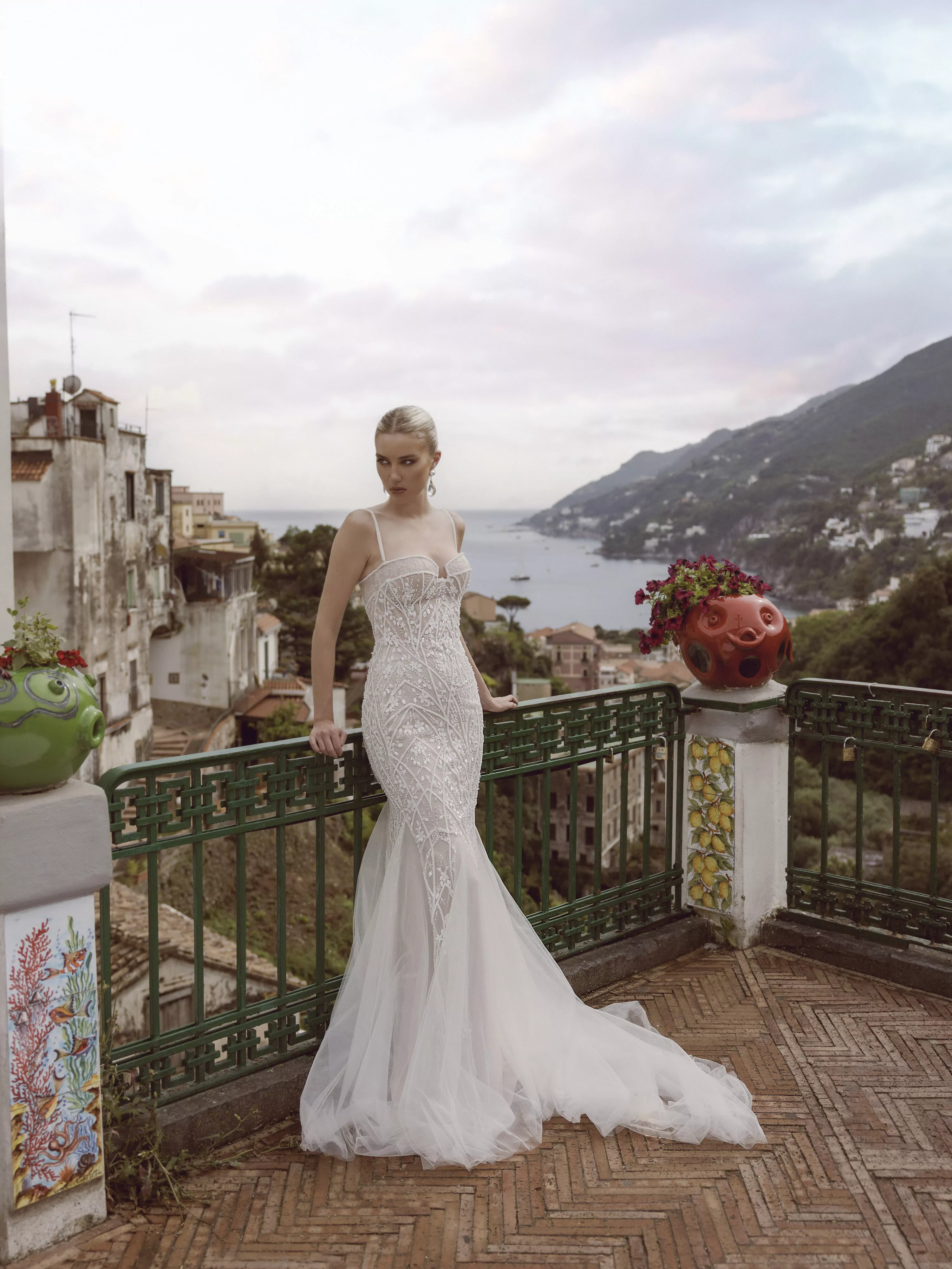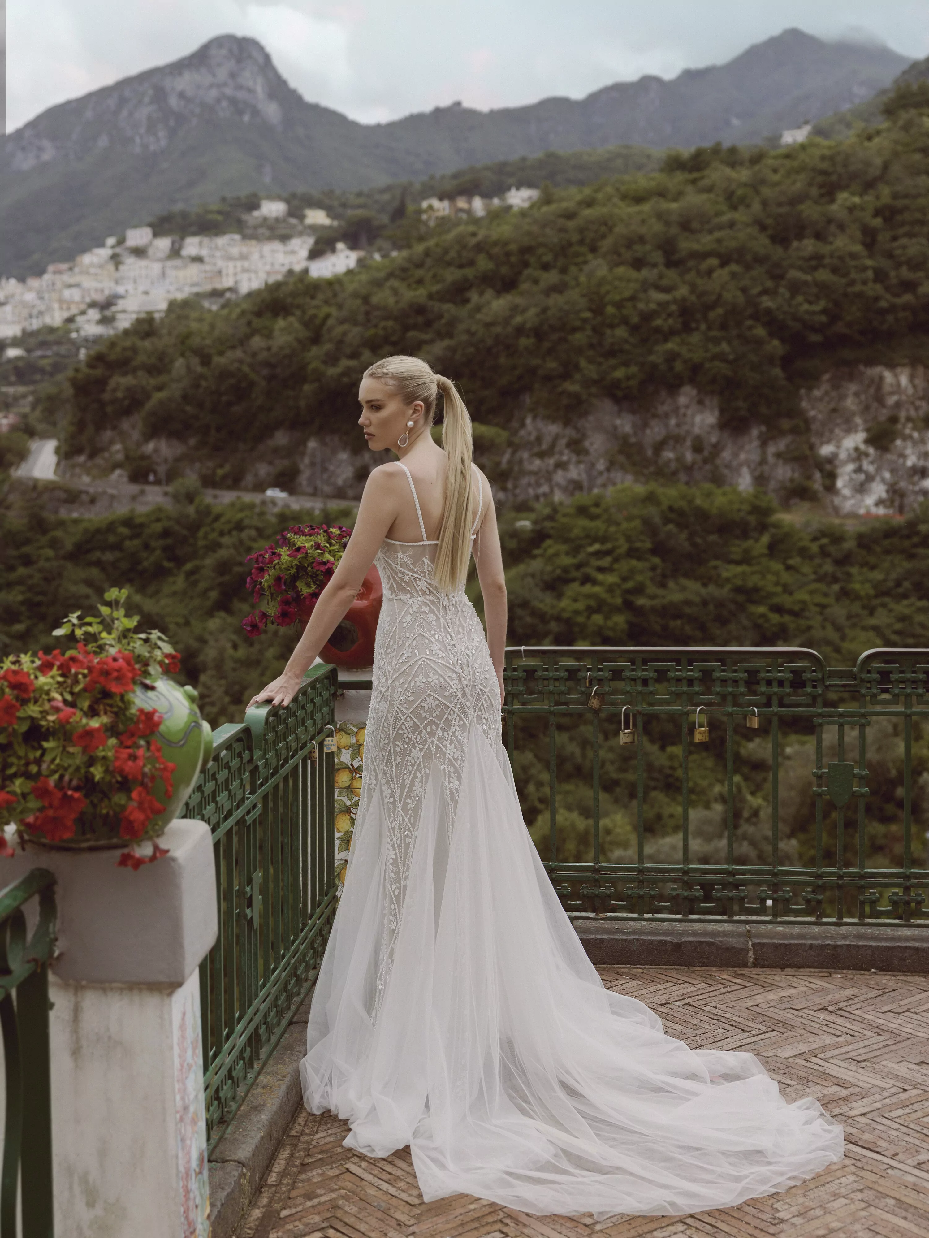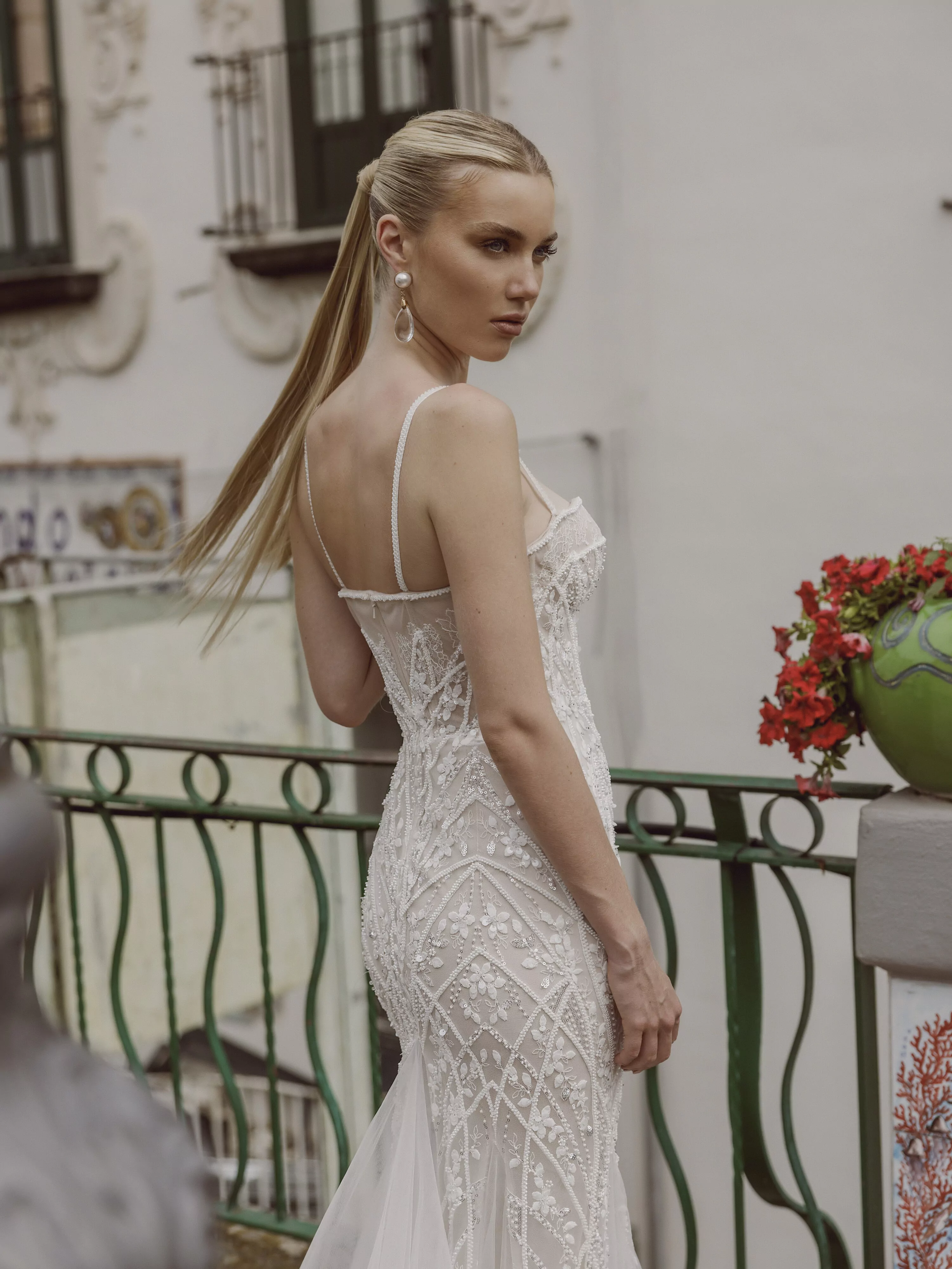 Fit and Flare dress with straps. Made of mesh with beaded lace embroidery.