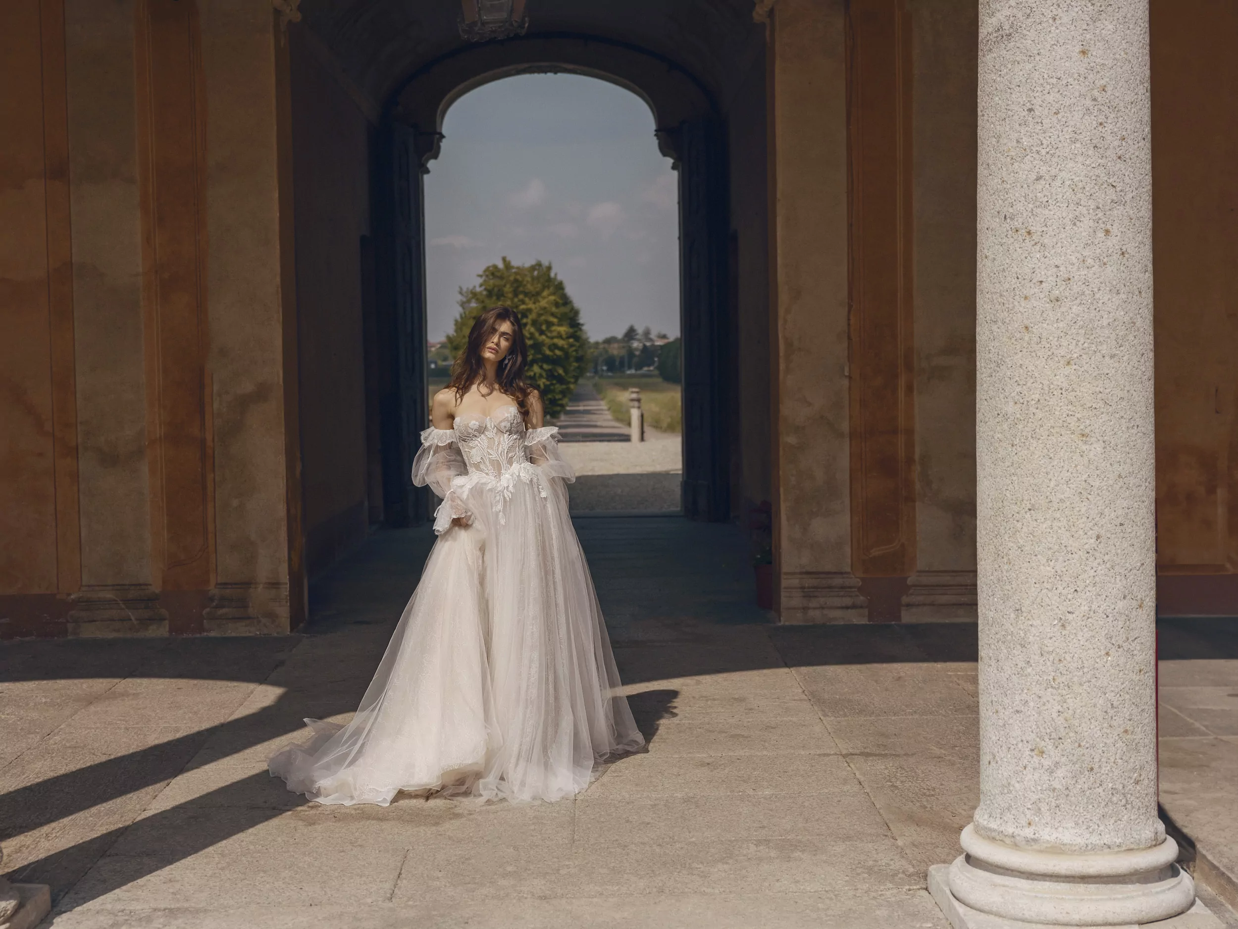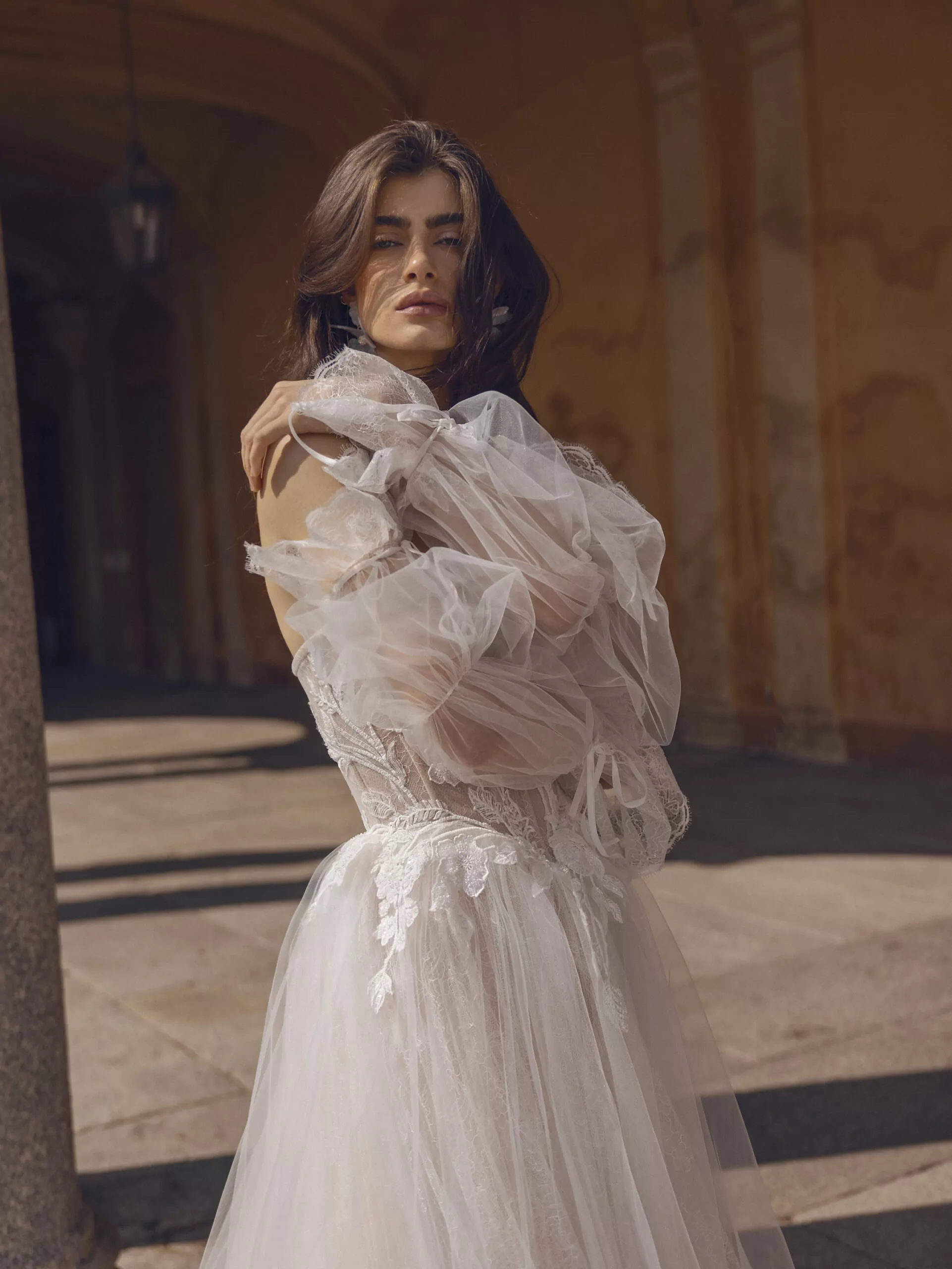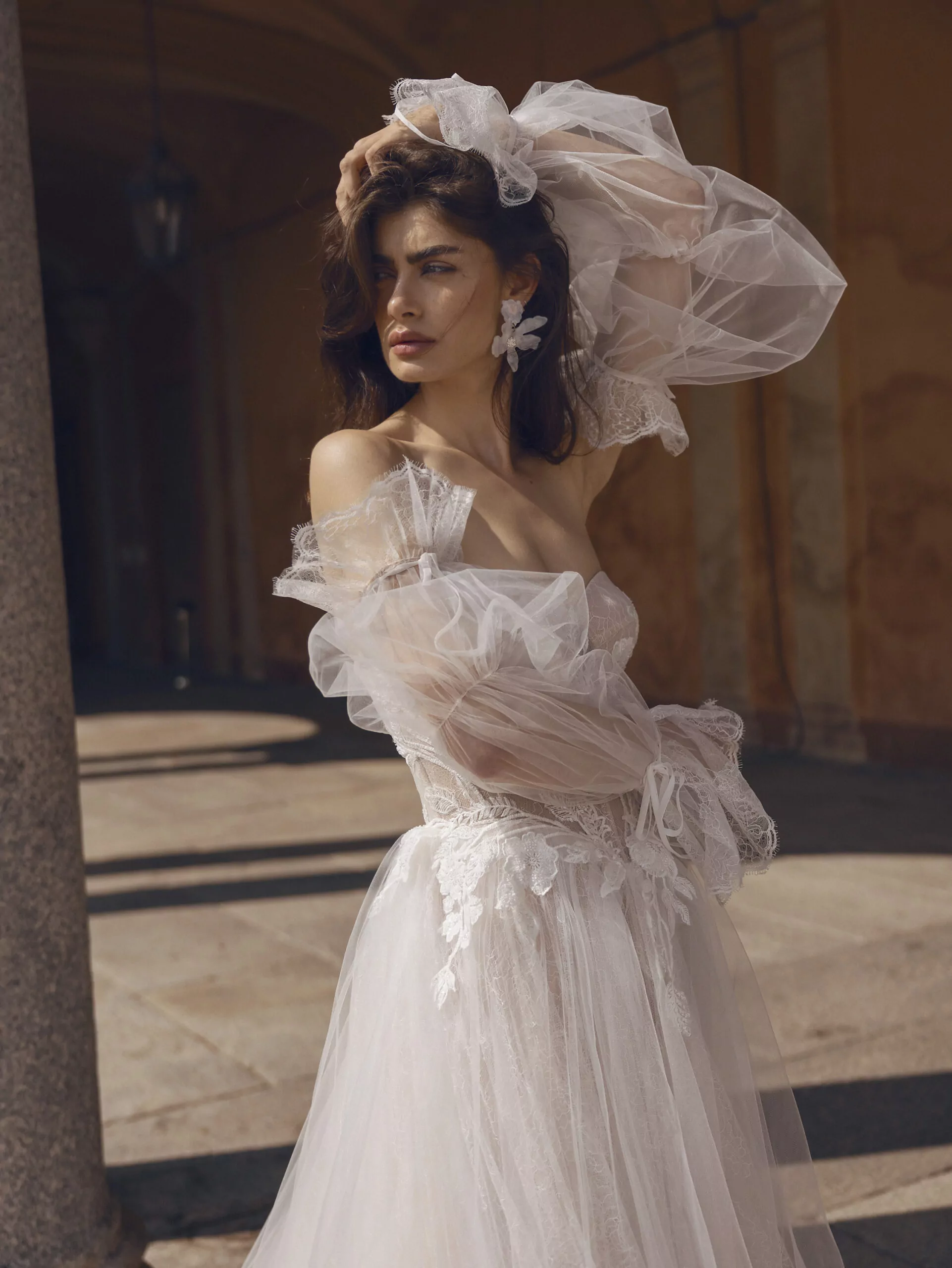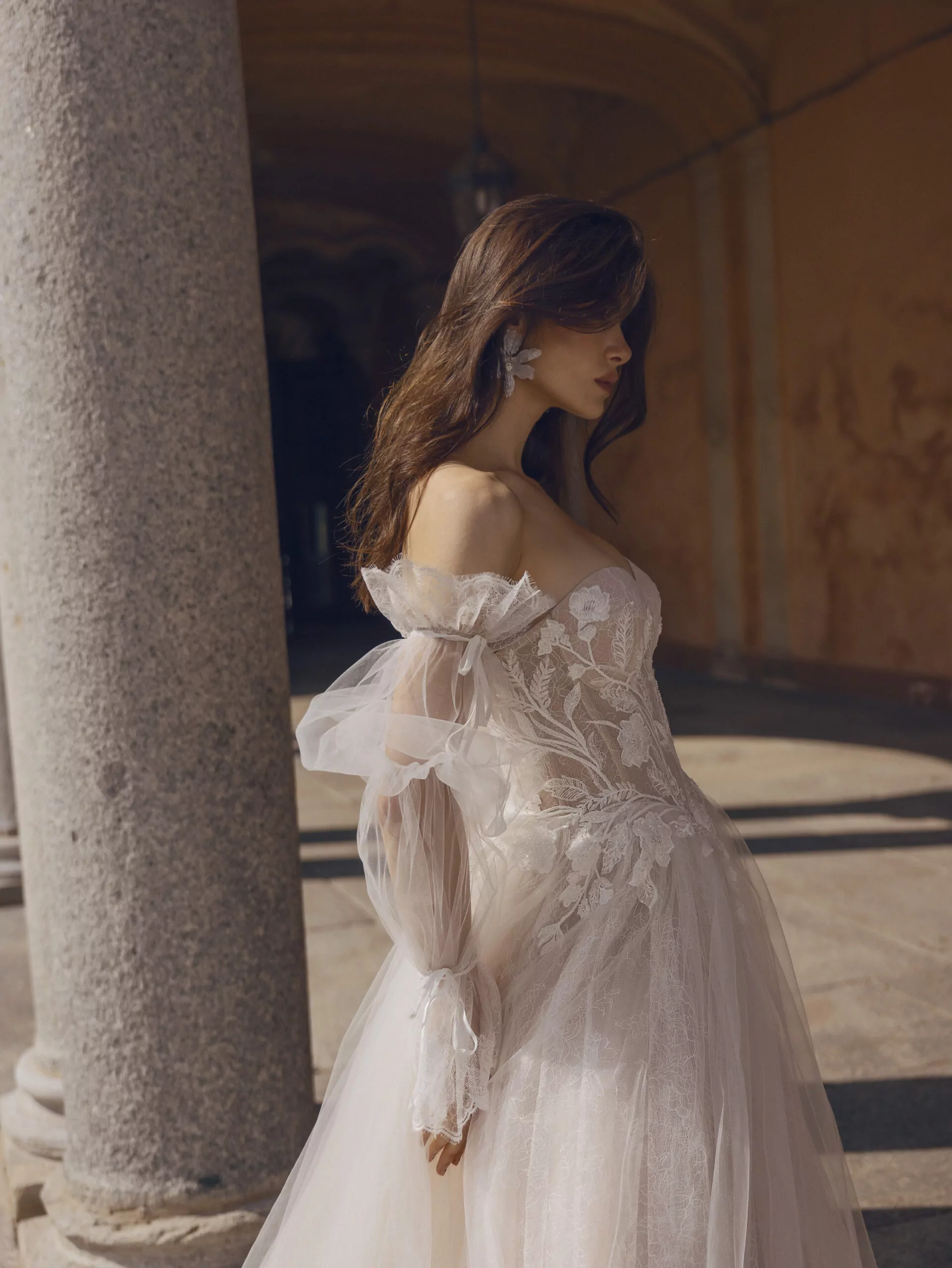 The ballgown dress combines mesh and lace with floral lace detailing and voluminous detachable sleeves for a timeless and romantic look.