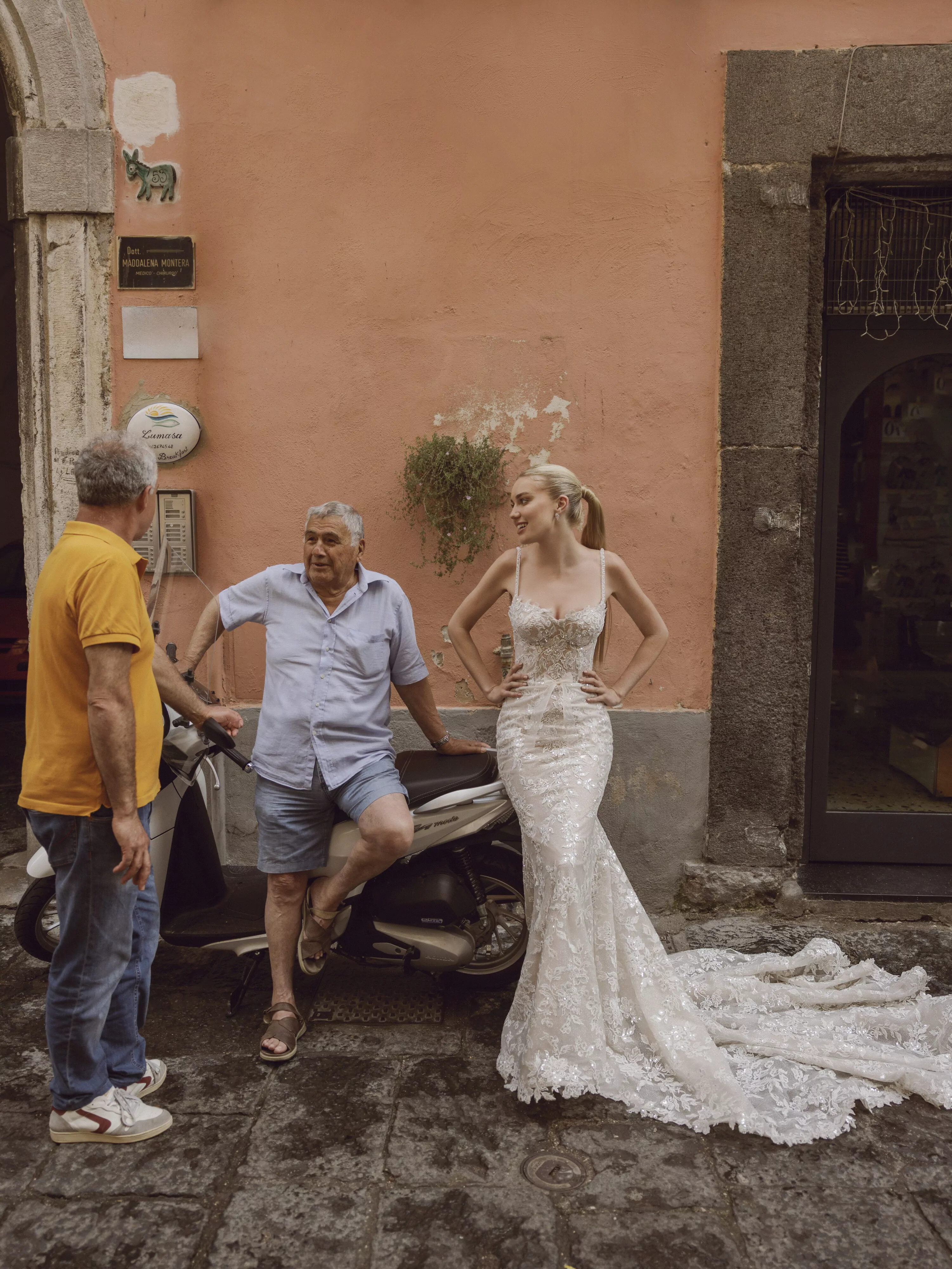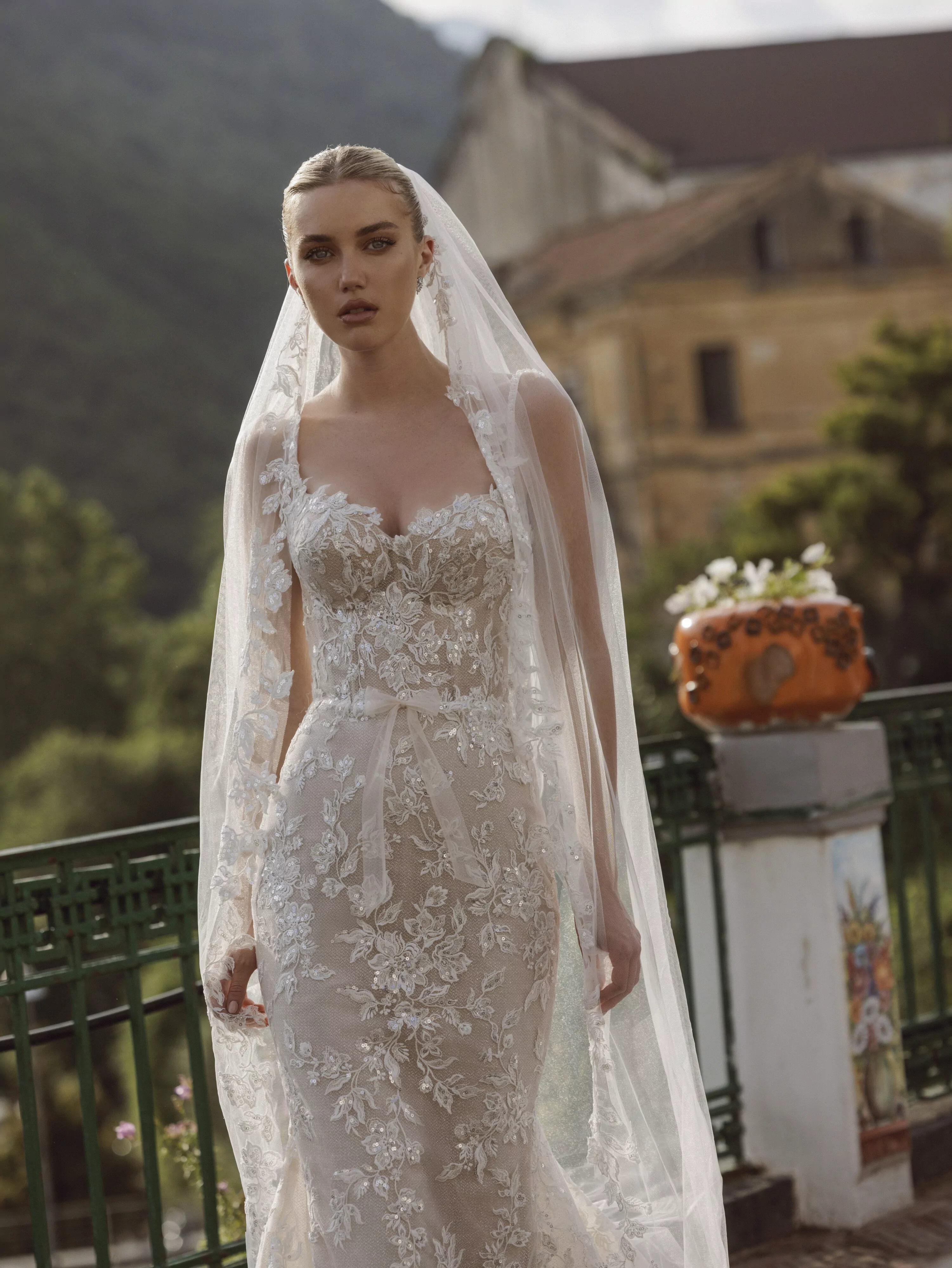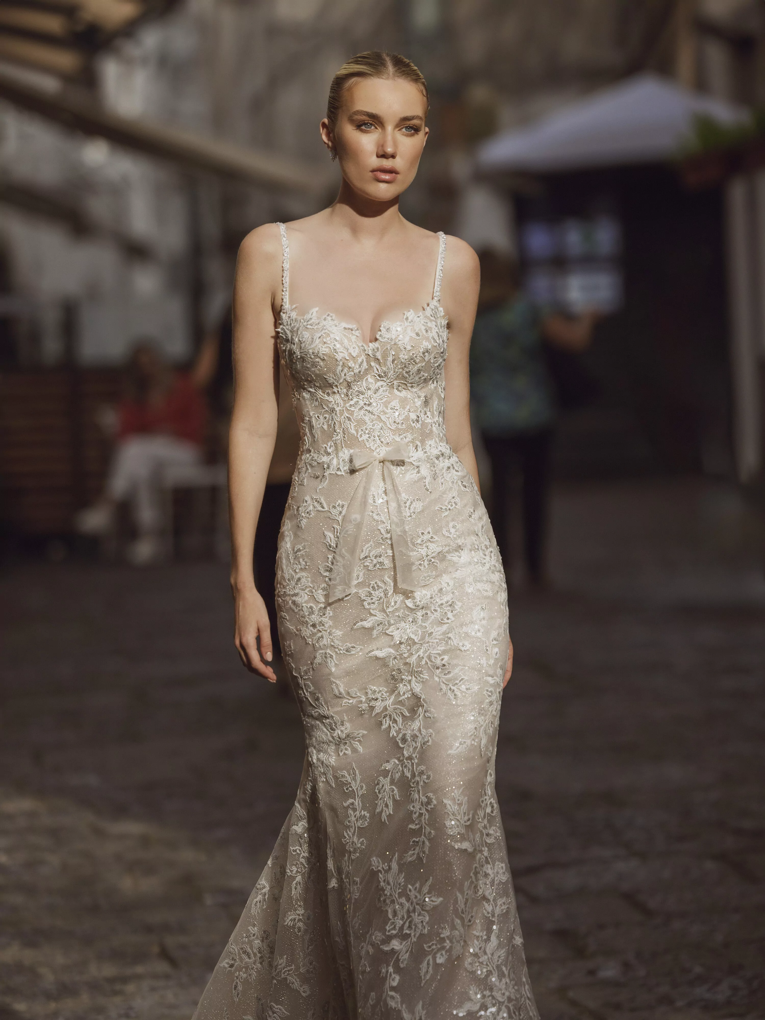 Lace Fit and Flare Dress with shimmering lace and straps.