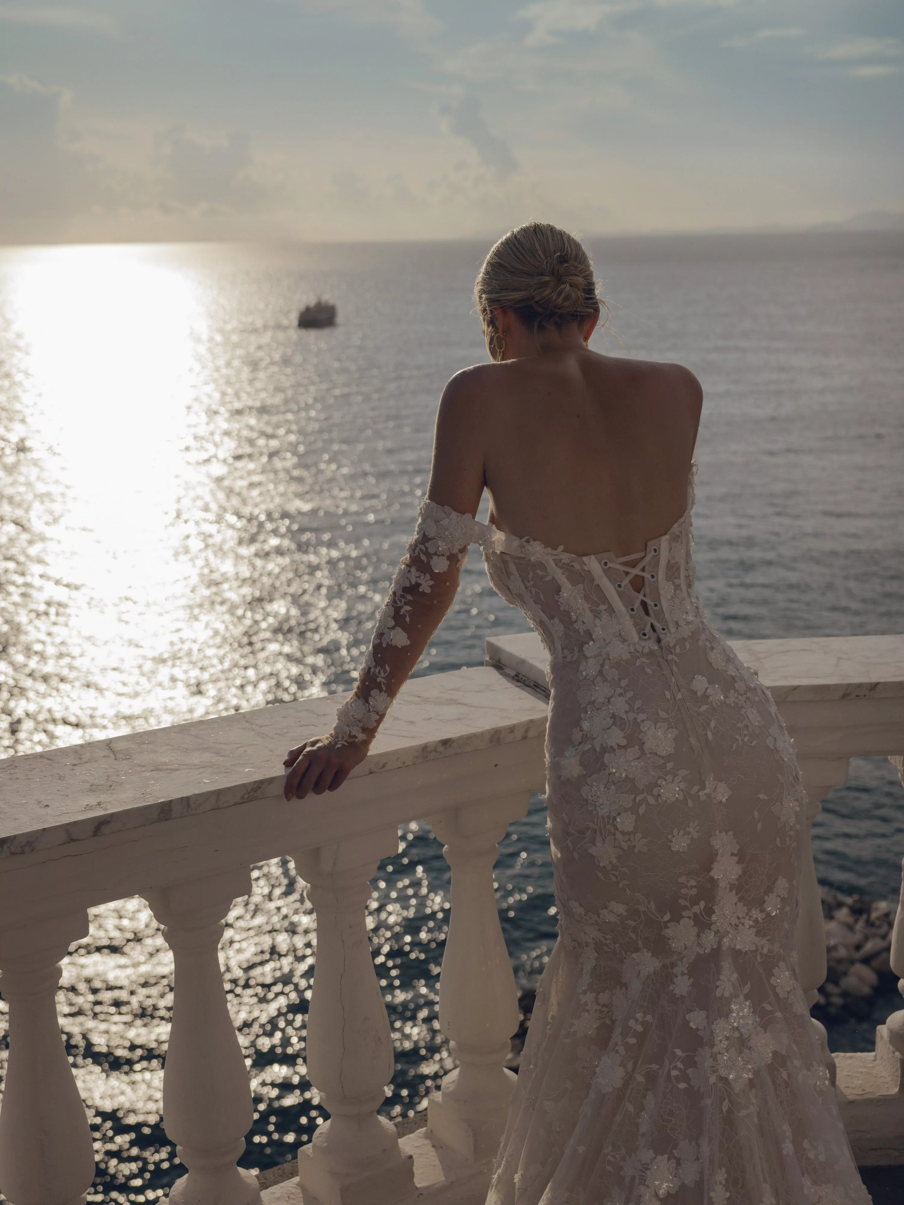 Mermaid dress with dropped long sleeves and embroidered floral lace. The gown is finished with chapel length train.