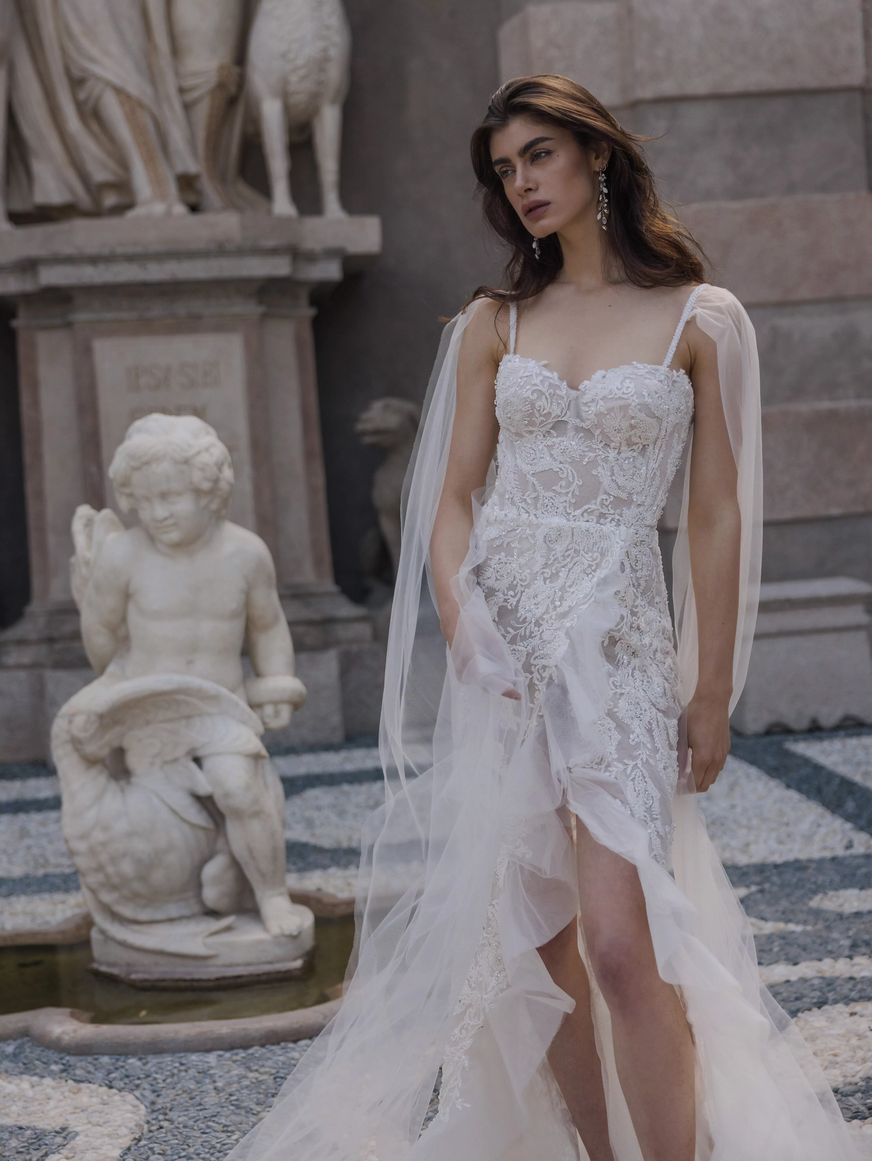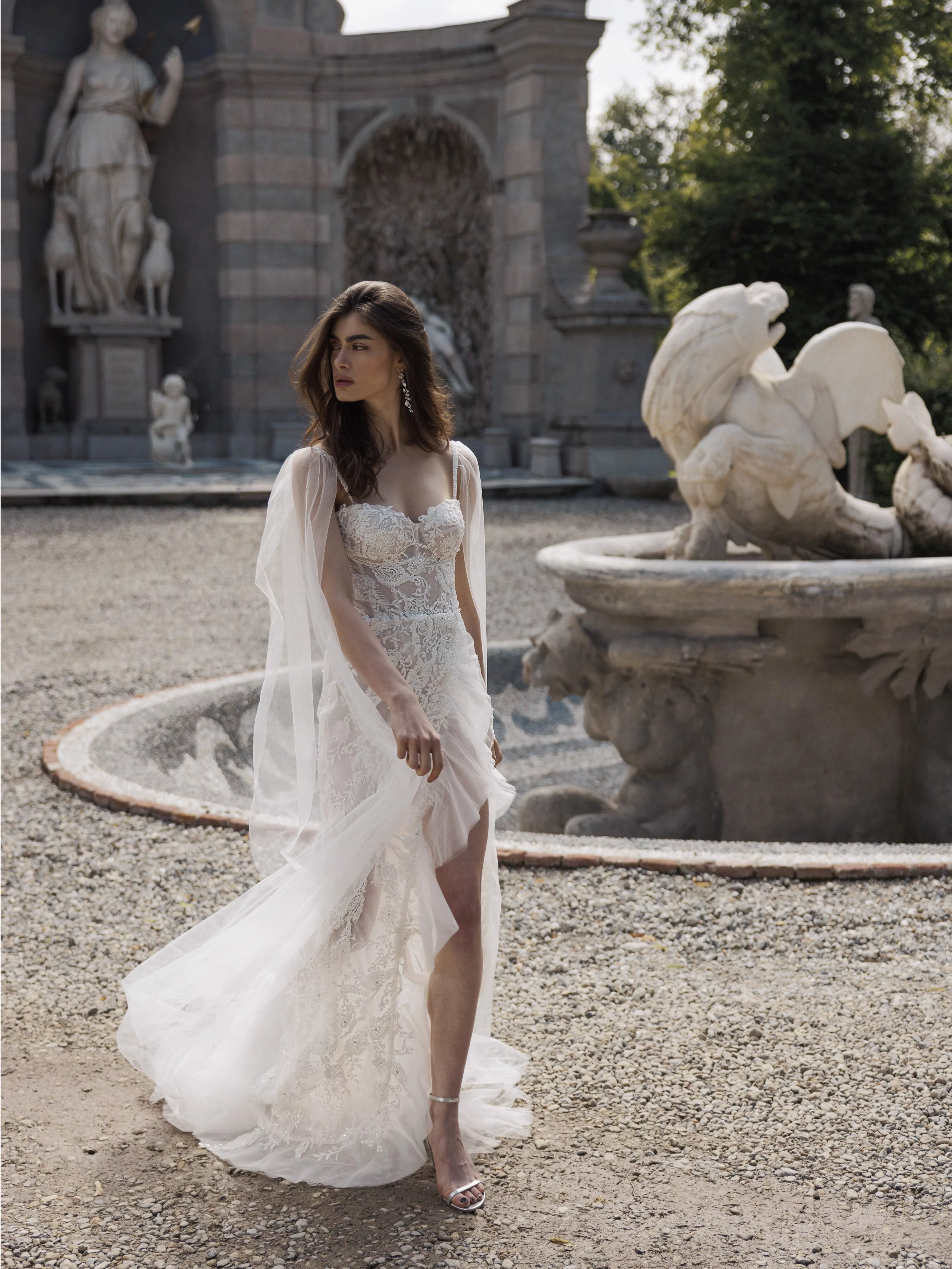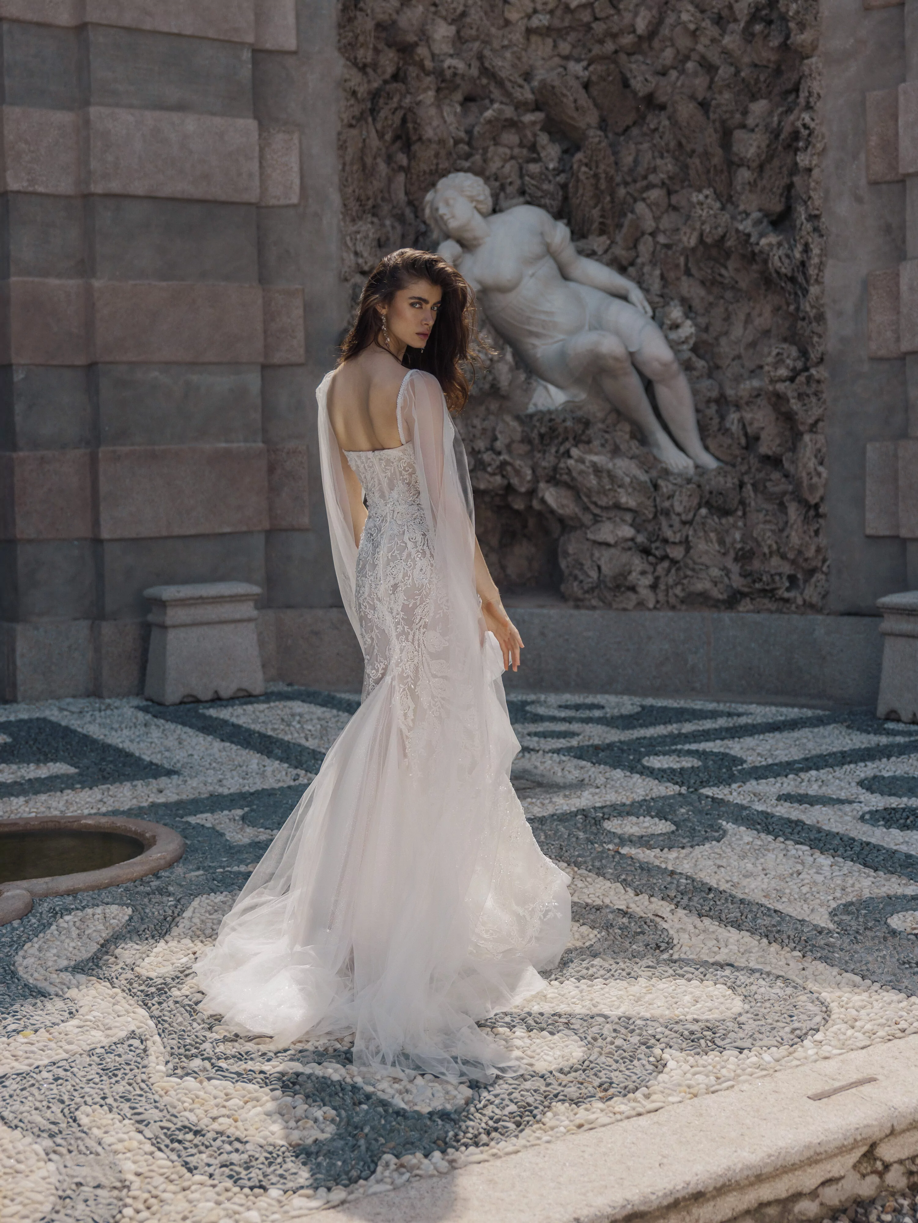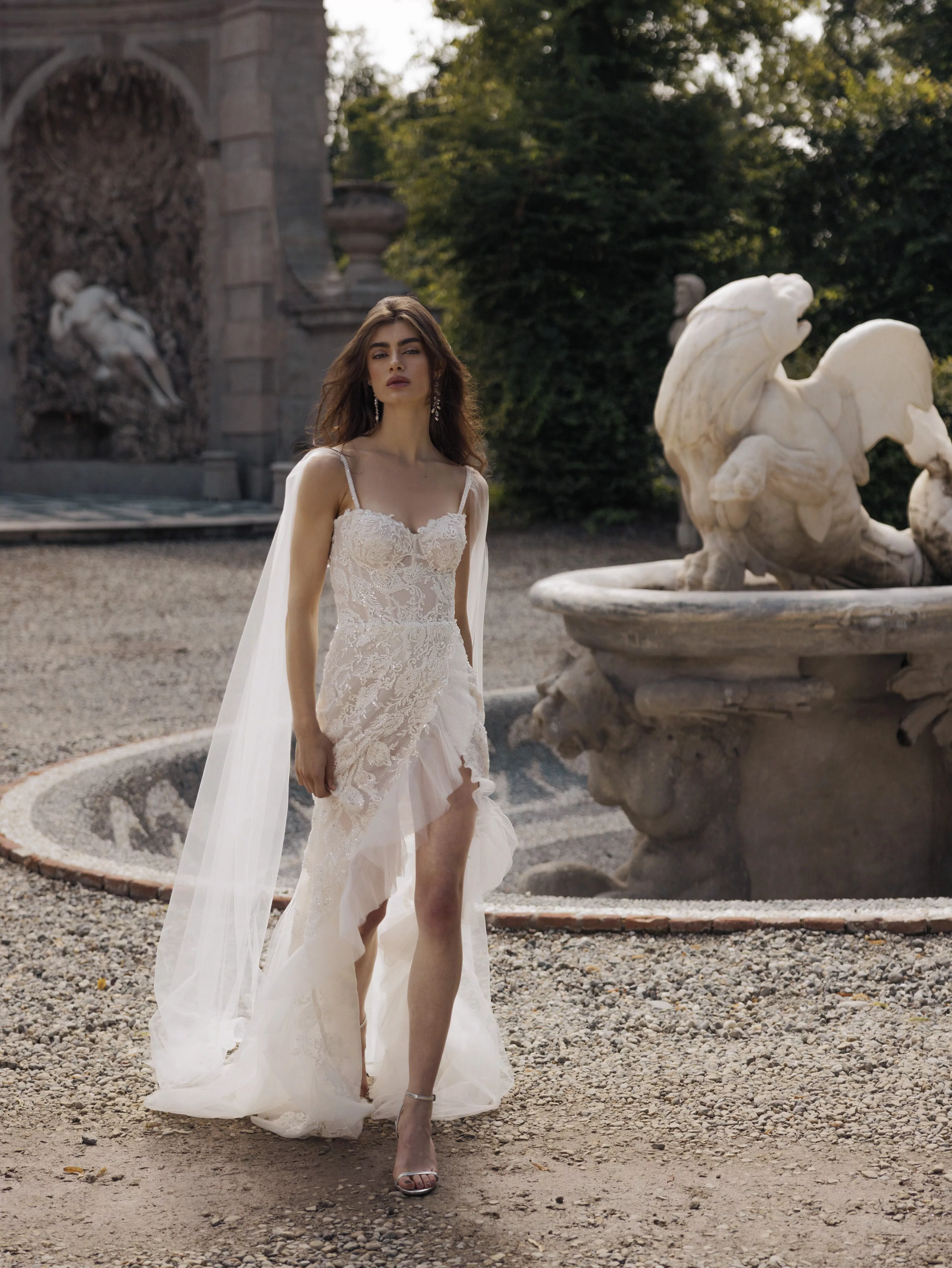 Amazing dress made of embroidered lace and delicate mesh with a slit on the leg, complemented by ruffles along the entire slit and a removable mesh cape.