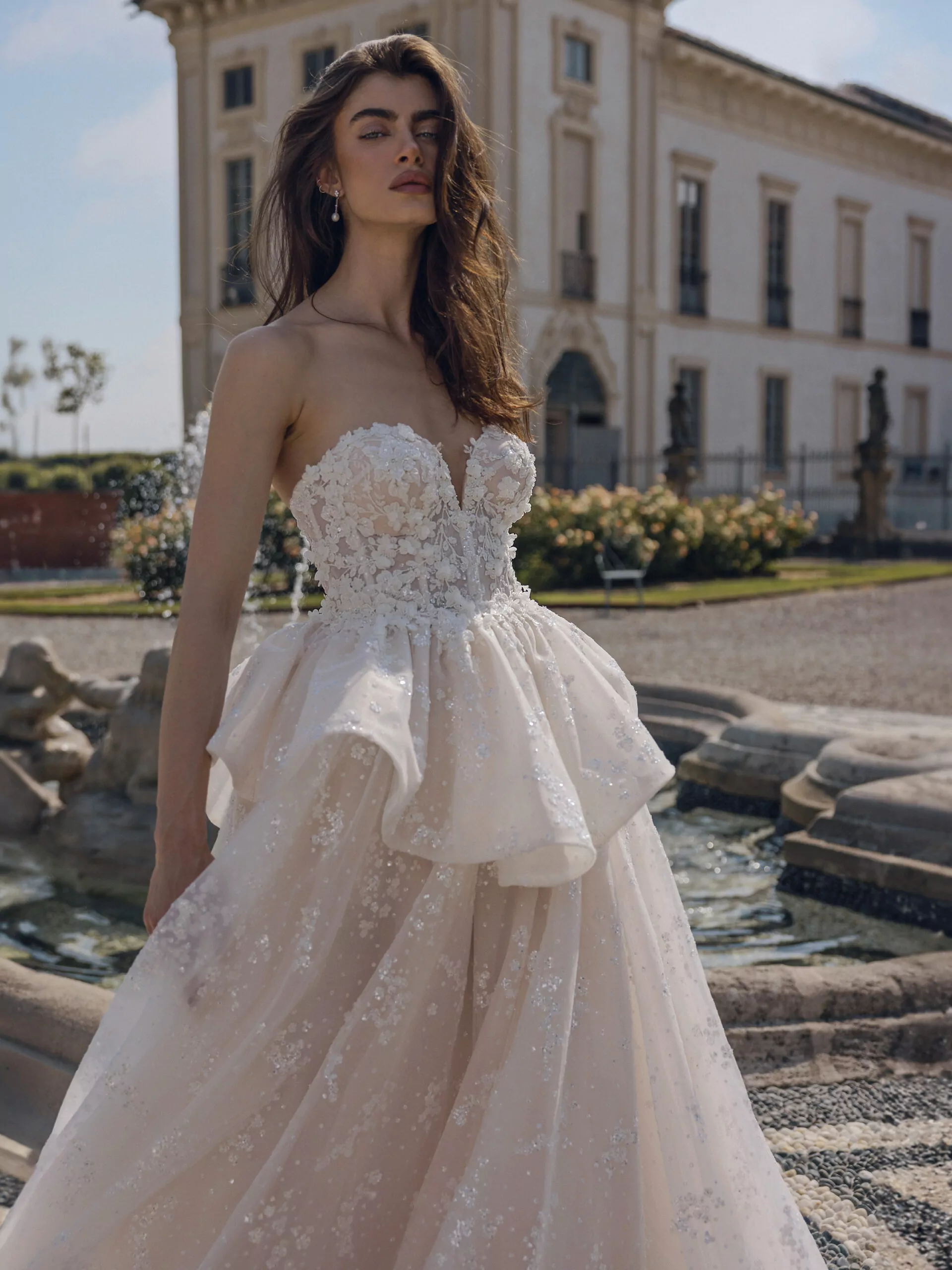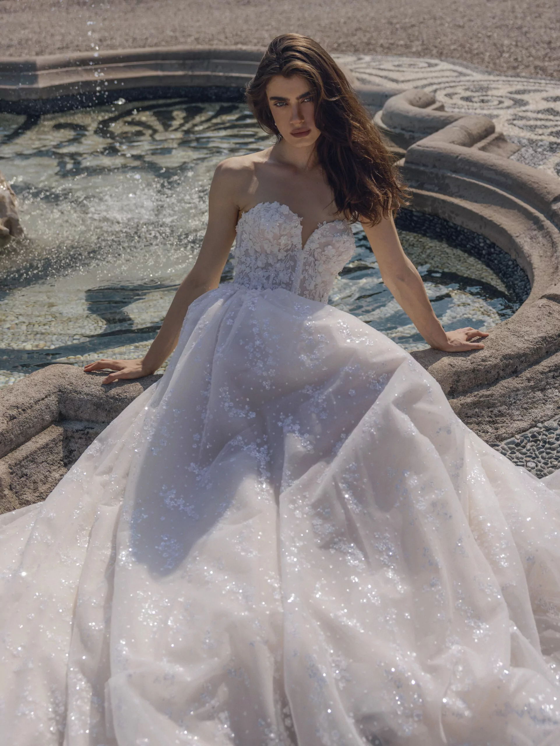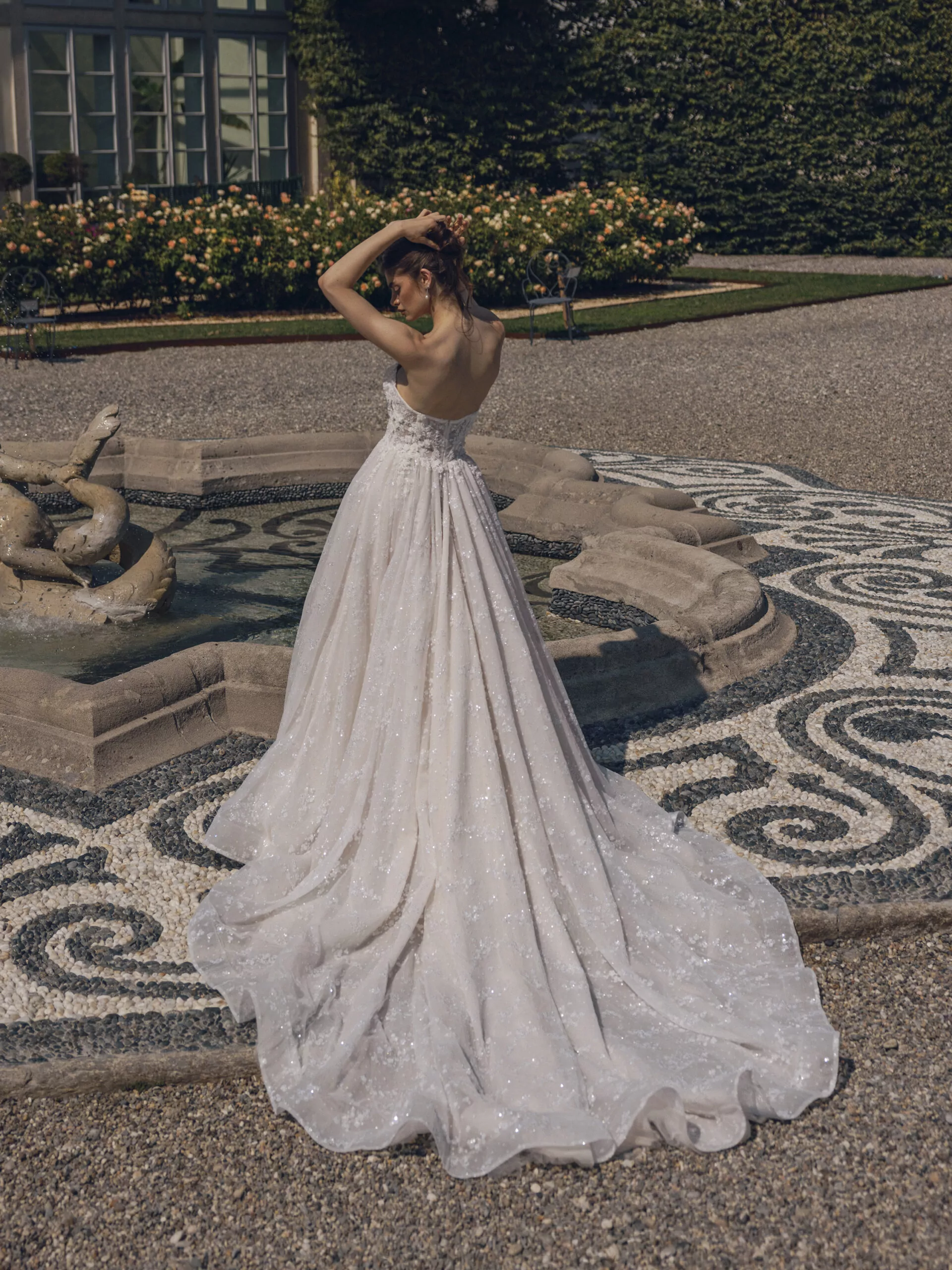 This A-line dress crafted for real queens. Made of lace and complemented with embroidered lace. The gown is decorated with removable lace sleeves.