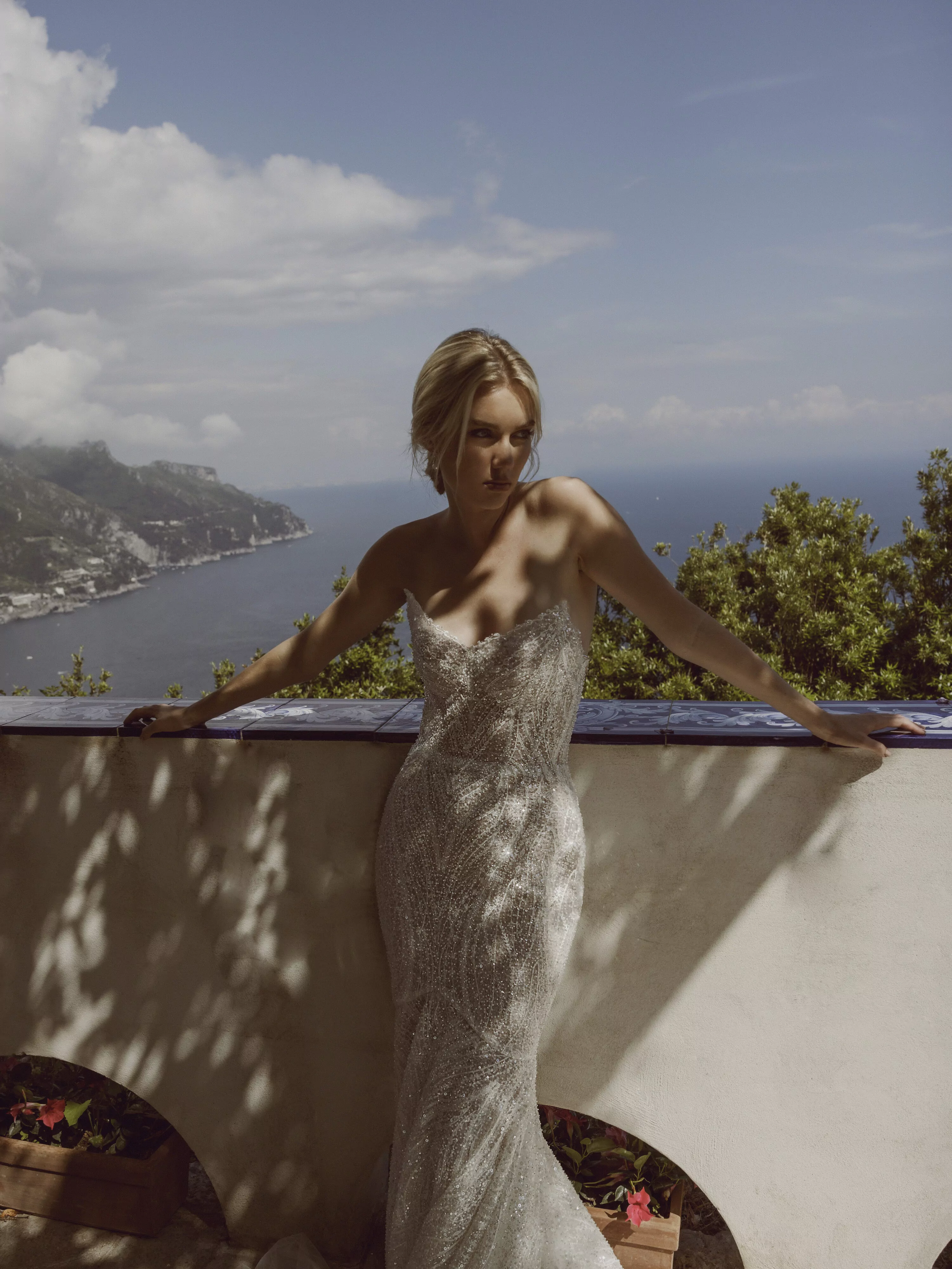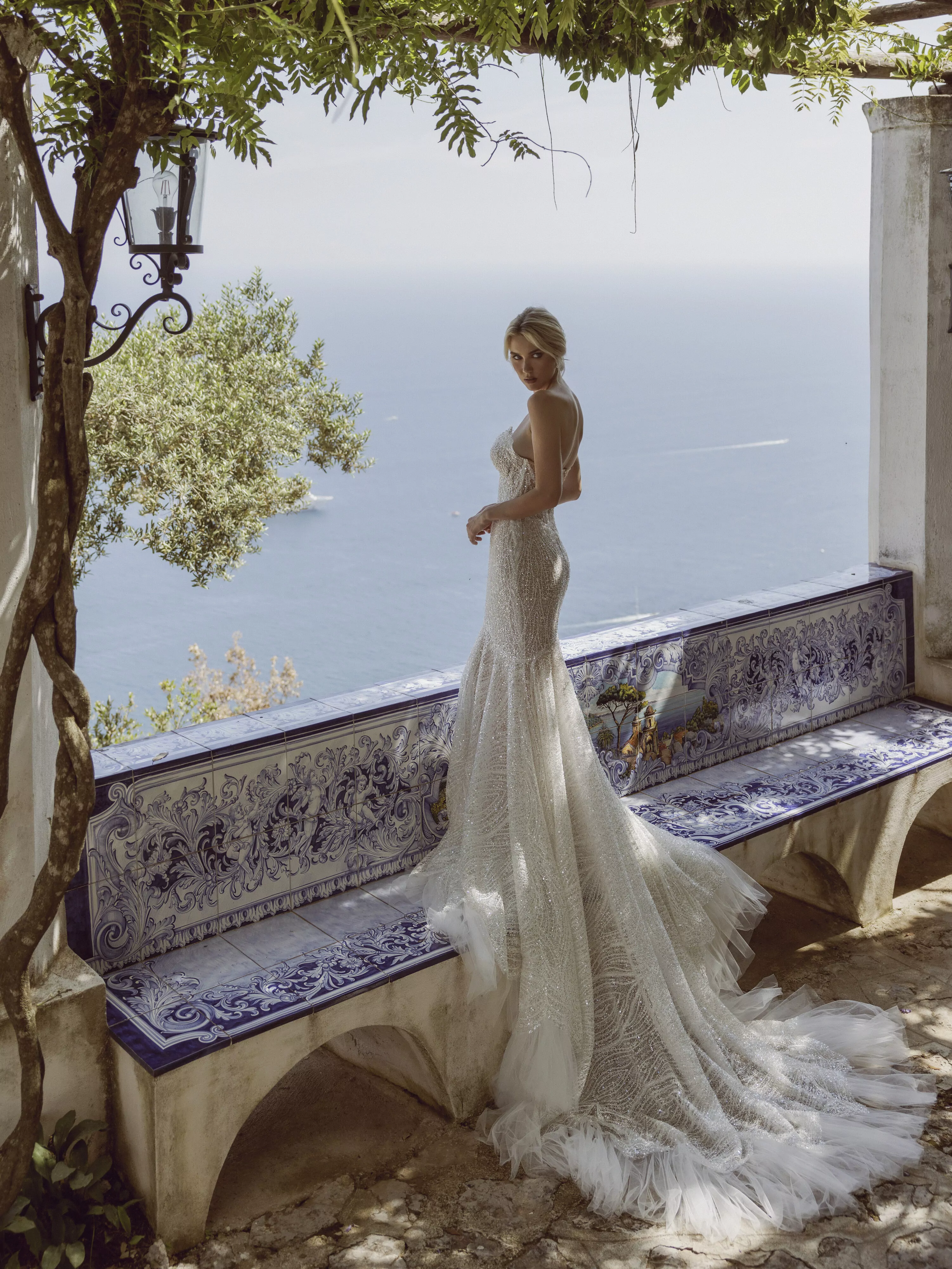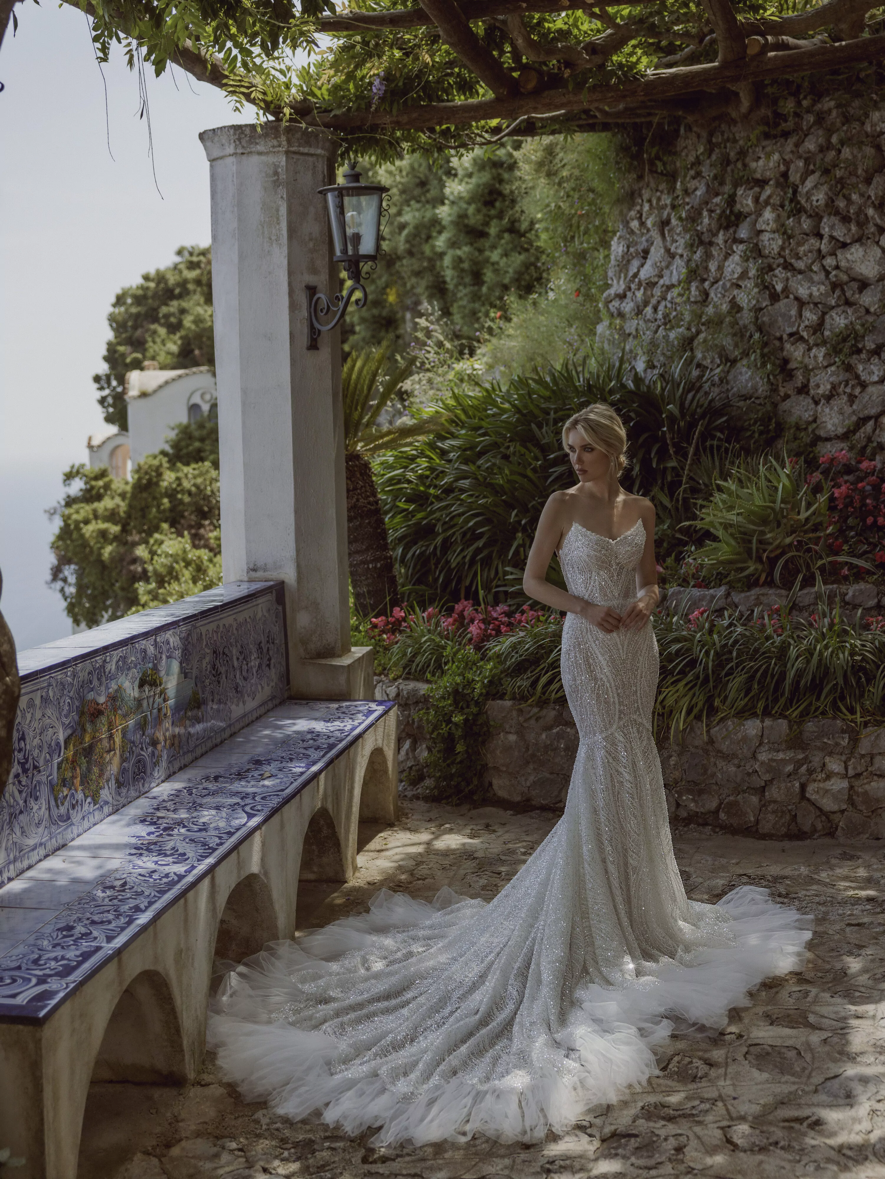 Mermaid dress made of embroidered lace with sharp corners of cups and voluminous mesh along the entire bottom of the skirt.