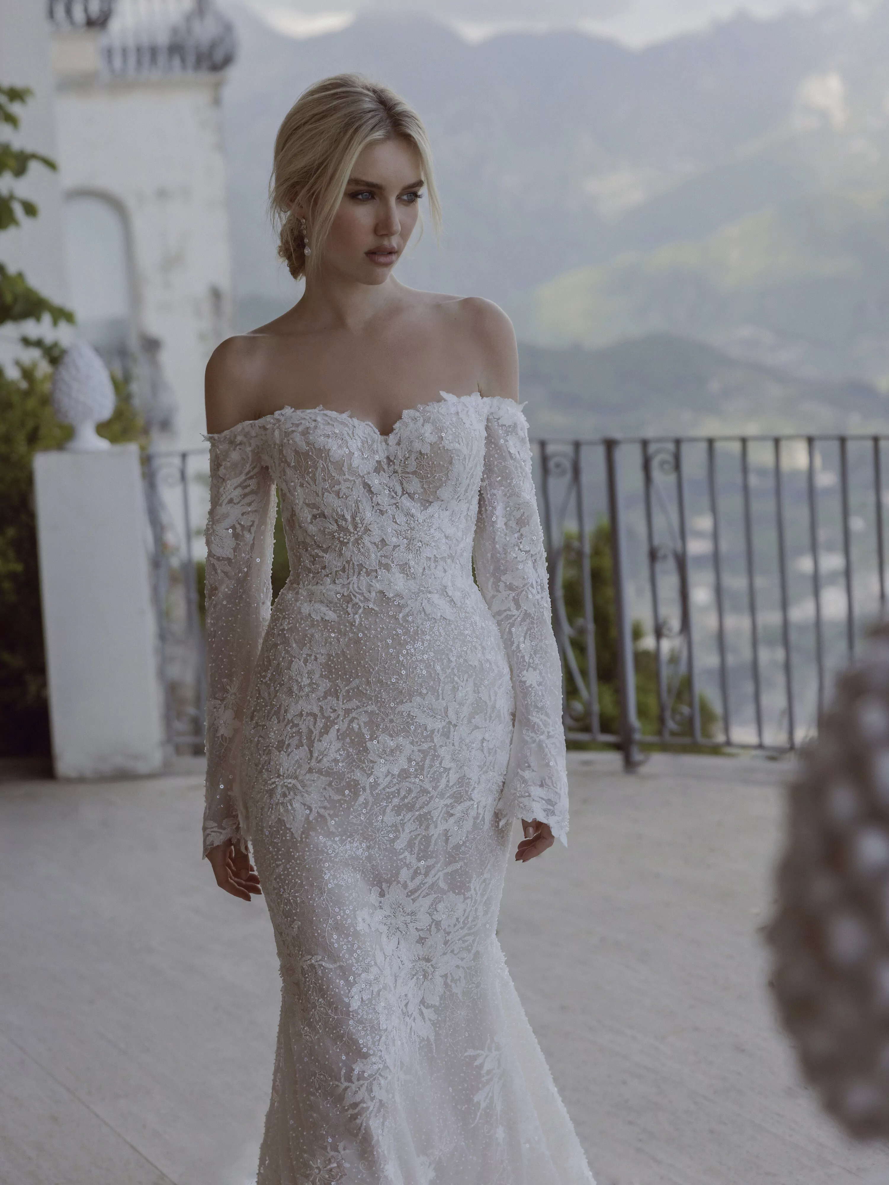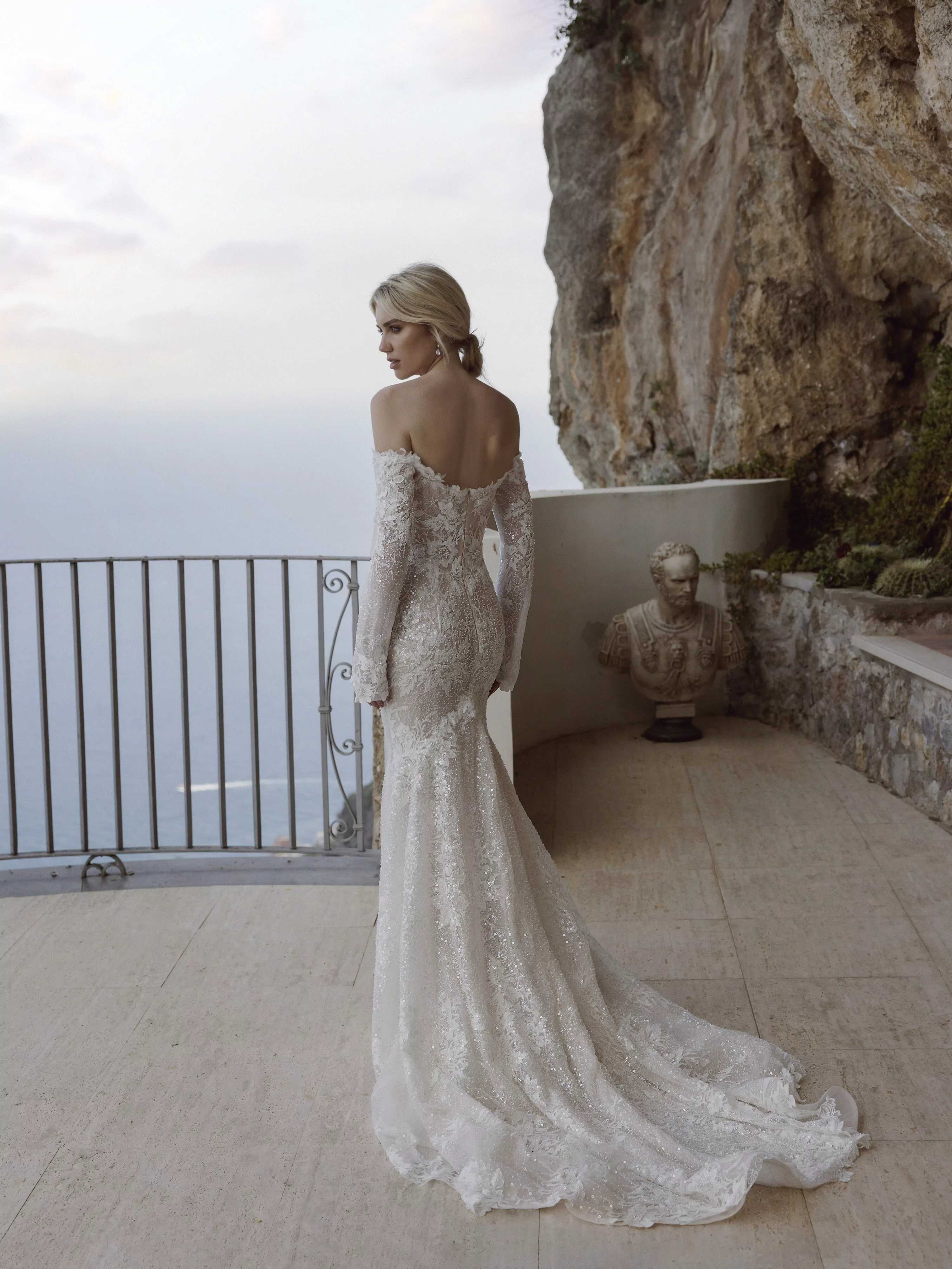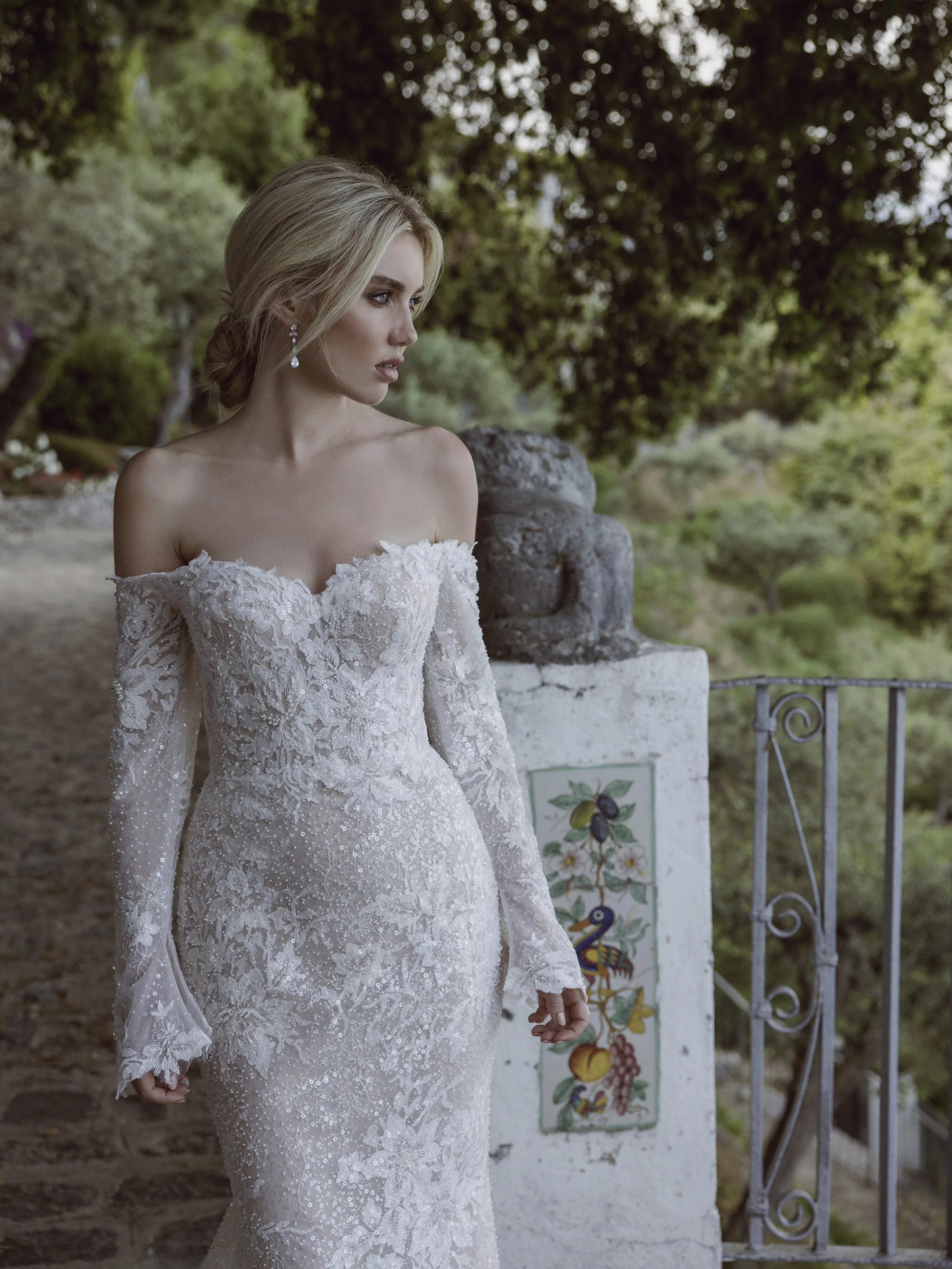 Mermaid gown embroidered with lace and beads. The dress is complemented by long dropped sleeves and chapel train.
