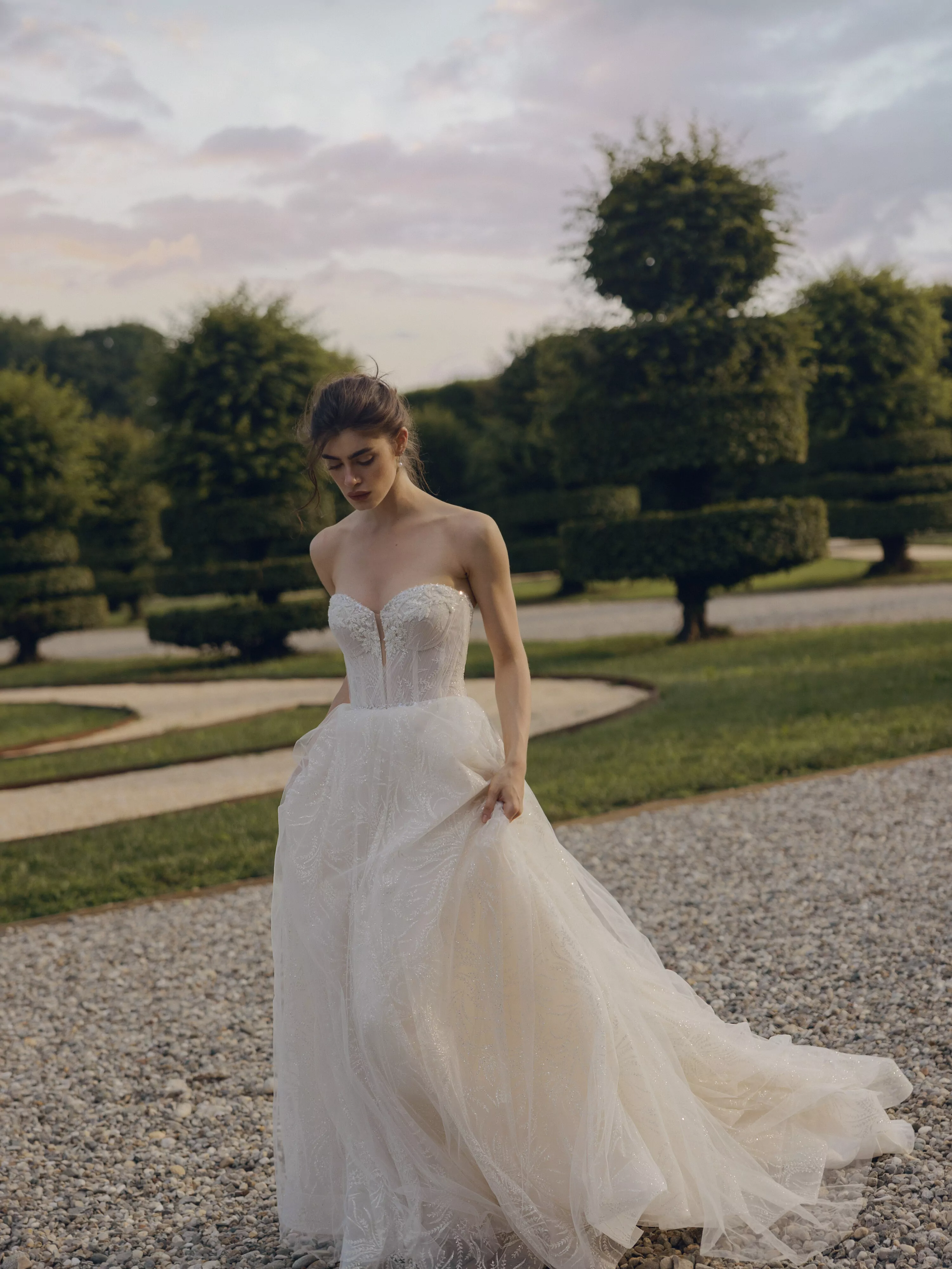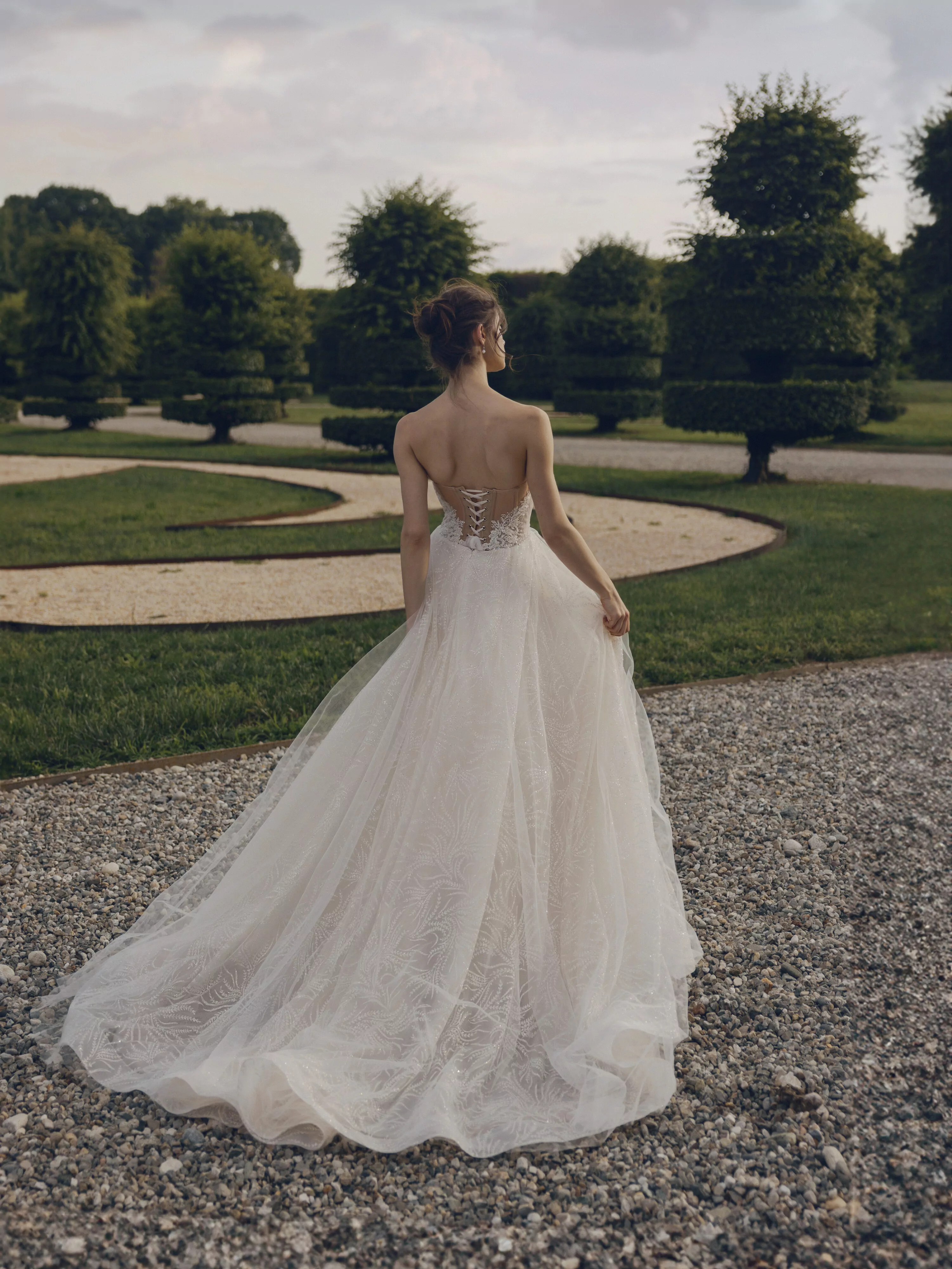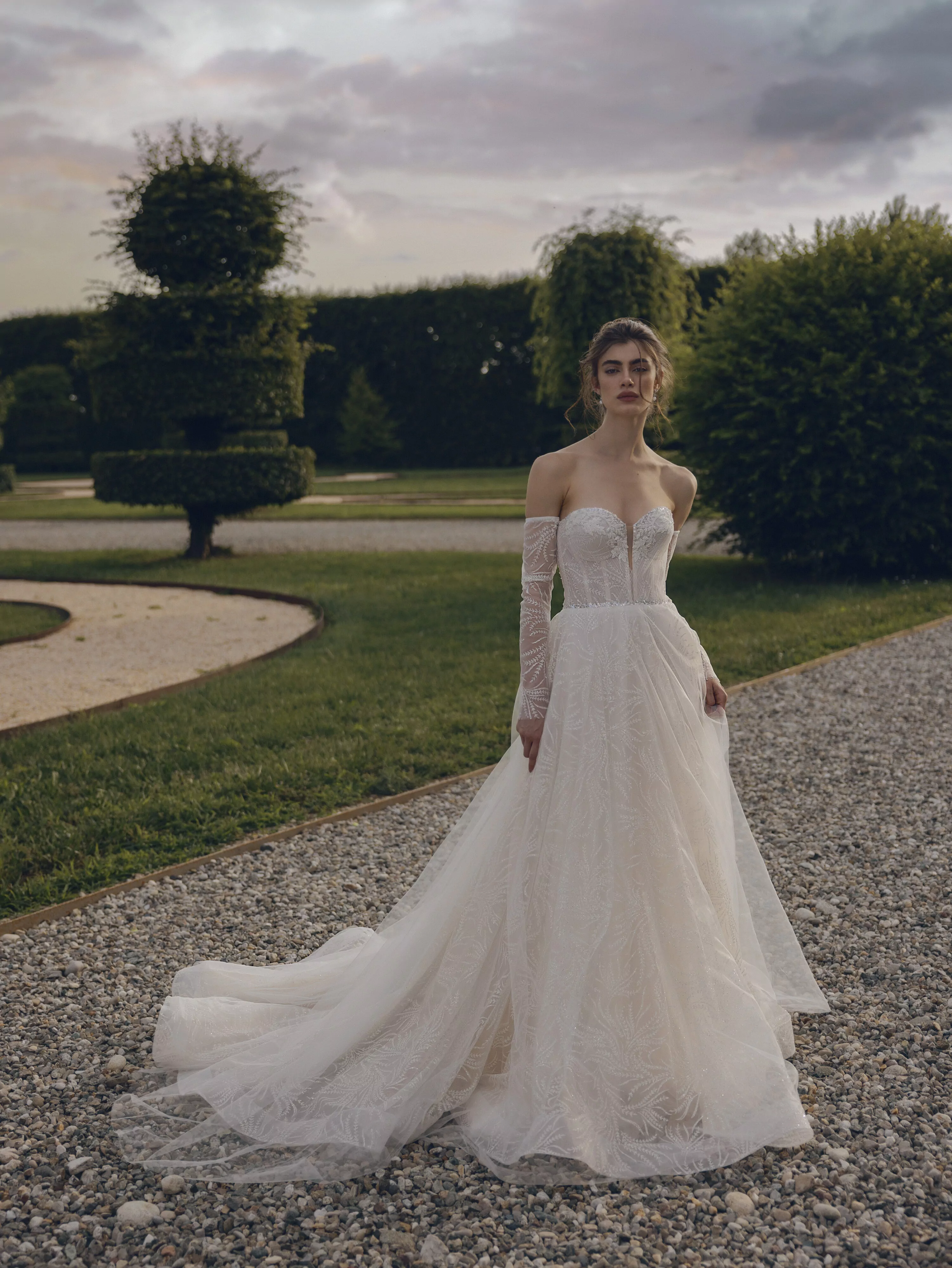A-line tulle dress with shimmering patterns is embroidered with lace. Gown complemented by detachable sleeves and illusions of a deep neckline.