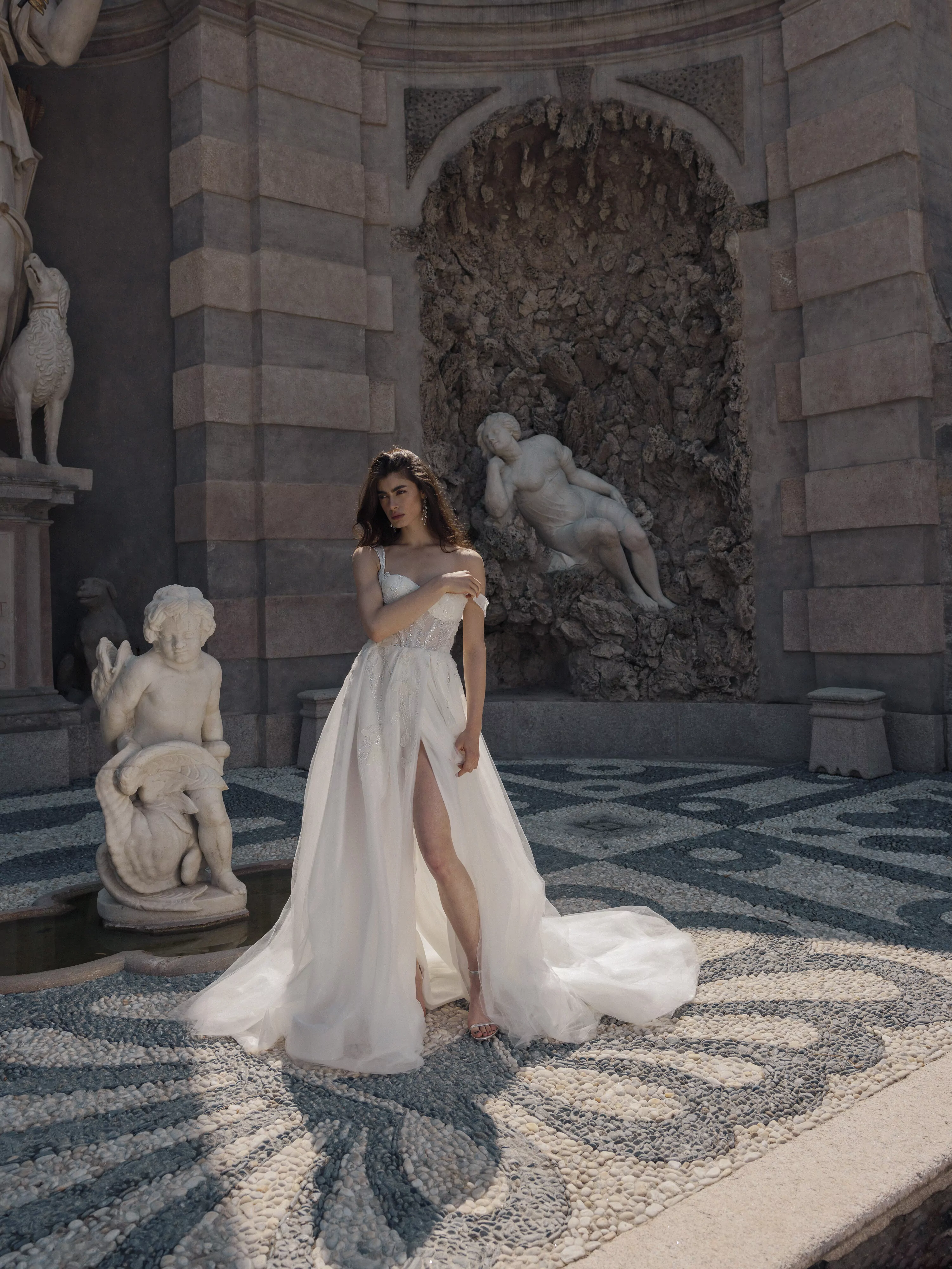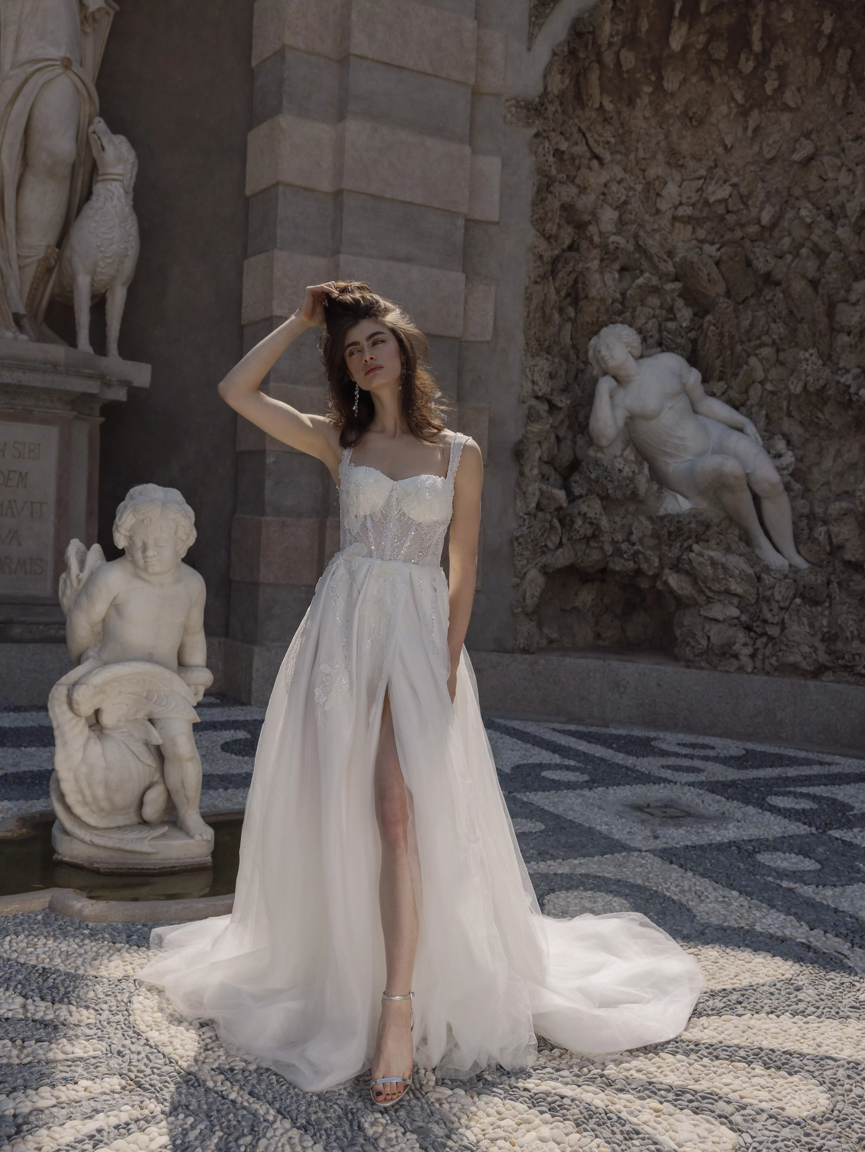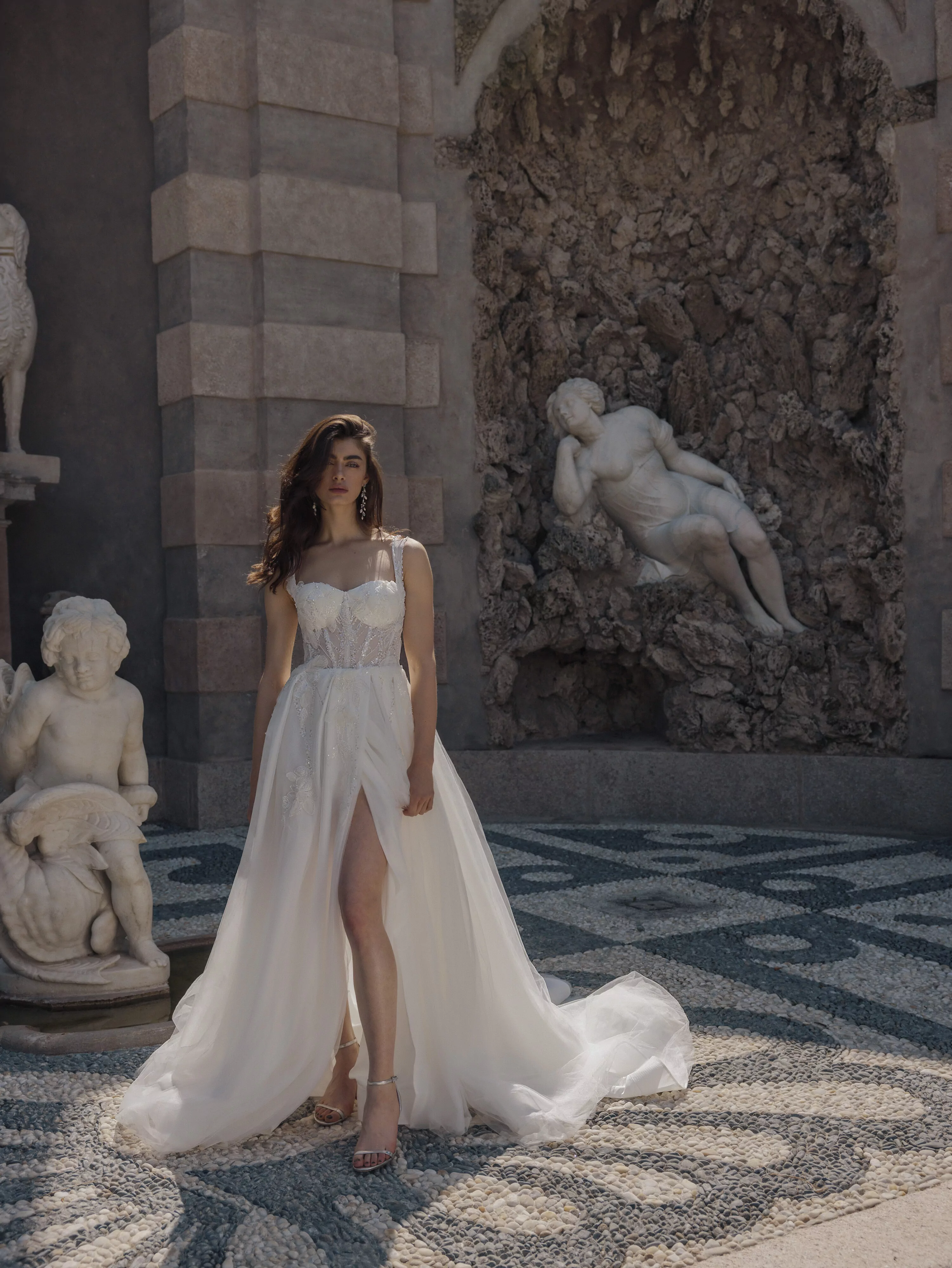 A-line tulle dress embroidered with lace. The dress is complemented by straps and a slit on the leg.
