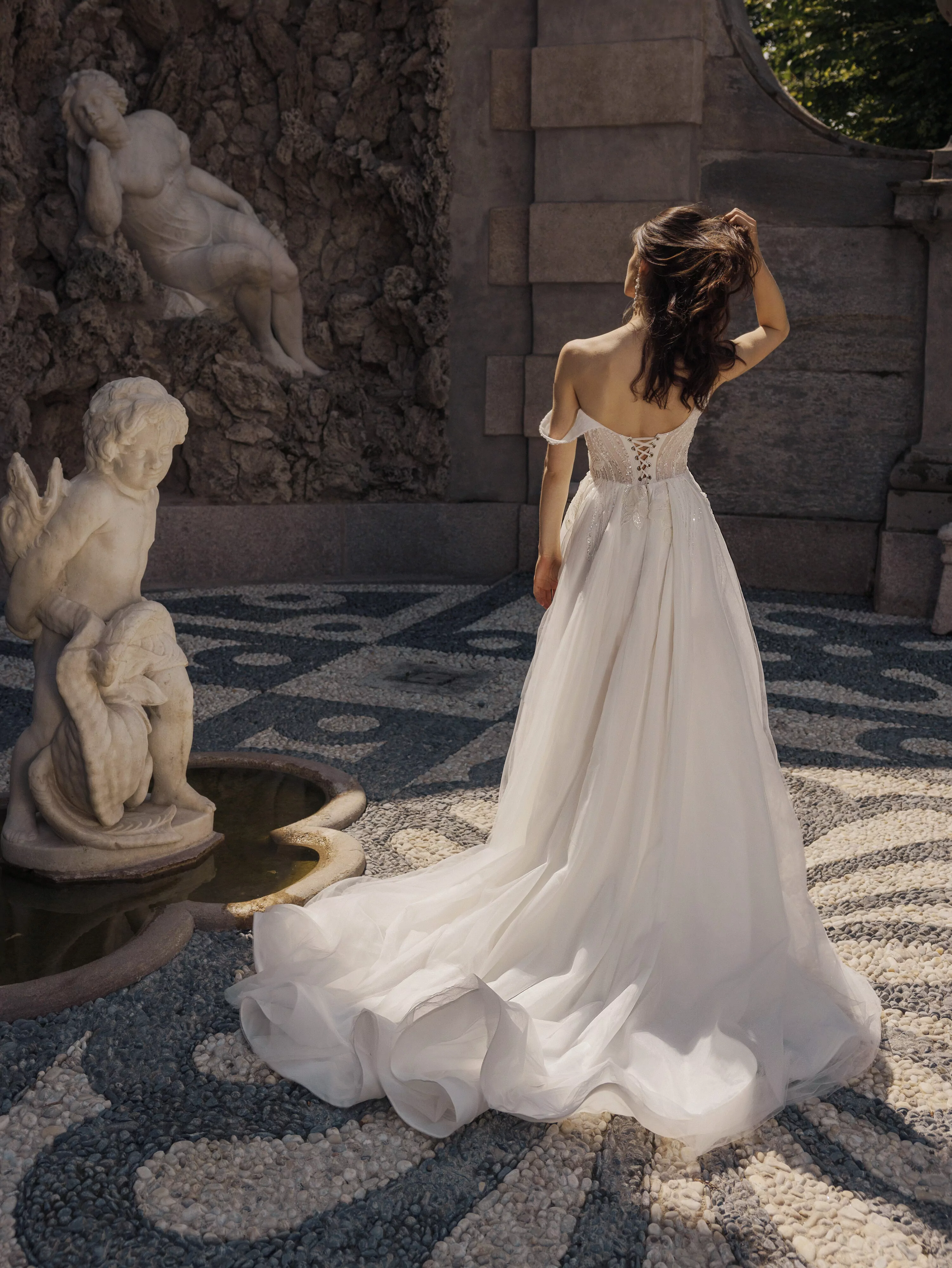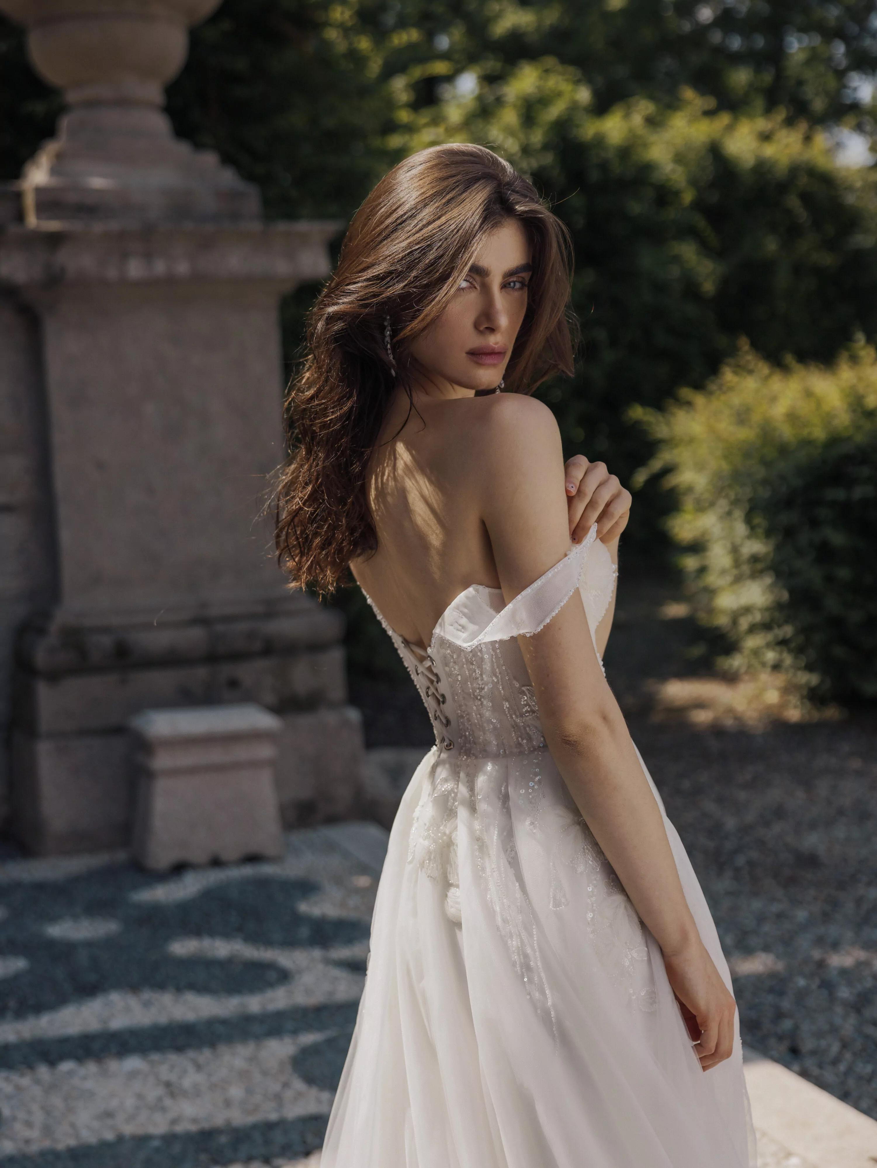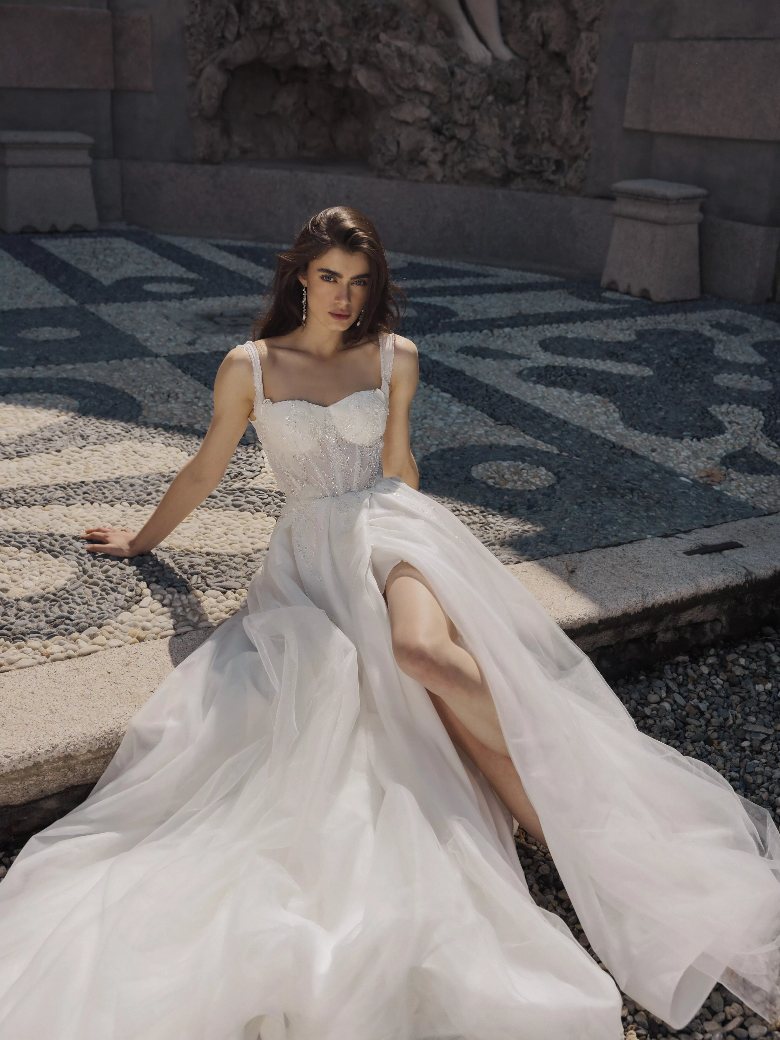 A-line tulle dress embroidered with lace. The dress is complemented by straps and a slit on the leg.