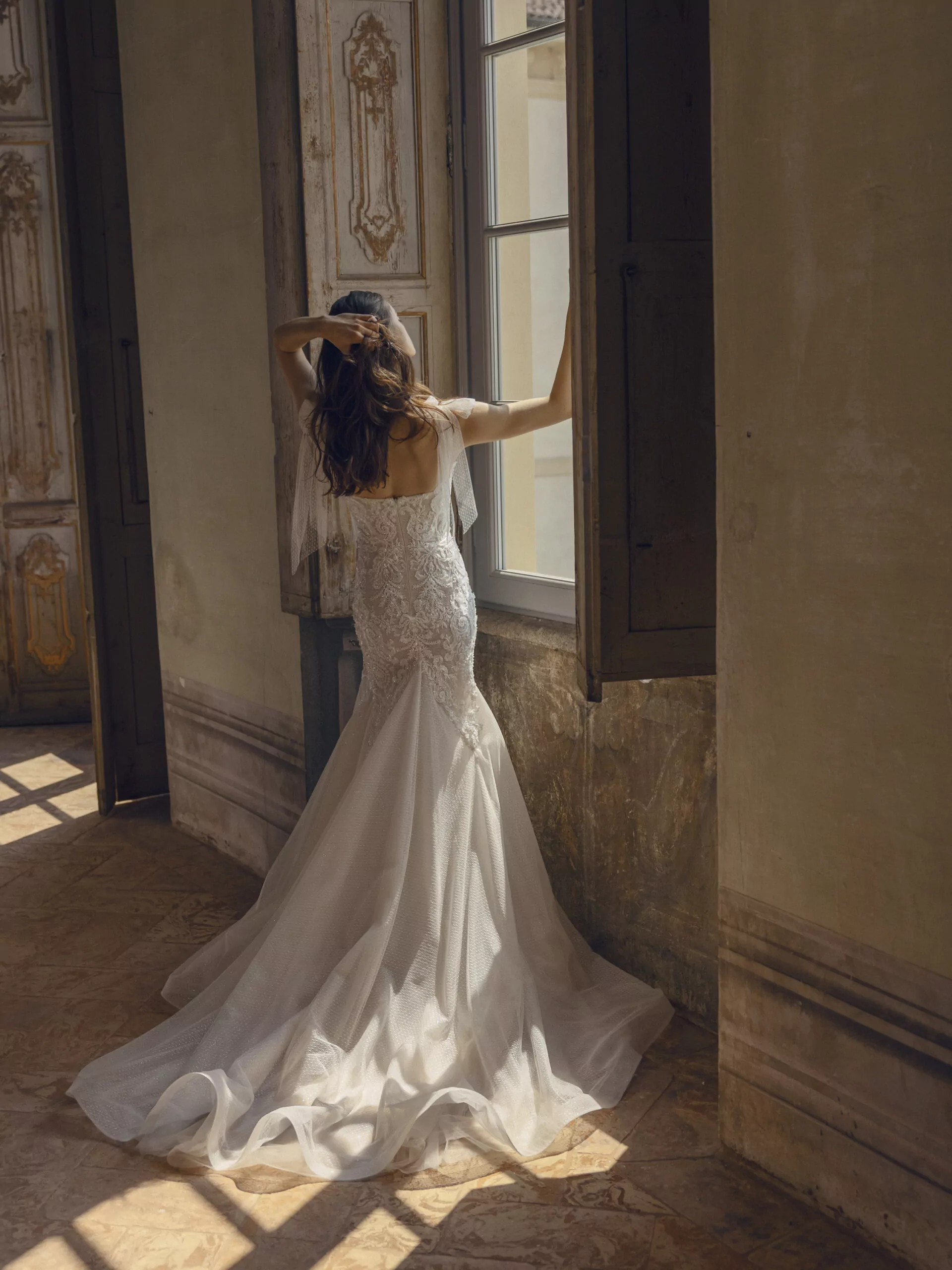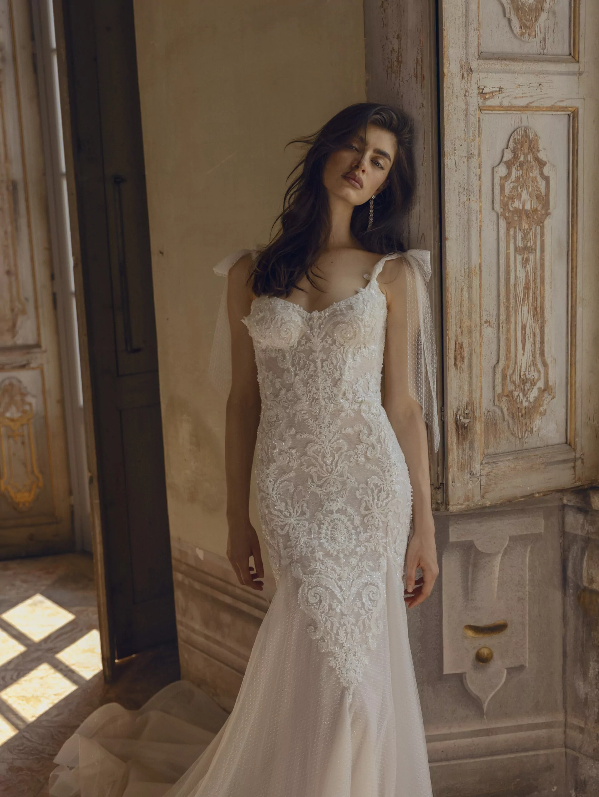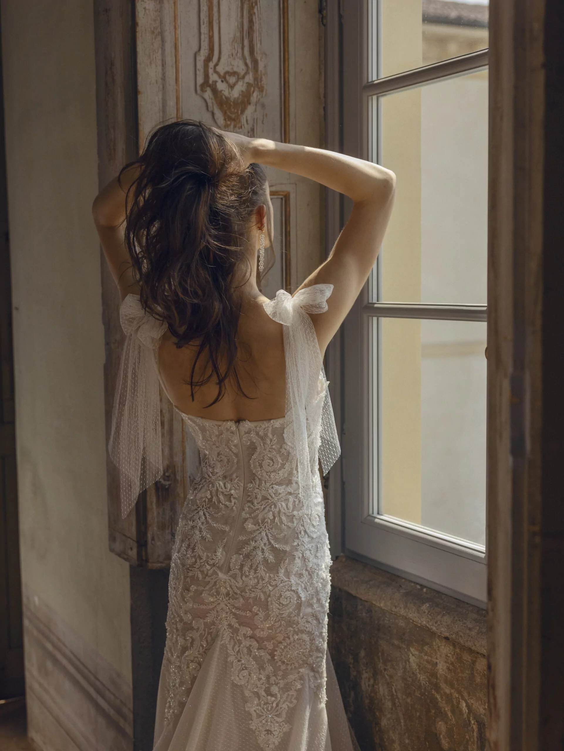 The mermaid dress, embroidered with lace in an incredible pattern, is complemented by mesh bows on the shoulders.