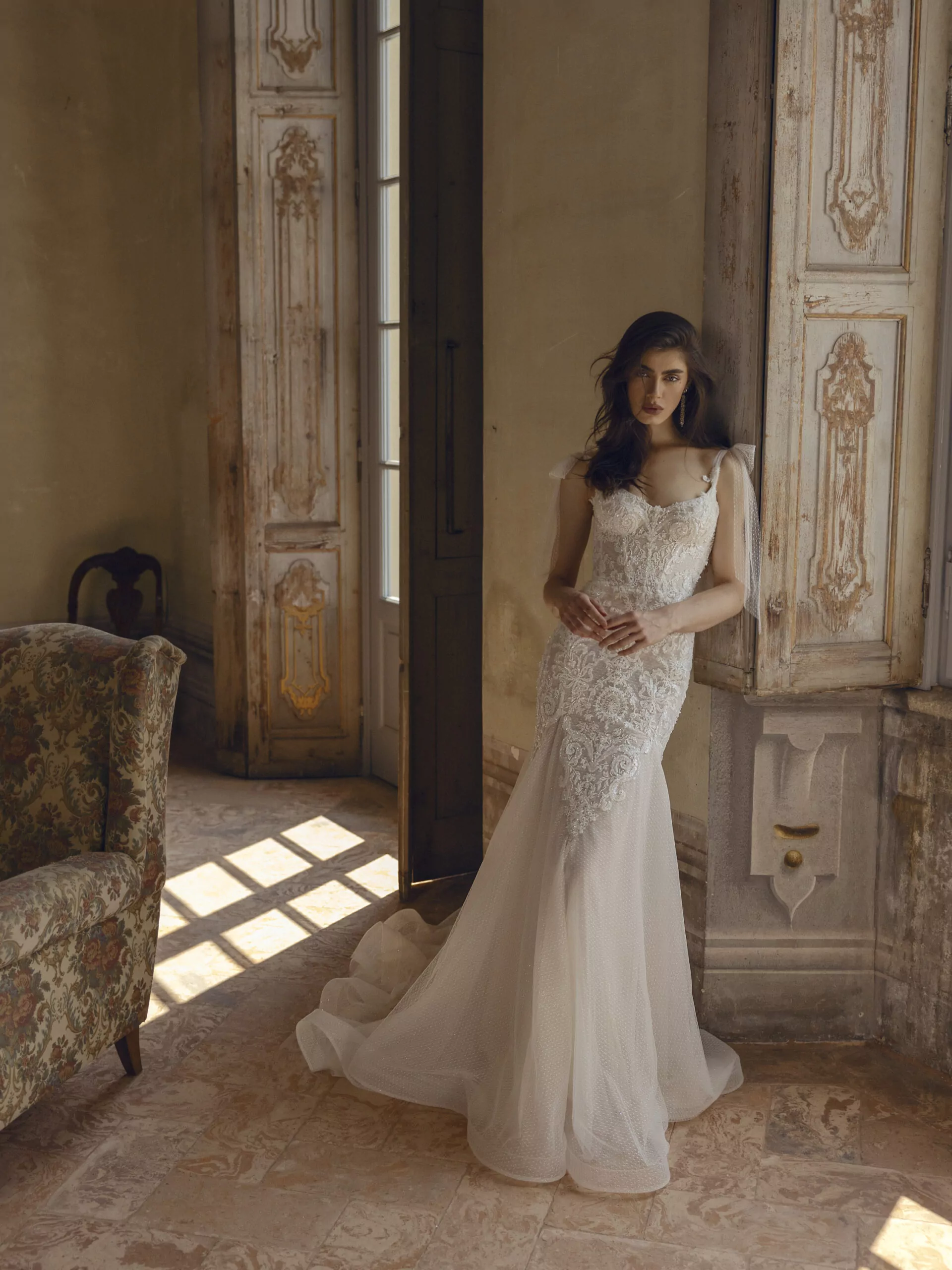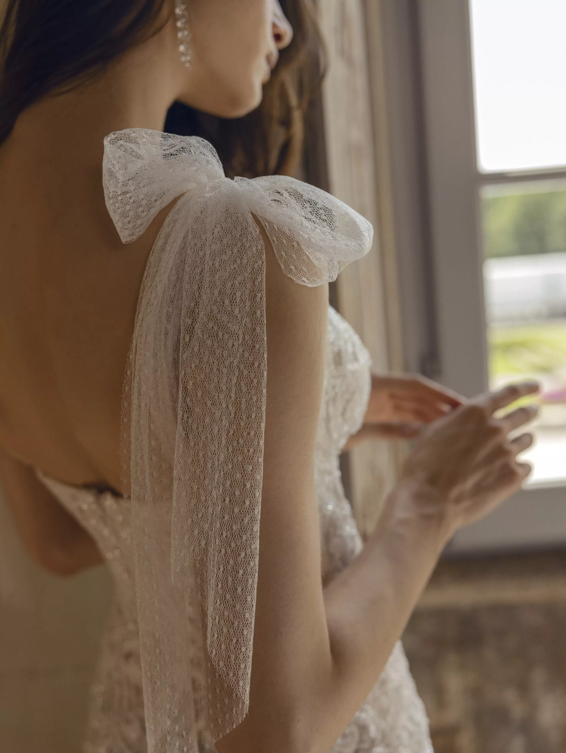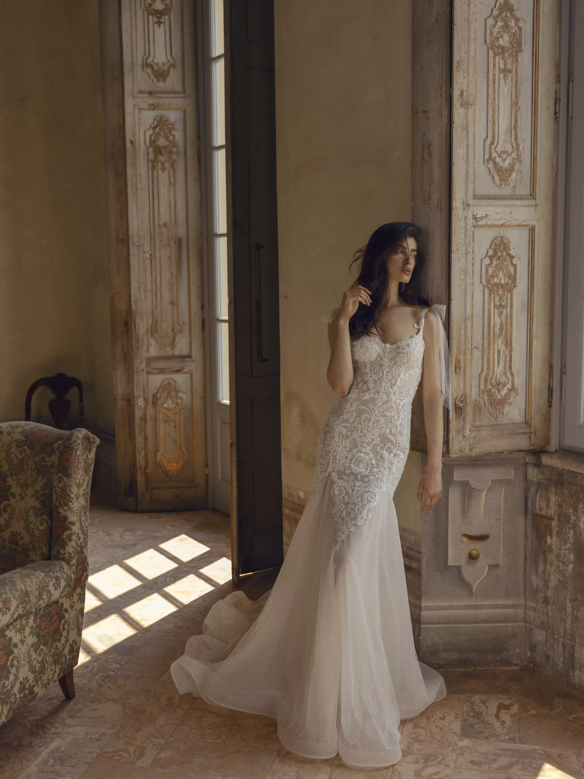 The mermaid dress, embroidered with lace in an incredible pattern, is complemented by mesh bows on the shoulders.