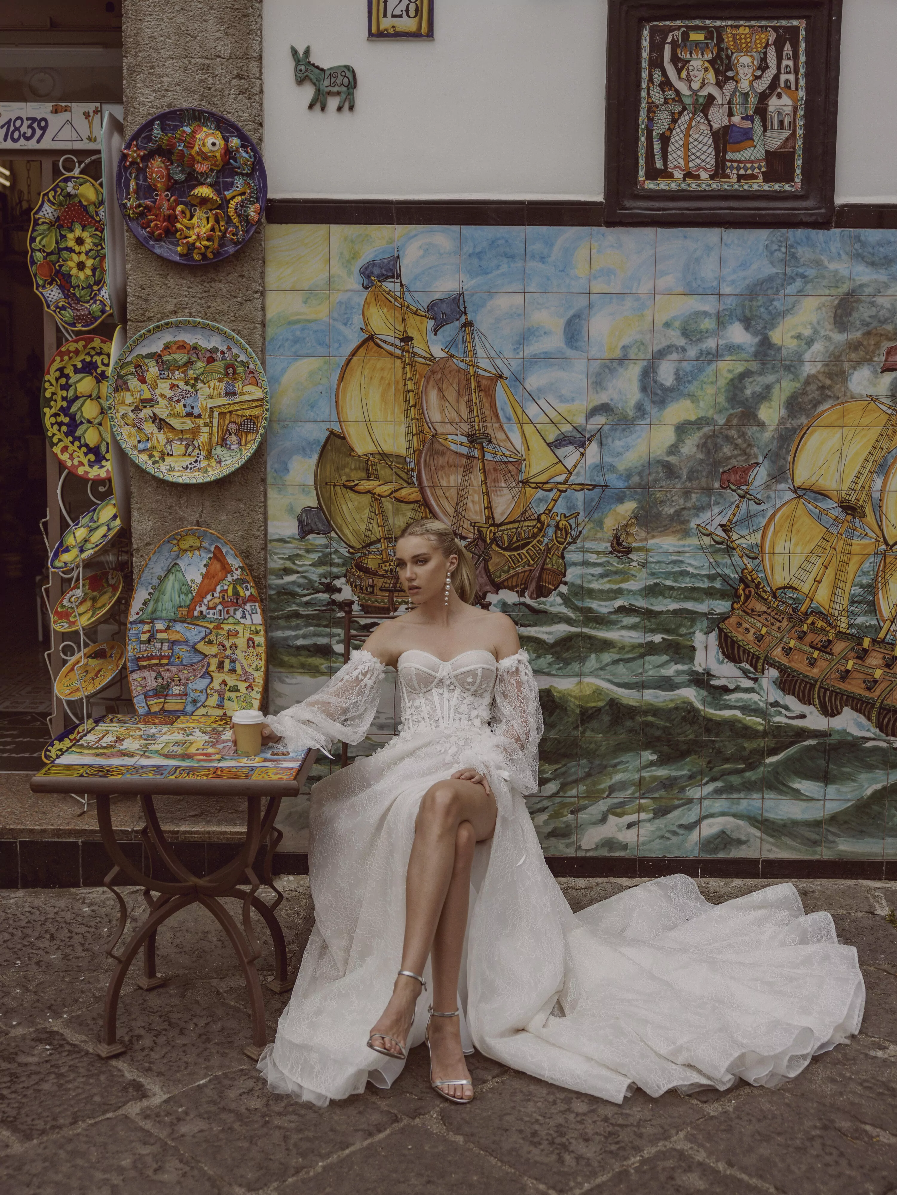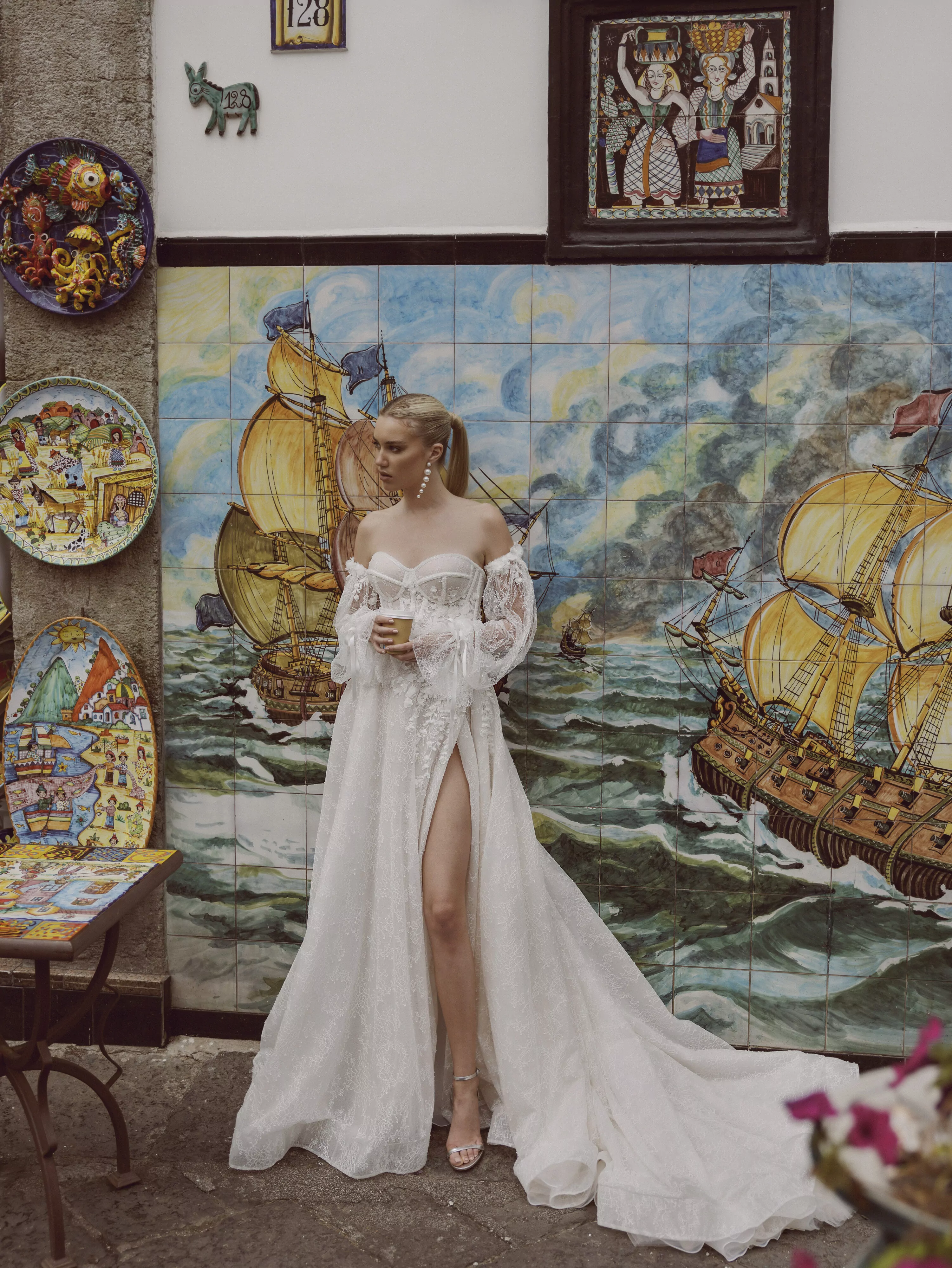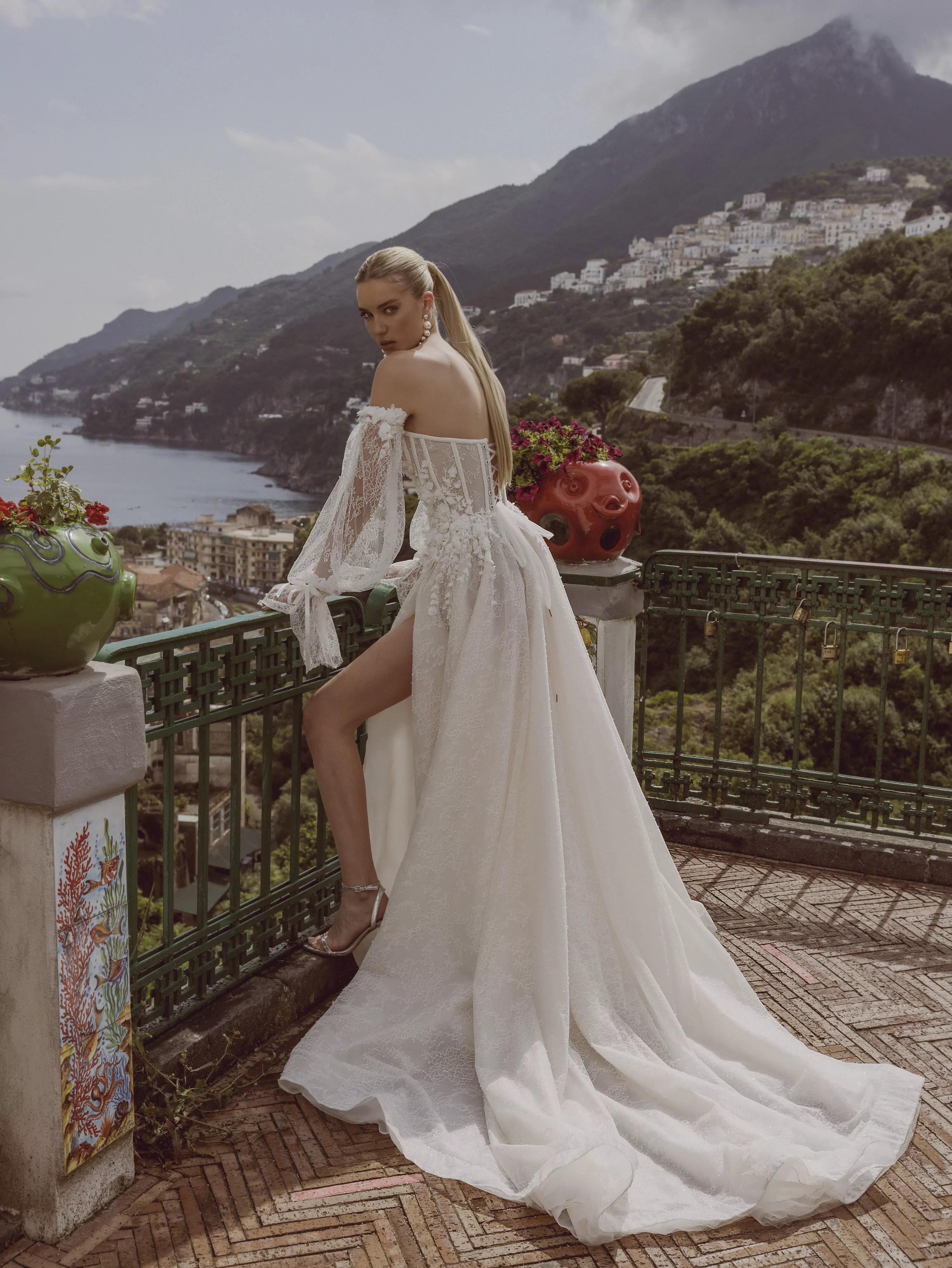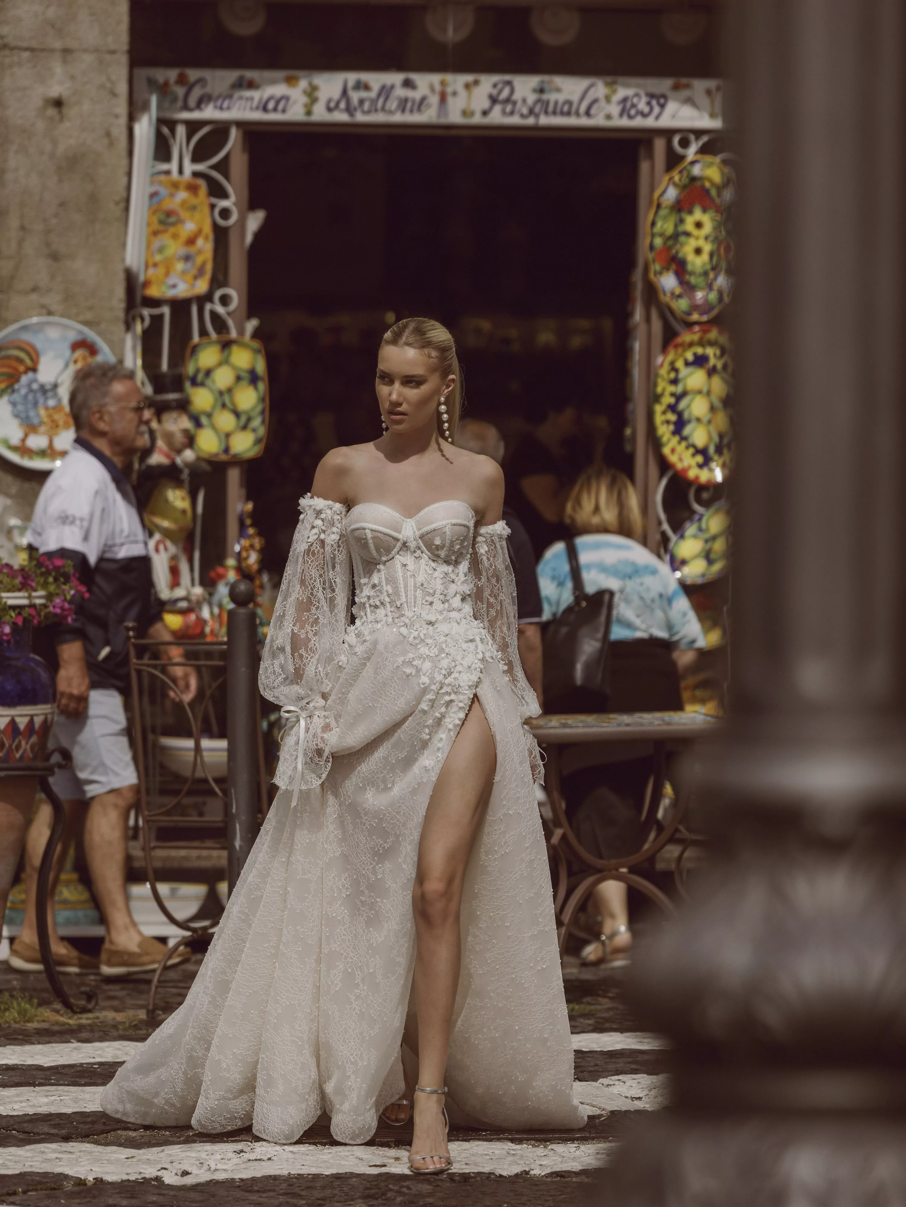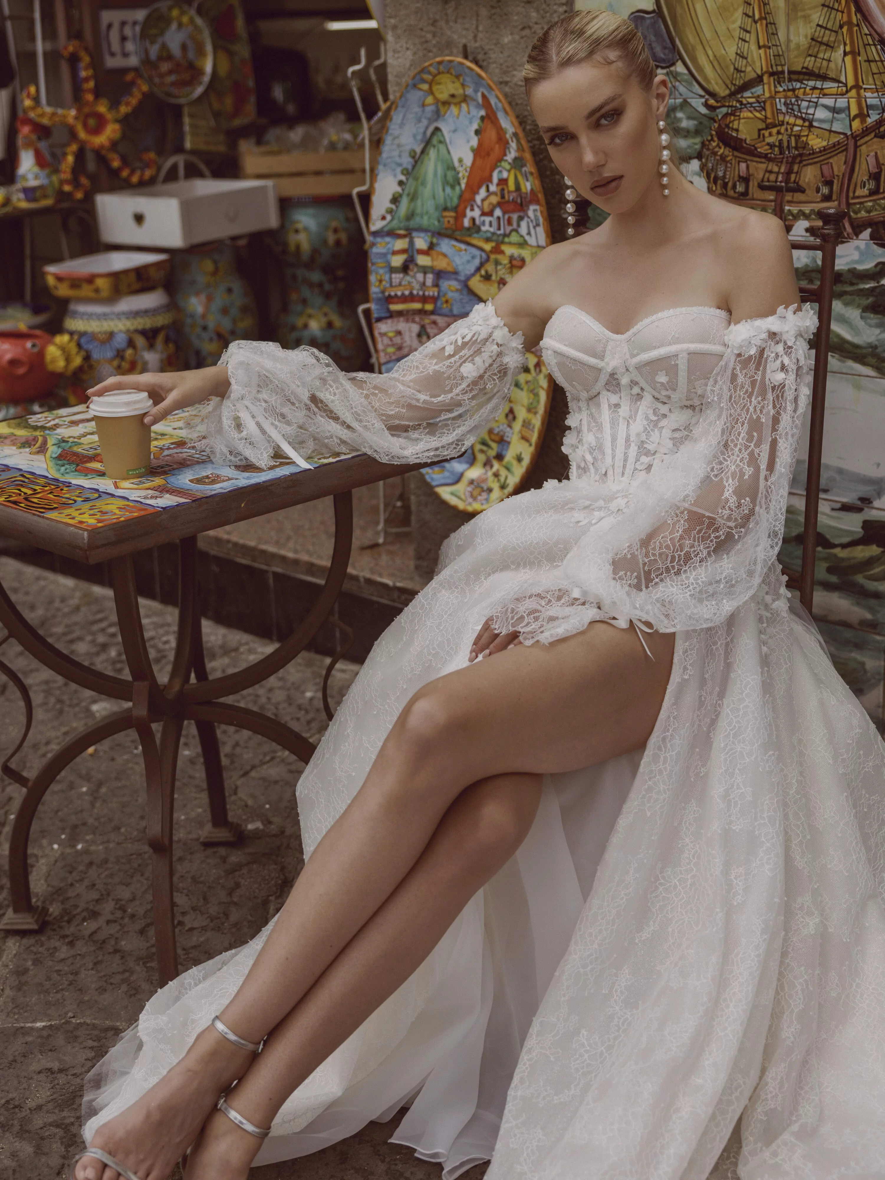 A-line lace dress with a deep slit on the leg and embroidered with floral lace. The gown is complemented by voluminous detachable sleeves.