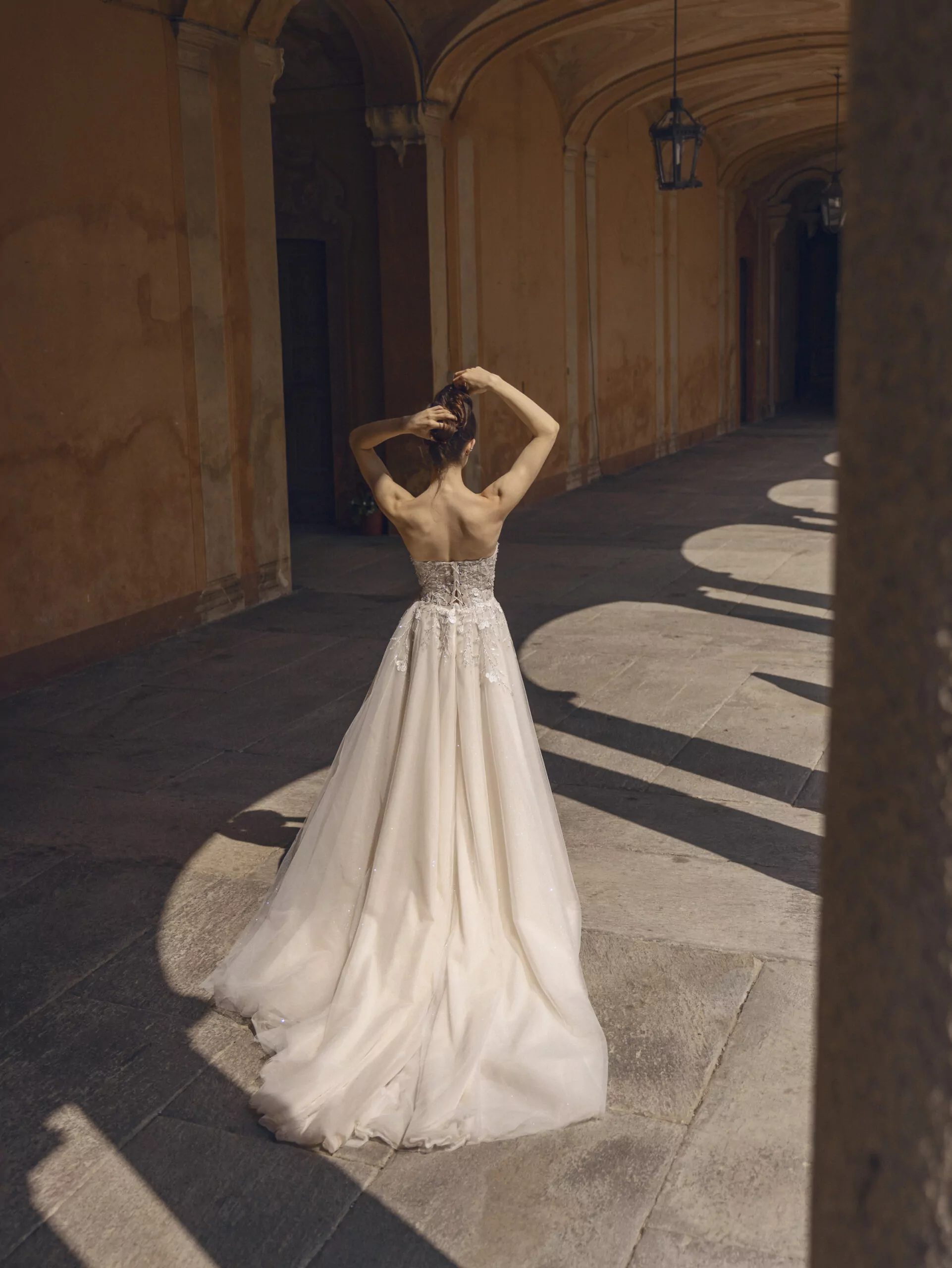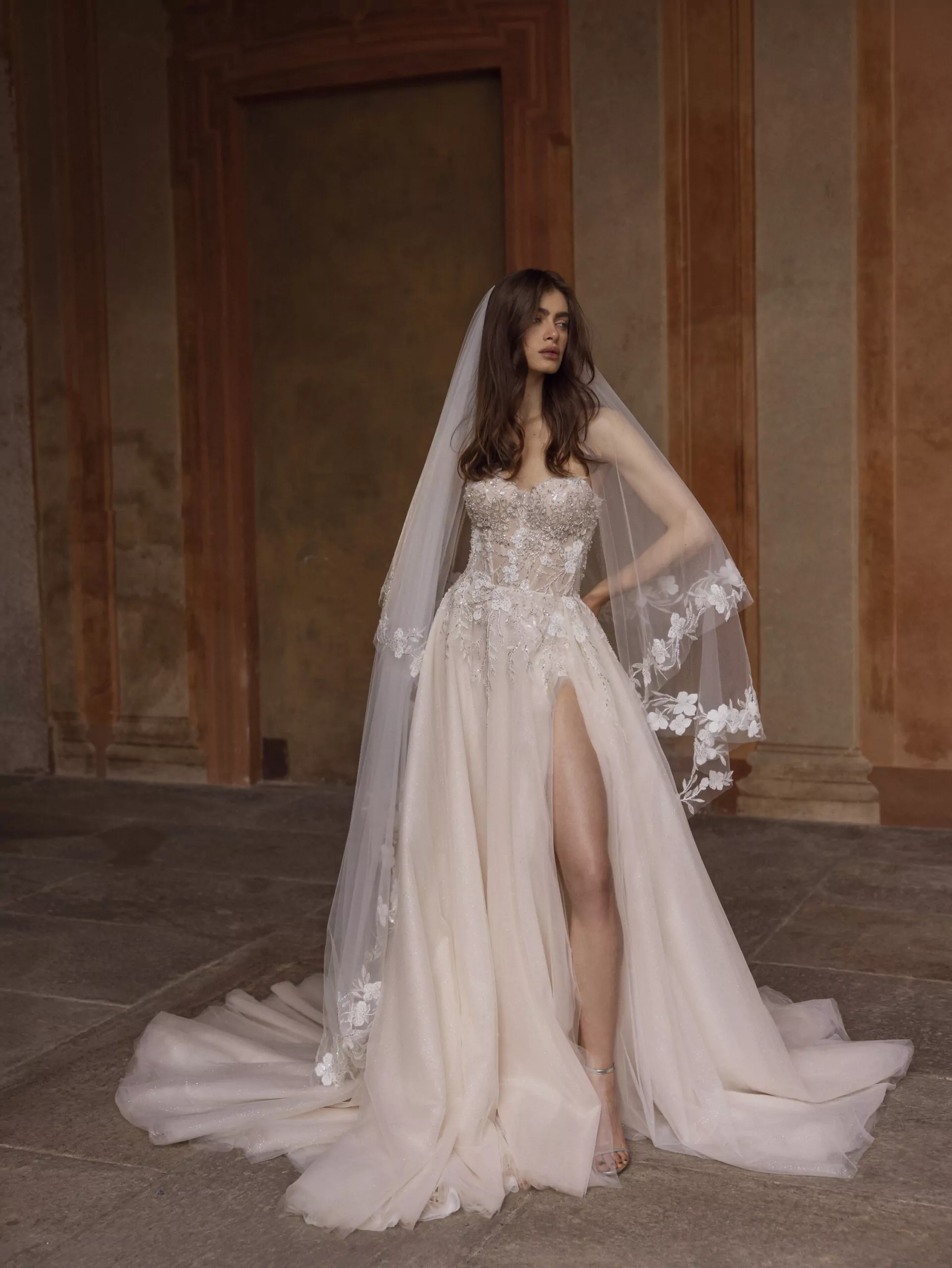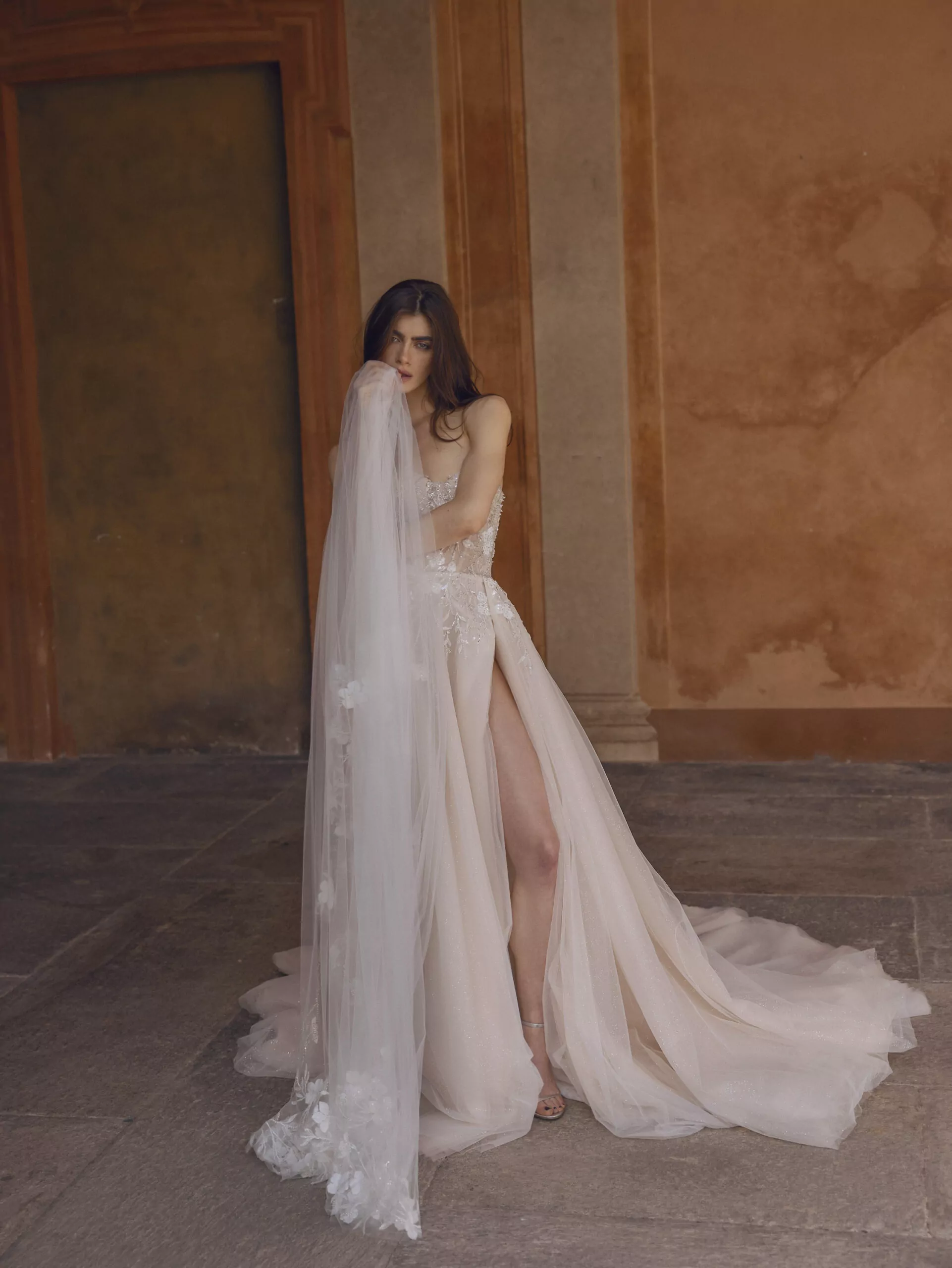 Airy nude colored dress made of mesh and embroidered lace with a deep cutout on the leg. The gown comes with an original veil which can be purchased separately.