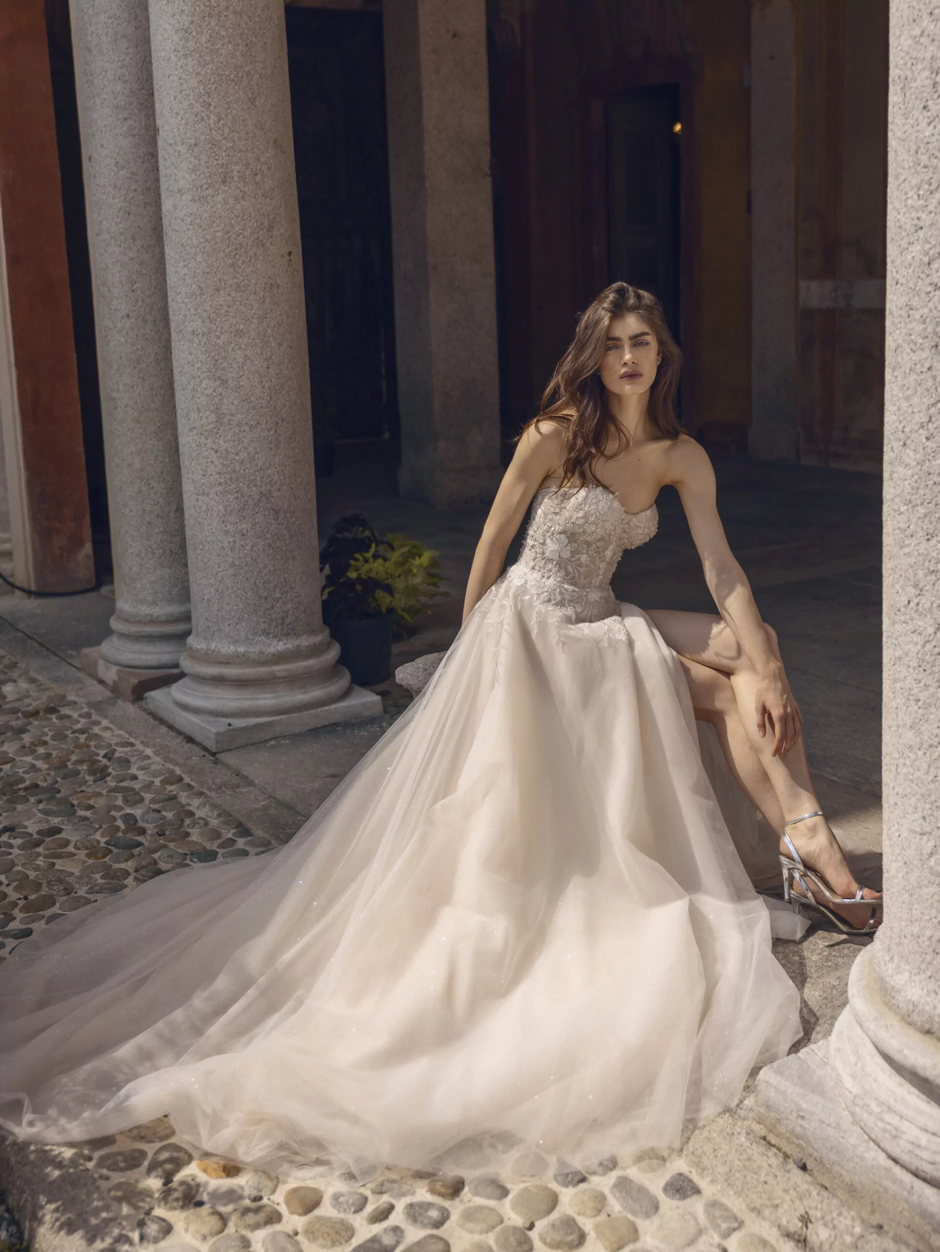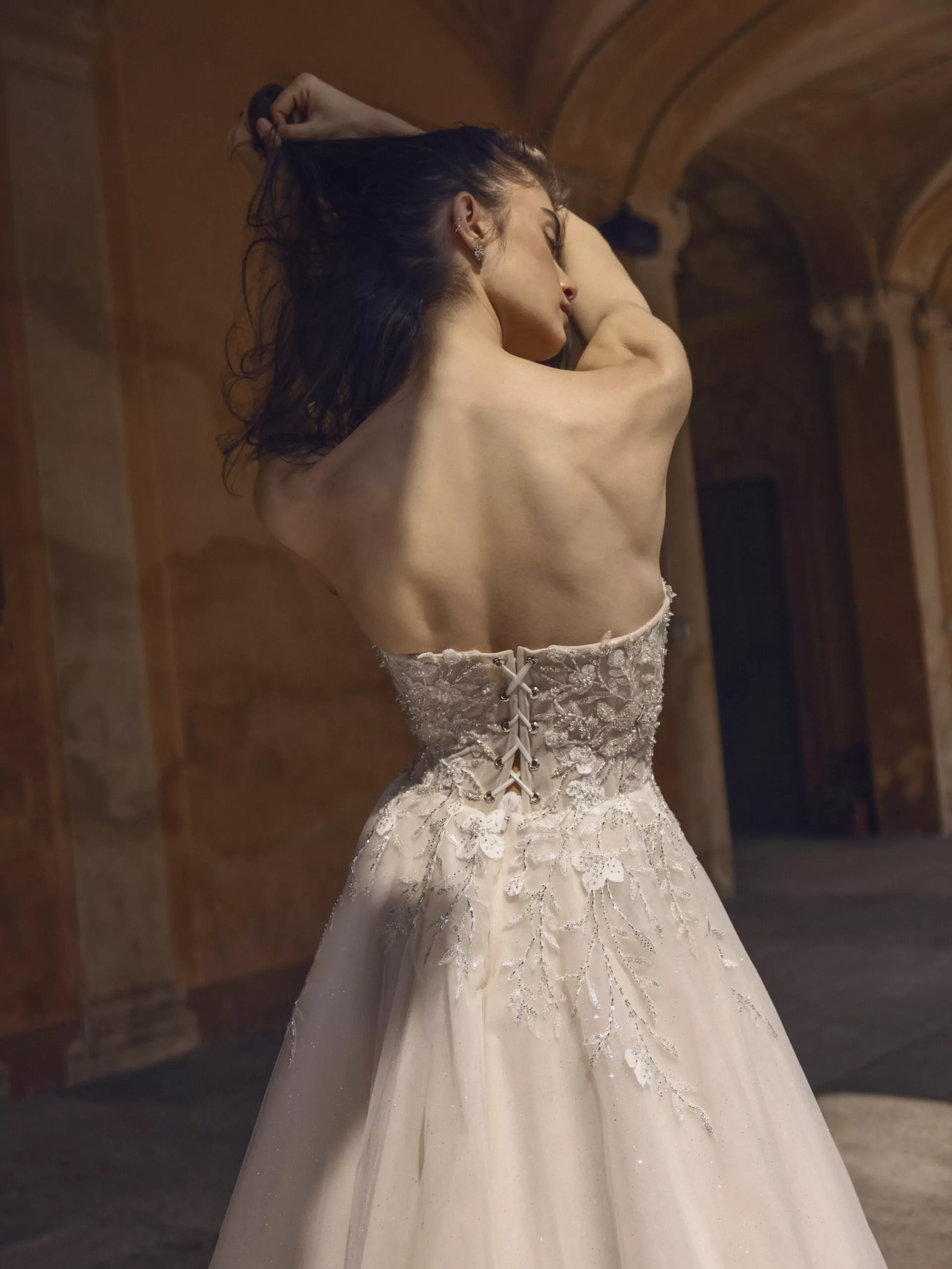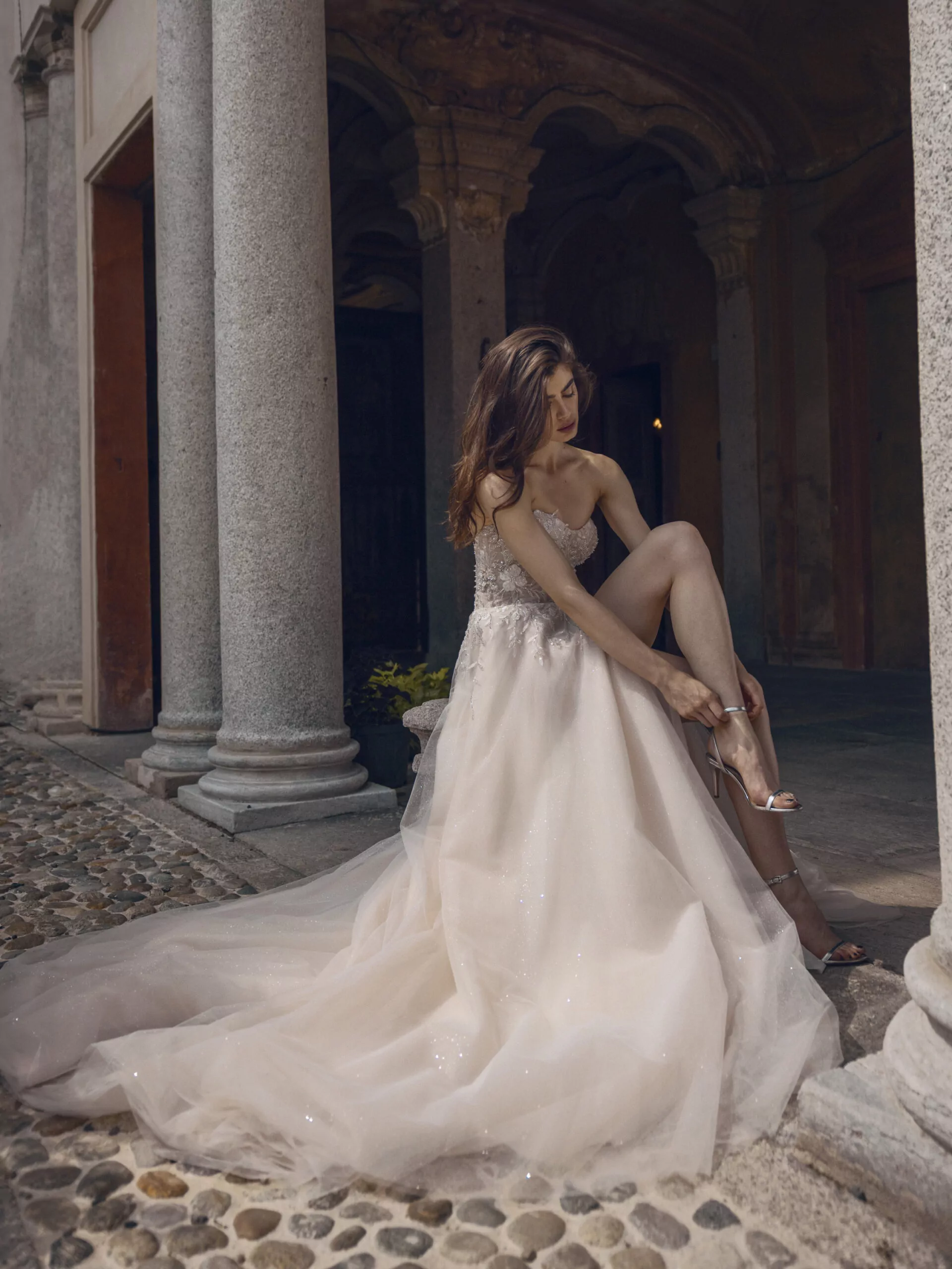 Airy nude colored dress made of mesh and embroidered lace with a deep cutout on the leg. The gown comes with an original veil which can be purchased separately.