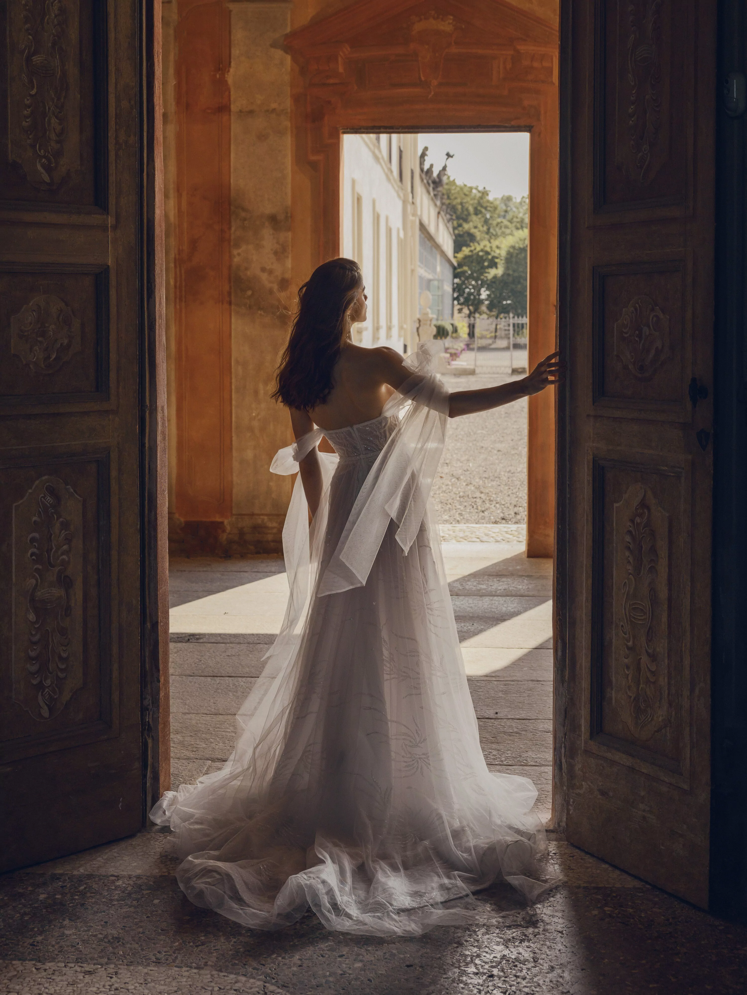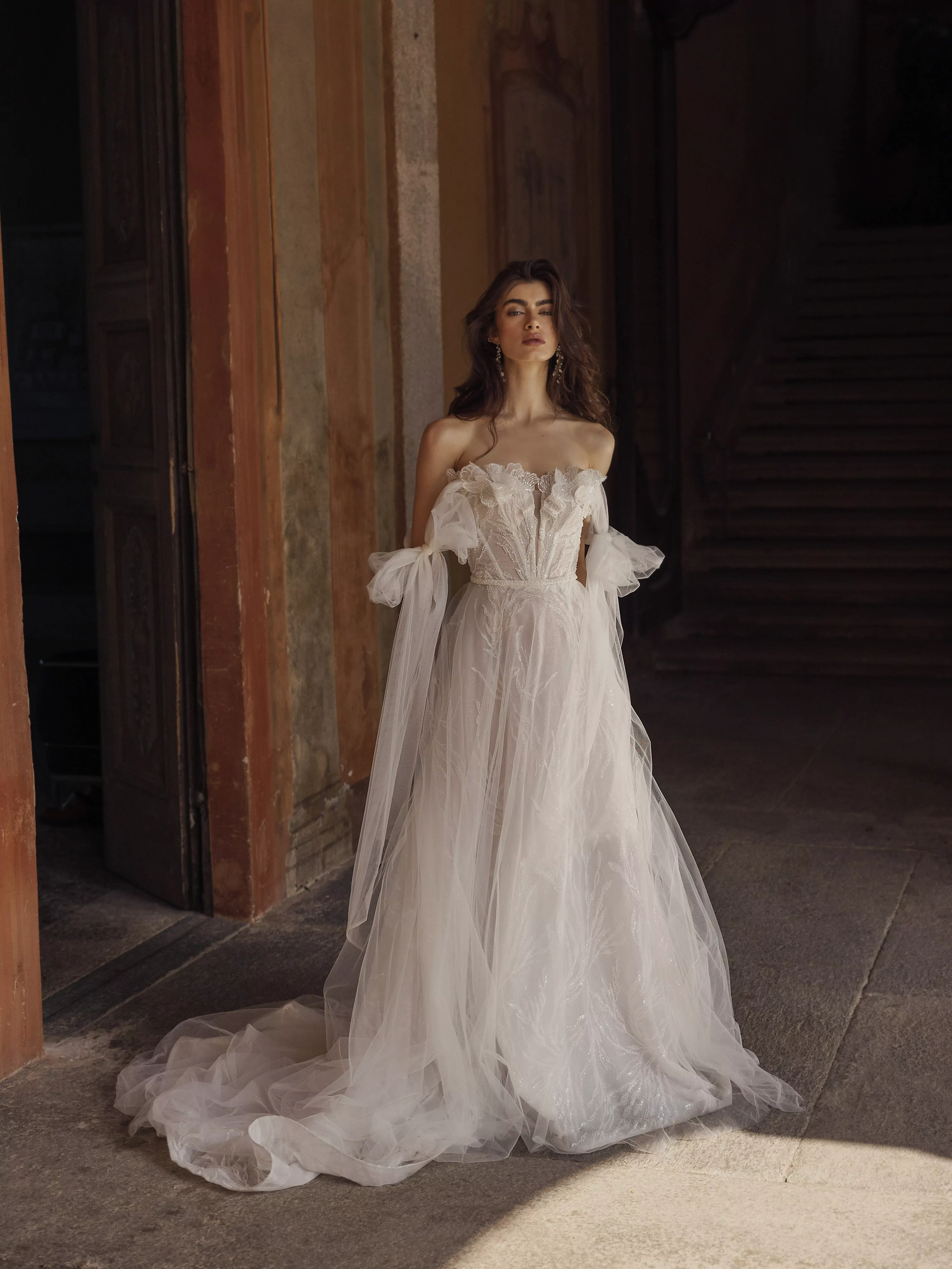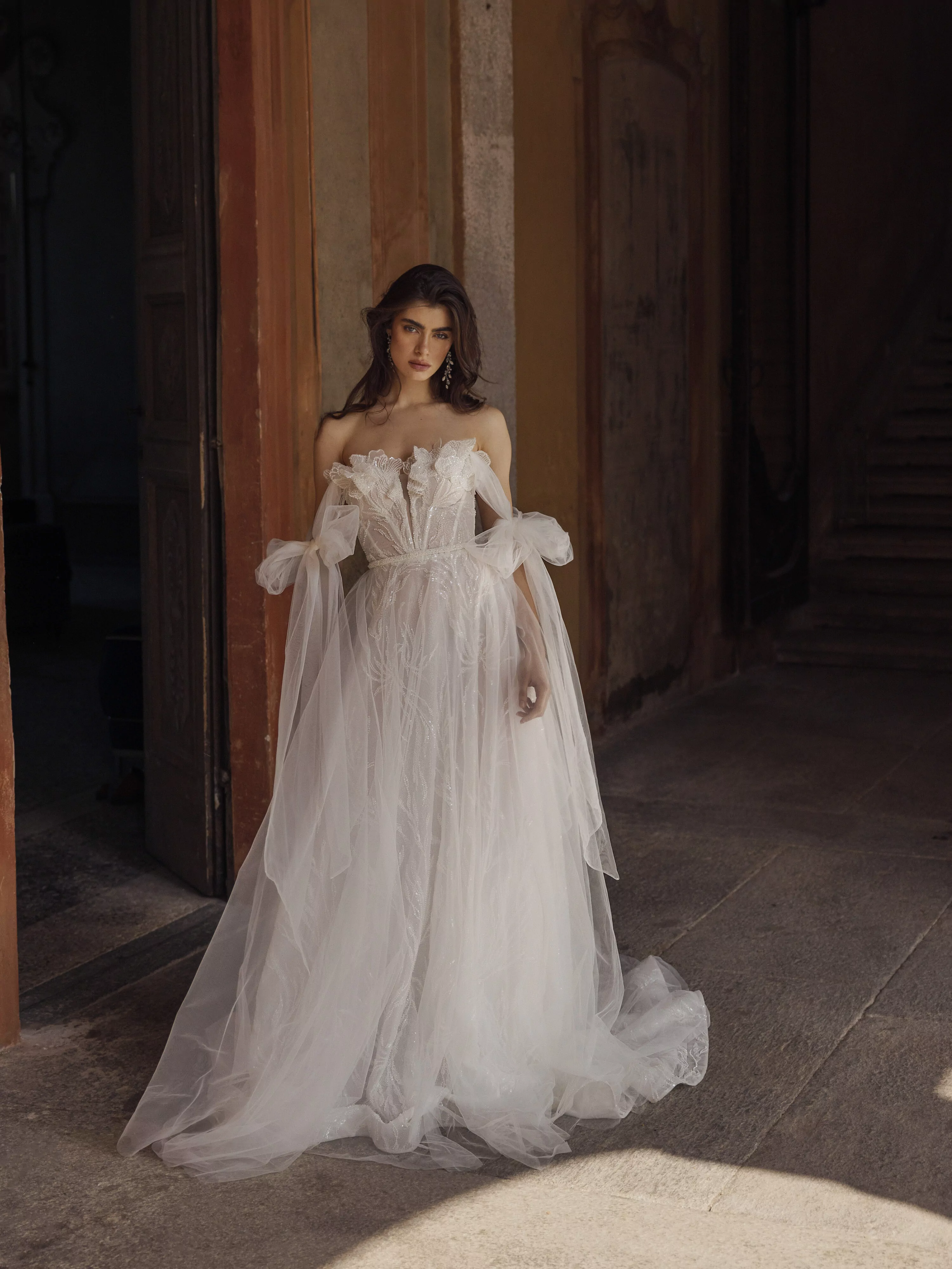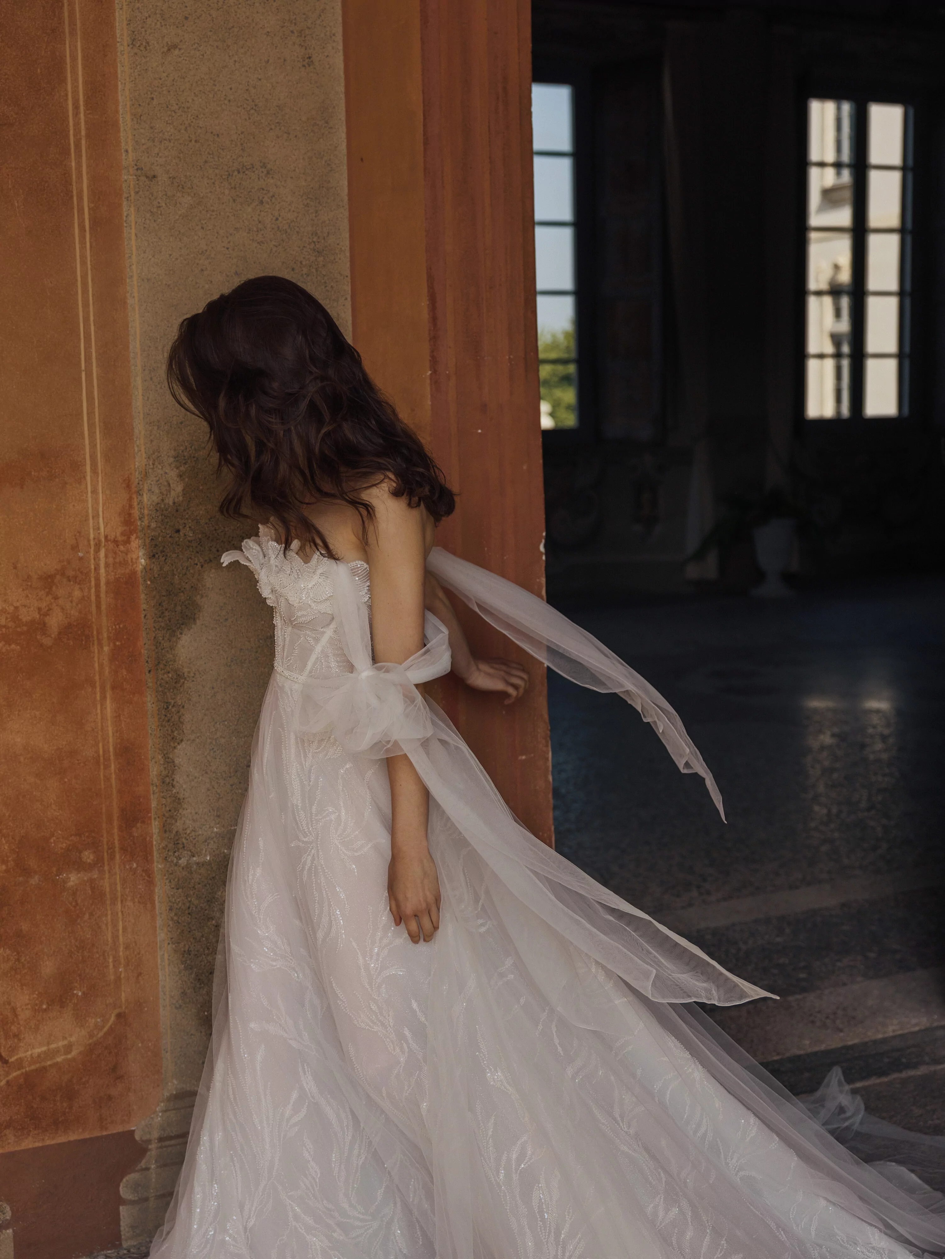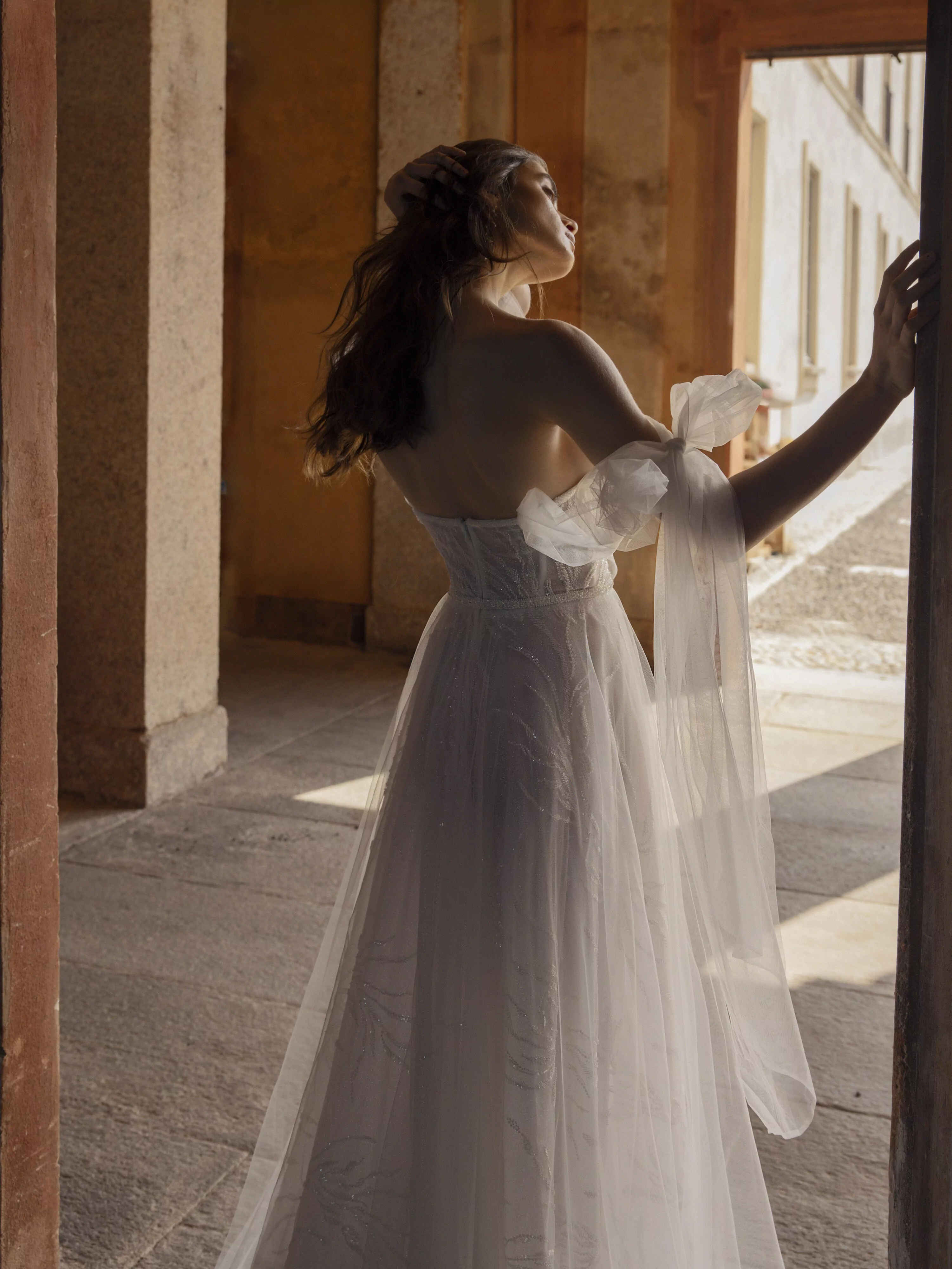 A light flowing dress made of tulle with the addition of shimmering patterns, embroidered with beads along the corset and having airy bows on the shoulders made of delicate mesh creates an incredibly delicate image.