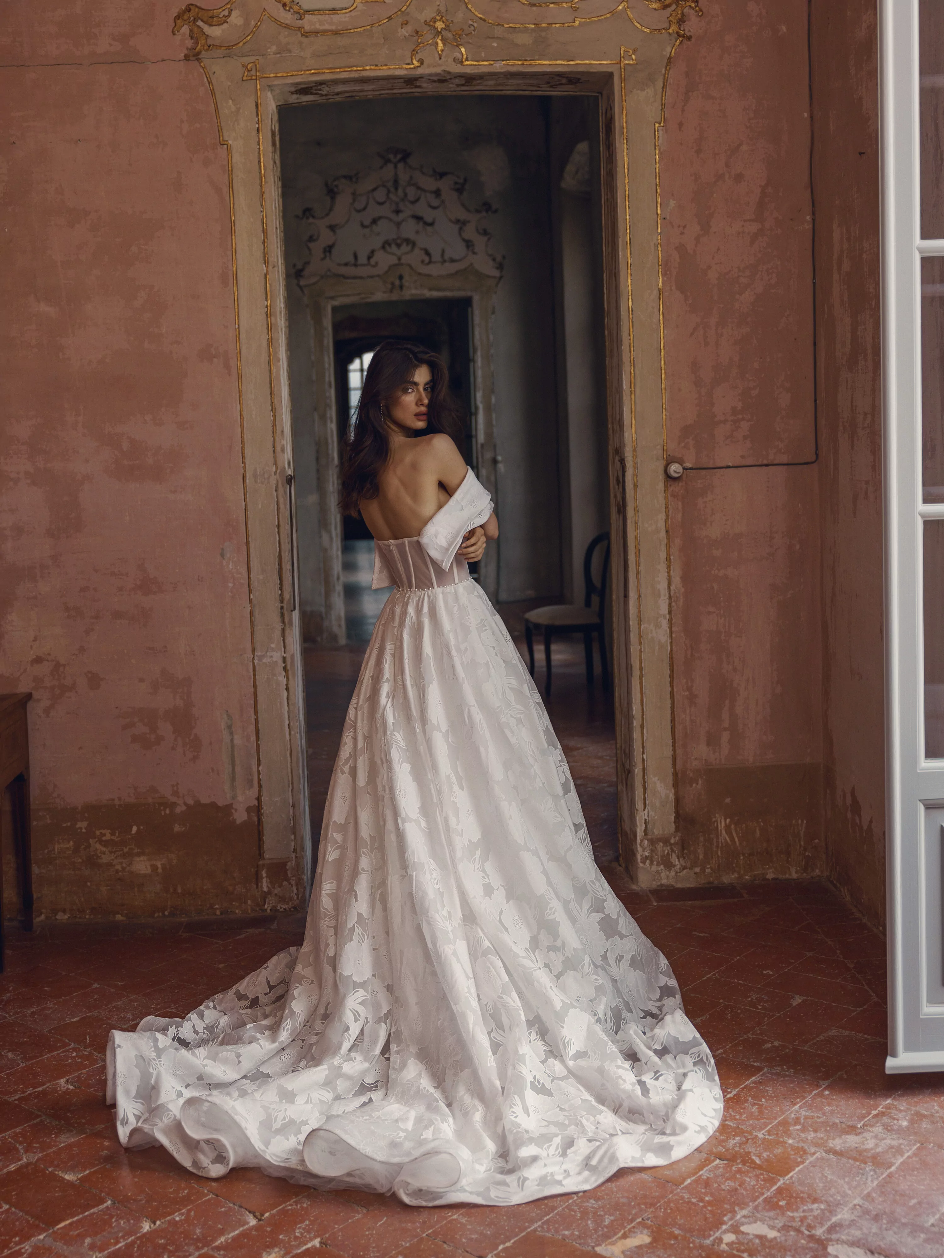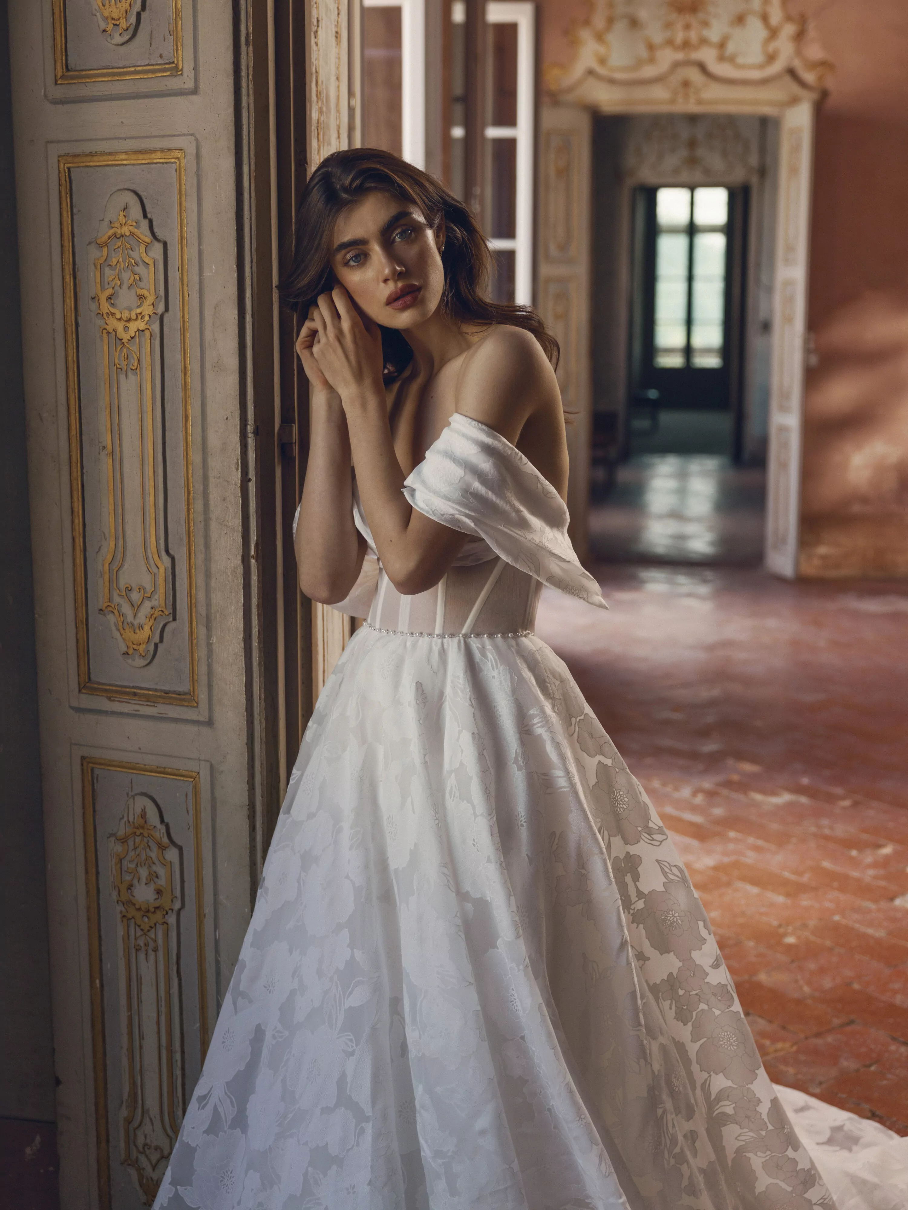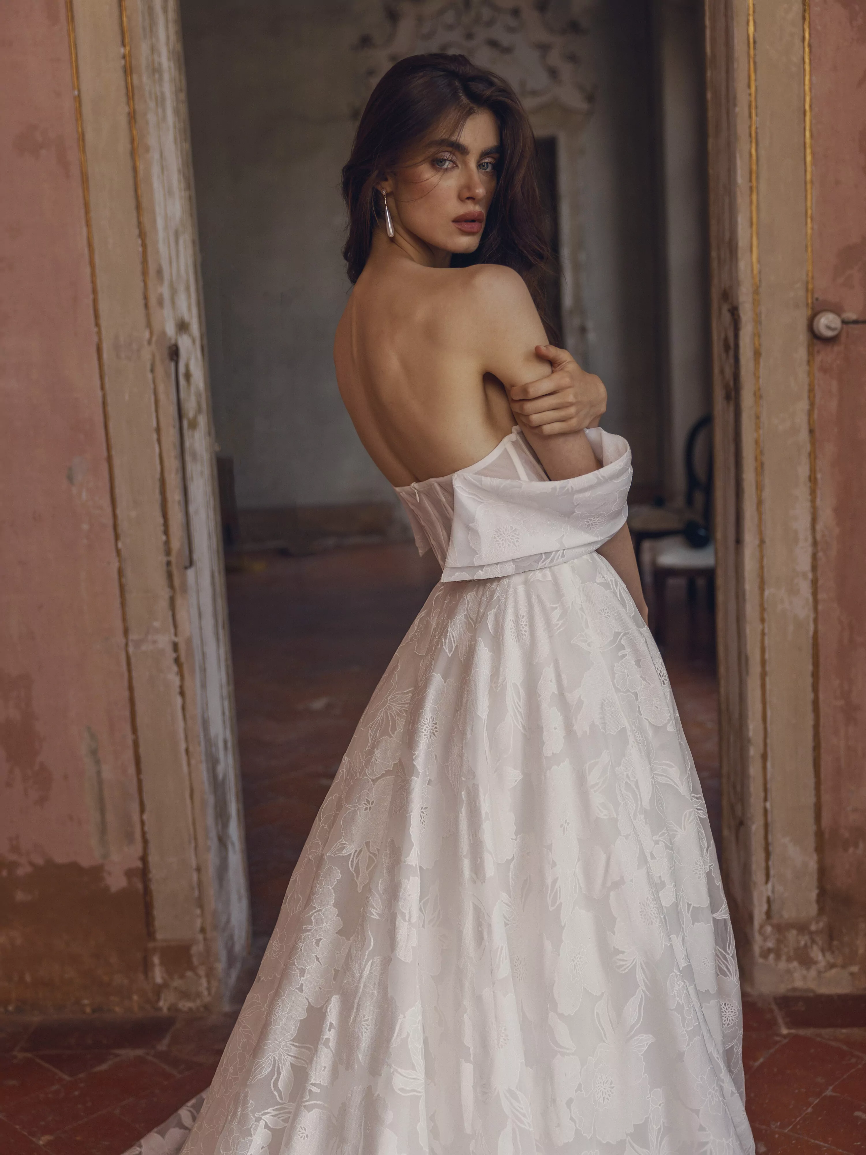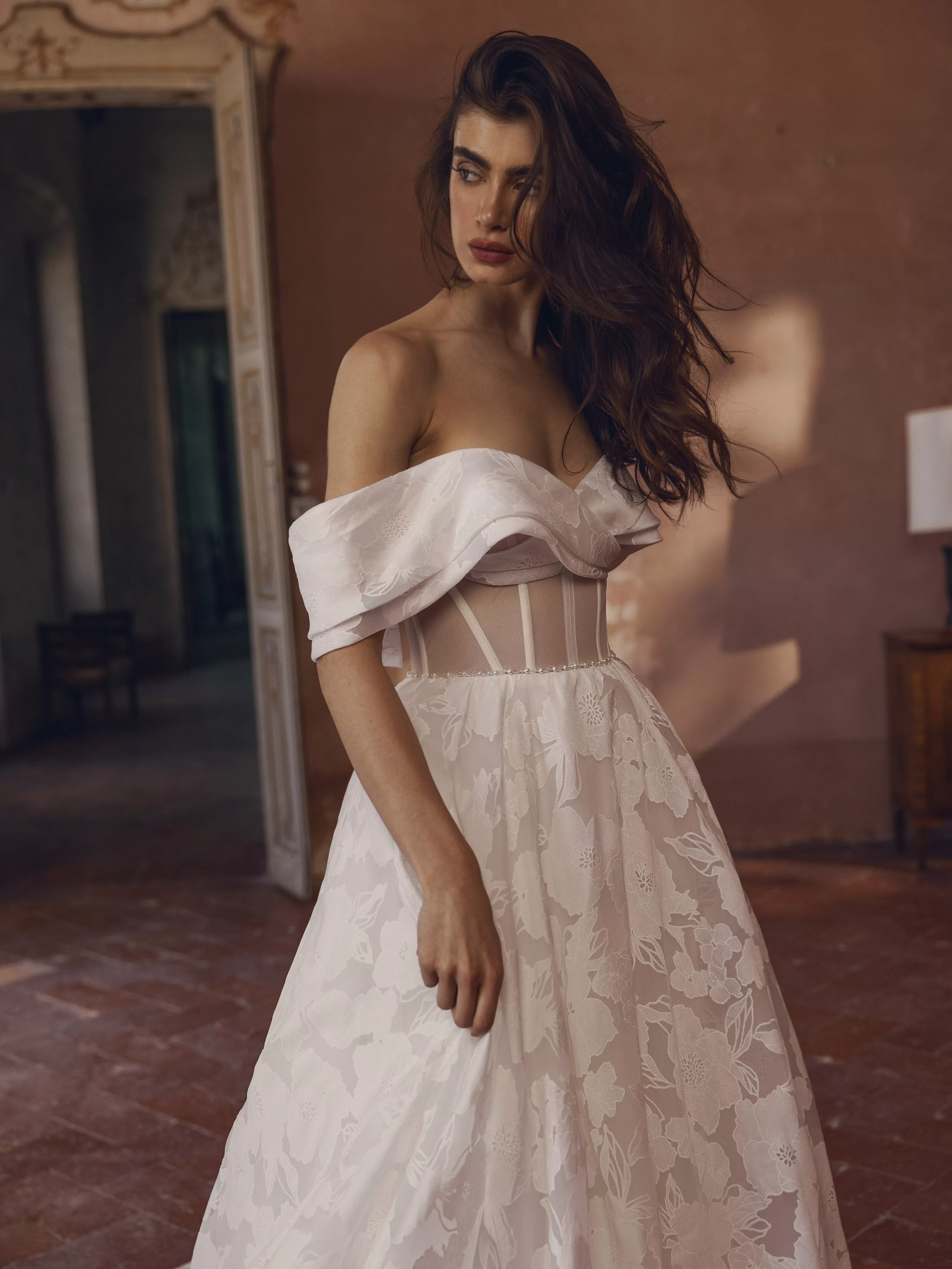 Delicate organza dress with a floral pattern, dropped shoulders and translucent mesh along the corset.