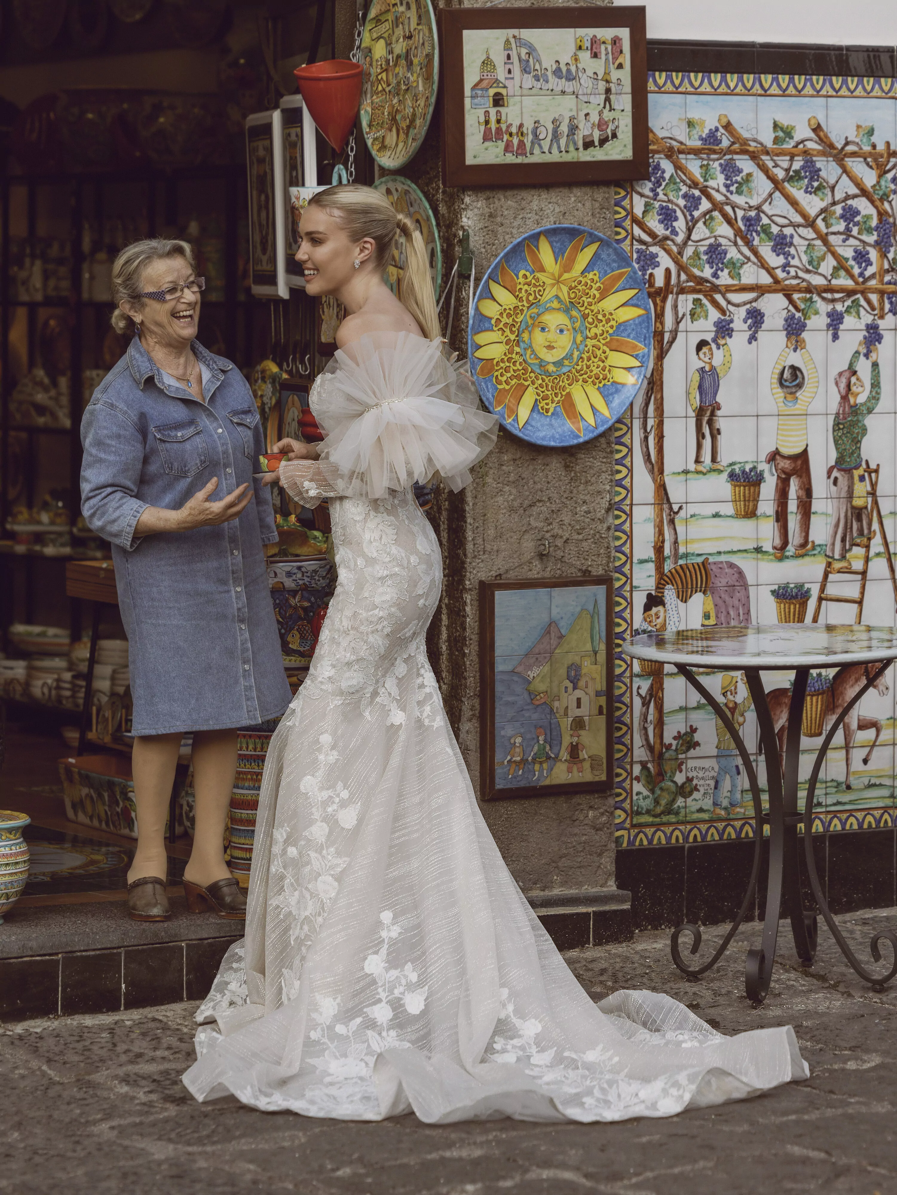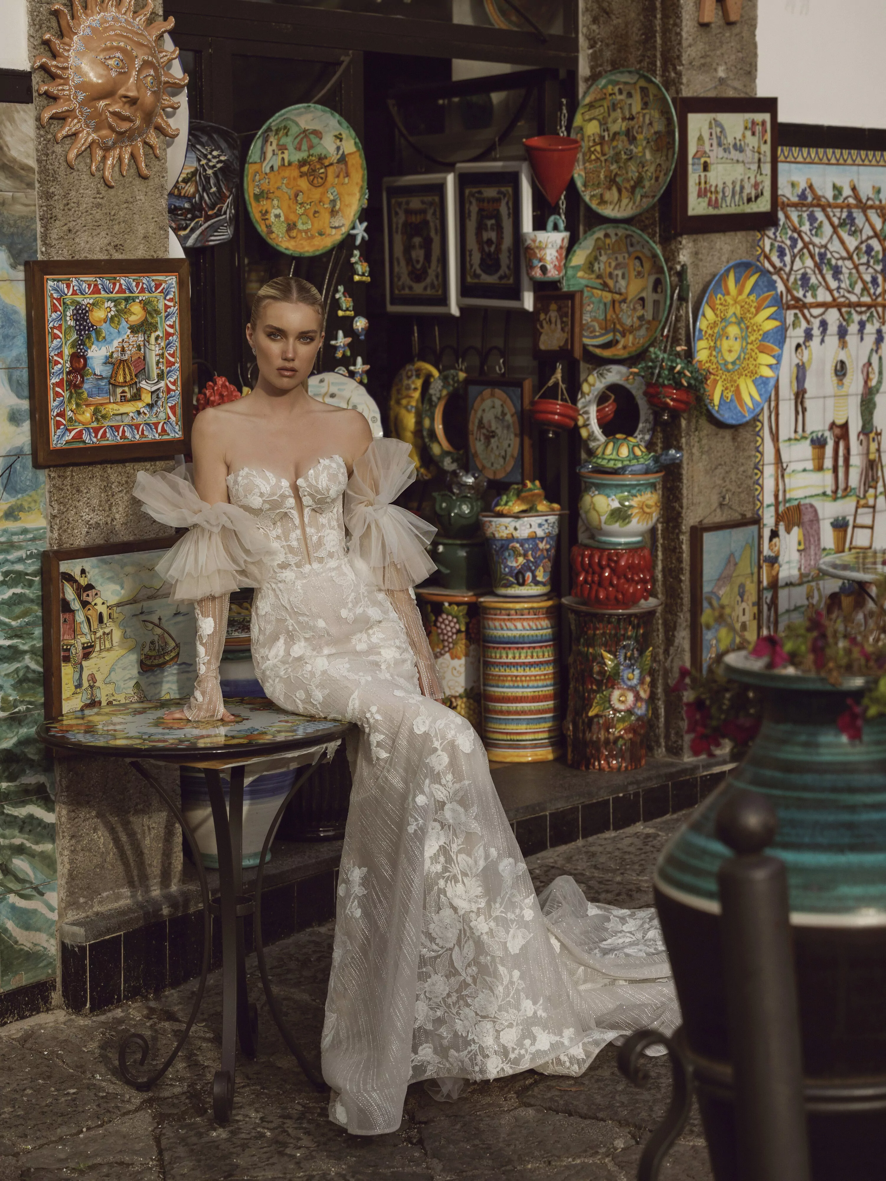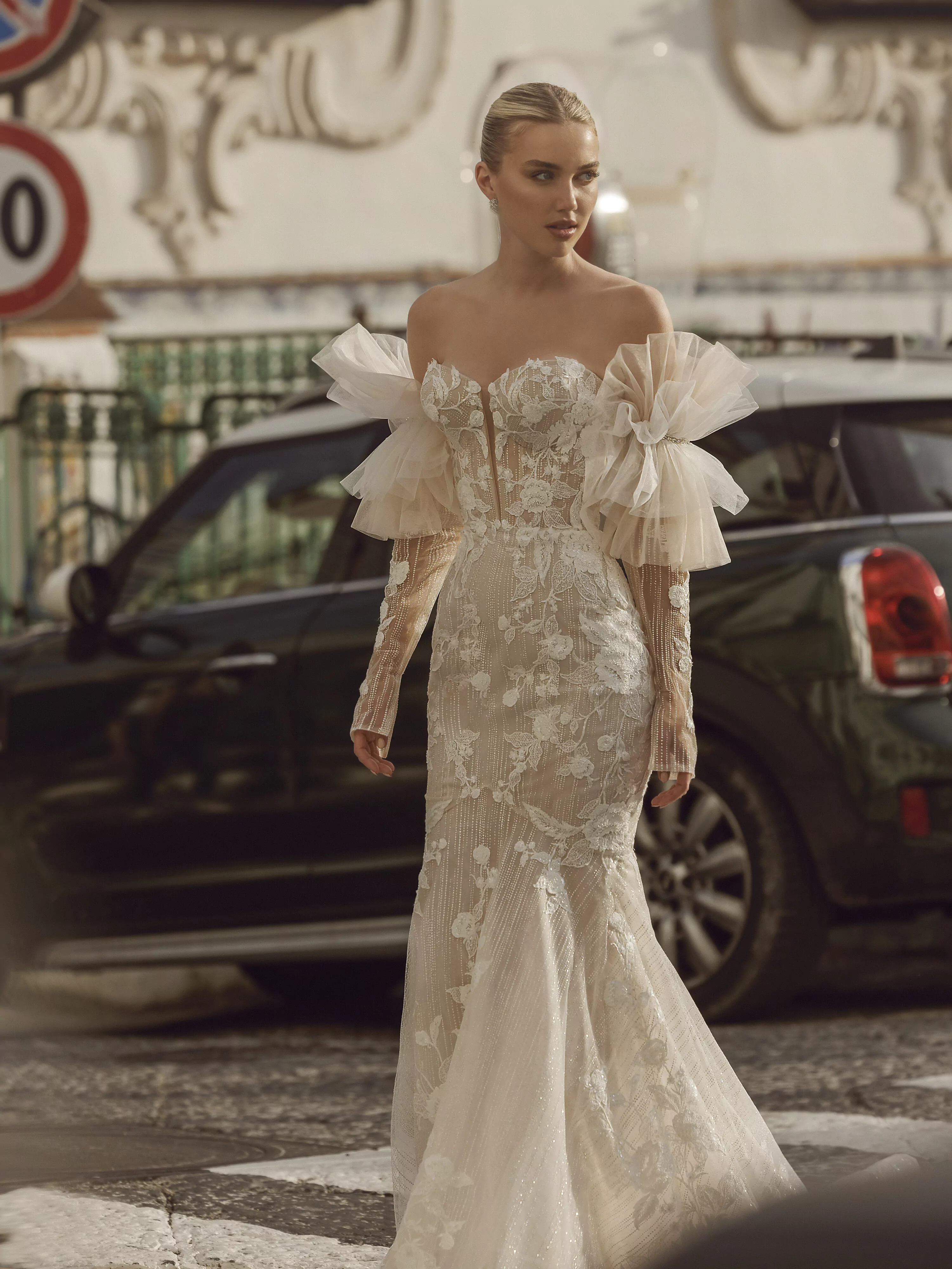 A fitted dress made of shimmering mesh, hand-embroidered with lace, complemented by removable sleeves made of nude mesh and lace.
