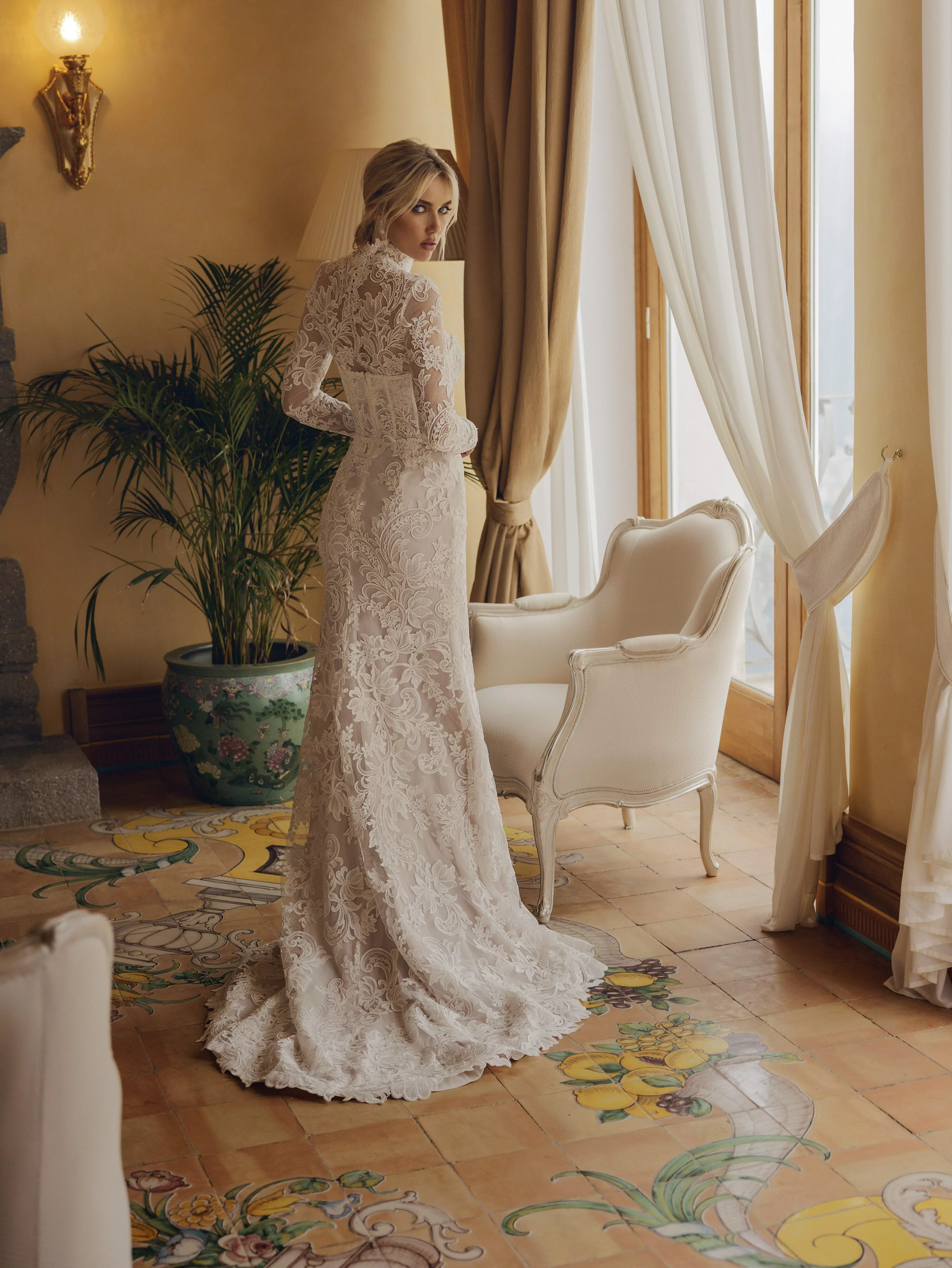This fitted dress is the embodiment of grace and restrained sexuality is made of cord lace. The gown crafted from a deep slit on the leg and complete with detachable bolero with long sleeves and closed neck.