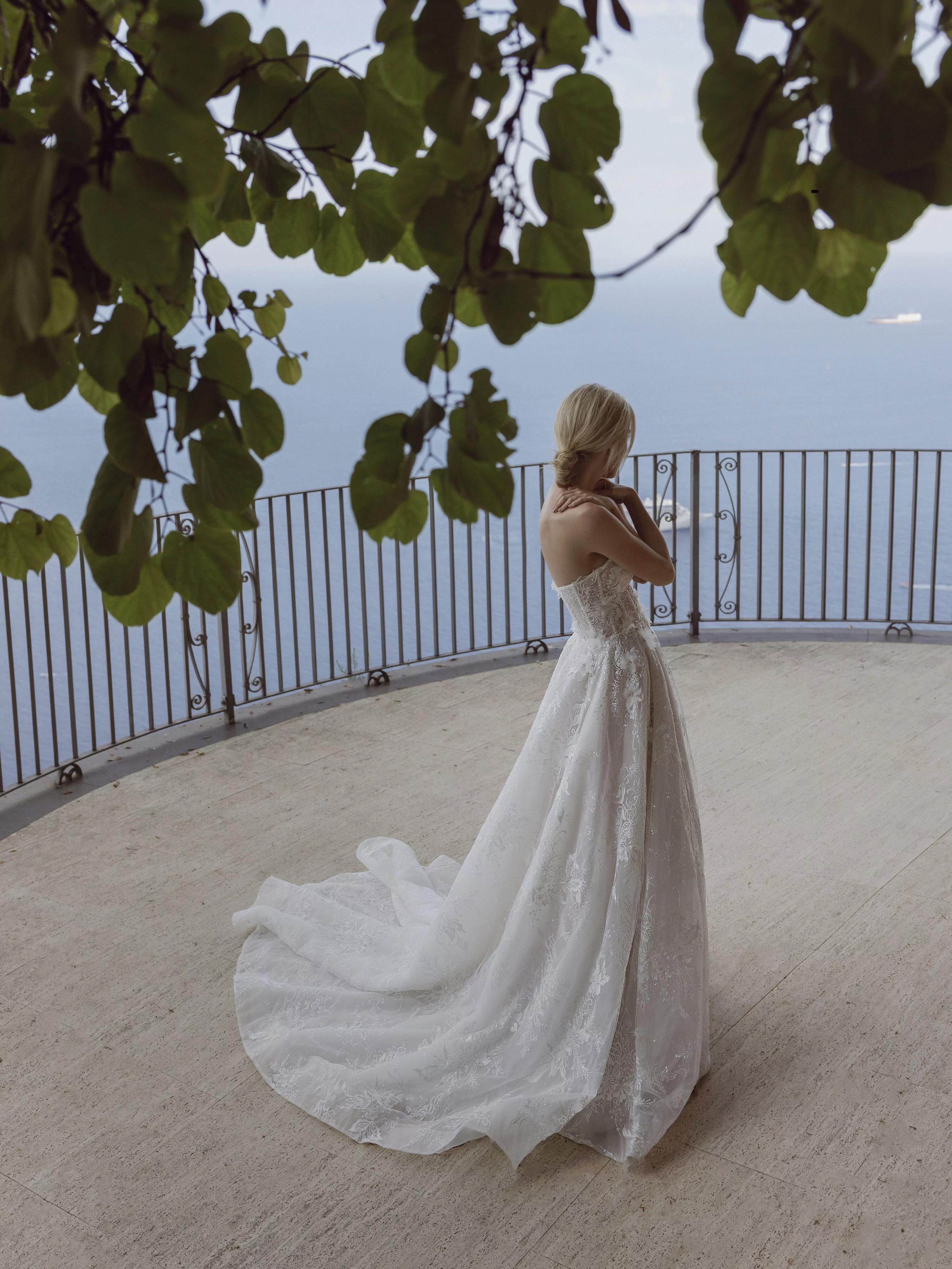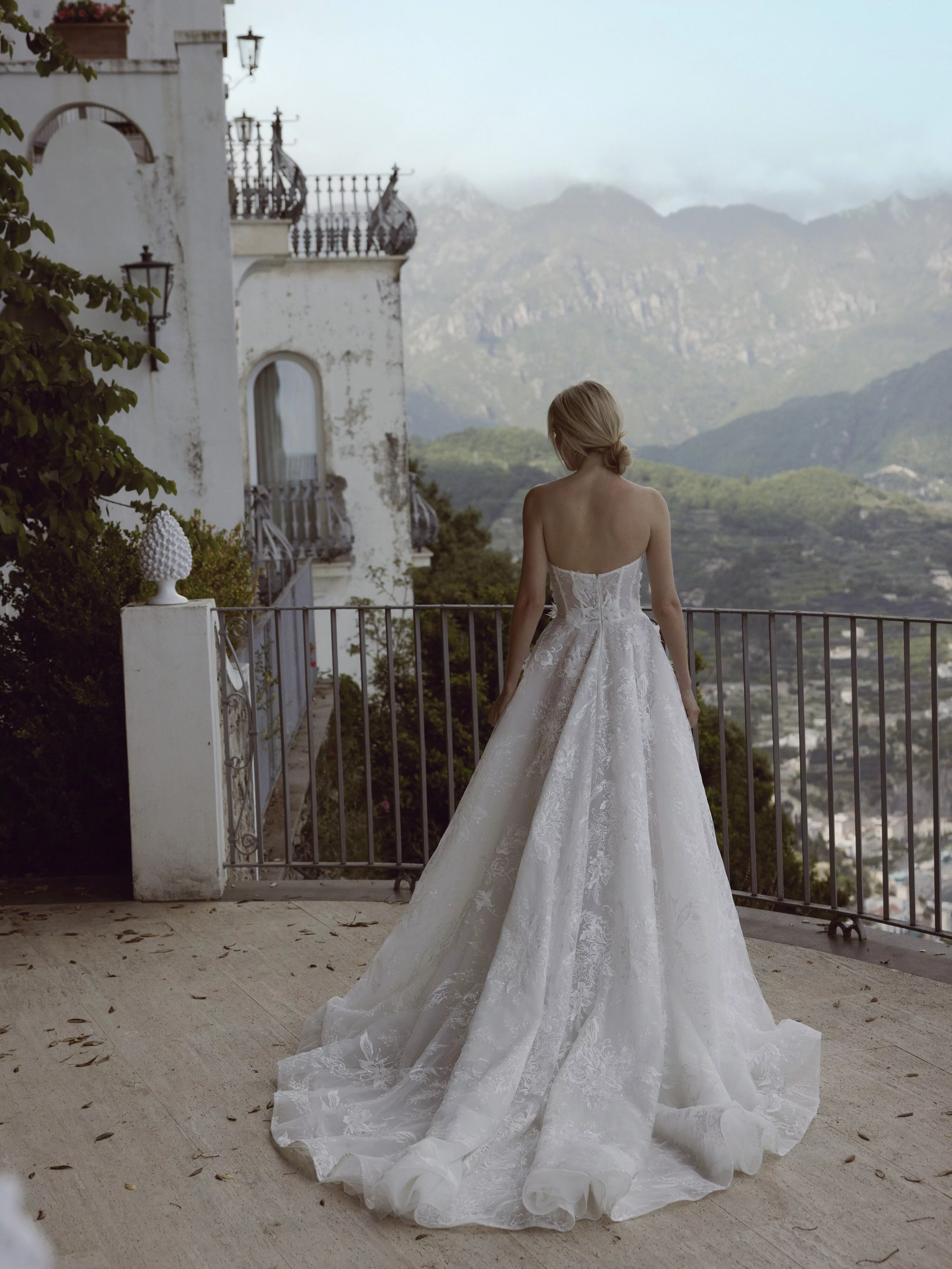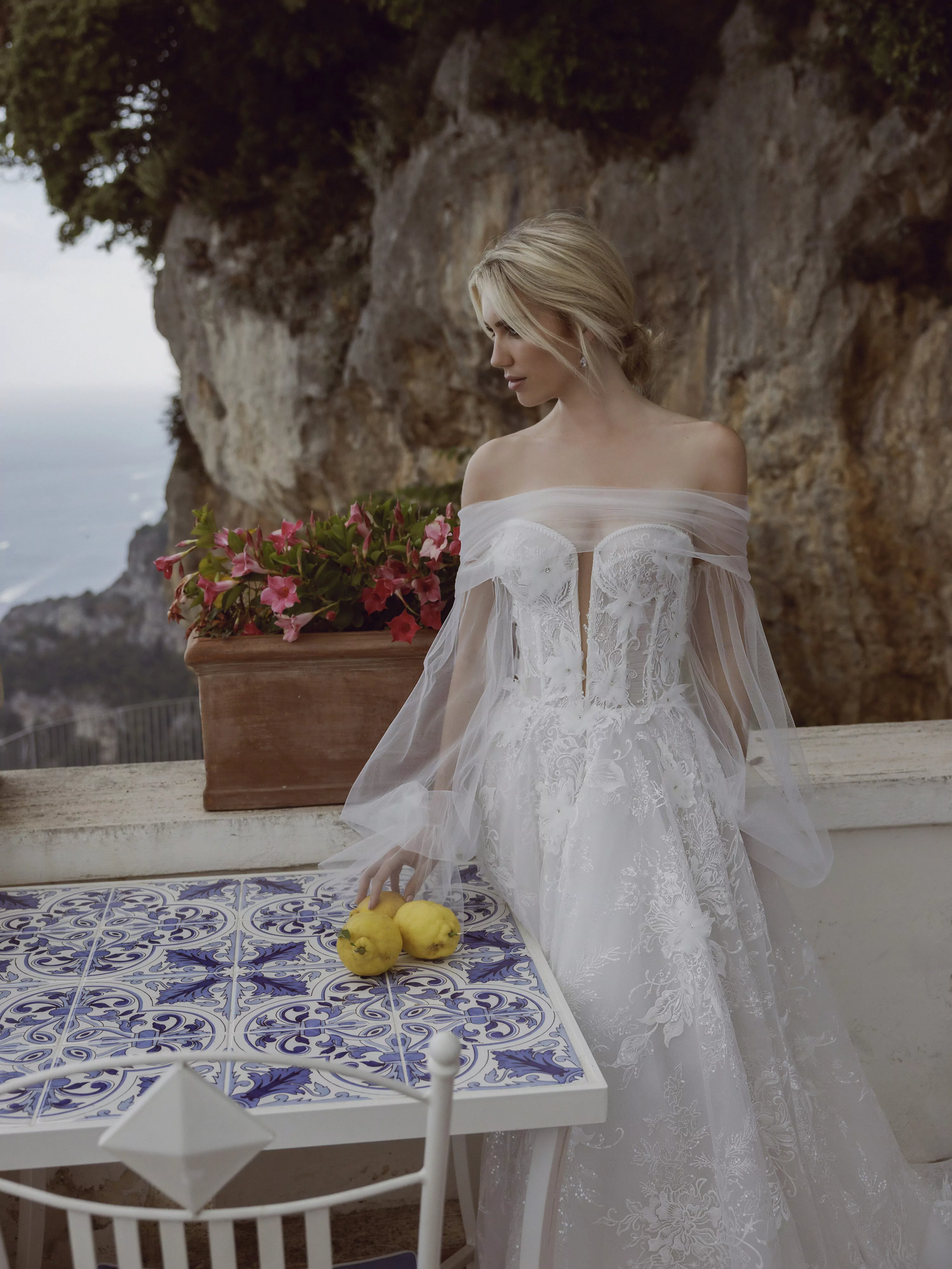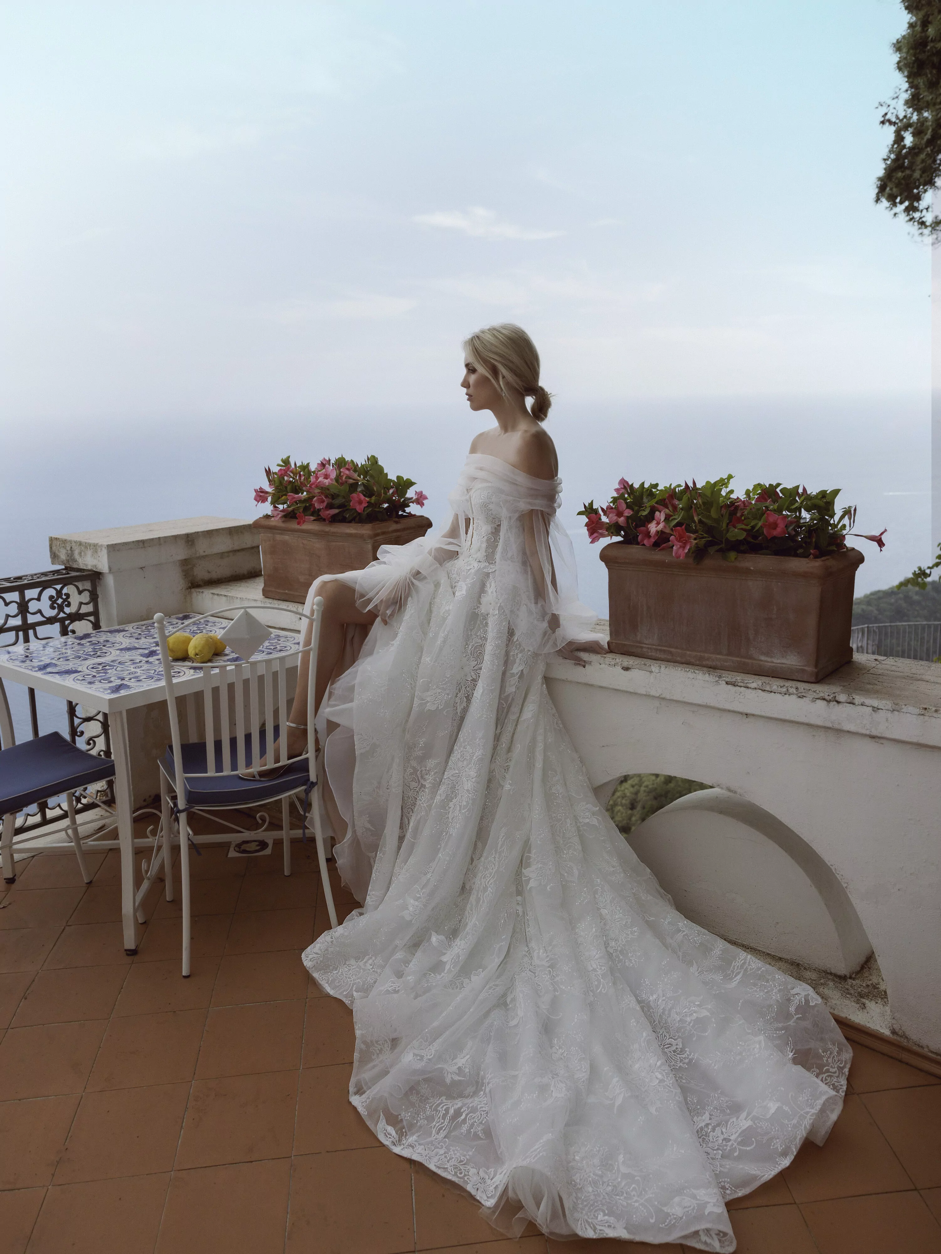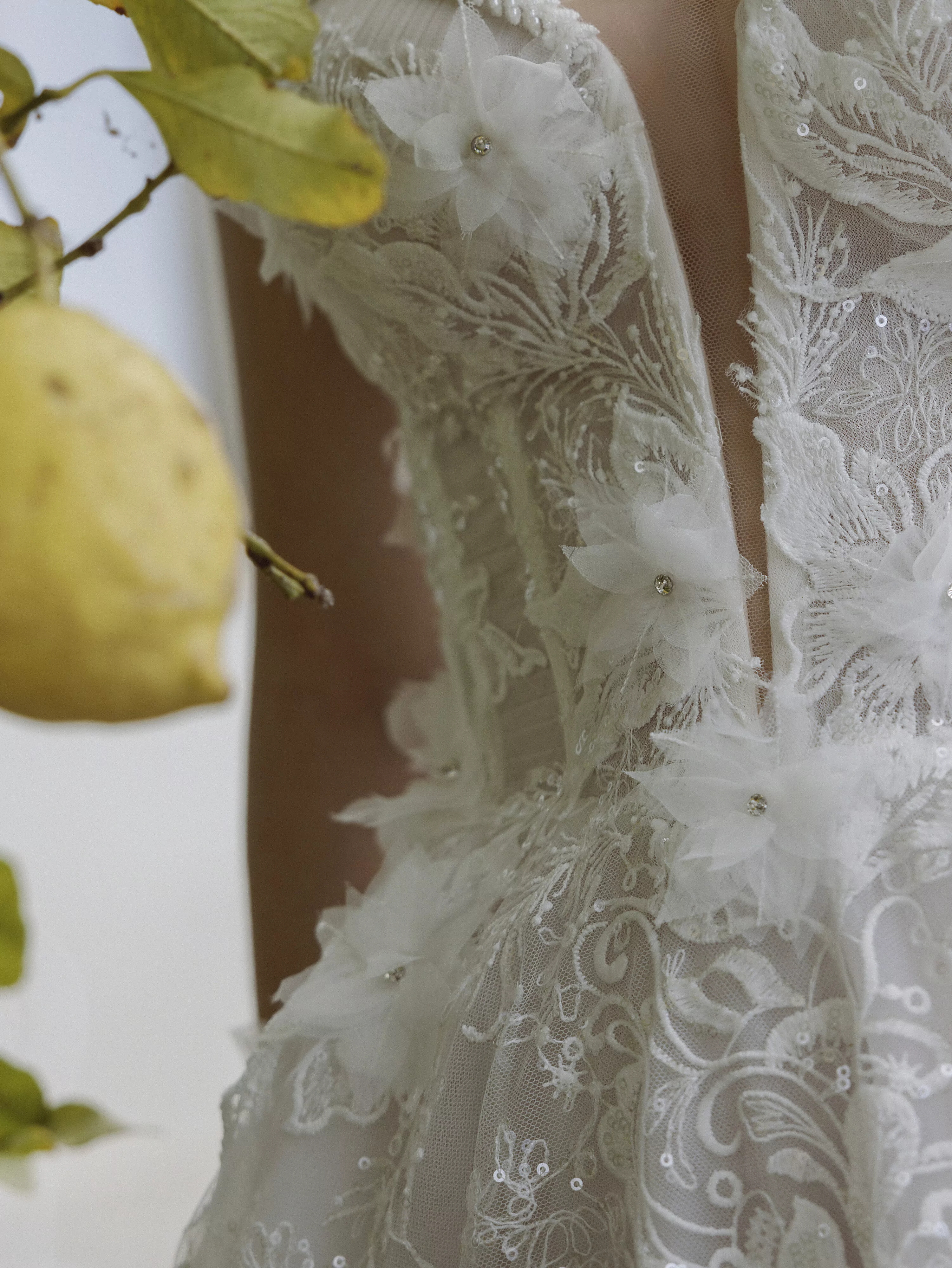 A luxurious lace dress covered in 3D flowers and beautiful illusion of a deep neckline. The dress is complemented by a removable bolero with delicate mesh and voluminous long sleeves.