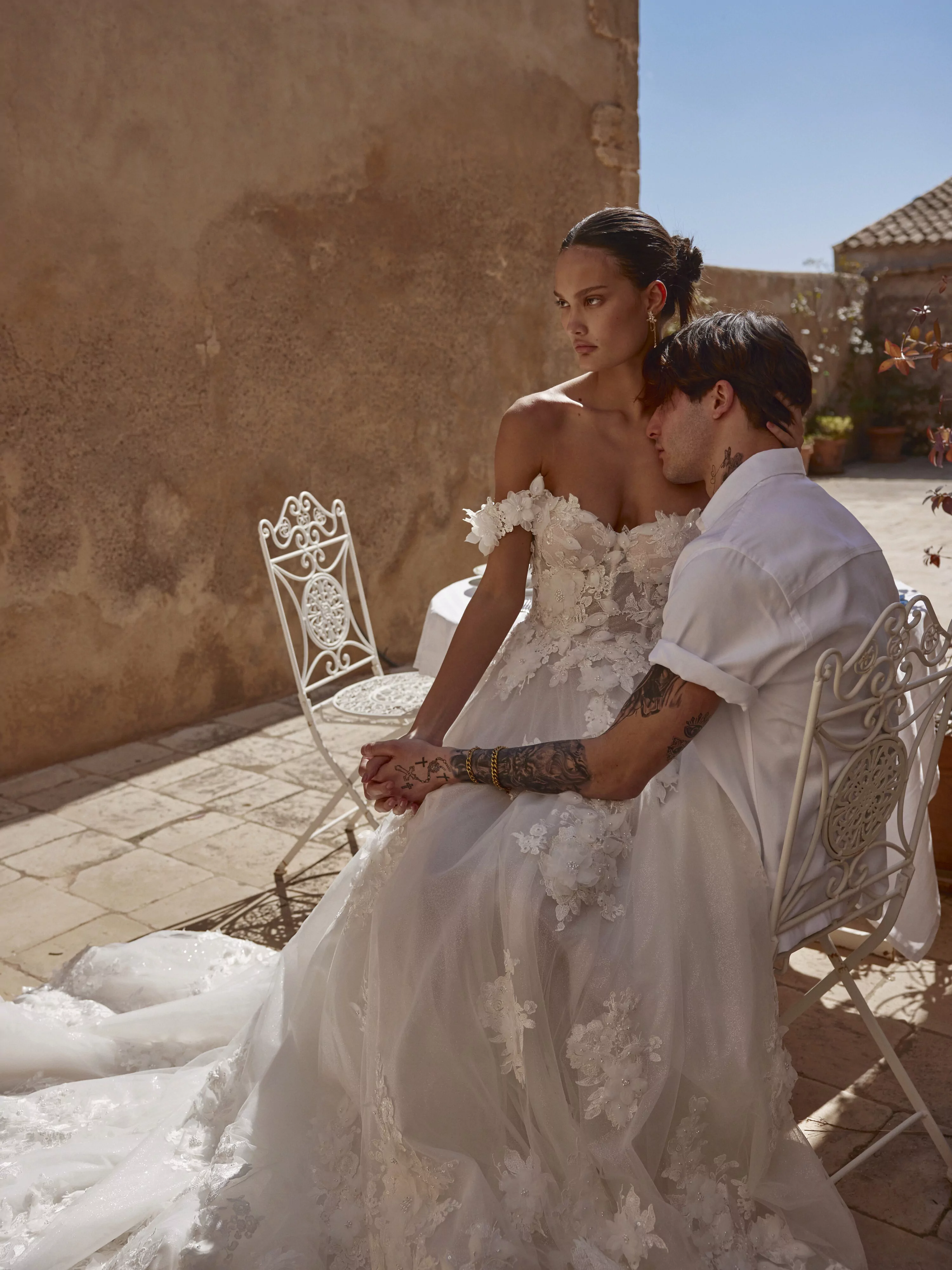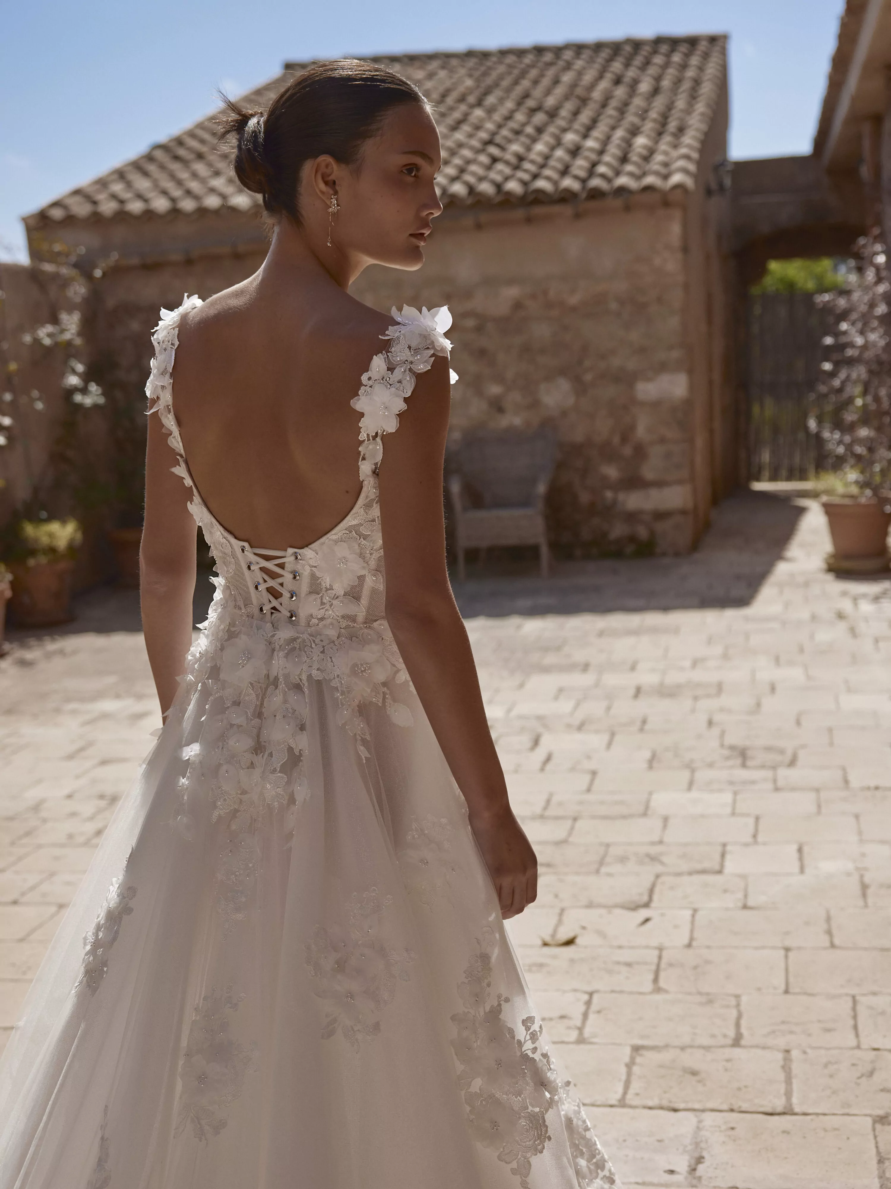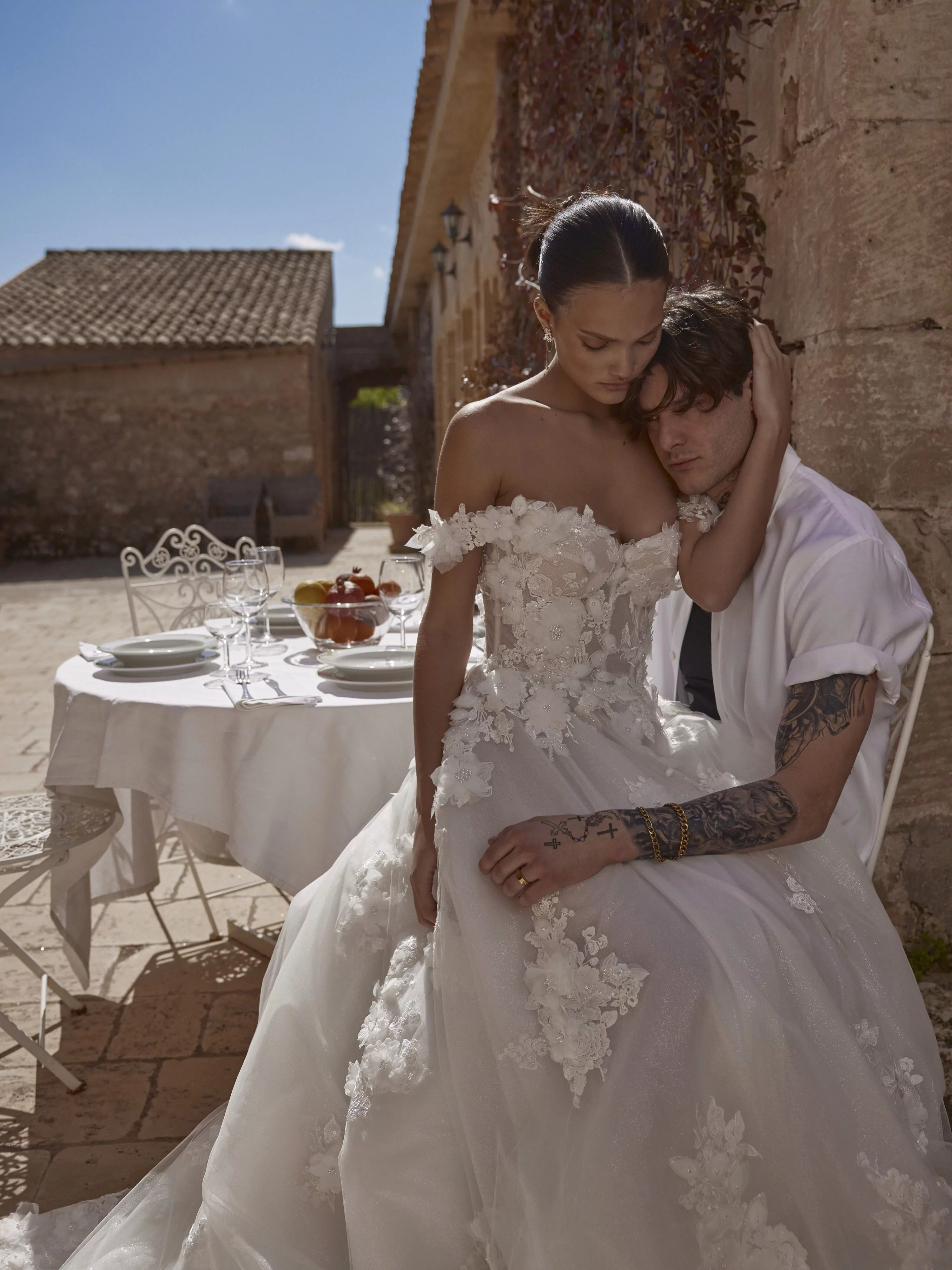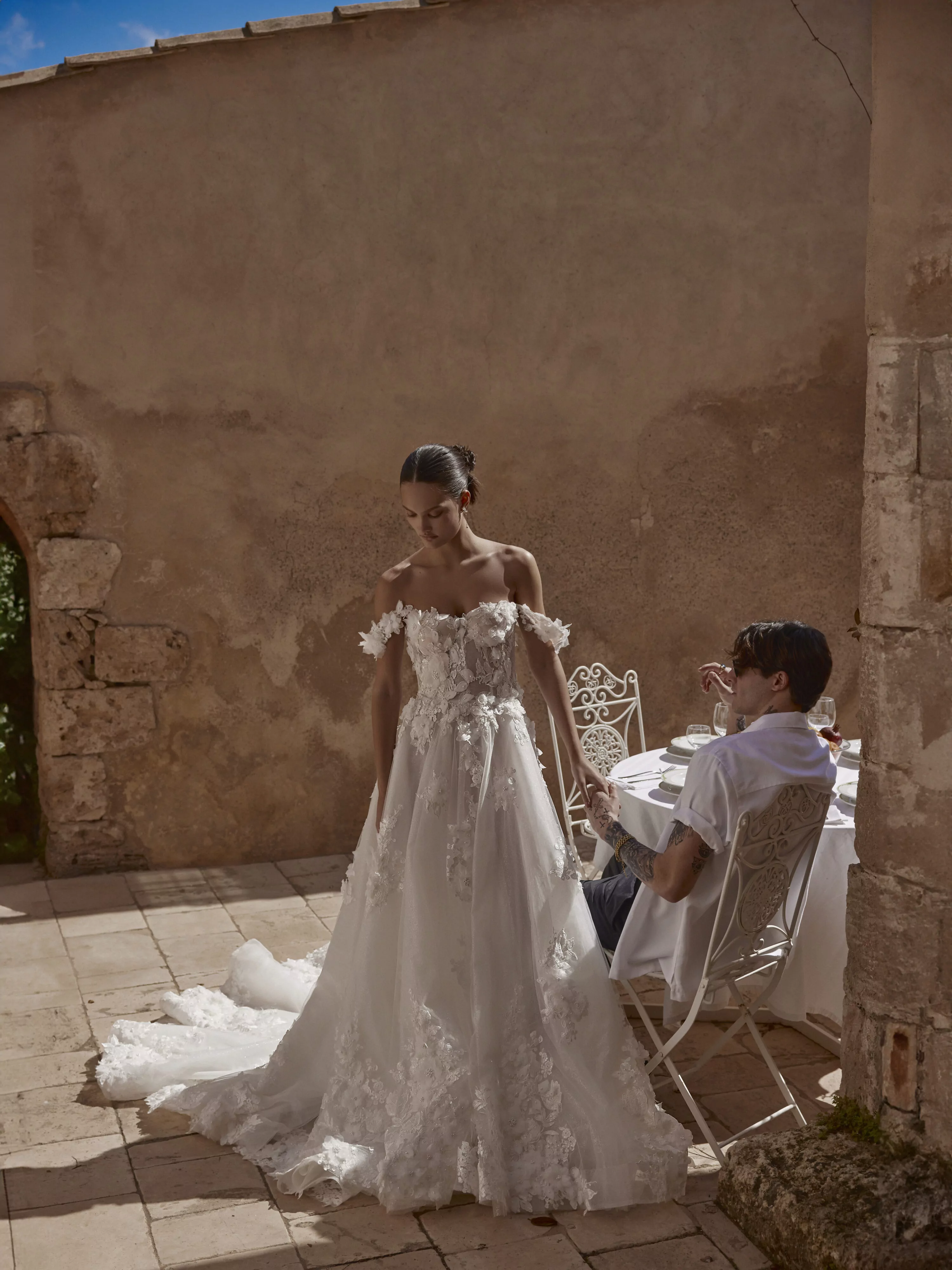 A-line wedding dress made of airy mesh, decorated with 3D floral appliqués and pearls. Featuring a sweetheart semi-transparent corset, off-the-shoulder lace straps embellished with flowers, lace-up closure on the back, and a full tulle skirt with a train.