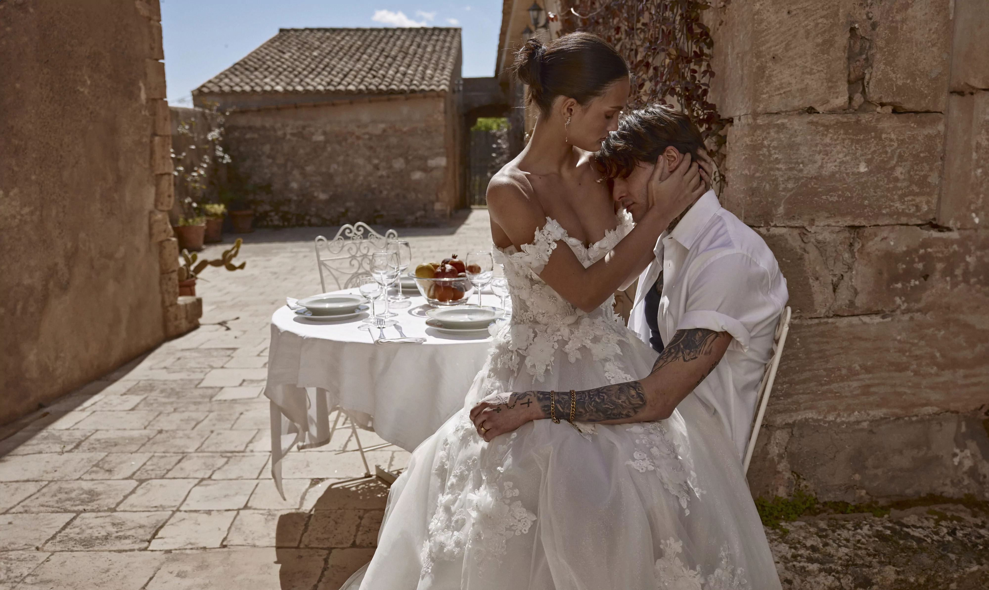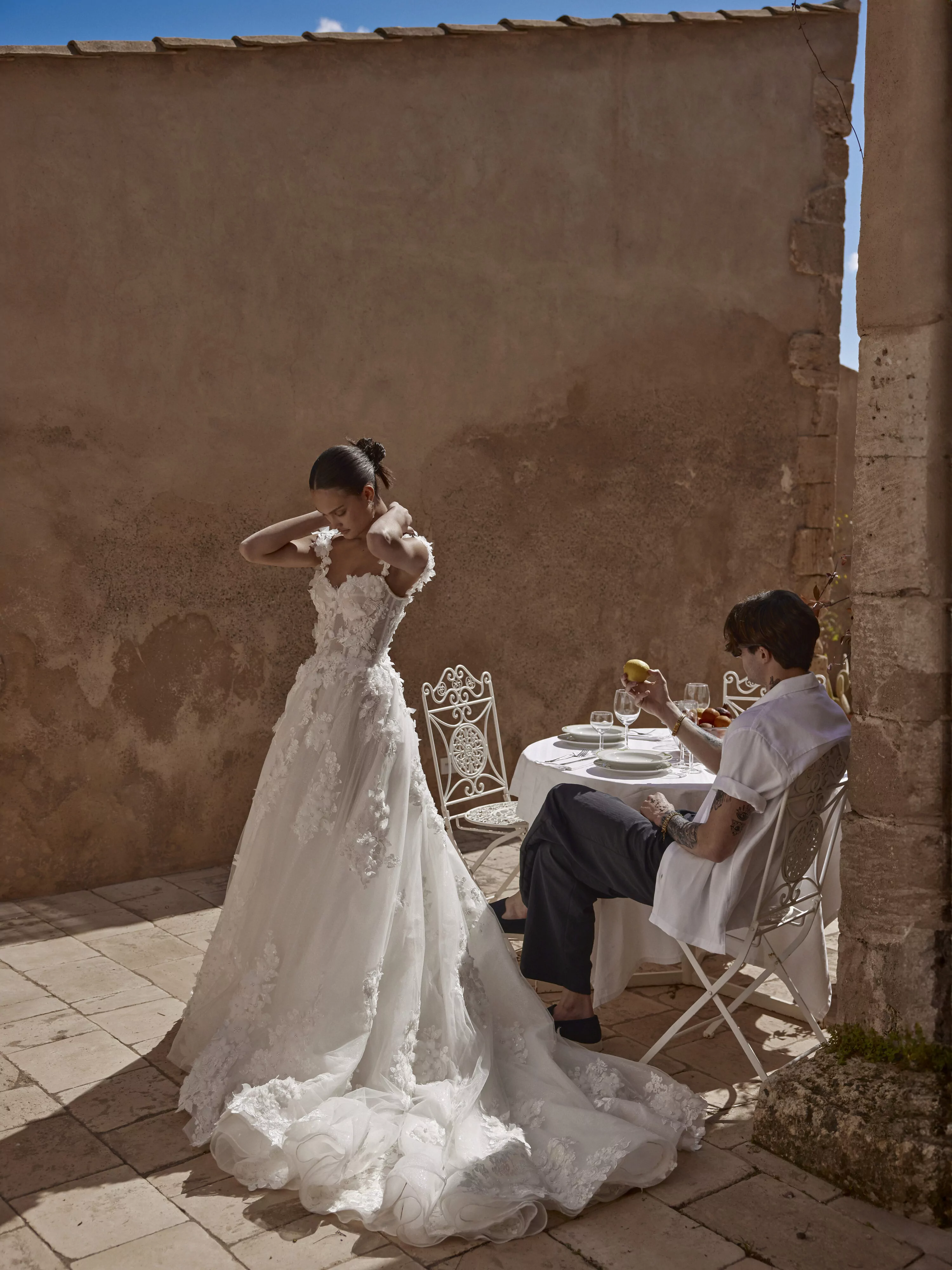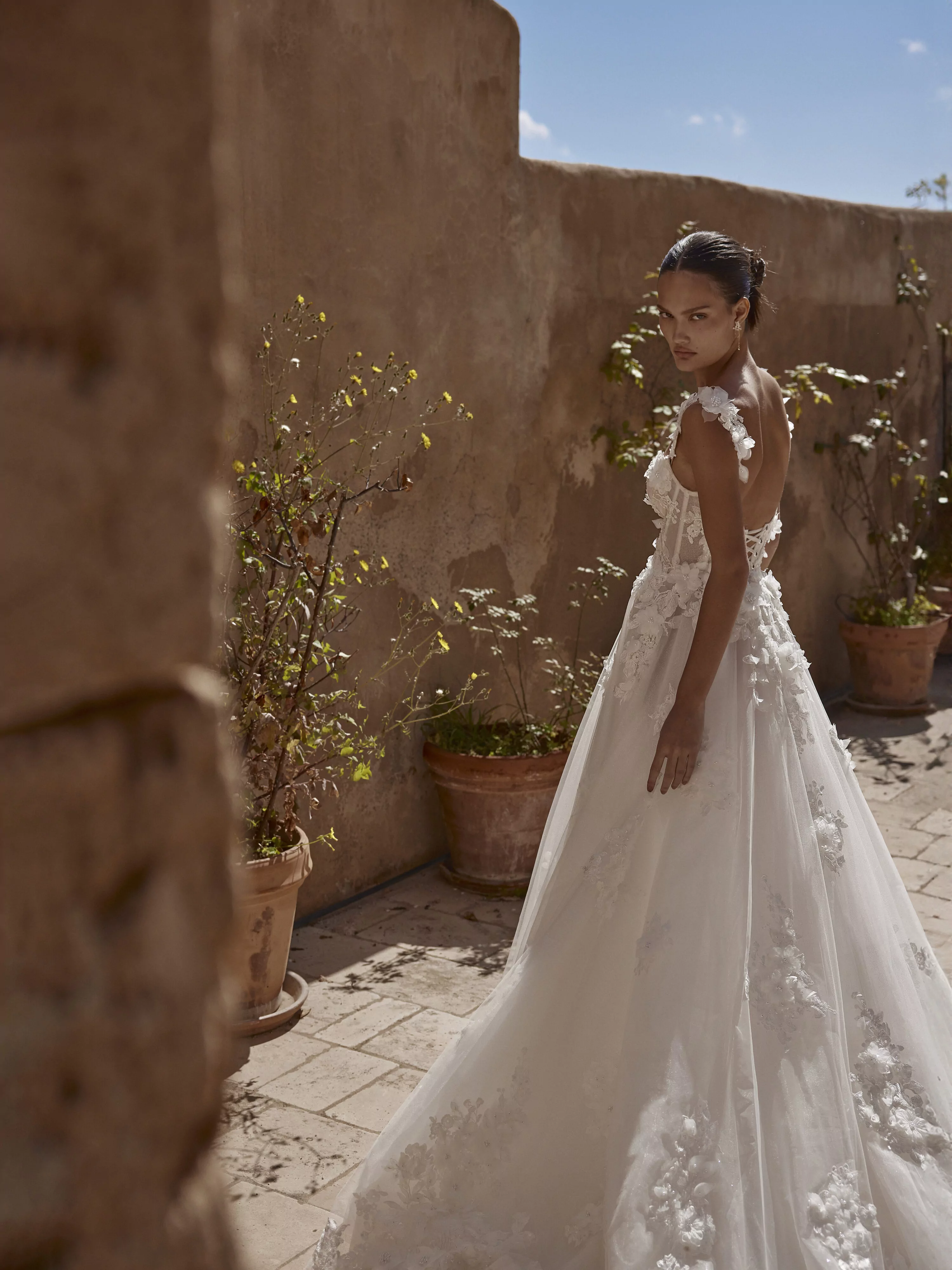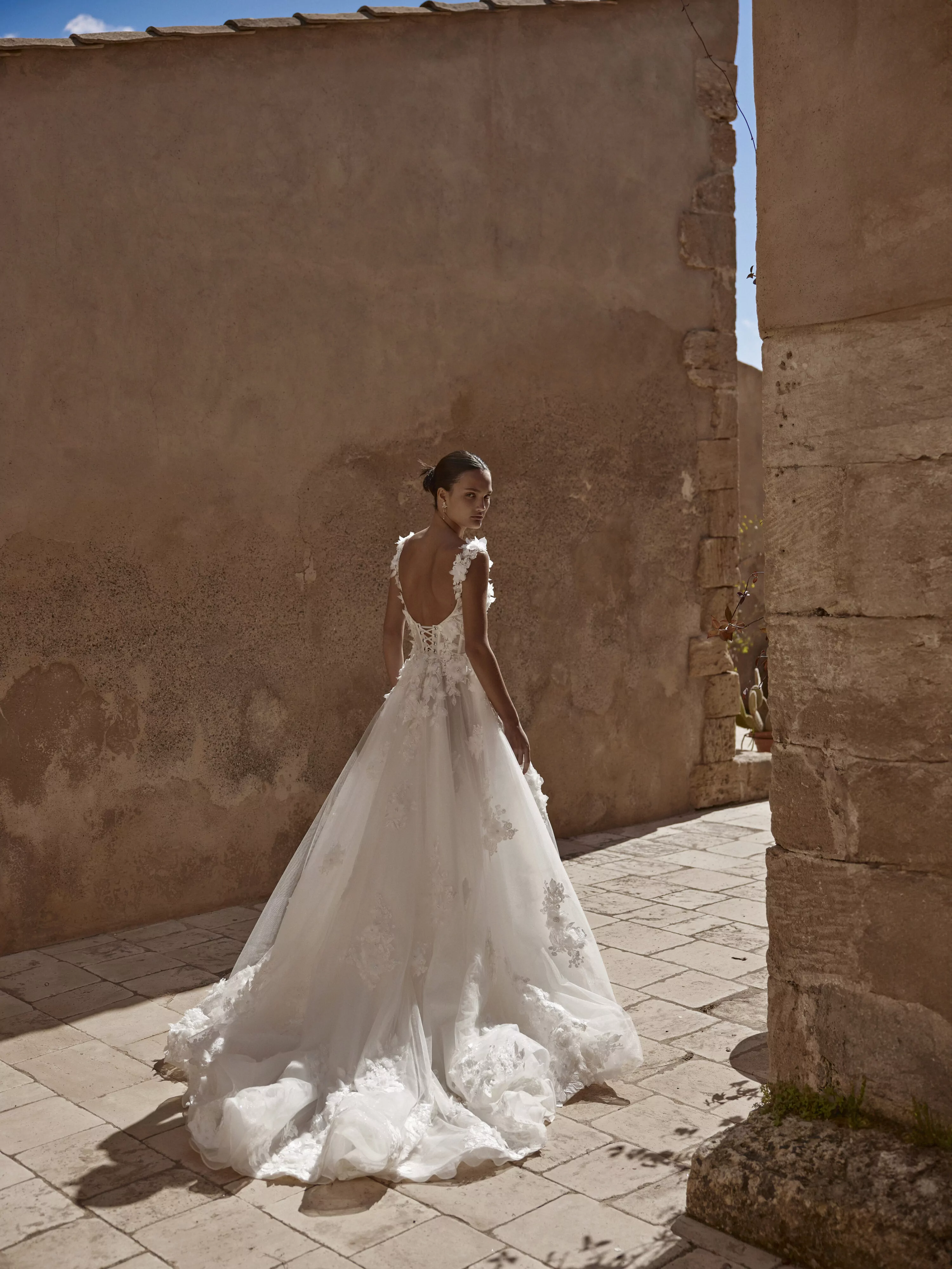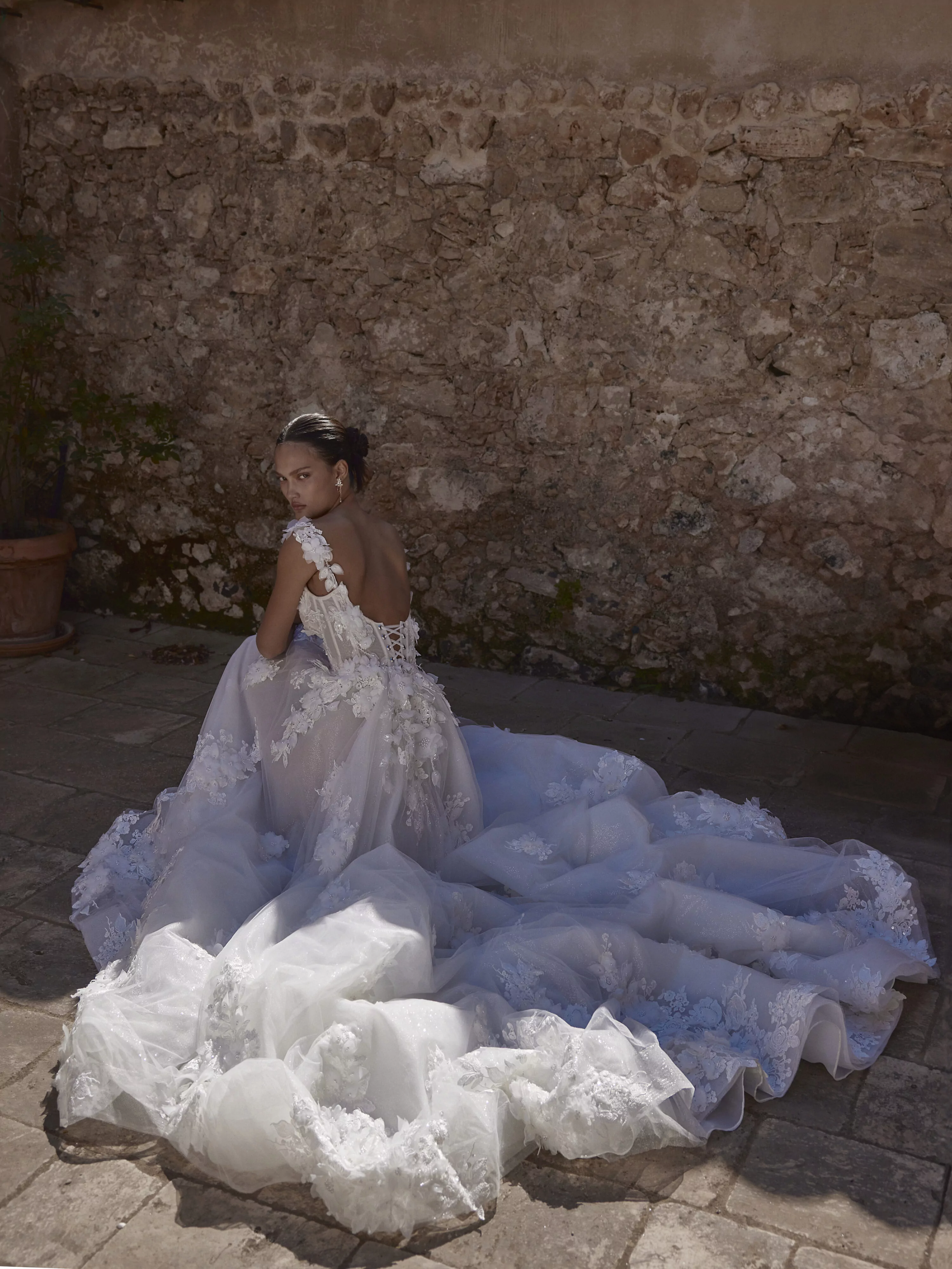 A-line wedding dress made of airy mesh, decorated with 3D floral appliqués and pearls. Featuring a sweetheart semi-transparent corset, off-the-shoulder lace straps embellished with flowers, lace-up closure on the back, and a full tulle skirt with a train.