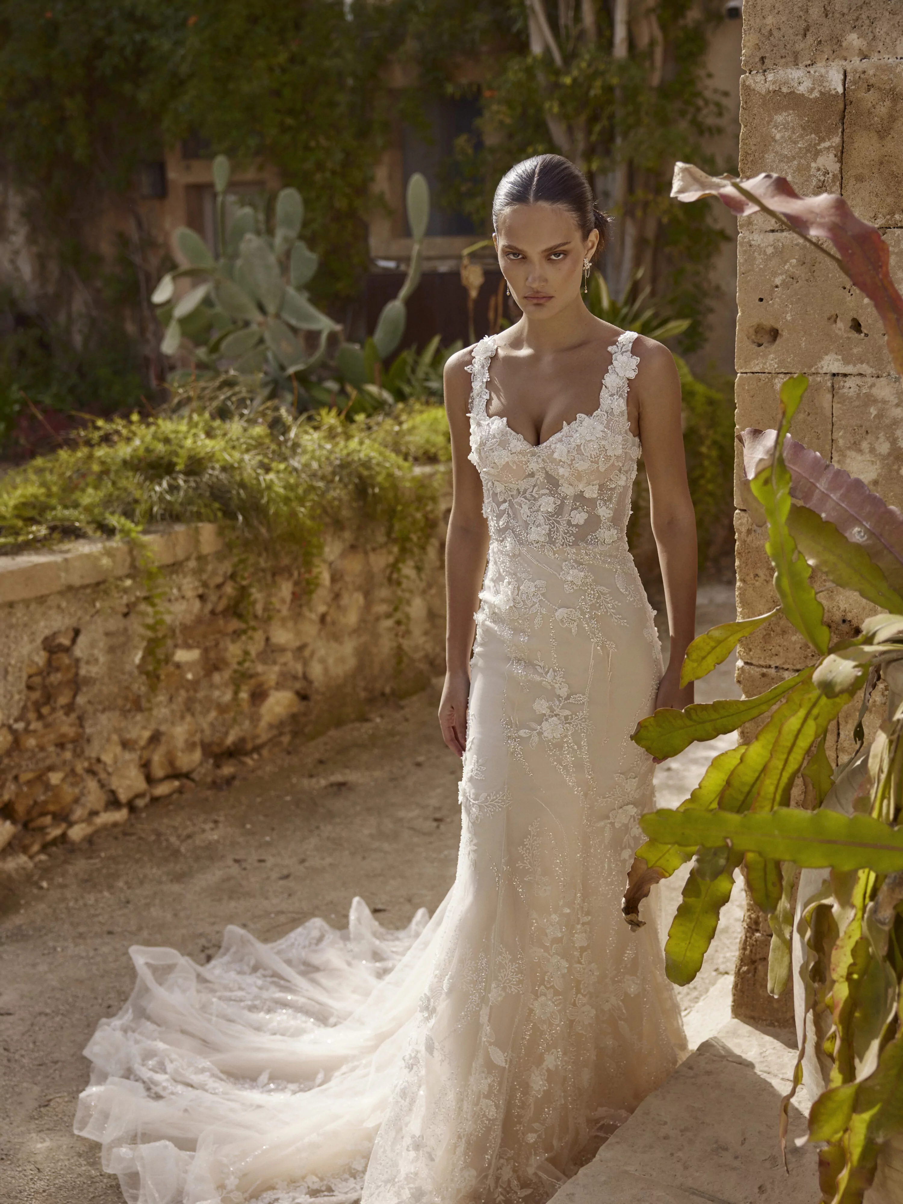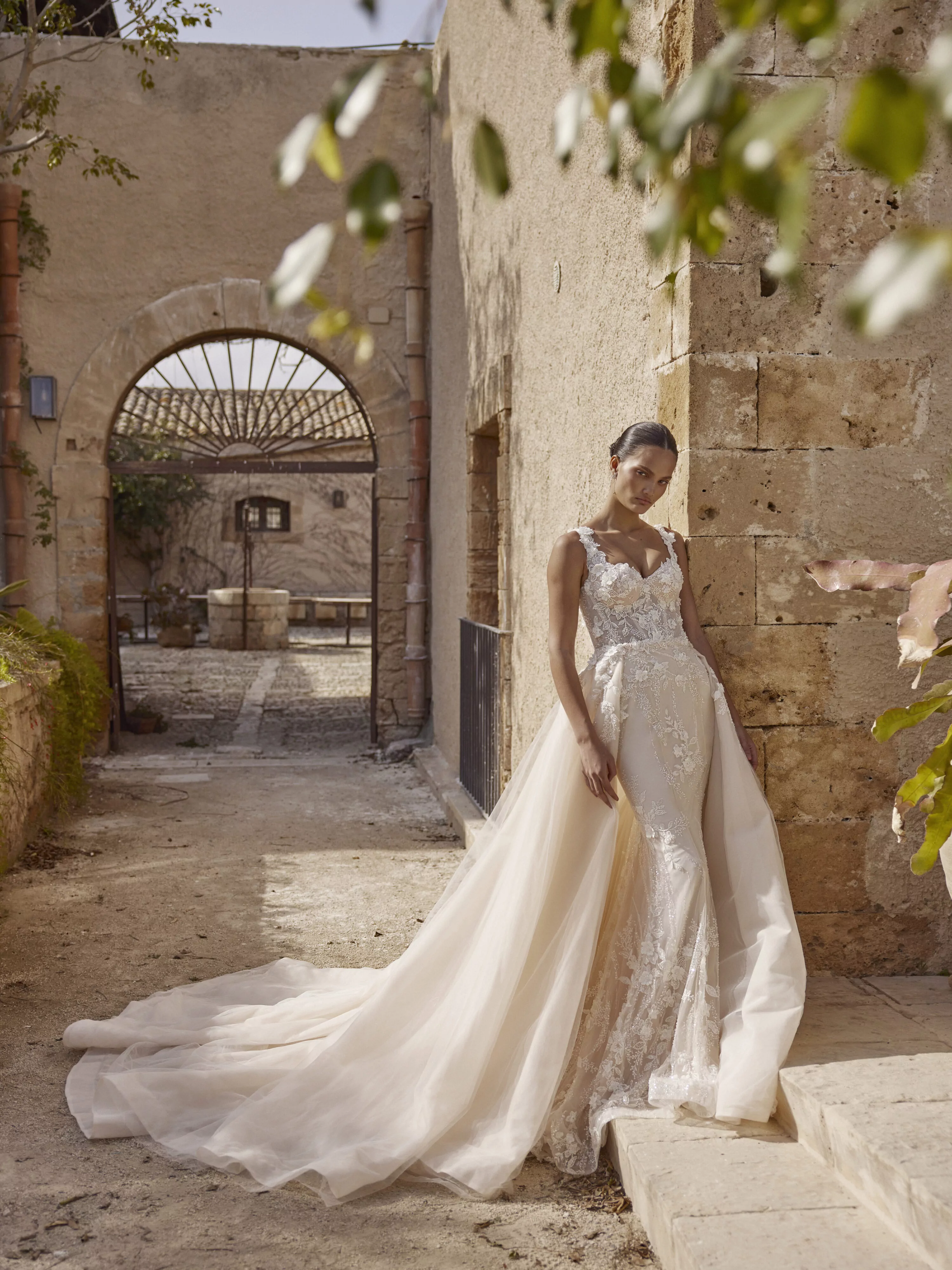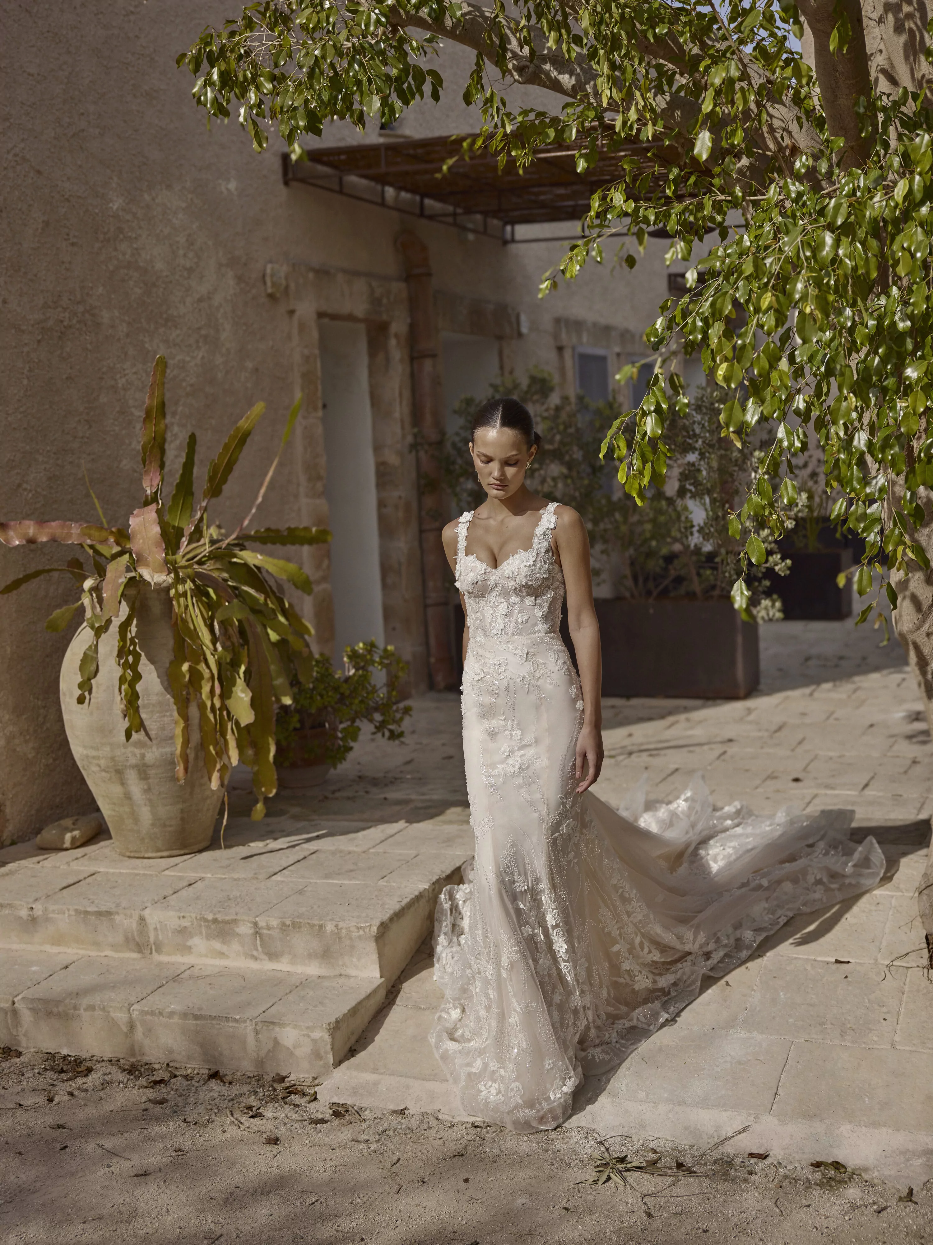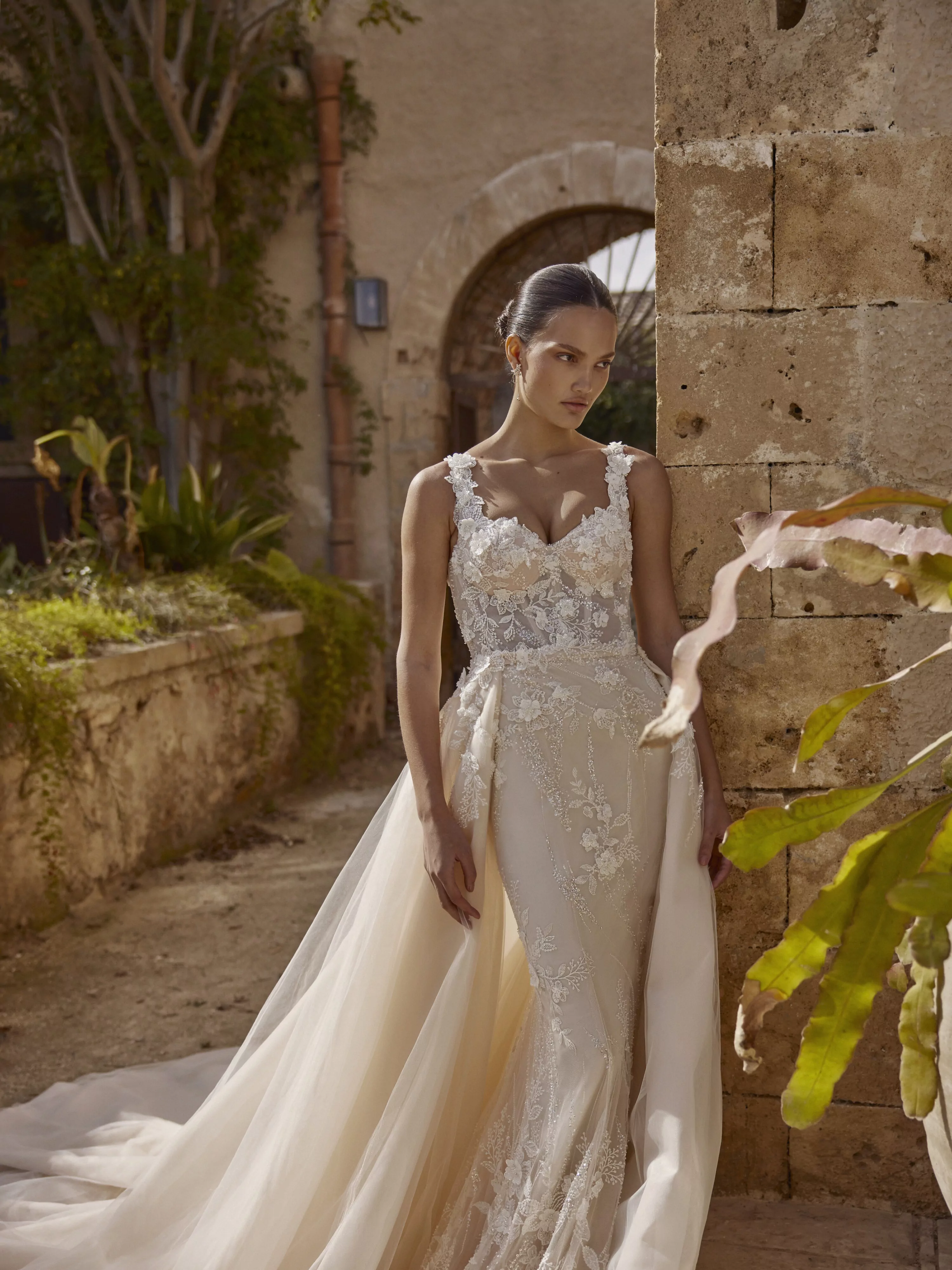 Elegant gown featuring a mermaid silhouette with a sweetheart neckline, beautifully tracing the body's contours. The dress comes in a light nude shade and includes delicate straps. Crafted from delicate lace with intricate floral appliqués, the gown shimmers subtly with light-catching sequins. The detachable train provides a romantic, ethereal look, perfect for making a grand entrance.