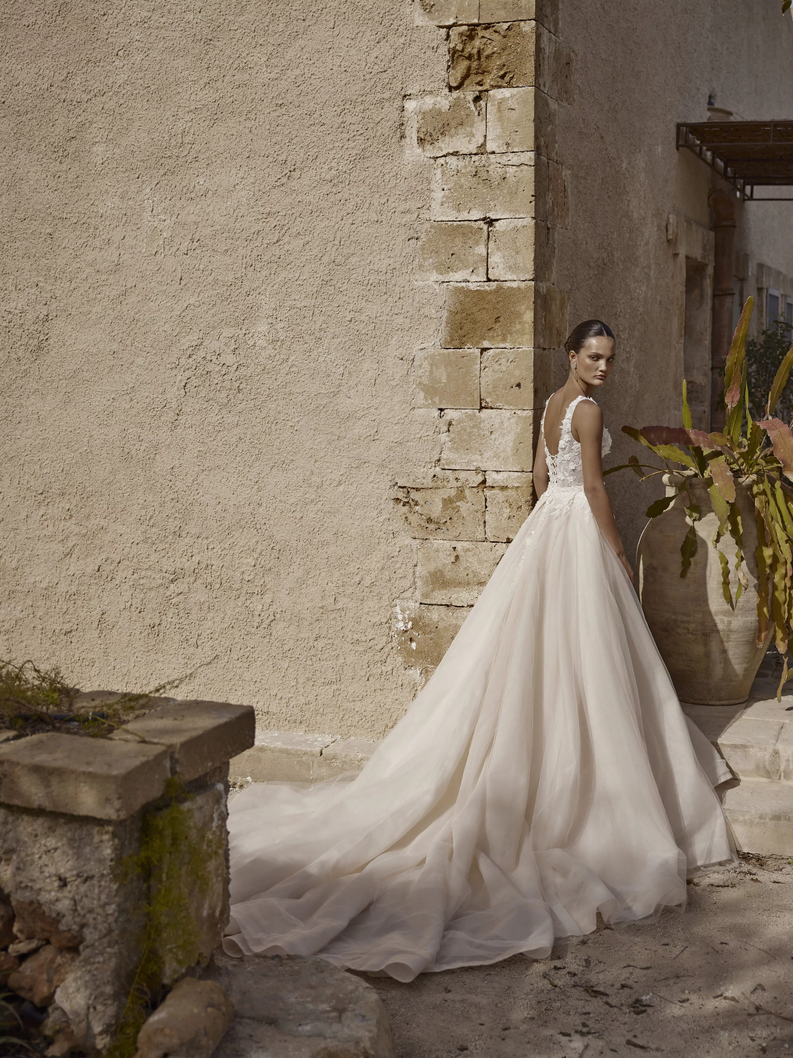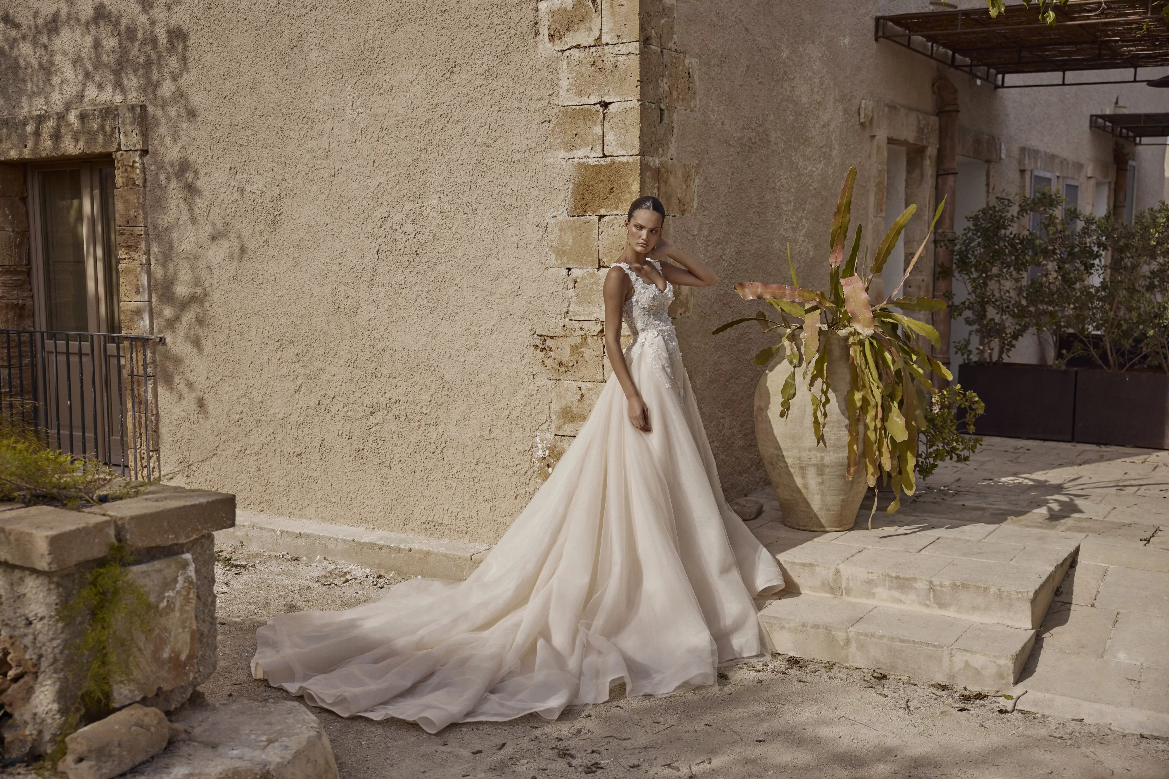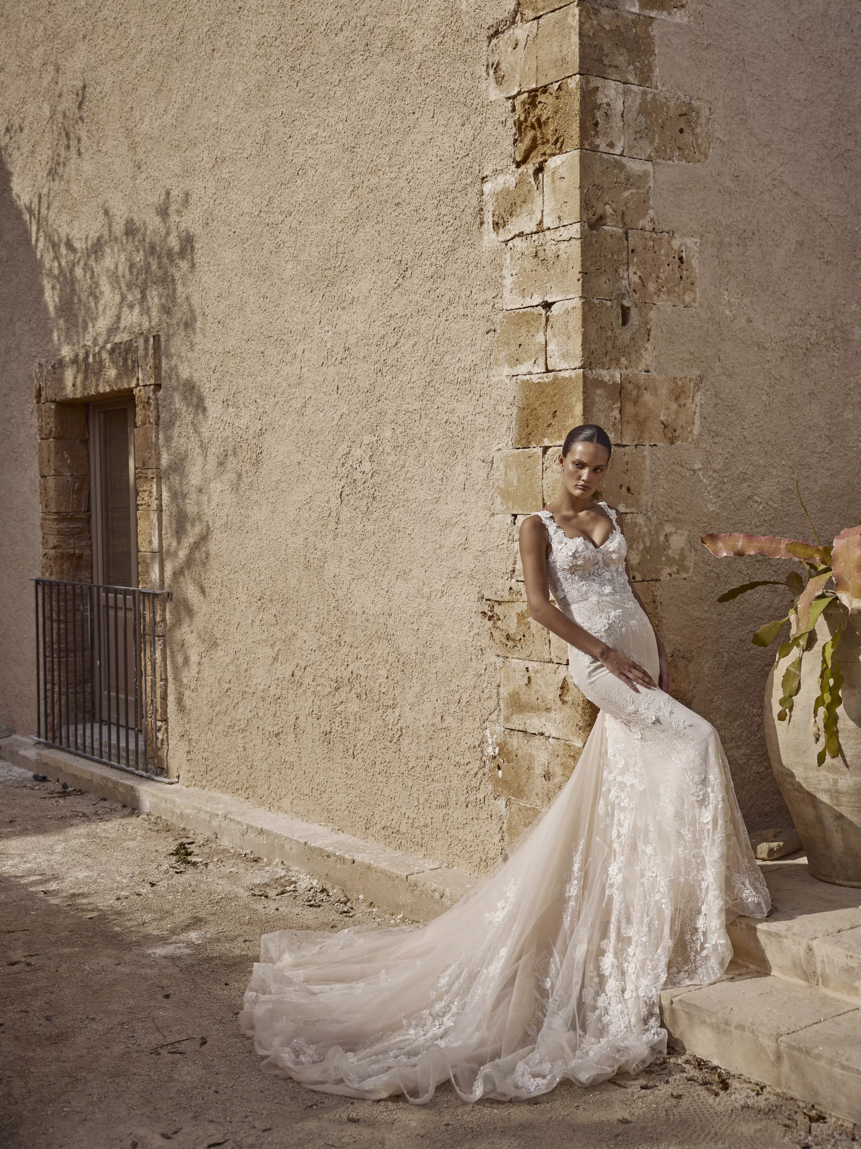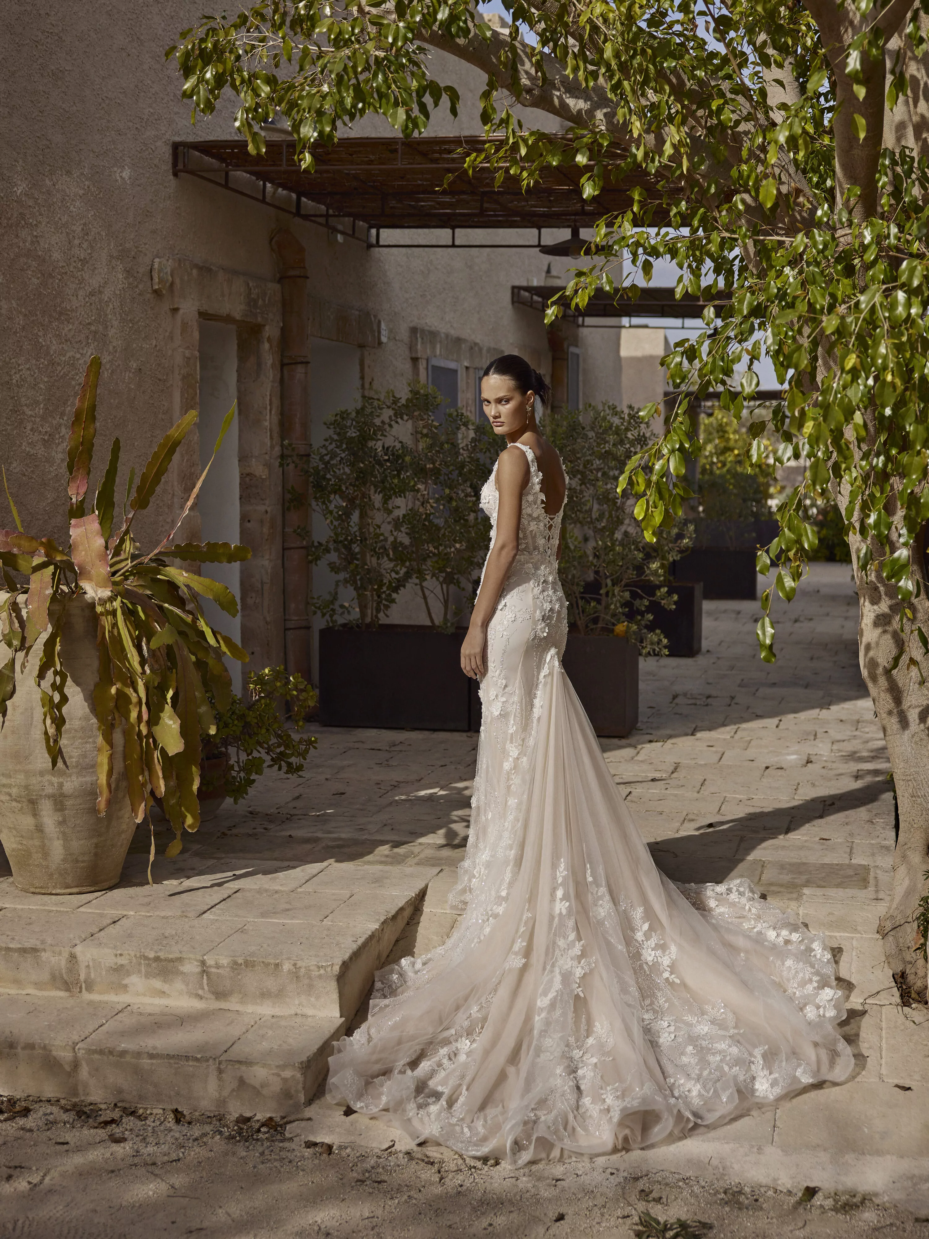 Elegant gown featuring a mermaid silhouette with a sweetheart neckline, beautifully tracing the body's contours. The dress comes in a light nude shade and includes delicate straps. Crafted from delicate lace with intricate floral appliqués, the gown shimmers subtly with light-catching sequins. The detachable train provides a romantic, ethereal look, perfect for making a grand entrance.