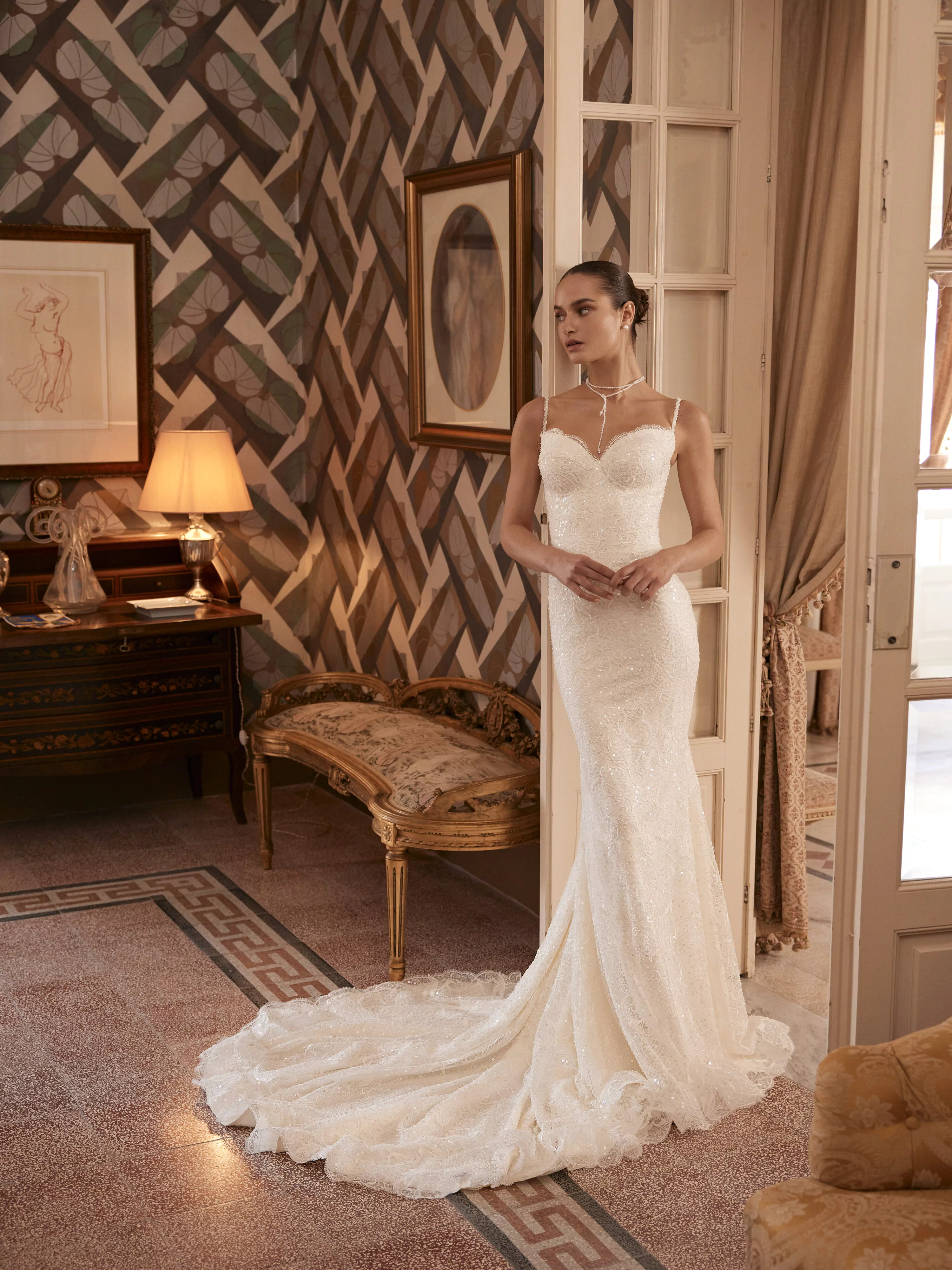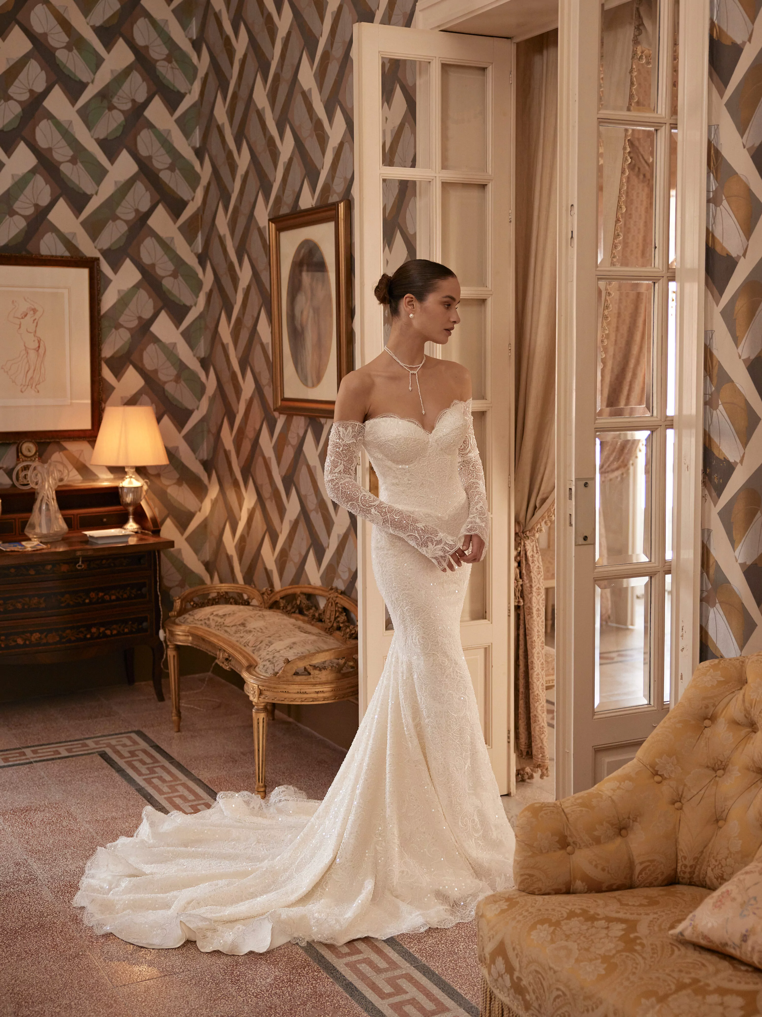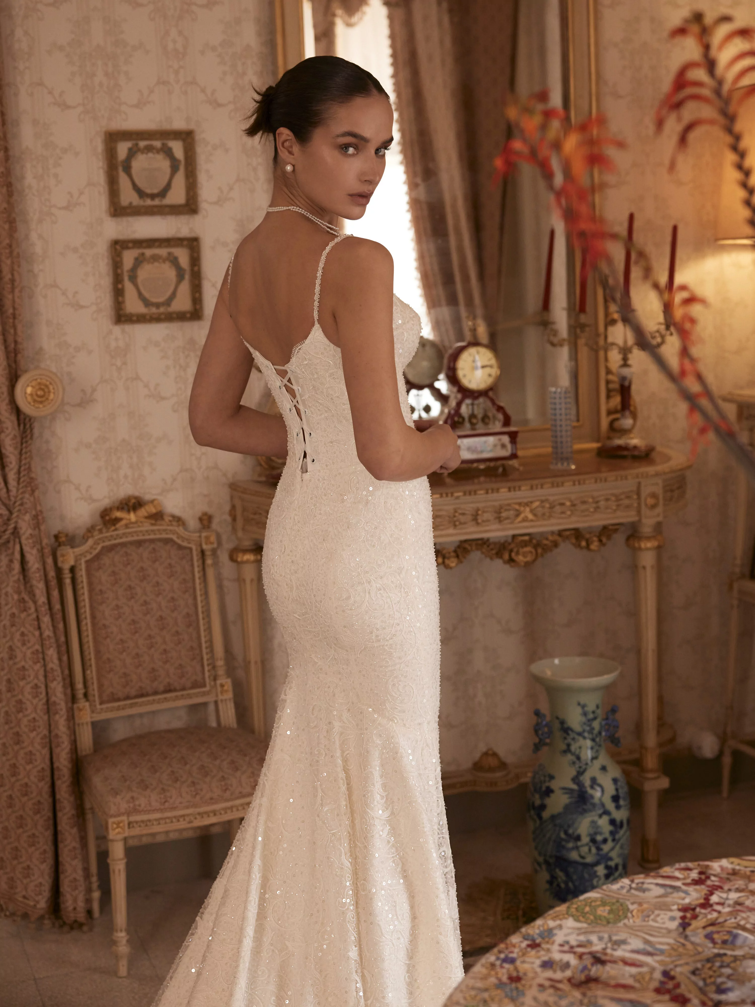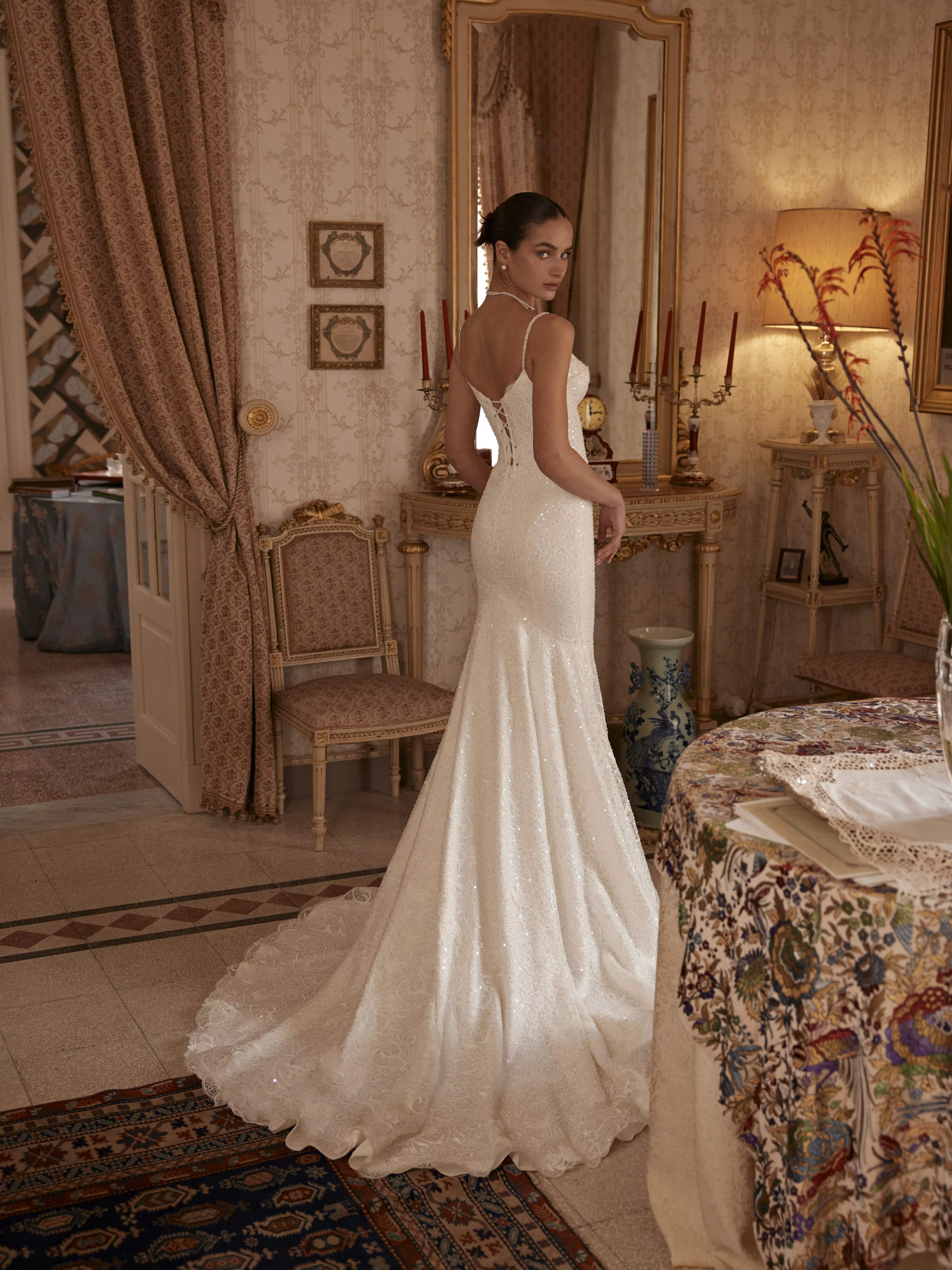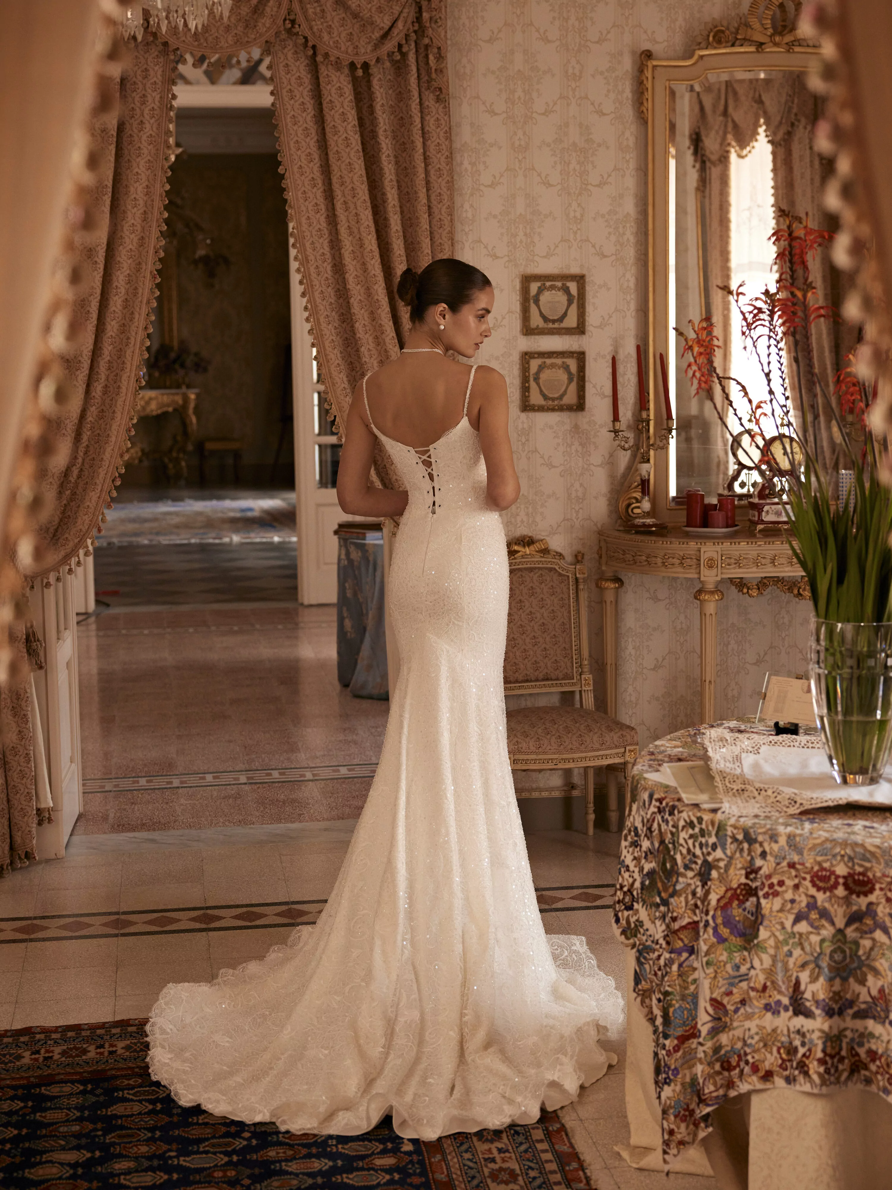 A mermaid silhouette gown with a dropped waistline, crafted from lace adorned with sequins and beads. The dress features removable thin beaded straps and detachable sleeves. The gown is complemented by a lace-up back and a long, elegant train.