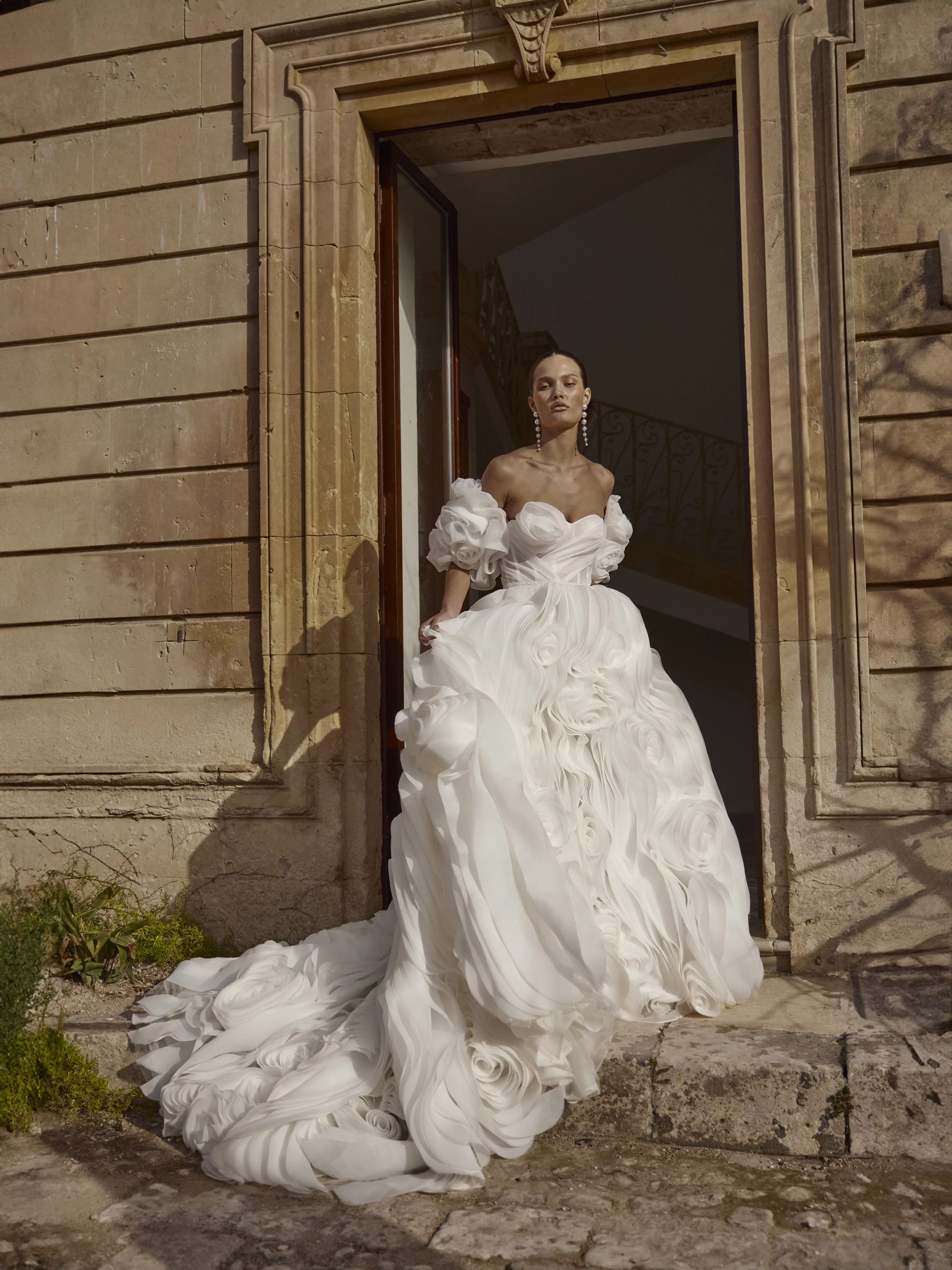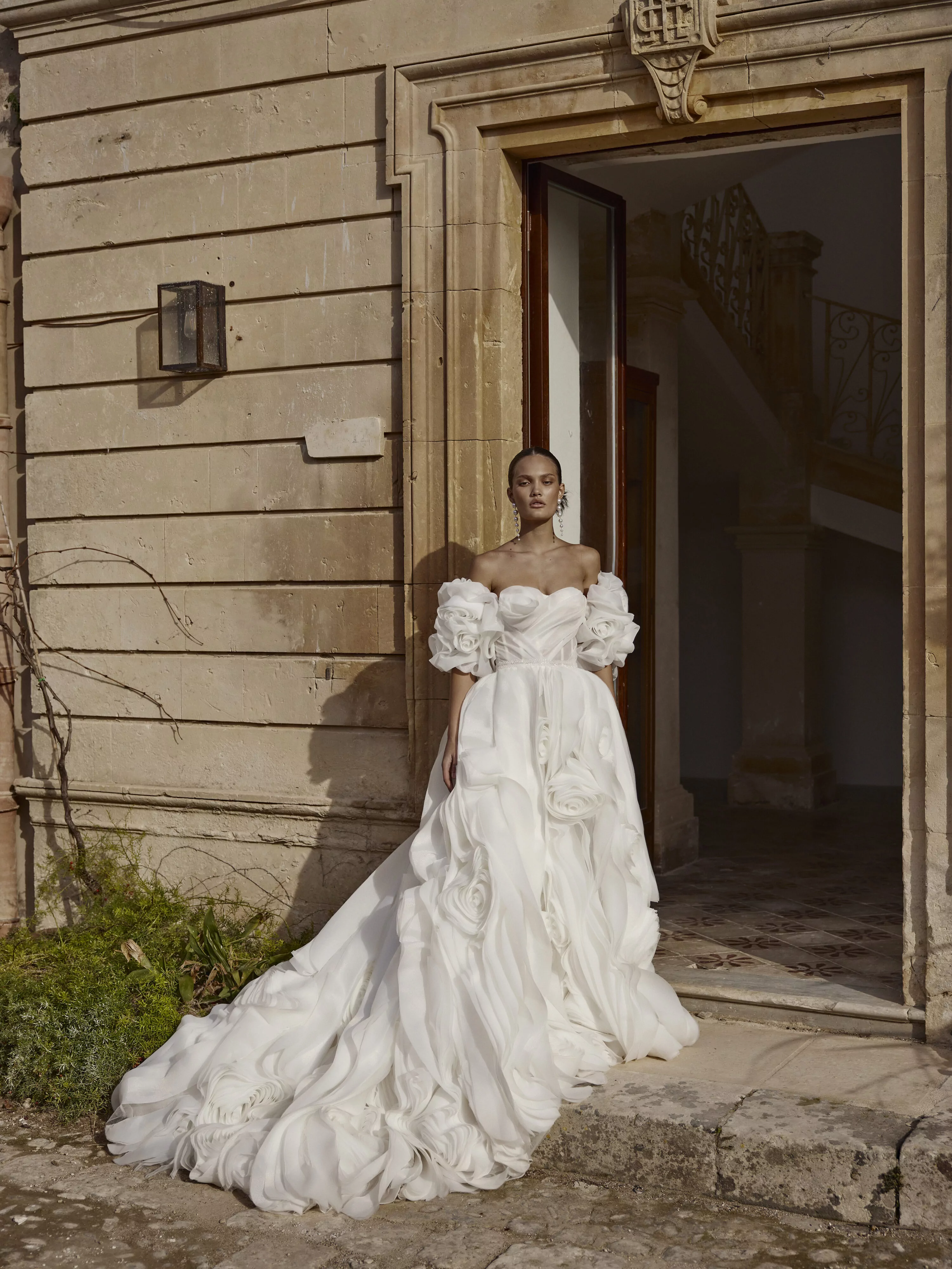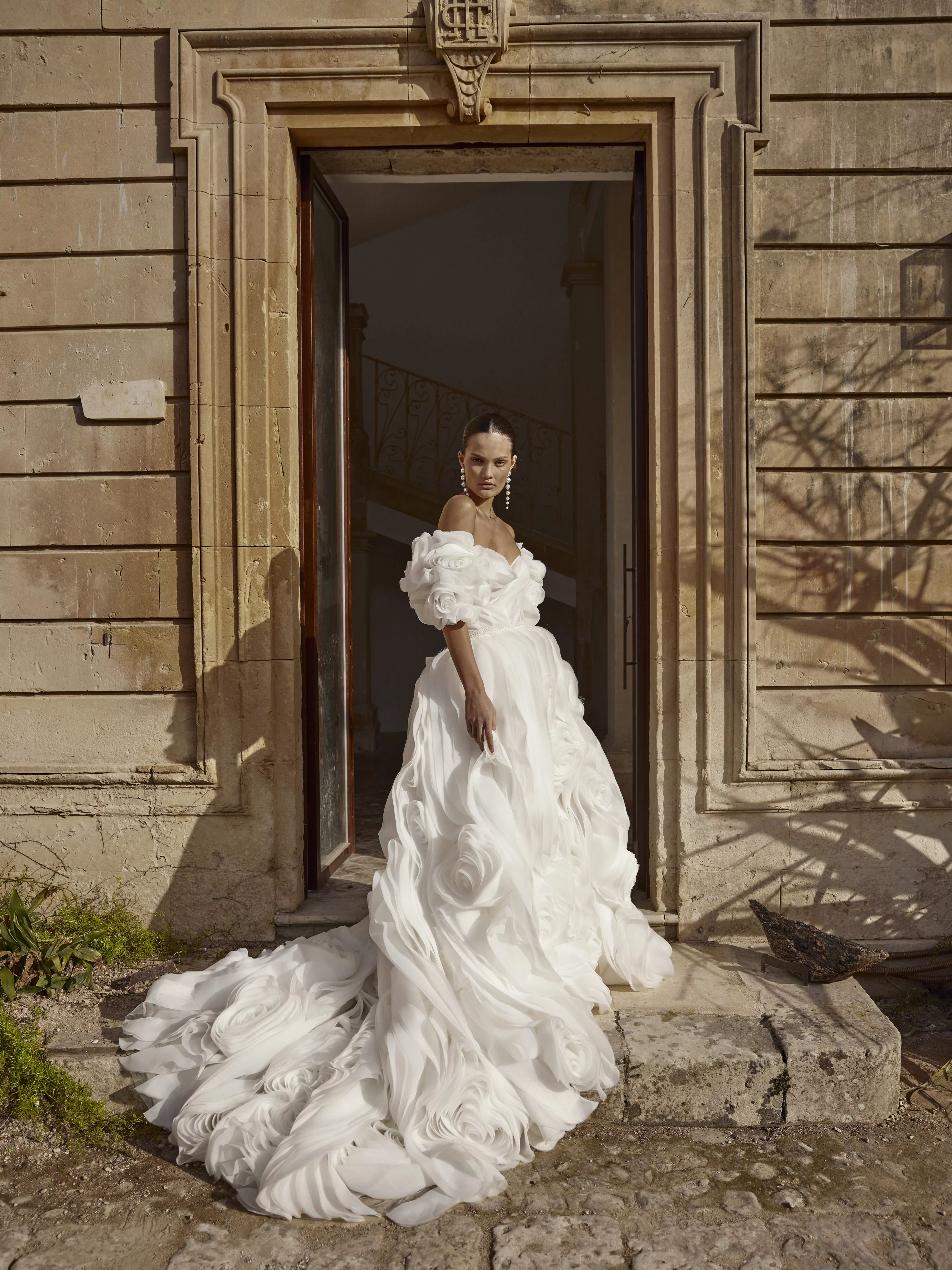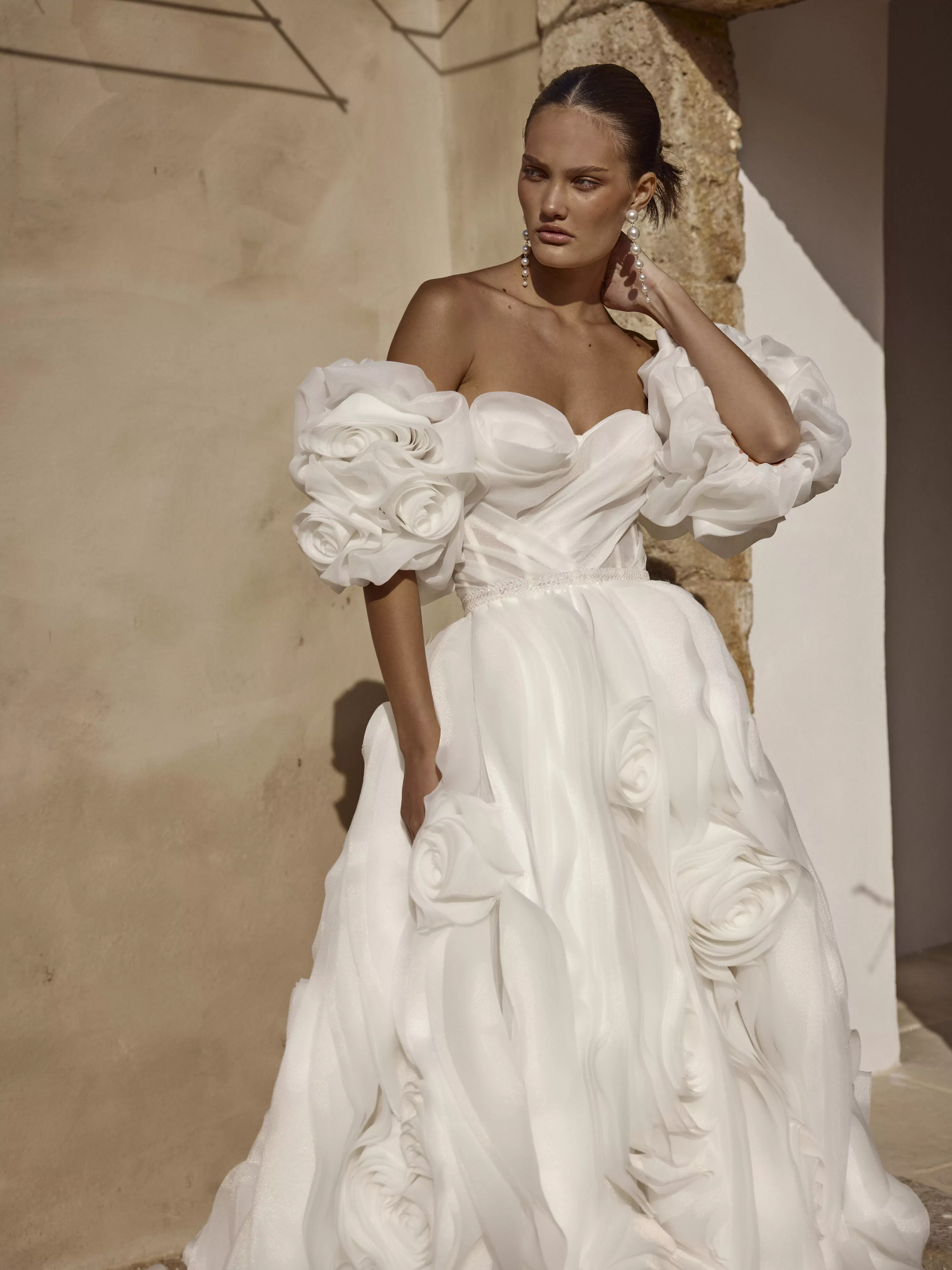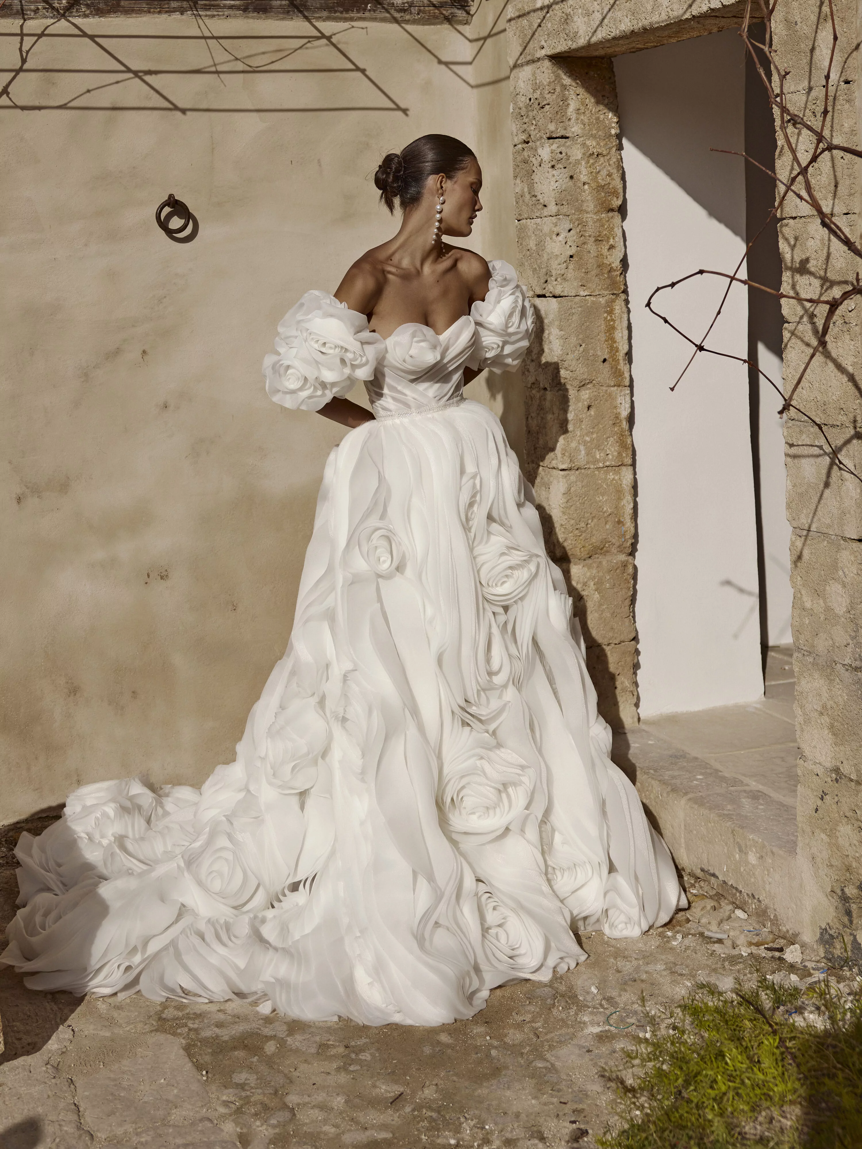 A magnificent, sculptural off-the-shoulder organza gown with puffed sleeves and draped corcet. The skirt is adorned with numerous extravagant voluminous ruffles, each meticulously designed to resemble a luxurious bouquet of oversized roses. The skirt falls into a long train, giving the impression of a river of white petals trailing behind.