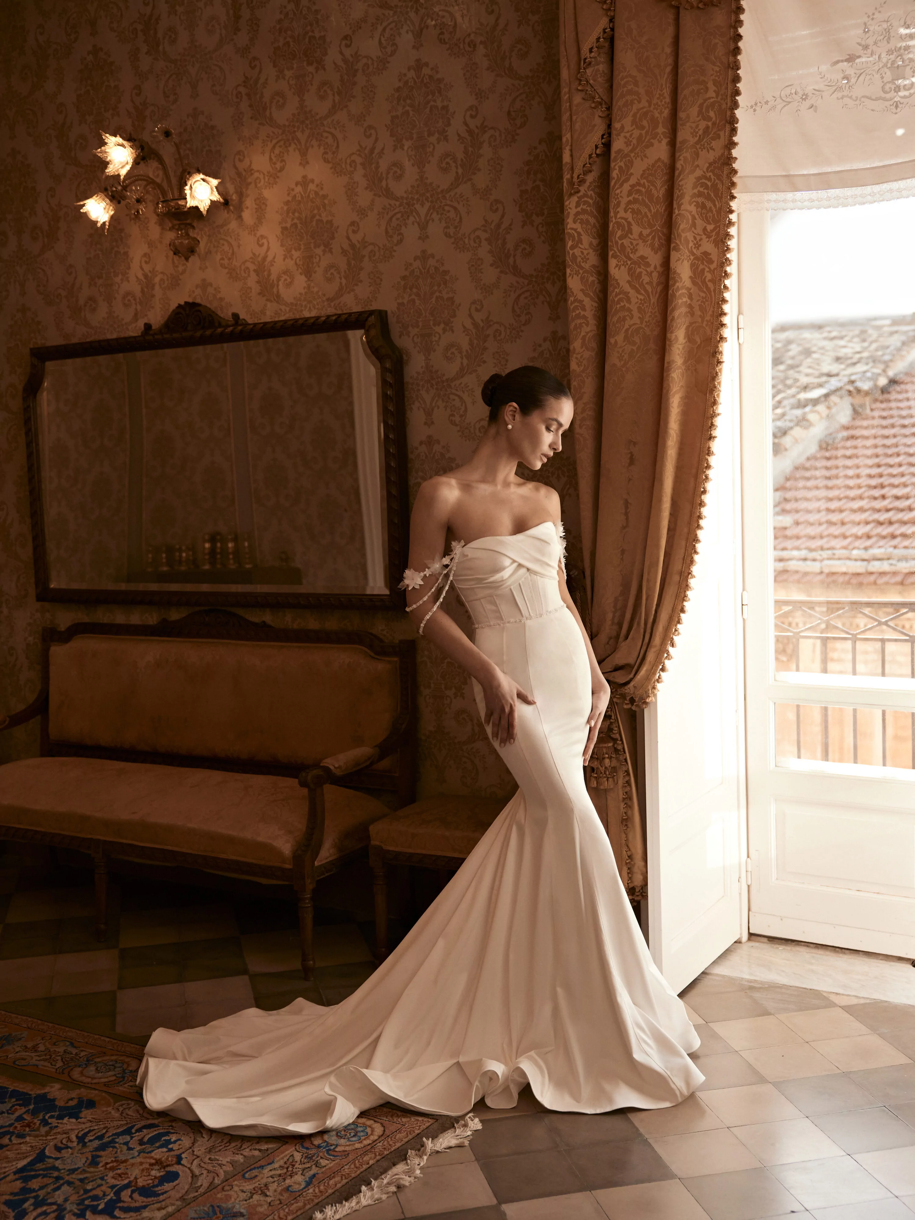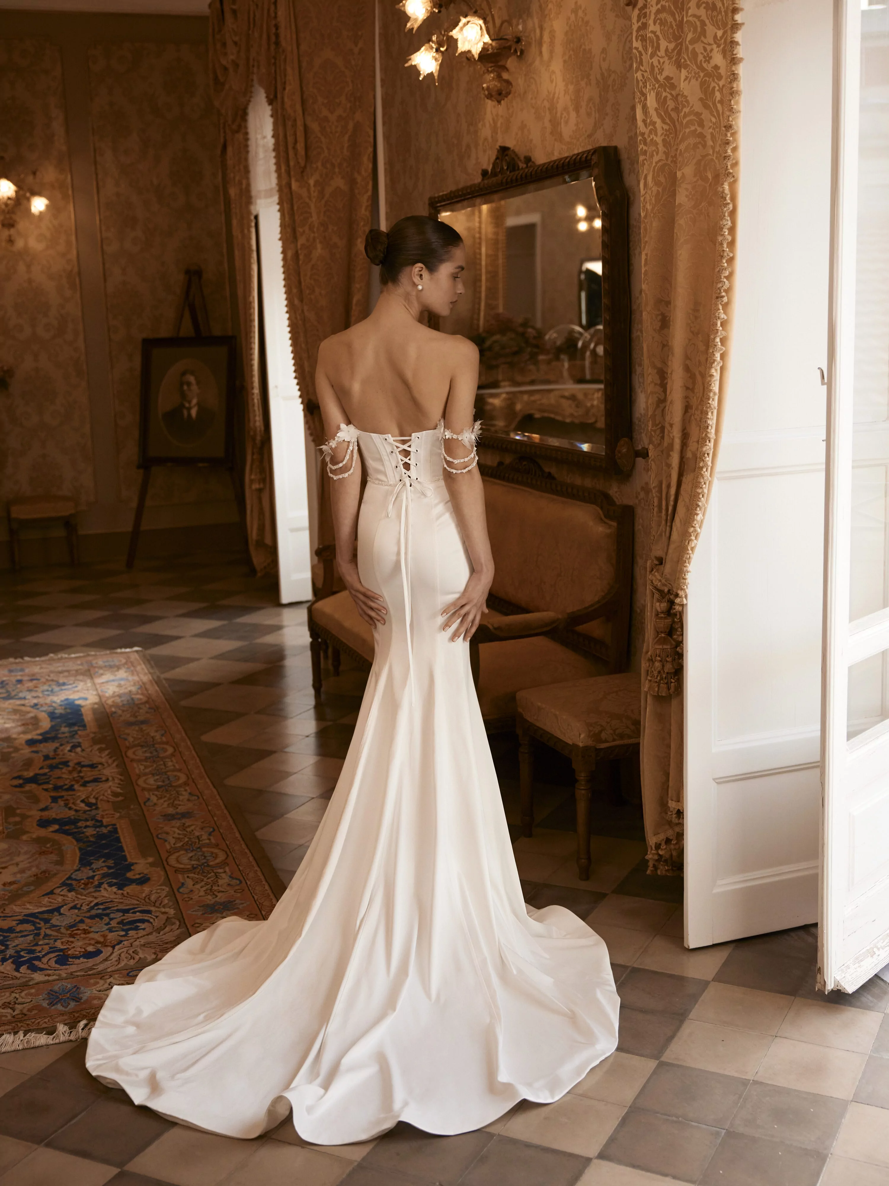 An elegant, form-fitting gown made of satin, featuring a draped corset and a straight neckline. It has removable triple straps adorned with 3D flowers and beads, and is complemented by an elegant train and a lace-up back.