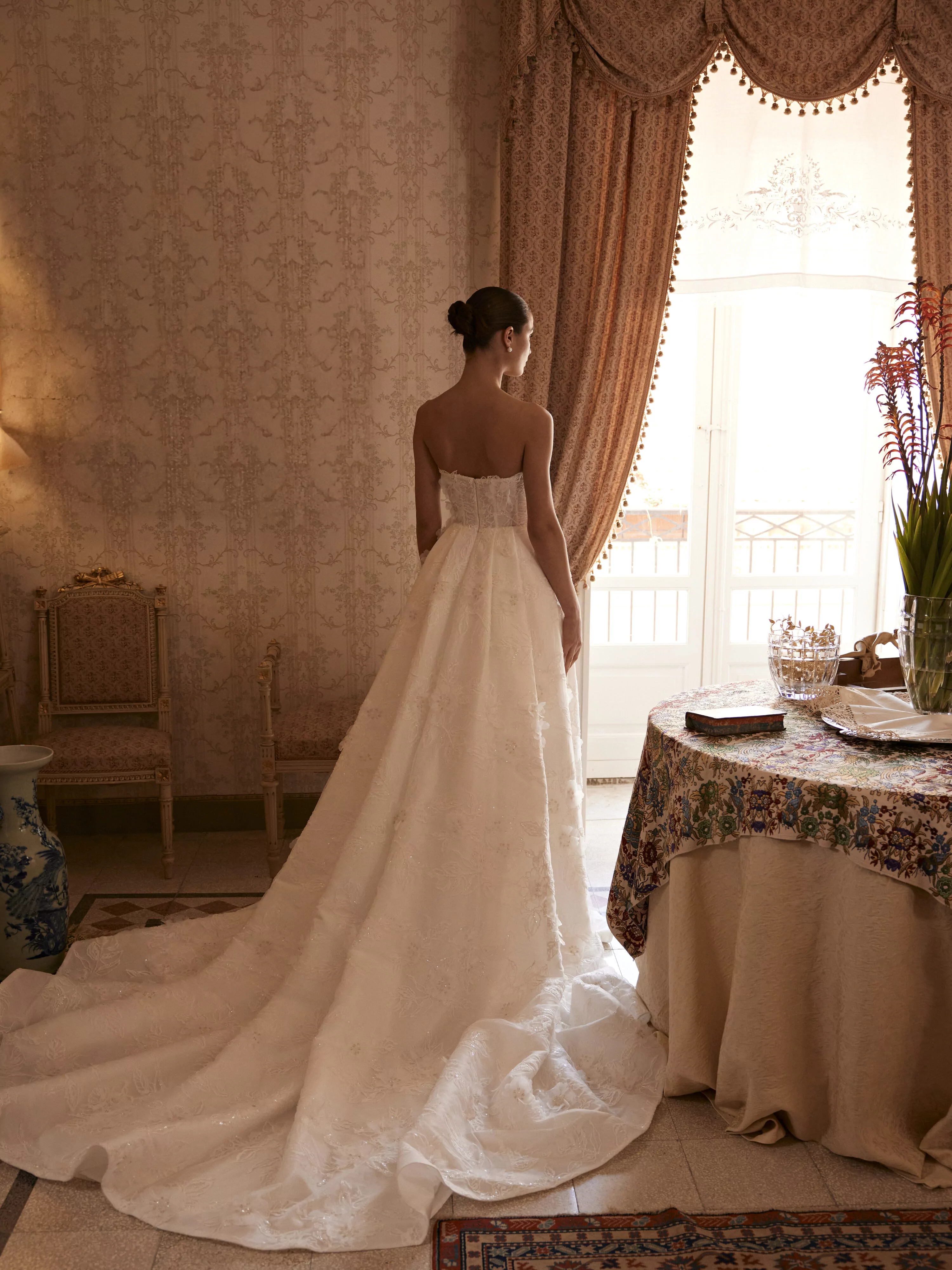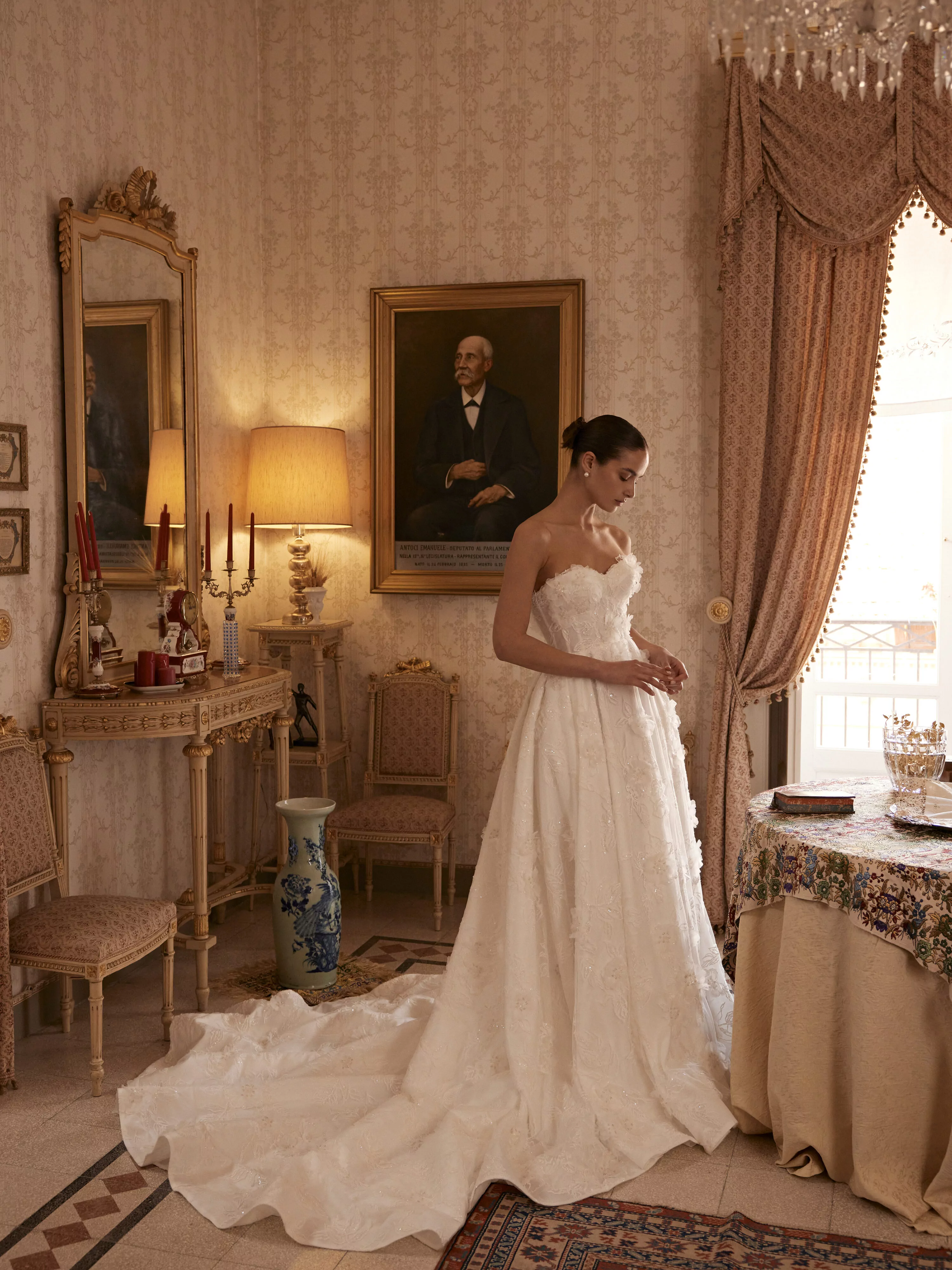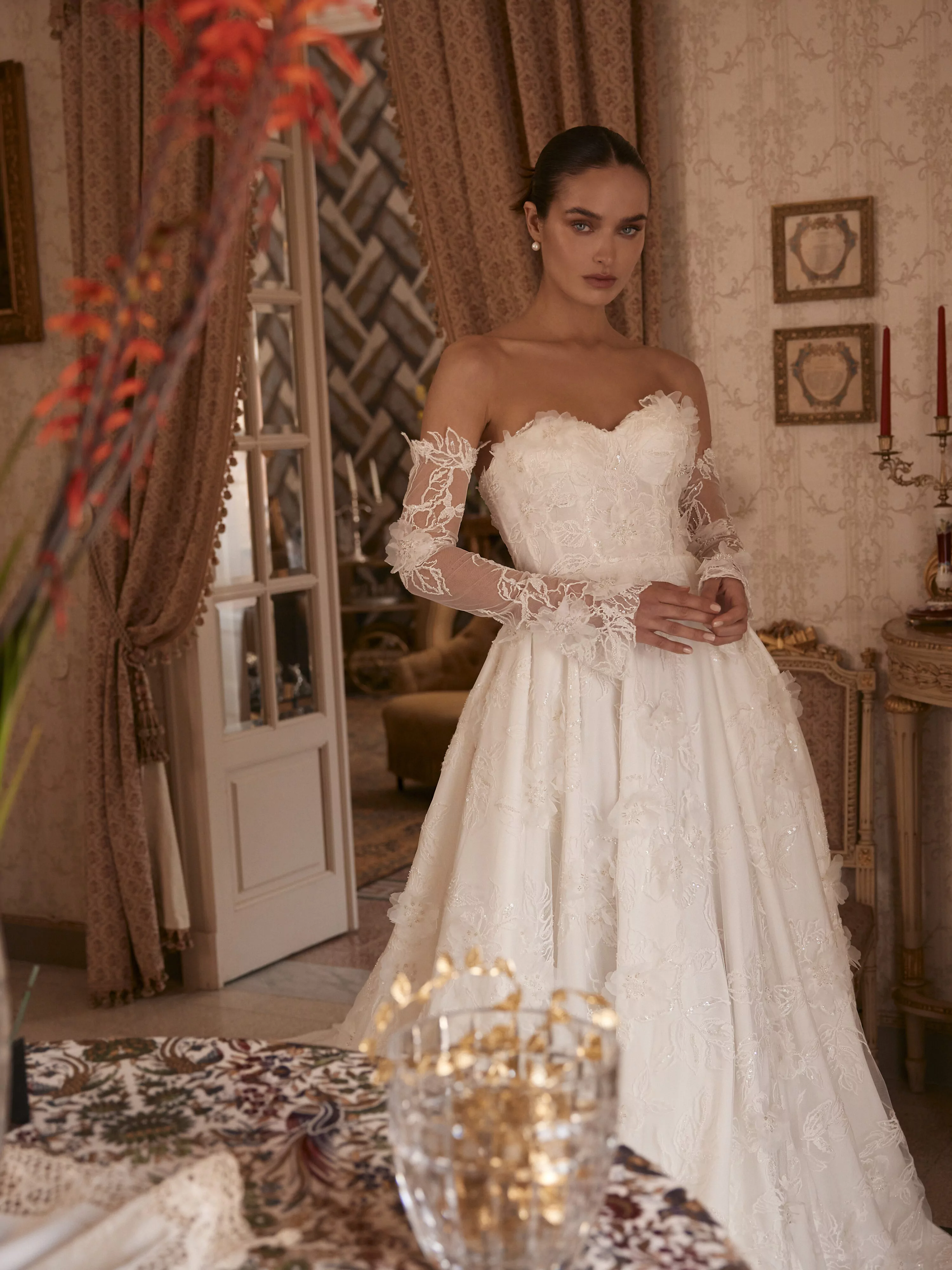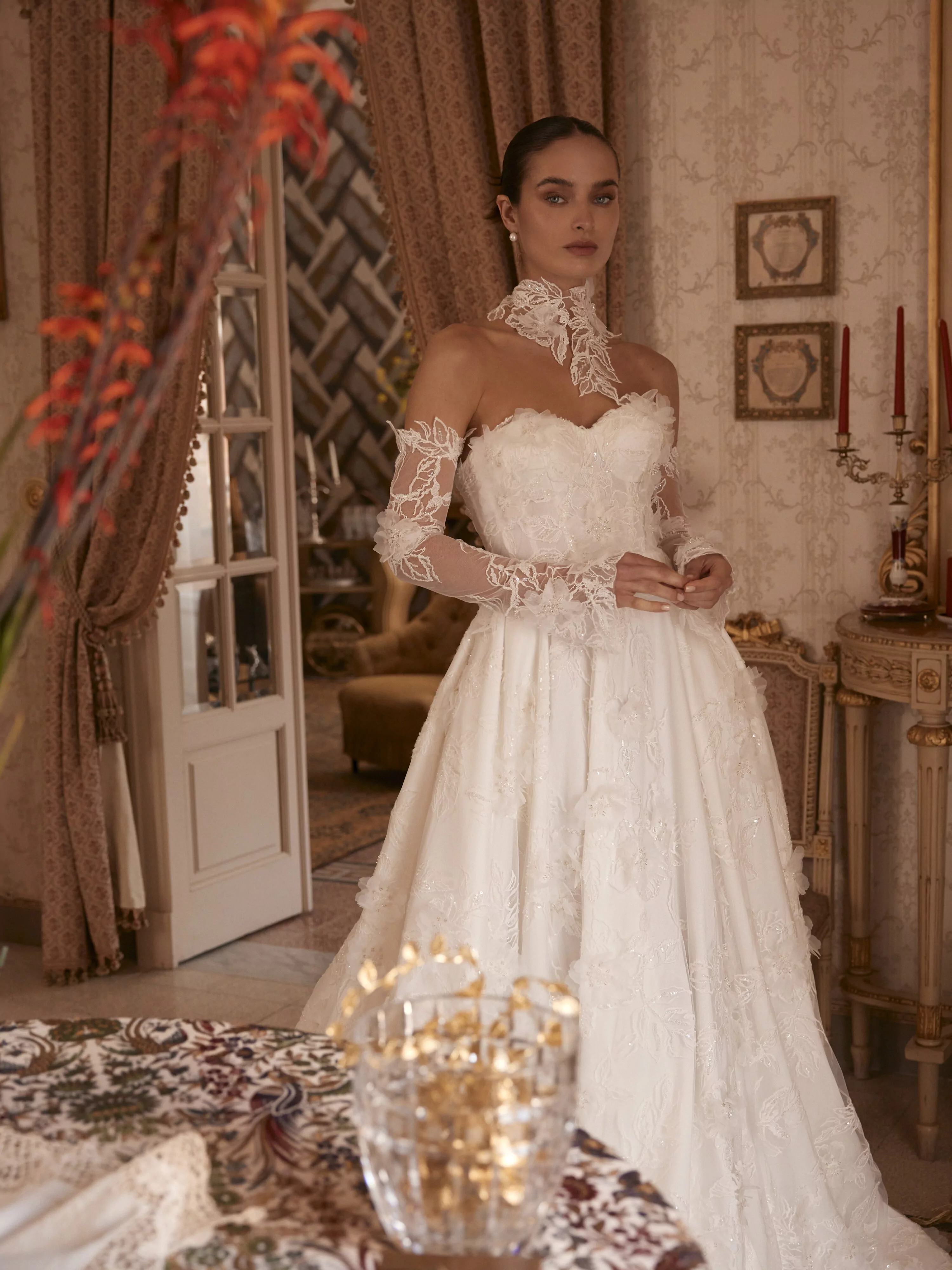 An A-line gown with a sweetheart neckline, crafted from sugar taffeta and lace with 3D appliqués and a zipper back. The dress features removable long sleeves and a detachable lace neck decoration, and is complemented by a royal train.