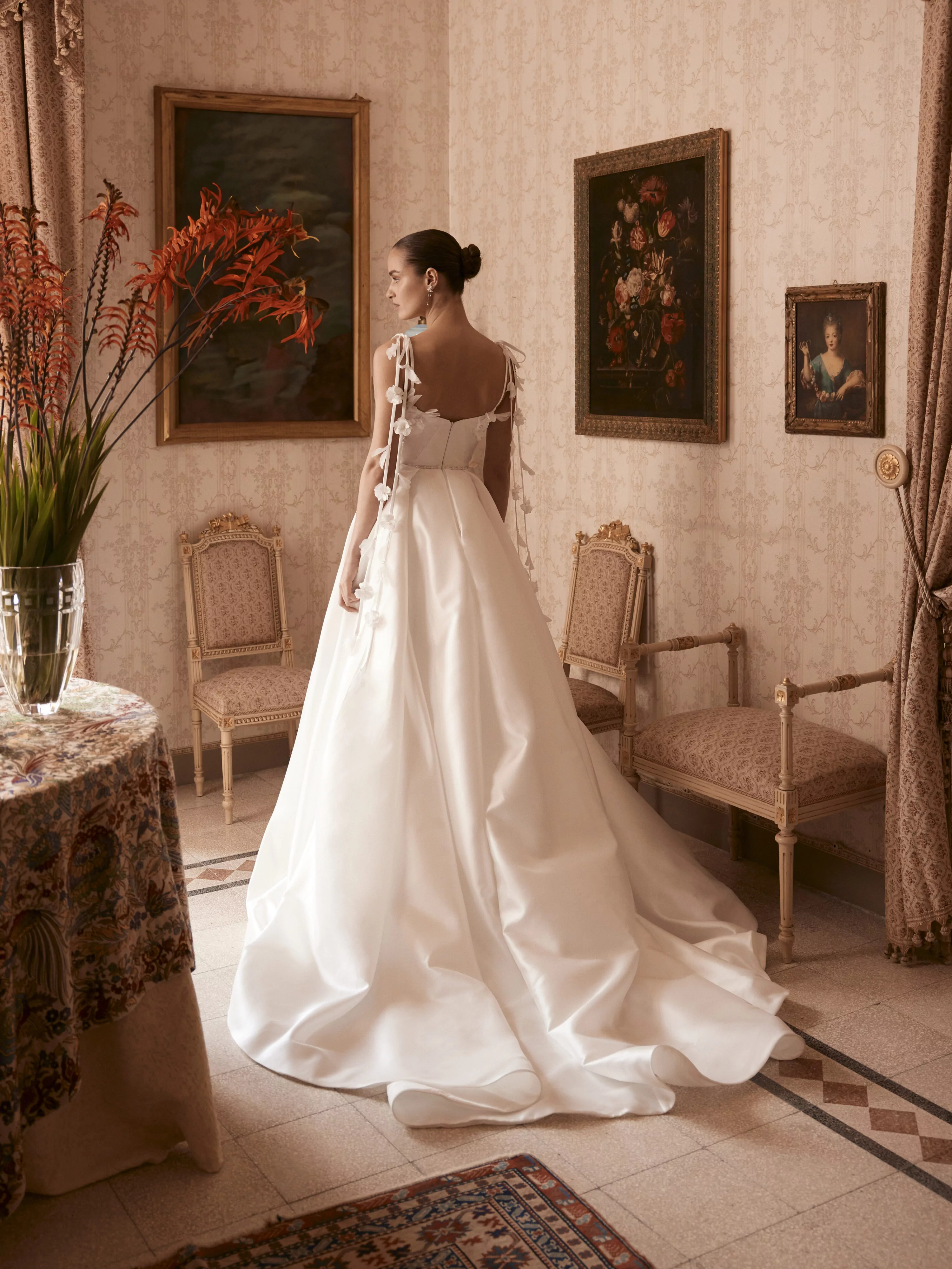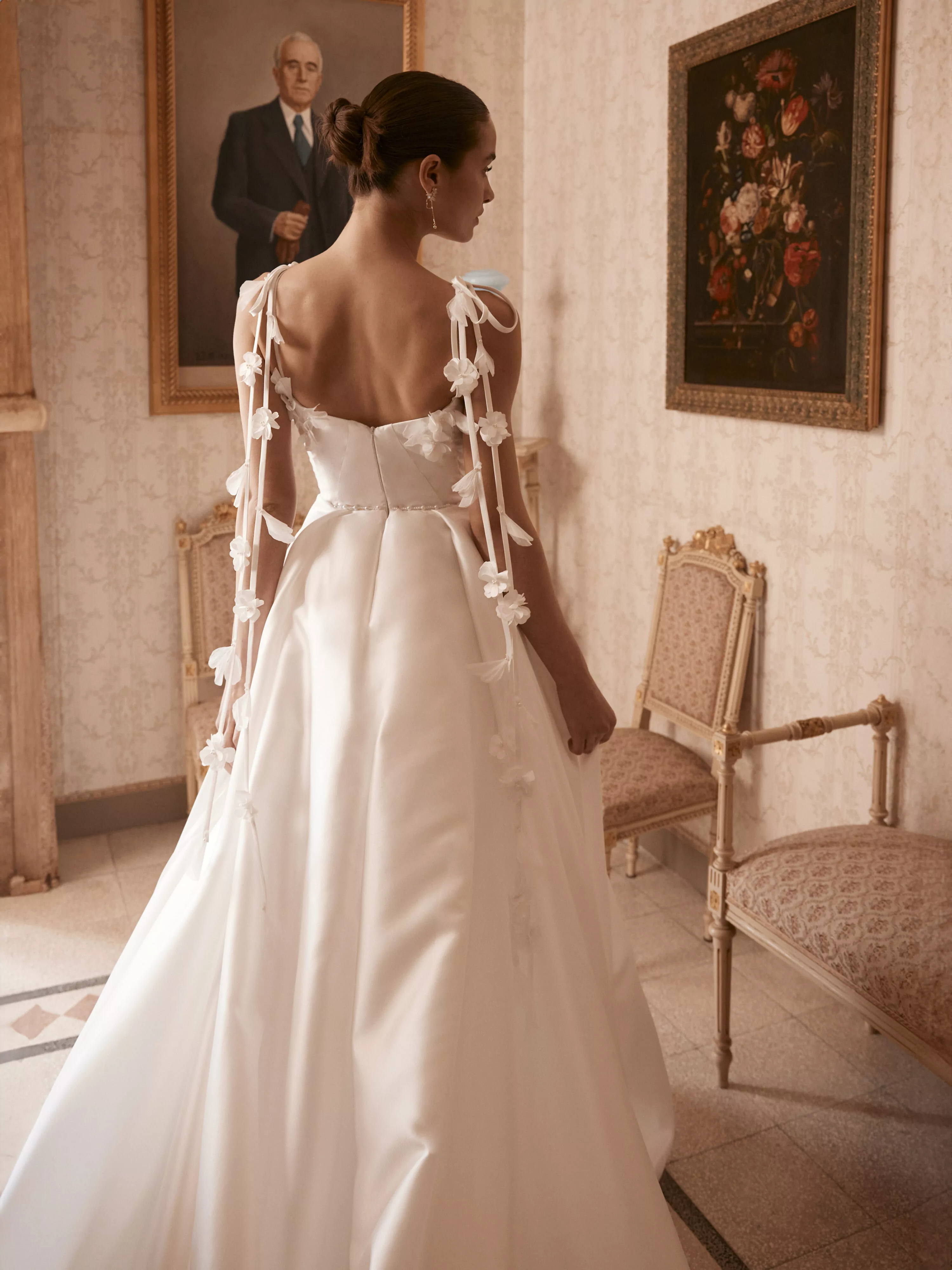 A fairytale A-line gown crafted from luxurious Mikado fabric, featuring a straight neckline. The dress is adorned with delicate straps made of Mikado and organza flowers, adding a touch of elegance. A high slit on the leg completes this enchanting look.