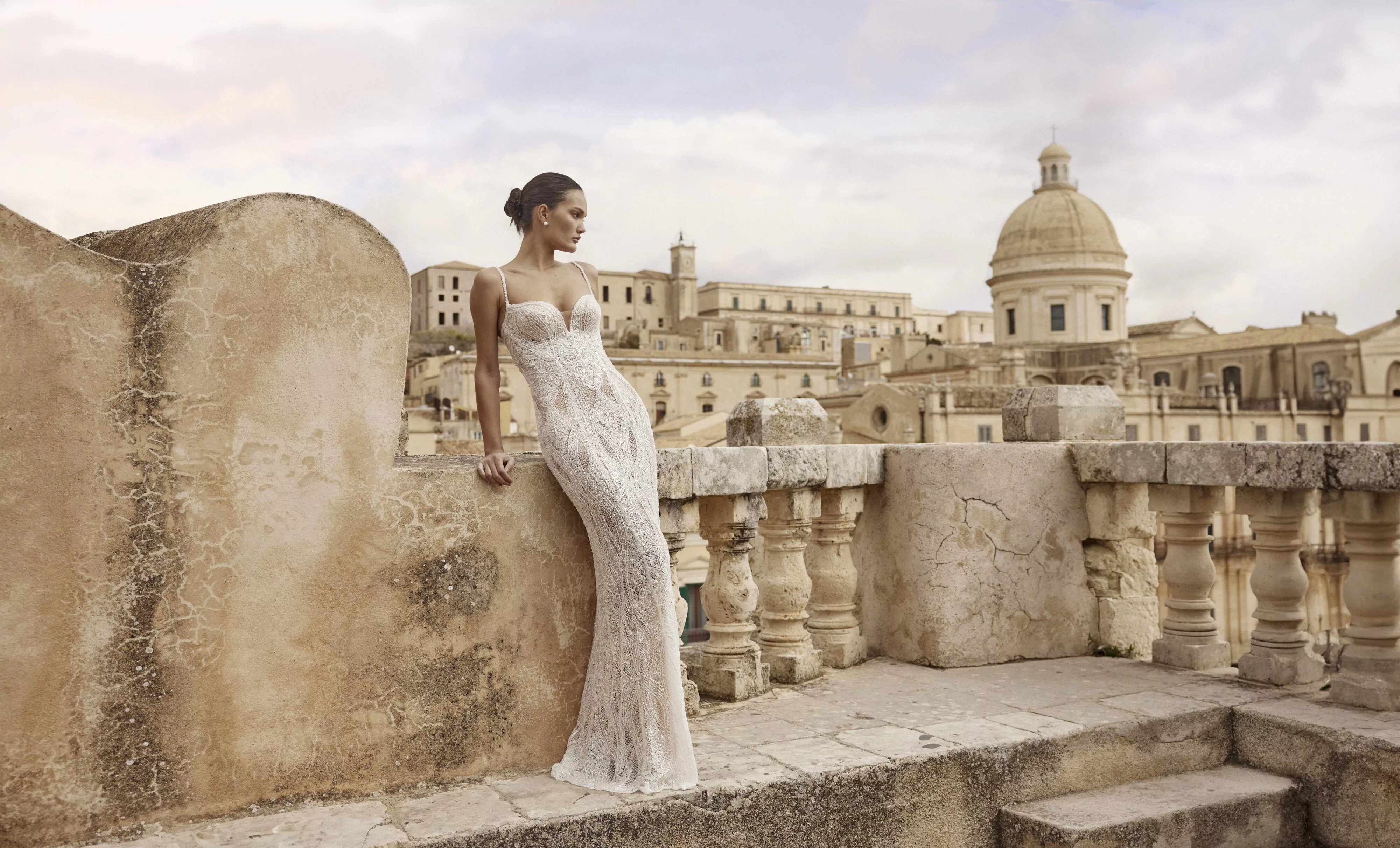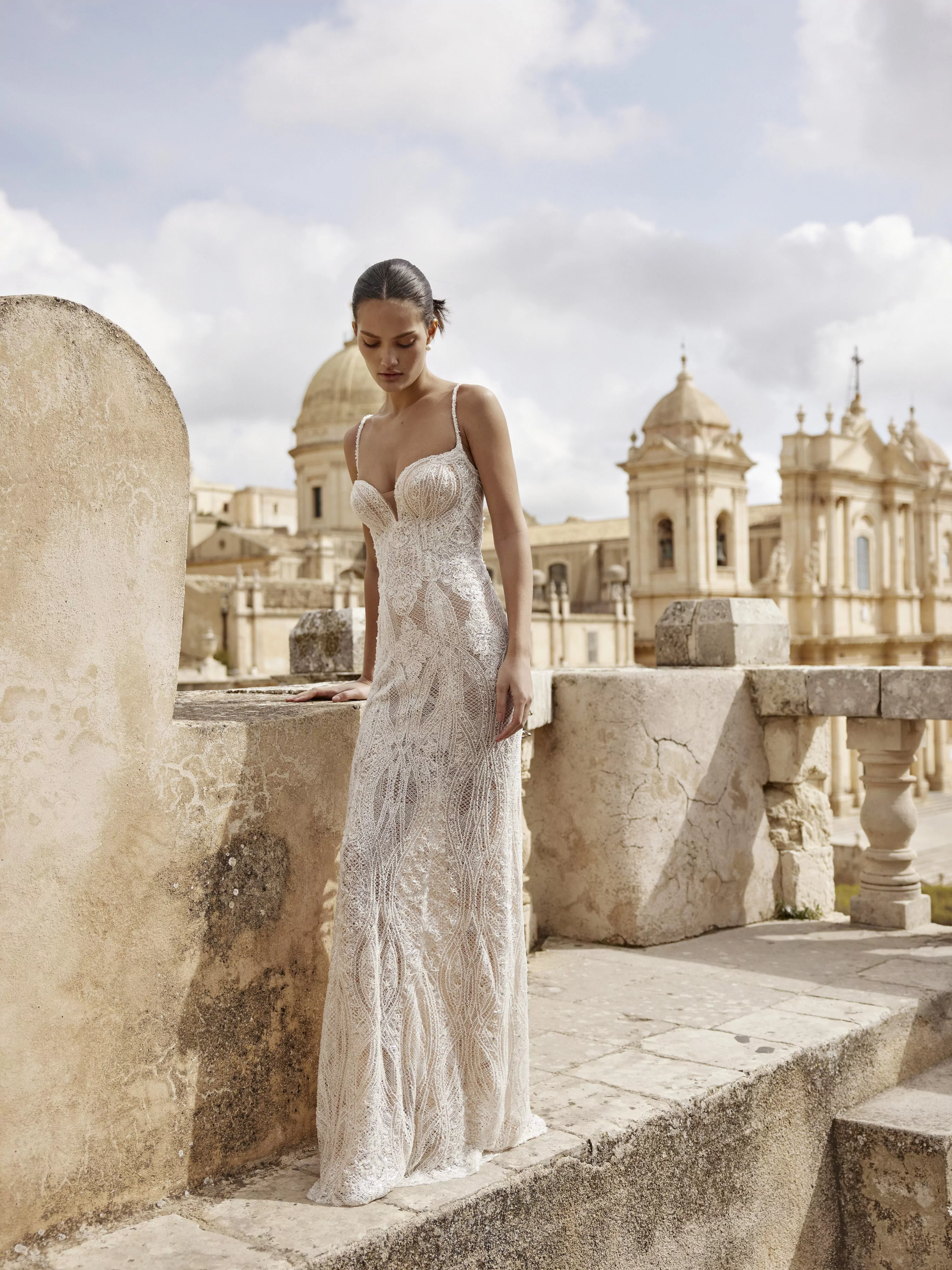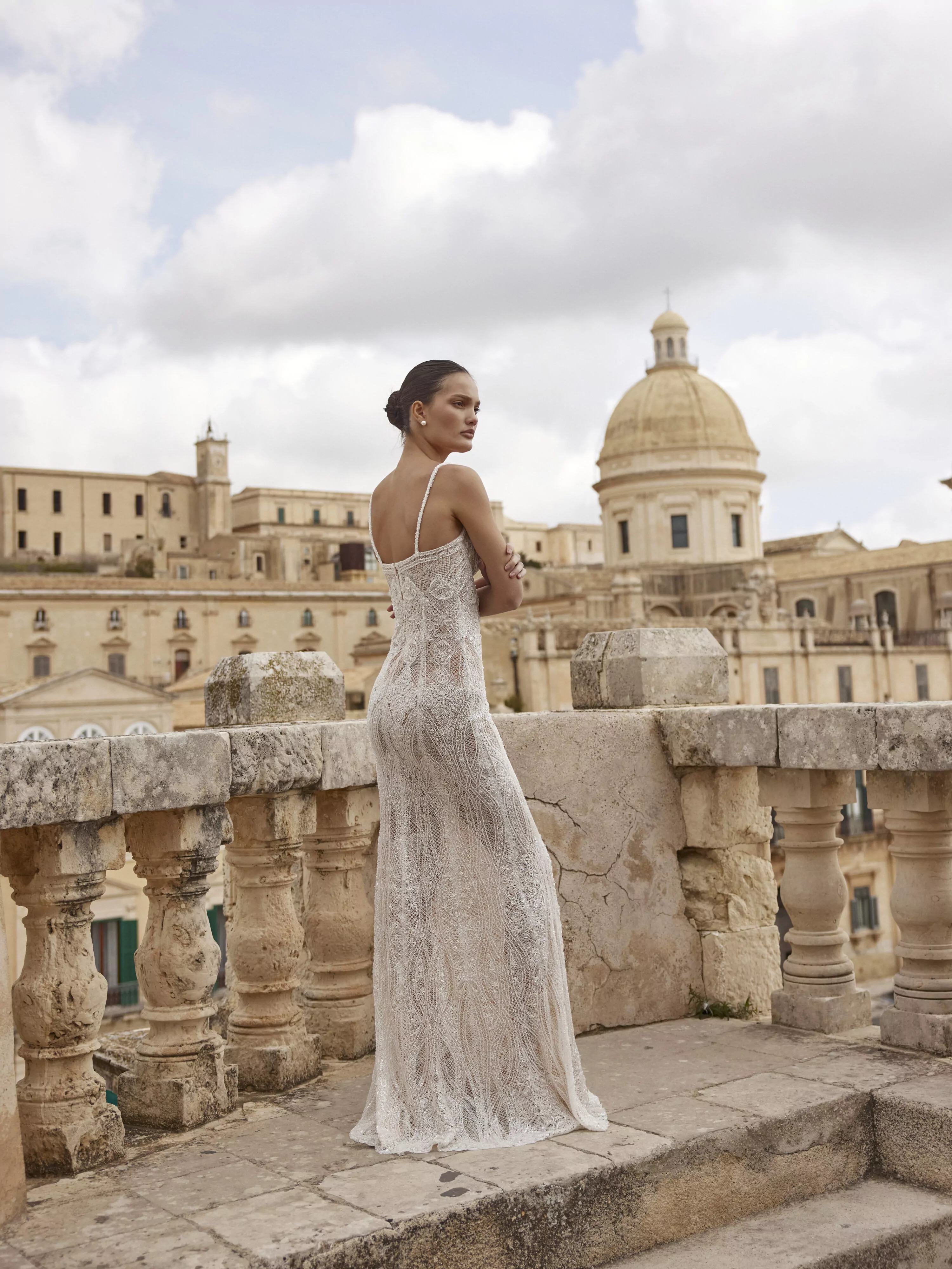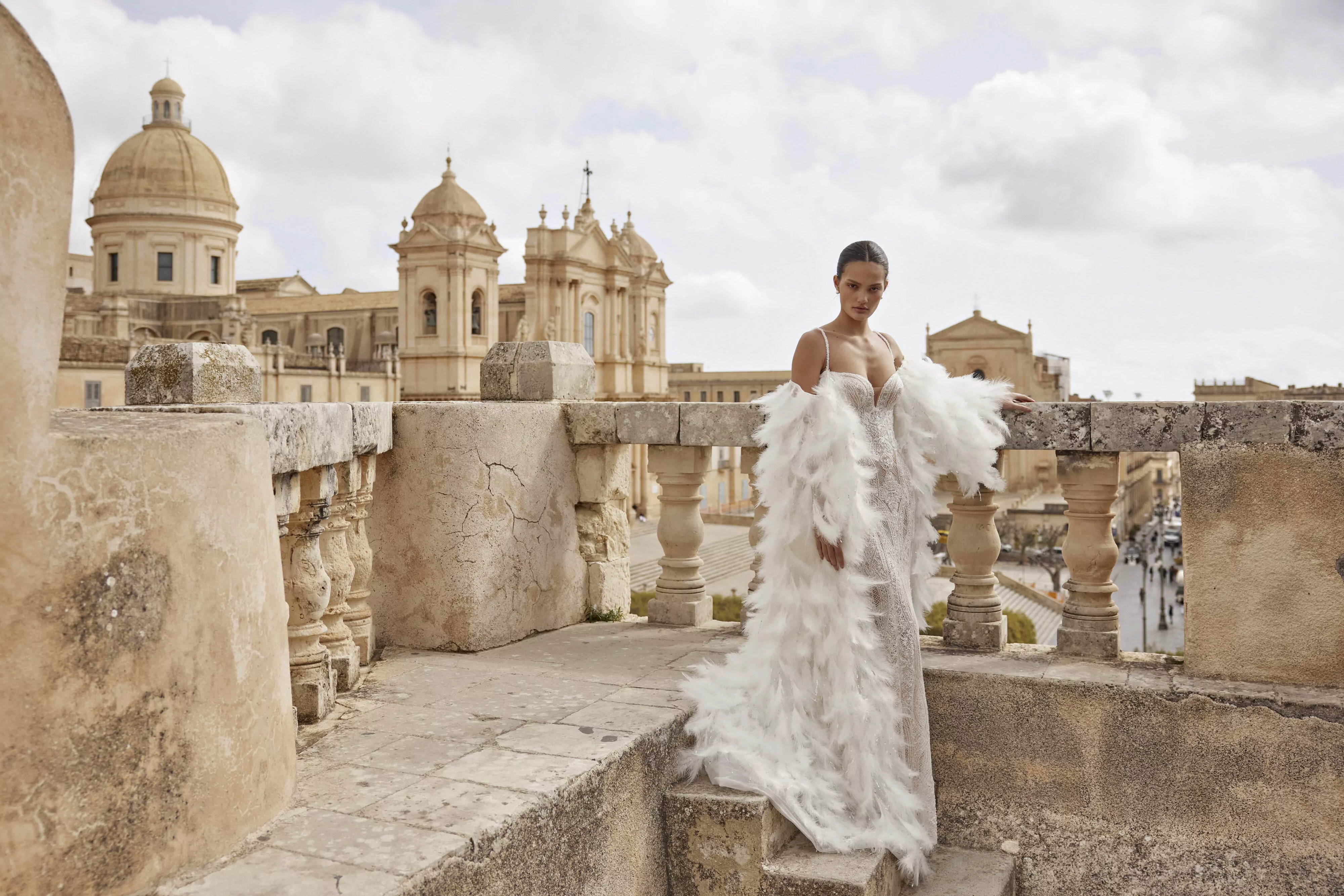 Modica is a breathtaking work of art. The figure-hugging dress features intricate beading and embroidery that flows along the length of the dress, creating luxurious texture and a shimmering effect. The sweetheart neckline is gracefully supported by thin straps. This majestic cape, decorated with luxurious feathers, flows over the shoulders and continues at the back with many feathers and sparkling beads, creating the illusion of a light trail.