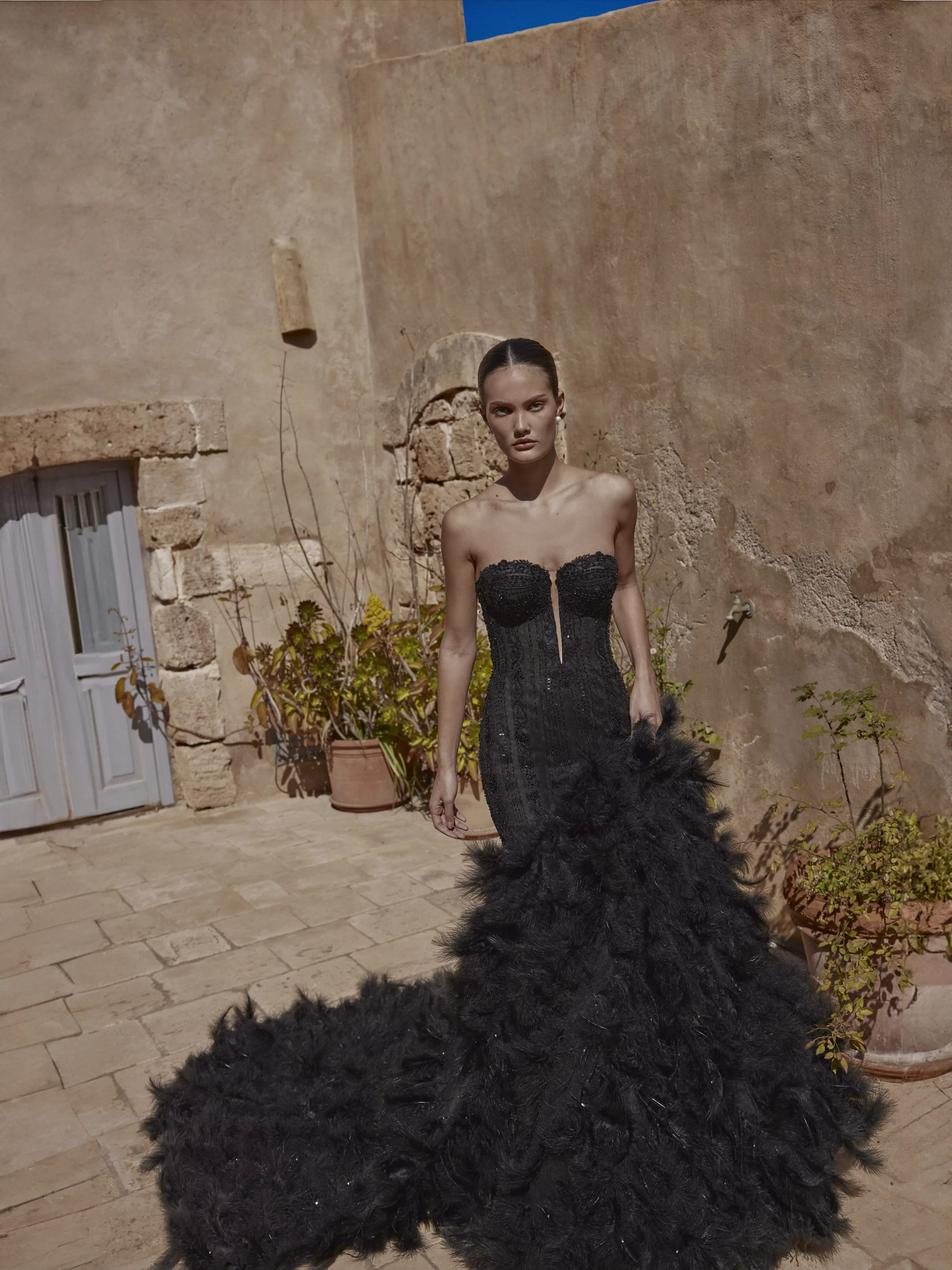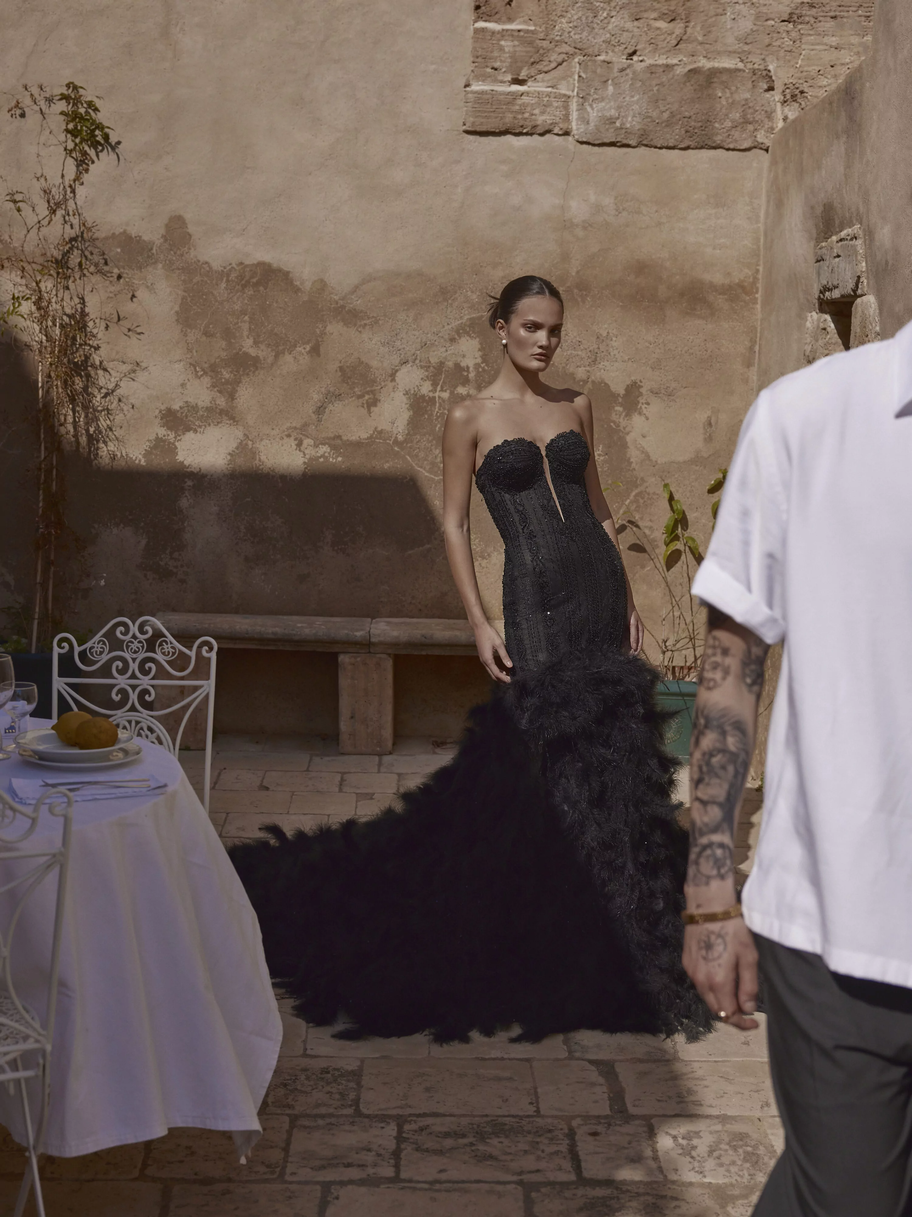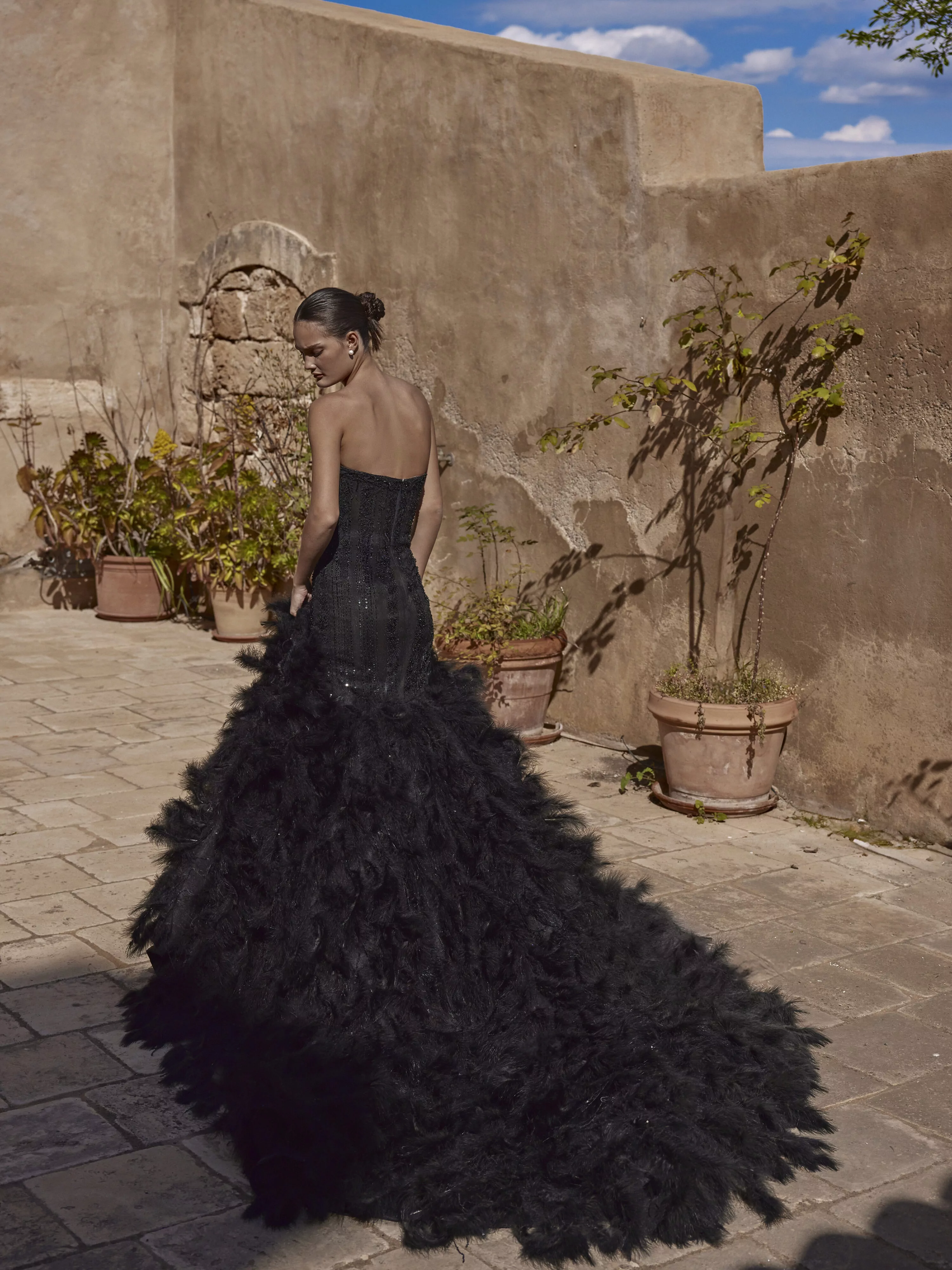 A stunningly distinctive black mermaid gown, adorned with a skirt of natural feathers. The bodice, designed in a sweetheart shape with a deep V-neckline, is meticulously embellished by hand with intricate black beads. The feathered skirt gracefully flows into an extraordinary train, evoking a truly enchanting and magical allure.