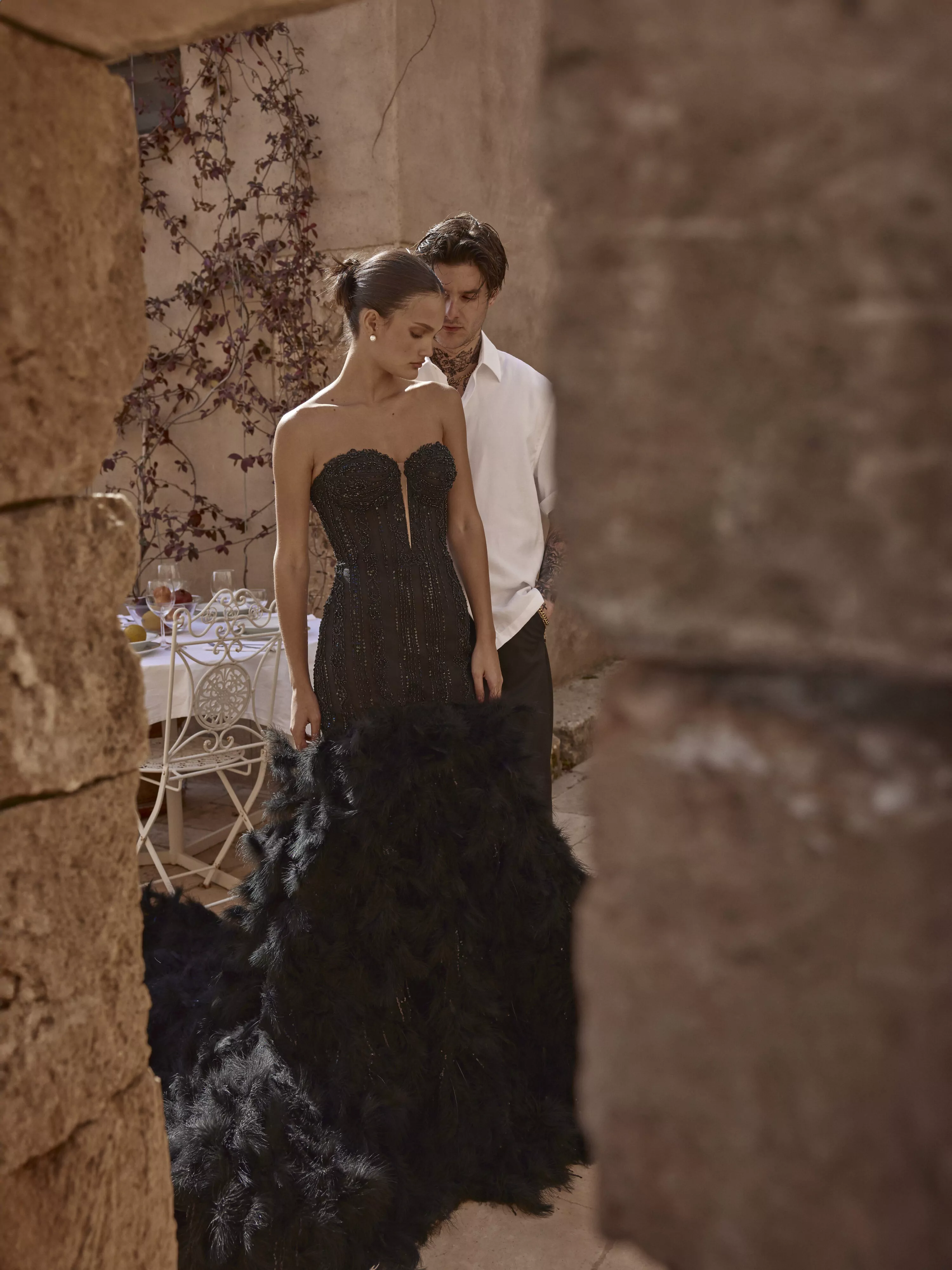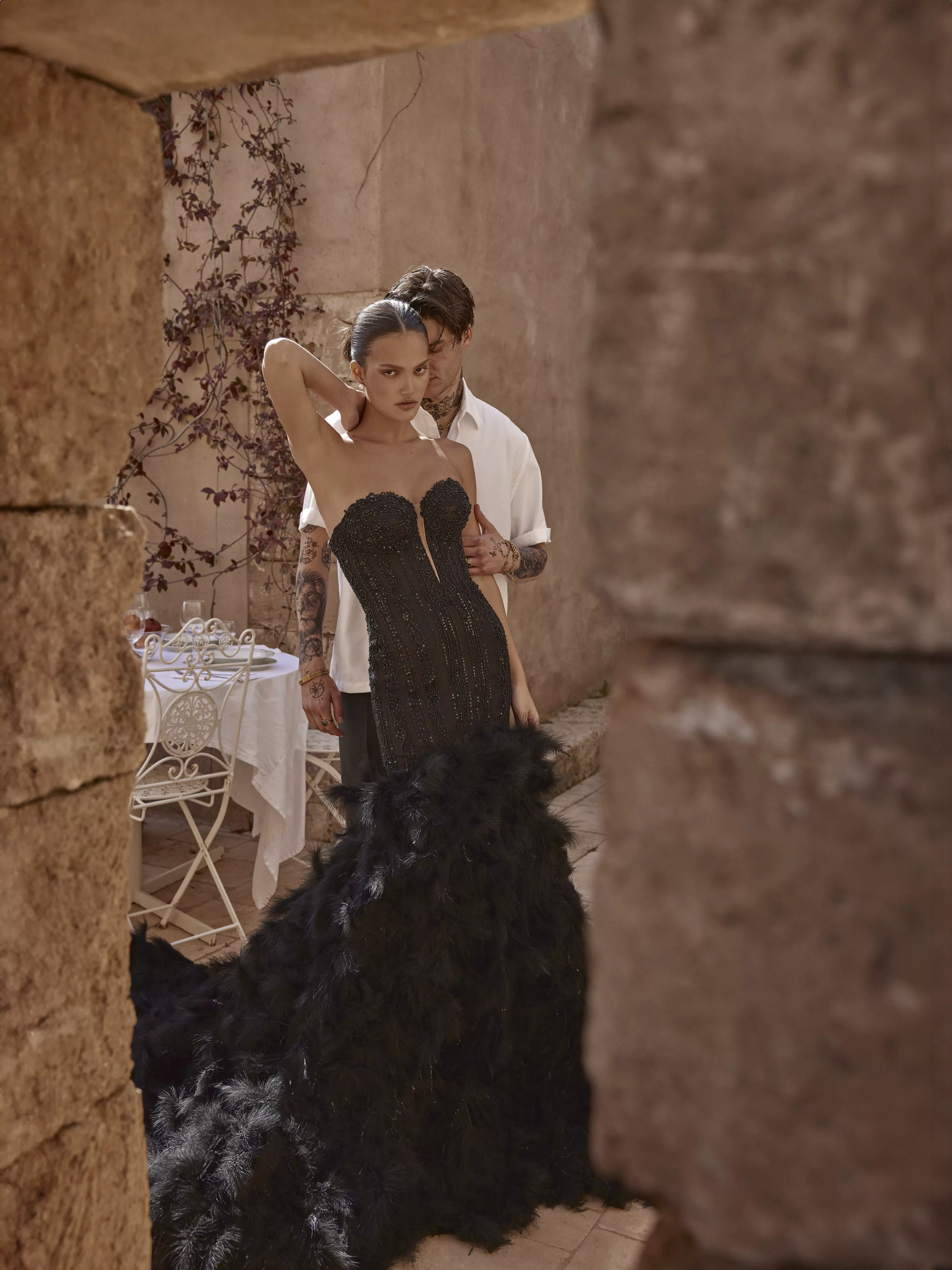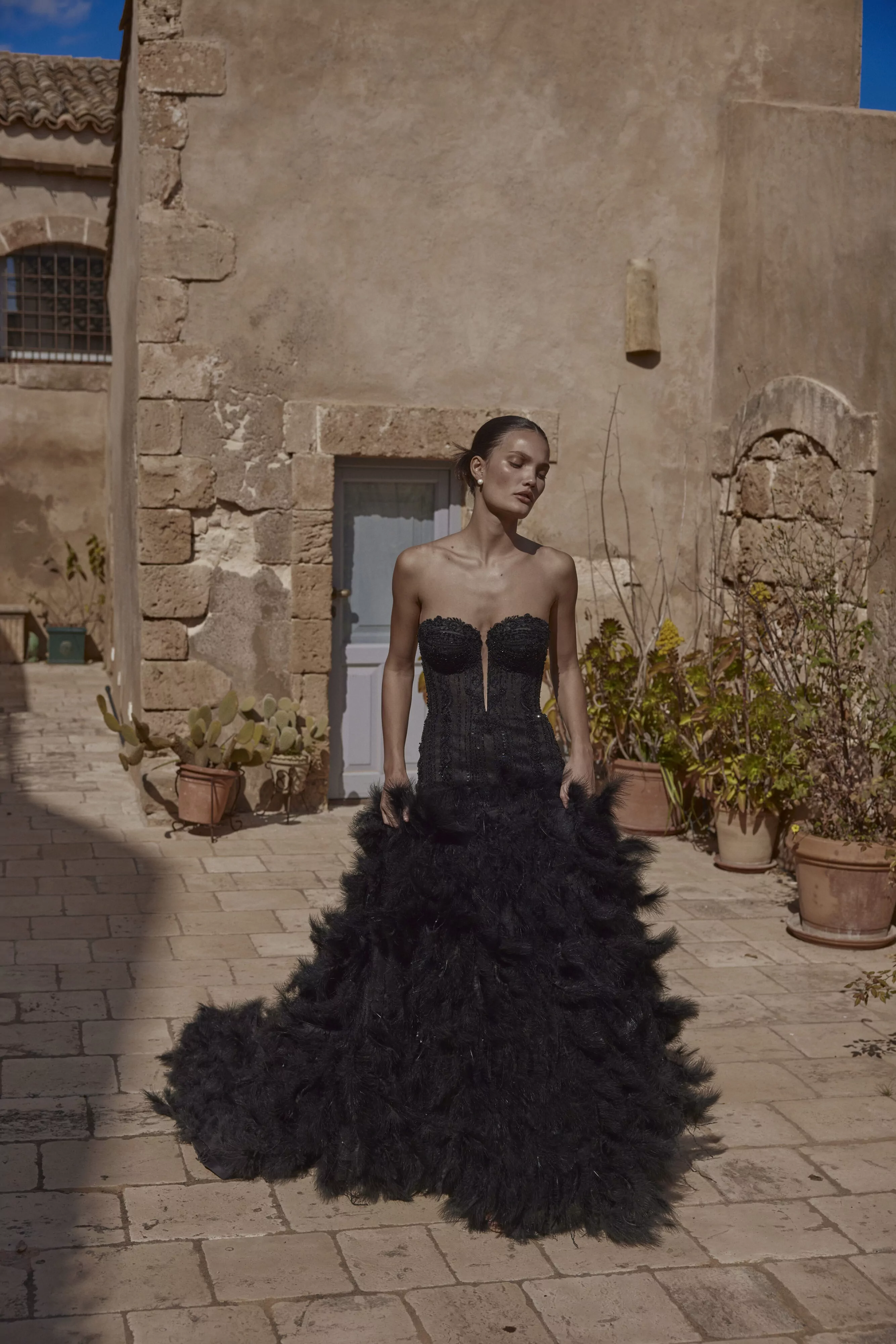 A stunningly distinctive black mermaid gown, adorned with a skirt of natural feathers. The bodice, designed in a sweetheart shape with a deep V-neckline, is meticulously embellished by hand with intricate black beads. The feathered skirt gracefully flows into an extraordinary train, evoking a truly enchanting and magical allure.