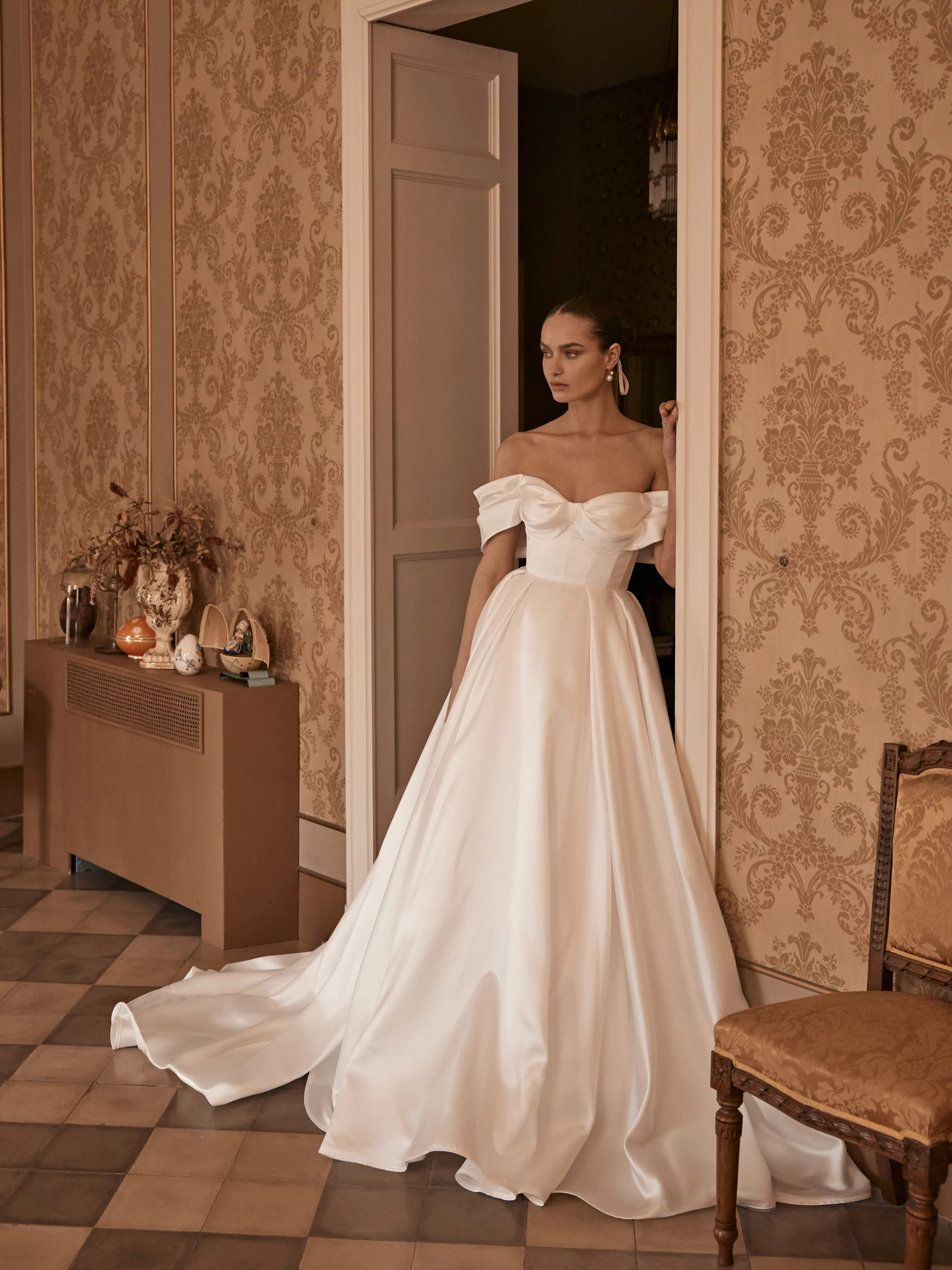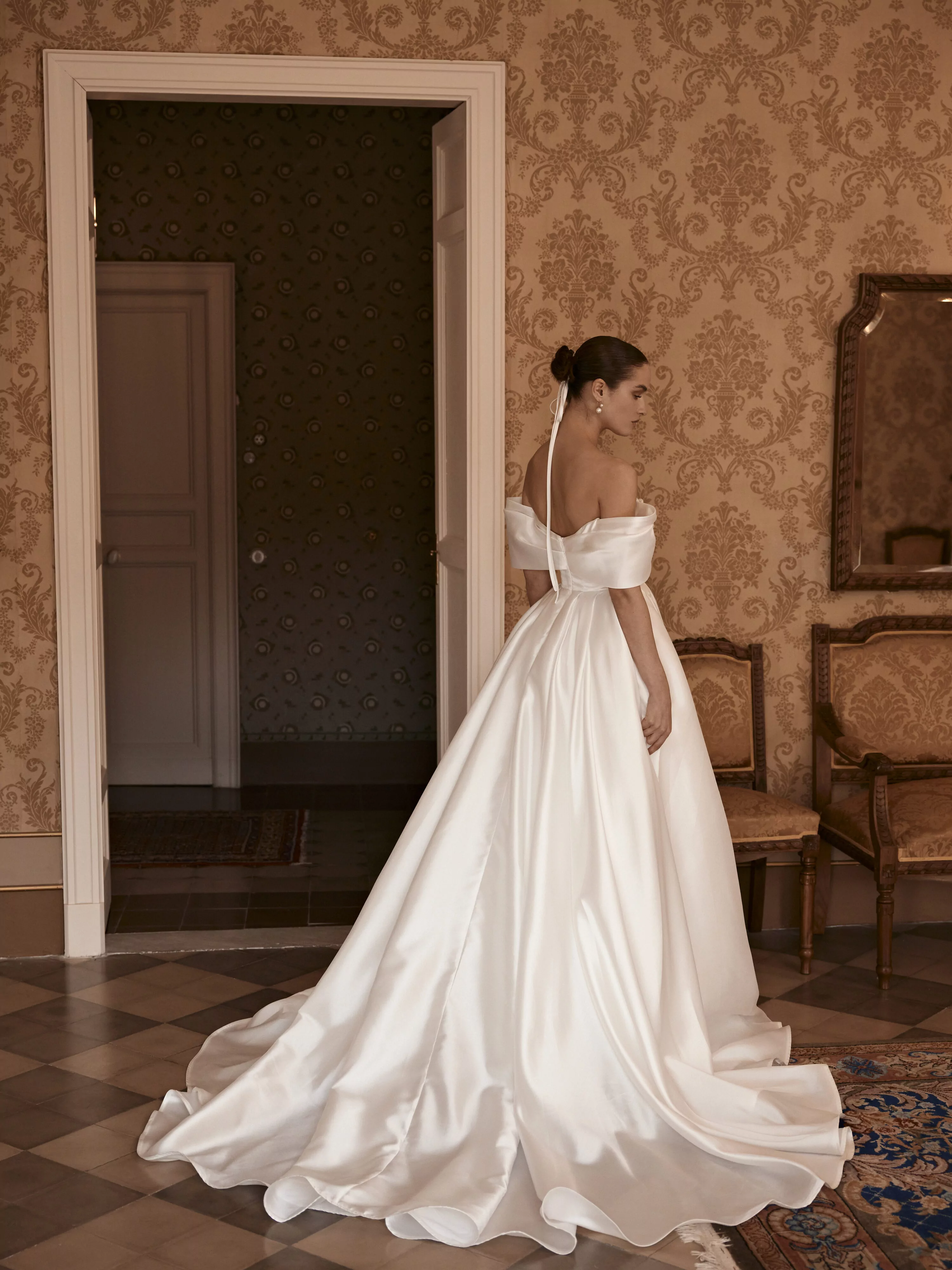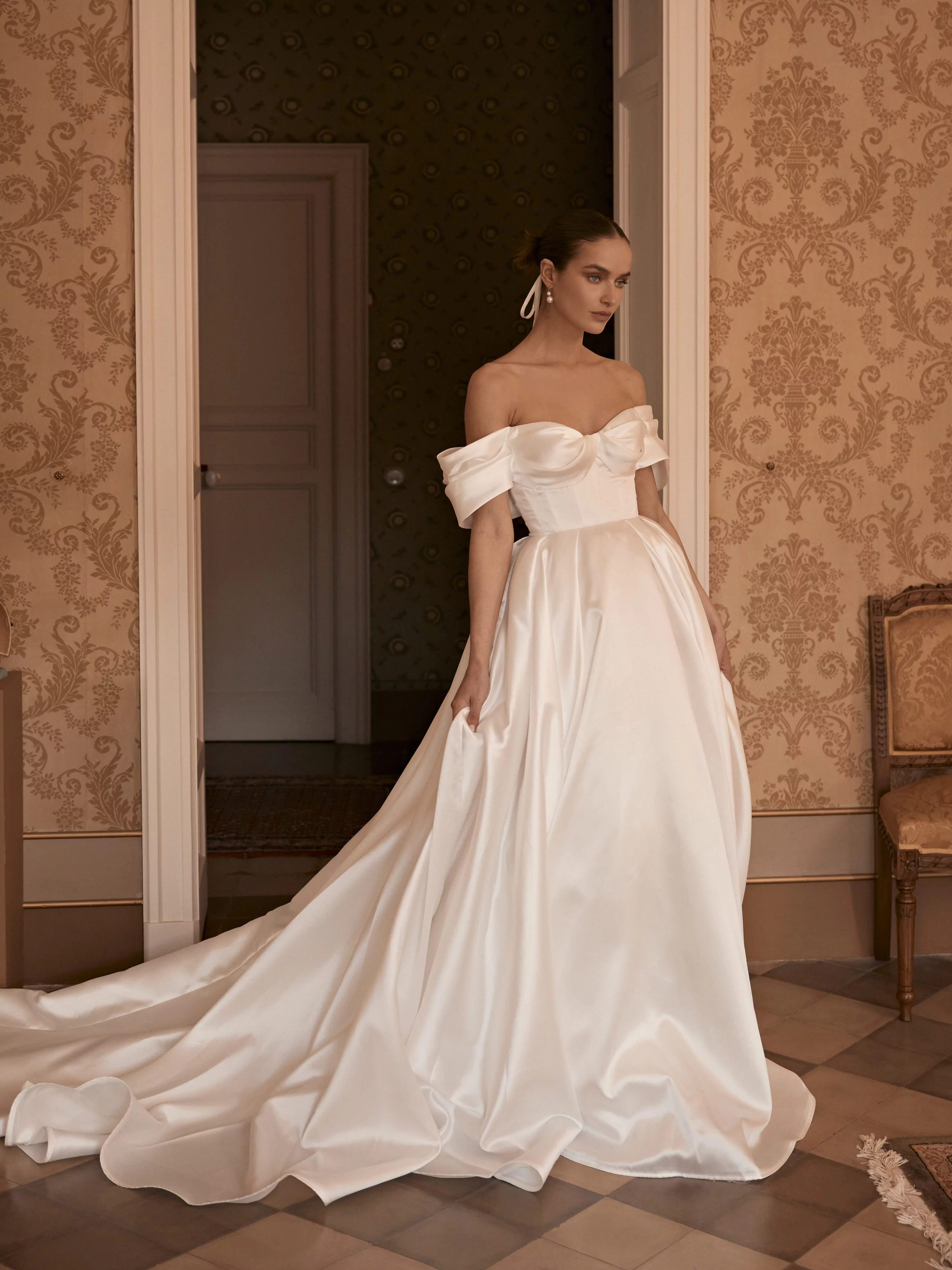Dreamy off-the-shoulder satin wedding dress in ivory colour with a heart-shaped neckline, draped bodice, and an open back with lace-up closure. Features a full skirt with a very long train.