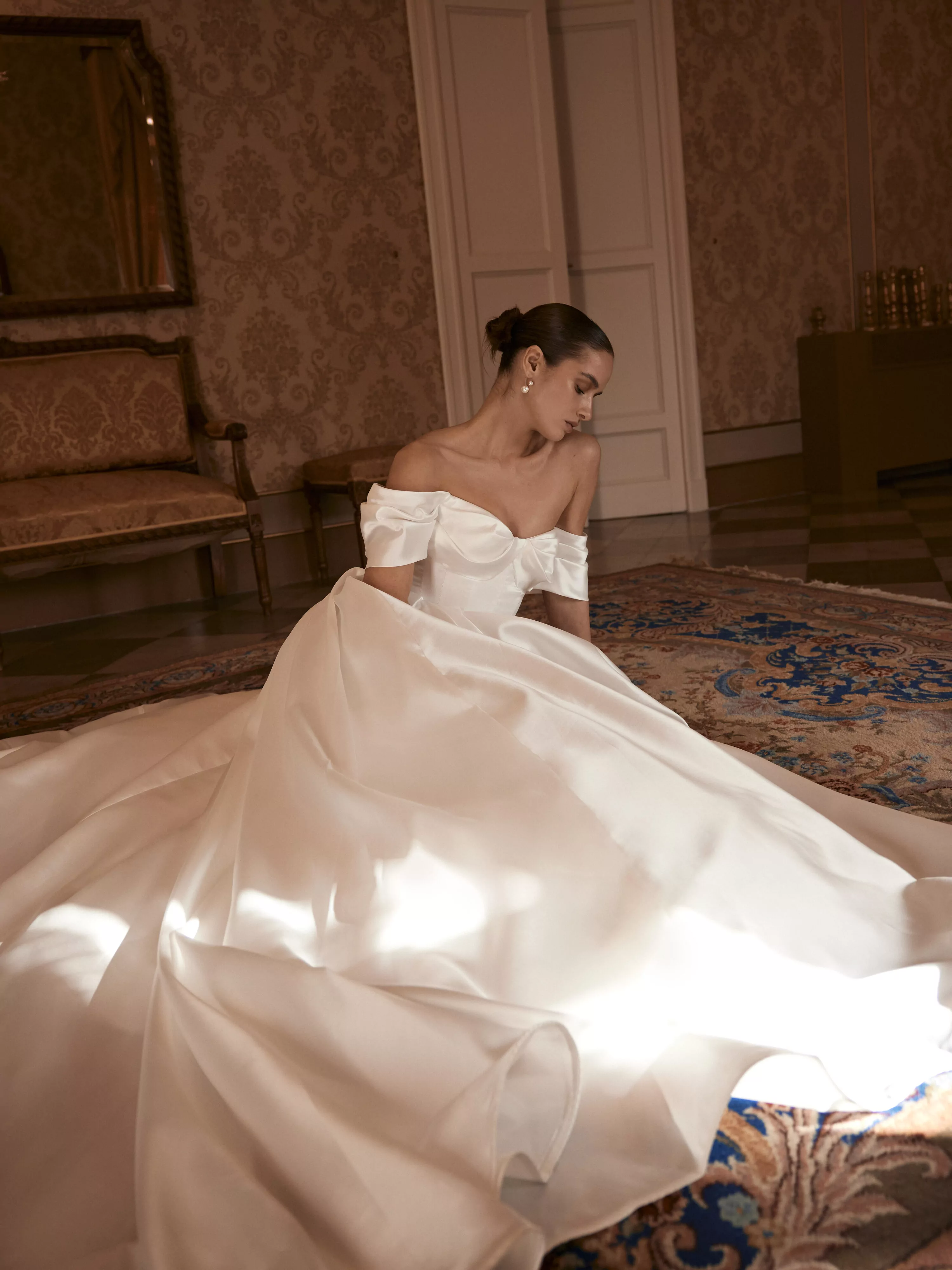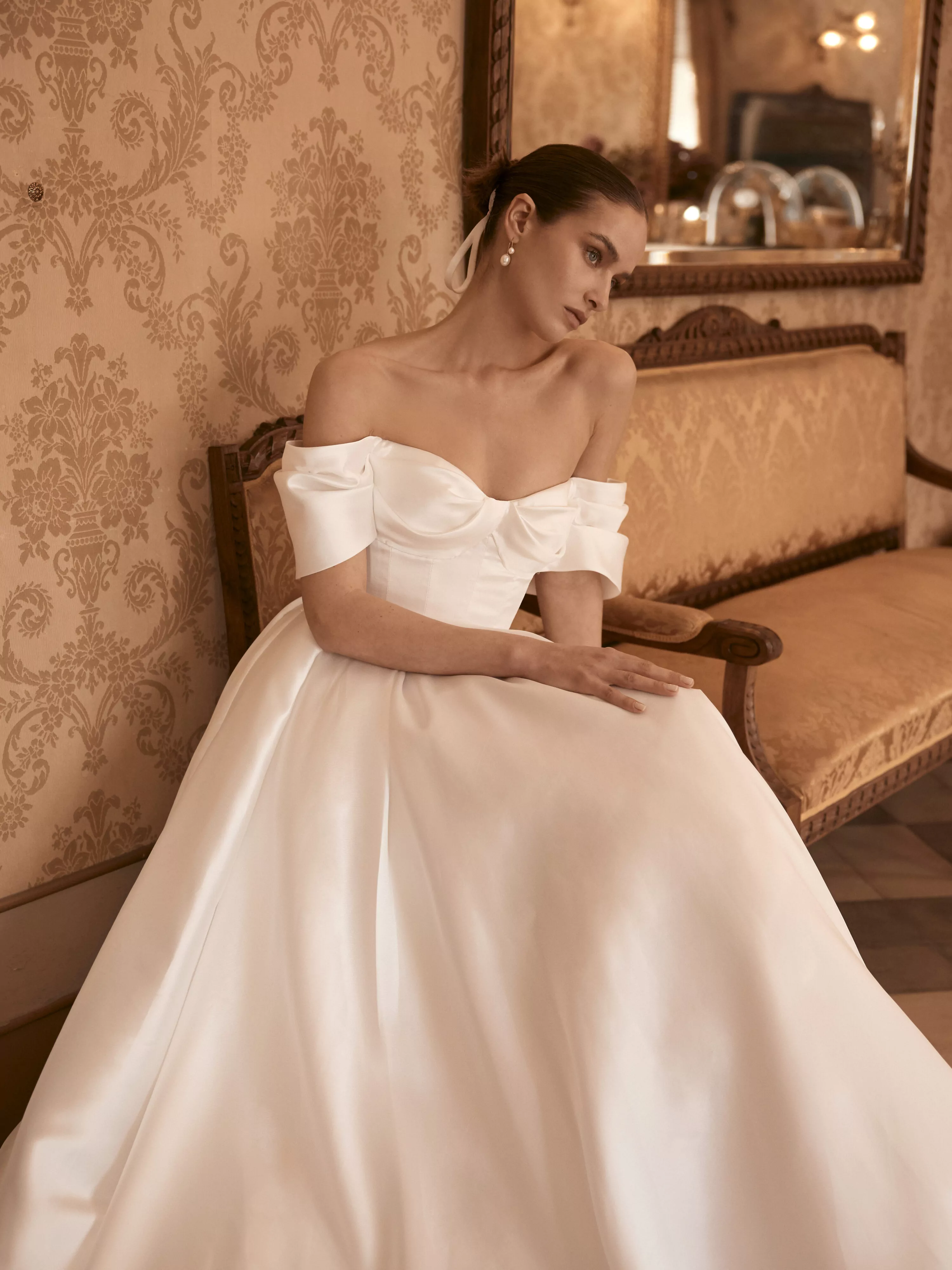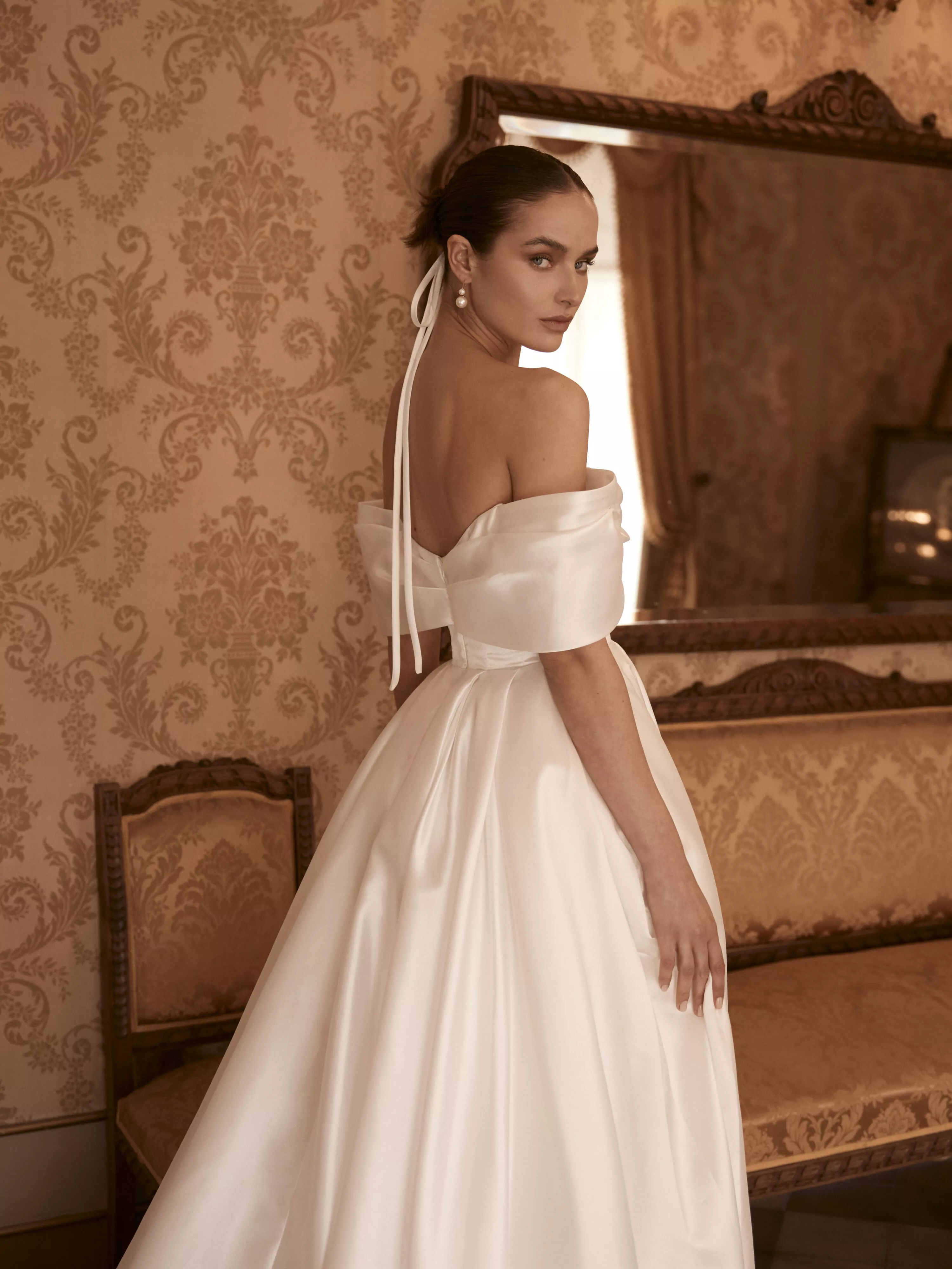 Dreamy off-the-shoulder satin wedding dress in ivory colour with a heart-shaped neckline, draped bodice, and an open back with lace-up closure. Features a full skirt with a very long train.