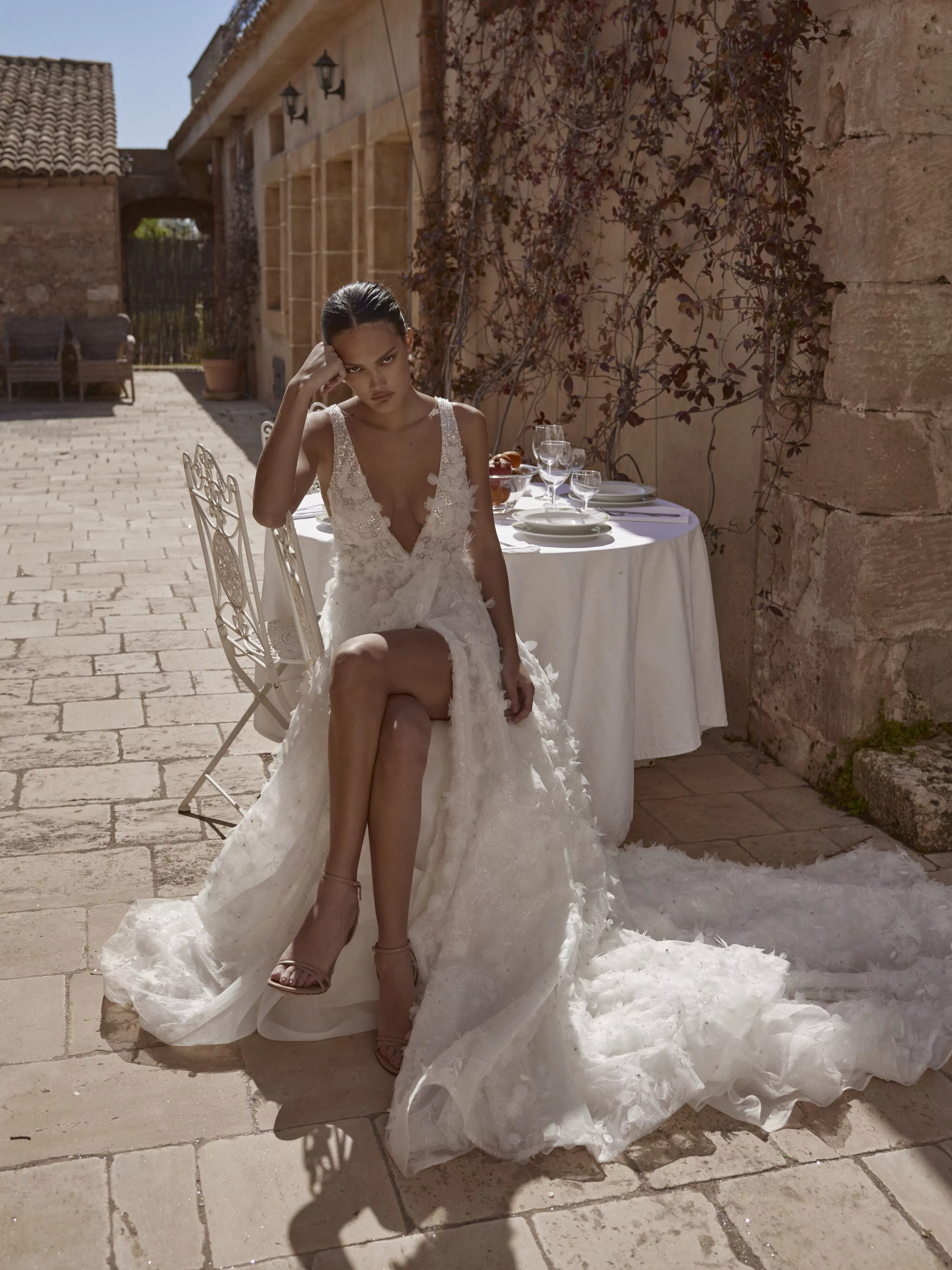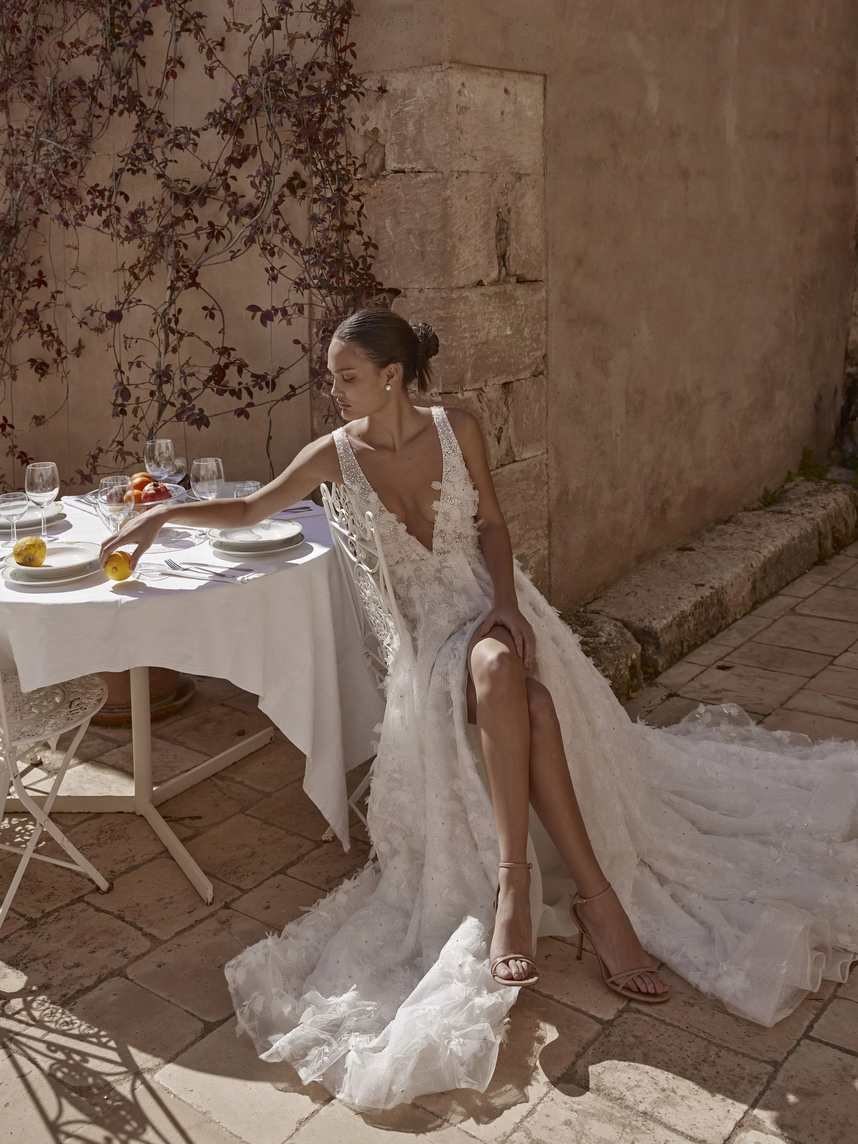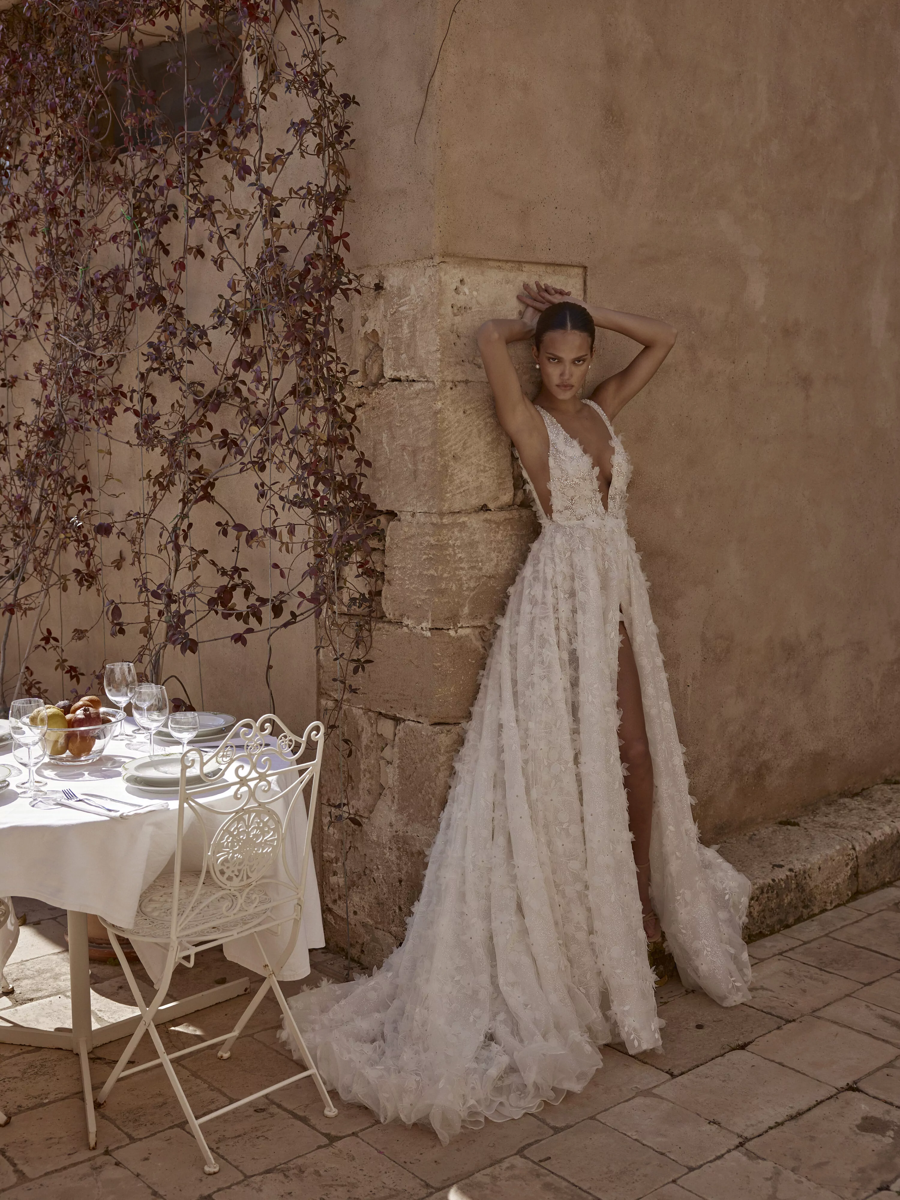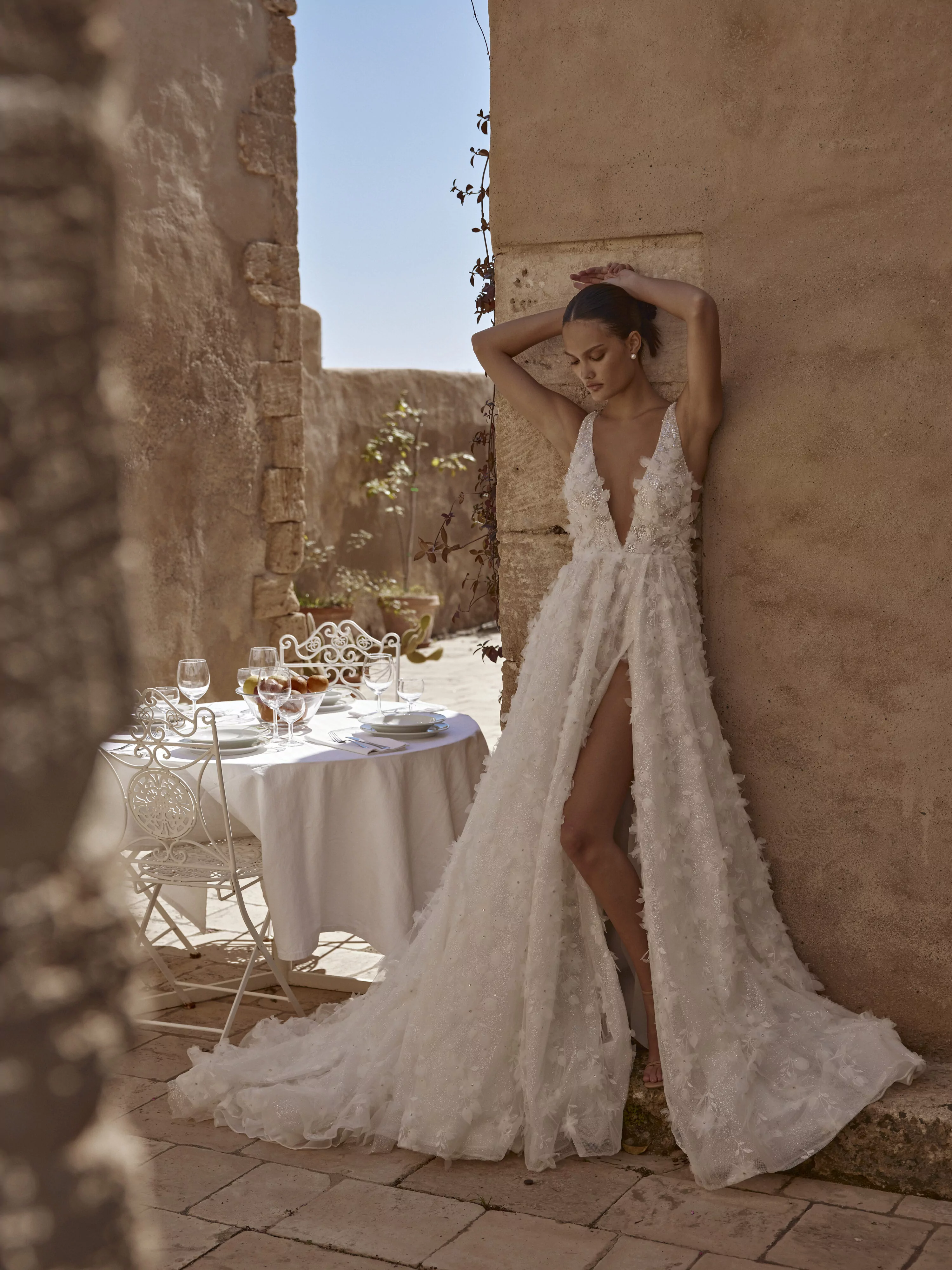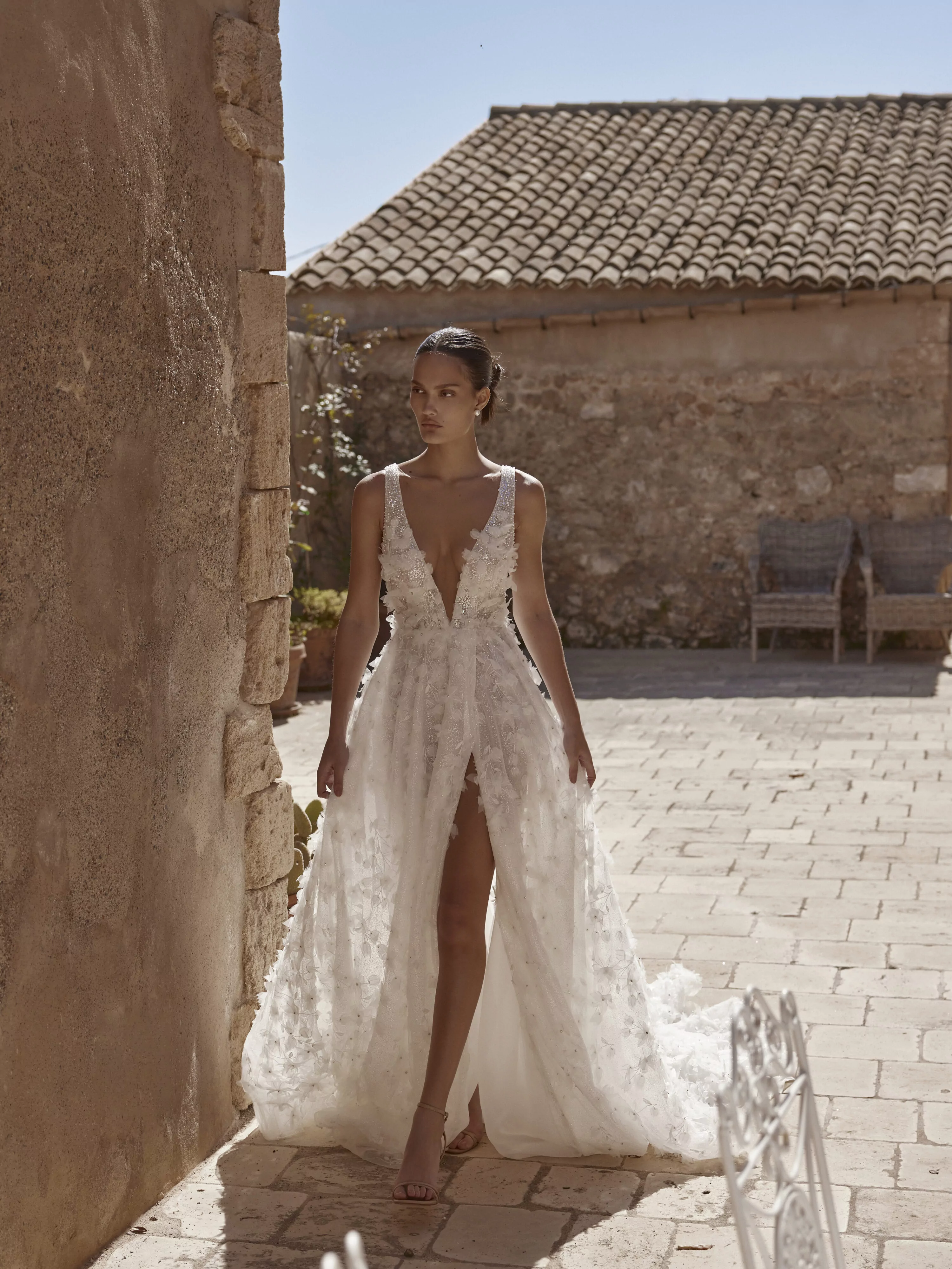 A-line dress with a thigh-length slit, made of luxurious mesh with glitter and embellished with voluminous organza floral appliques, creates a delicate and romantic look.