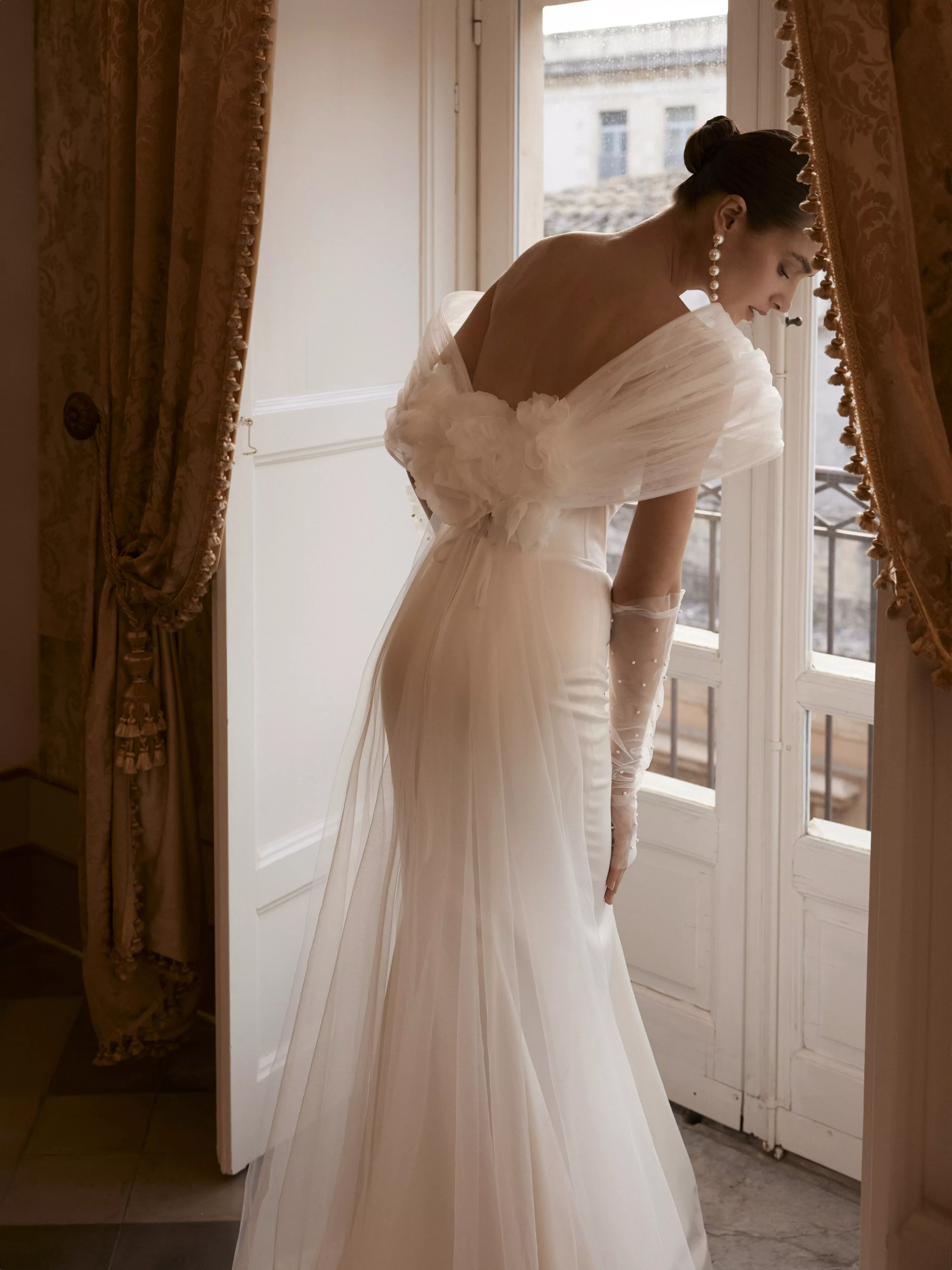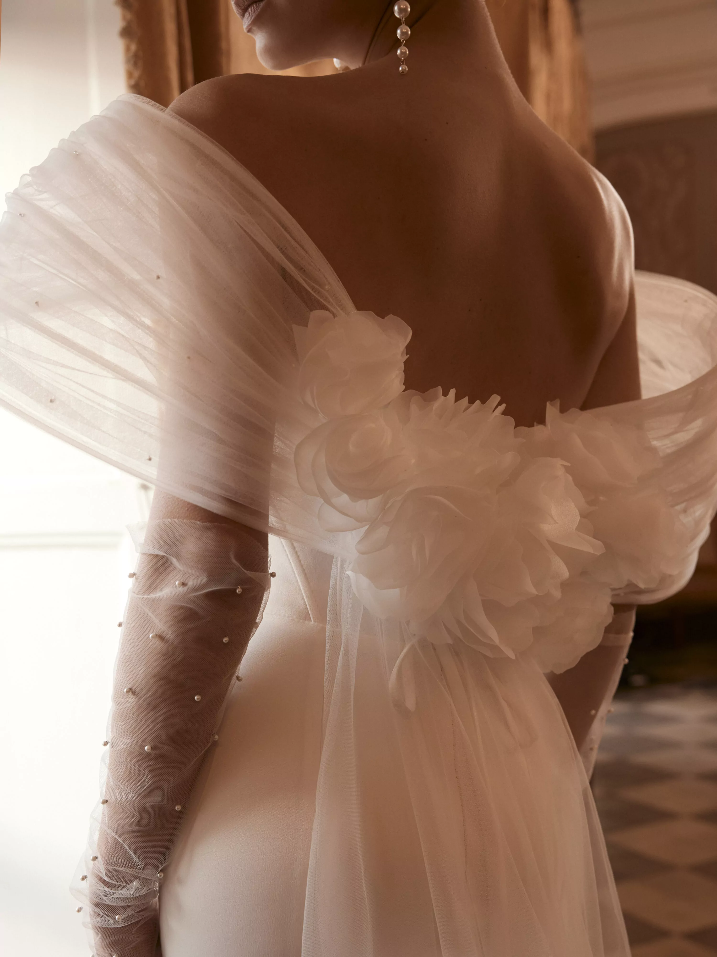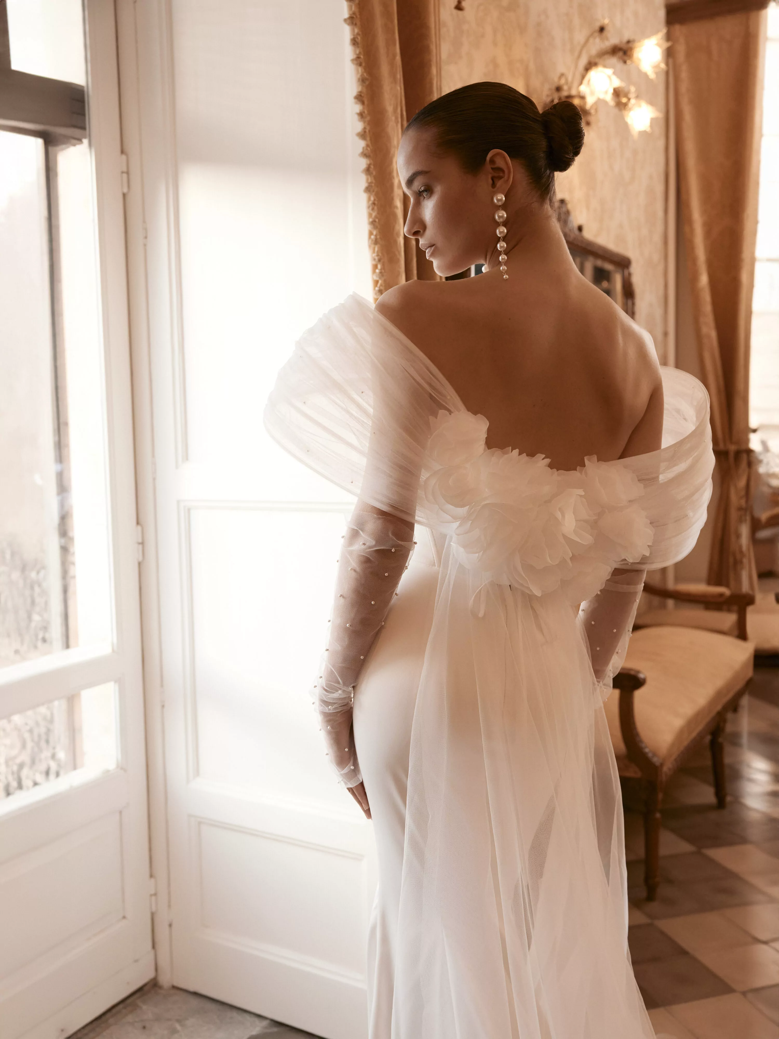 Statement mermaid gown made from luxurious Italian satin, featuring a removable architectural-style embellishment adorned with 3D flowers along the back, cascading into a delicate mesh train. The form-fitting silhouette boasts a sweetheart neckline and a fitted maxi skirt with an elegant train.