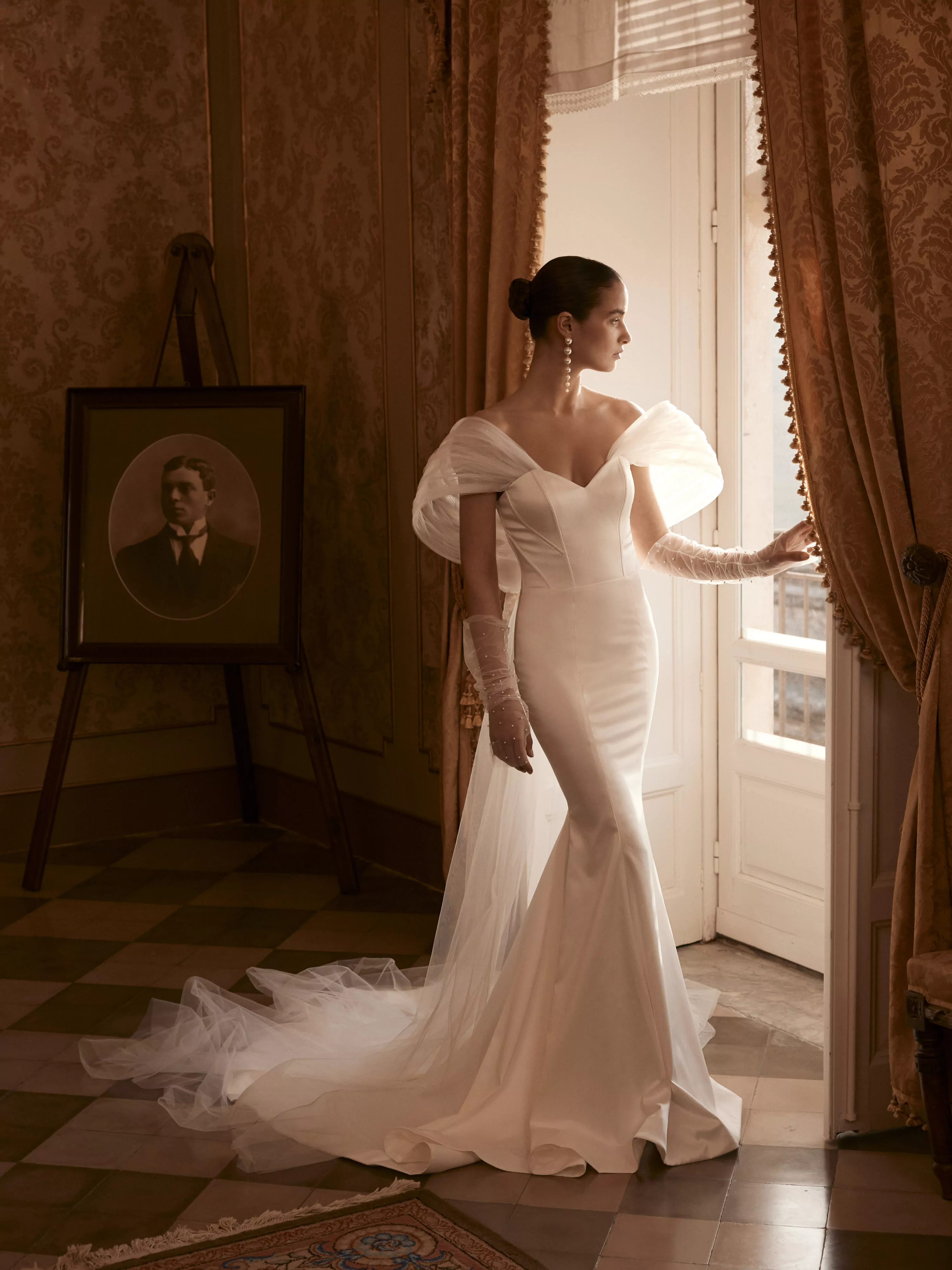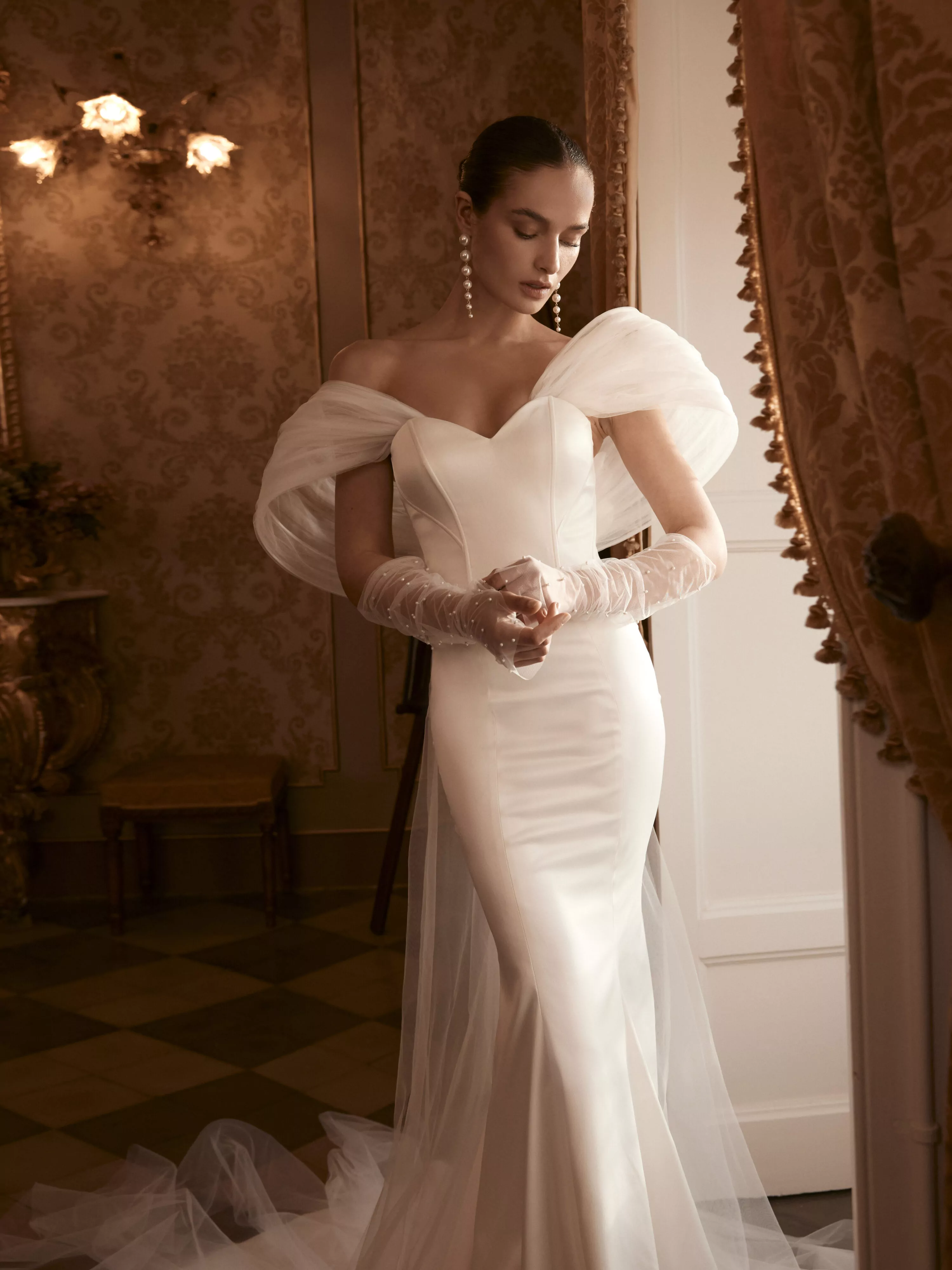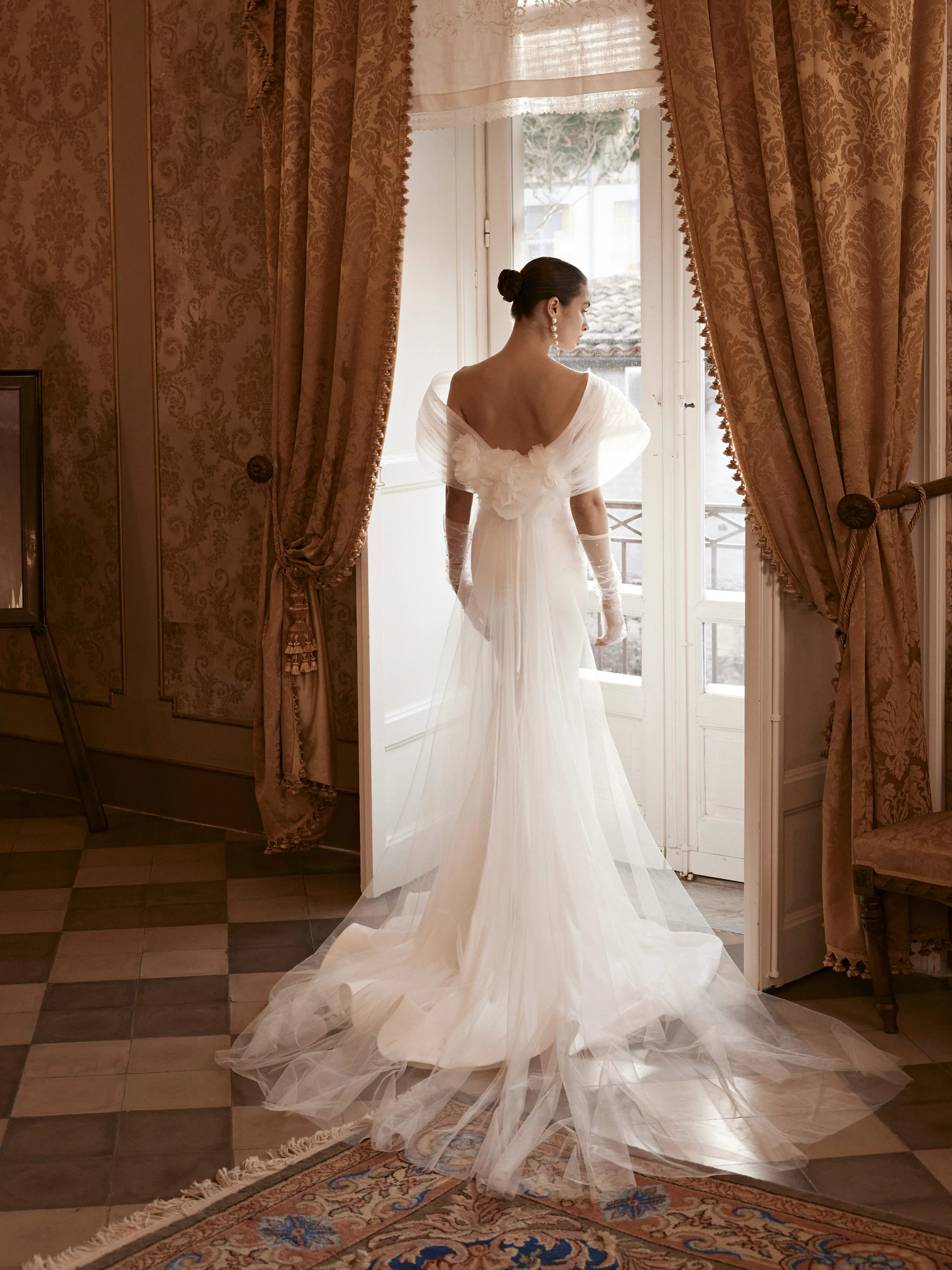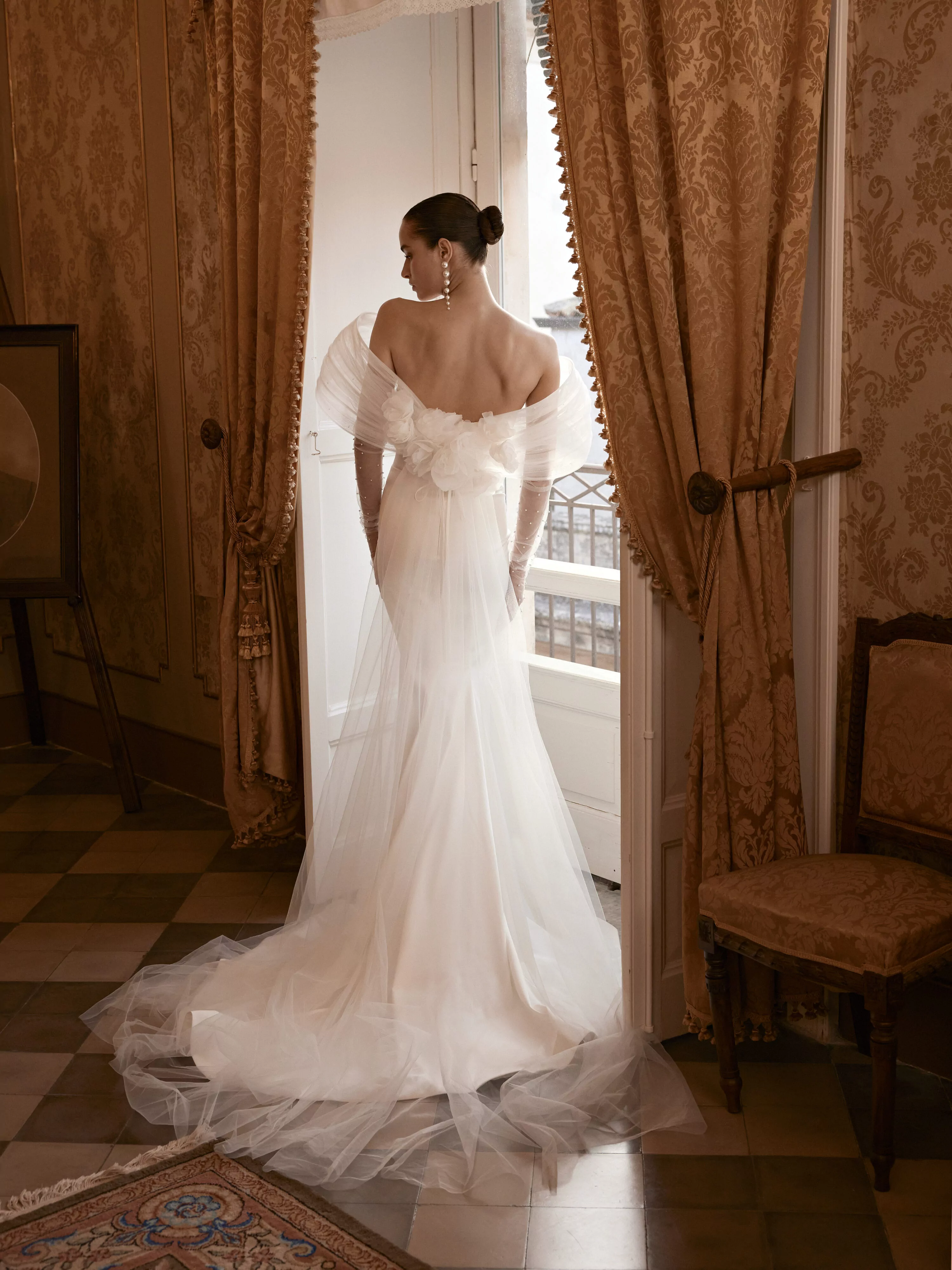 Statement mermaid gown made from luxurious Italian satin, featuring a removable architectural-style embellishment adorned with 3D flowers along the back, cascading into a delicate mesh train. The form-fitting silhouette boasts a sweetheart neckline and a fitted maxi skirt with an elegant train.