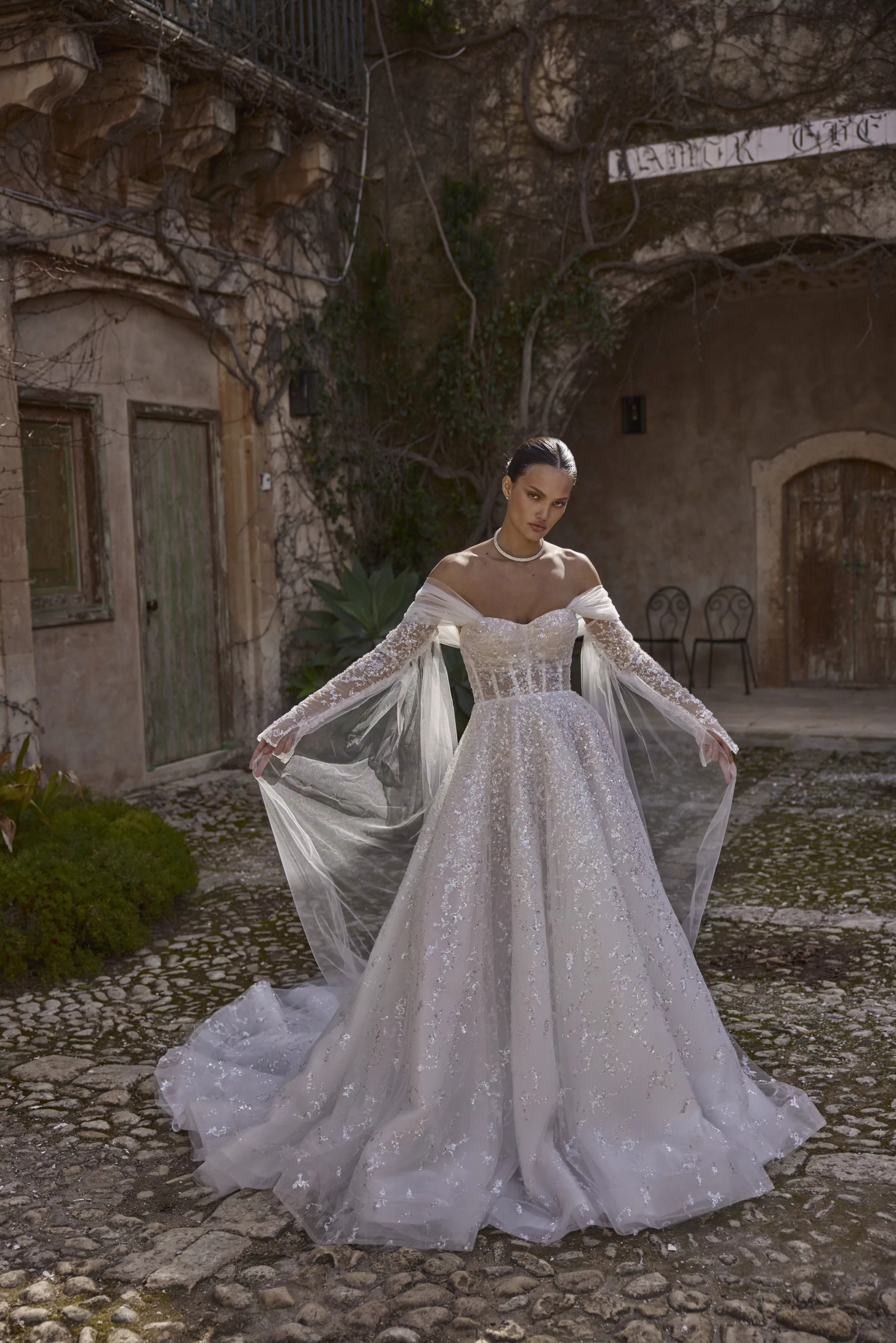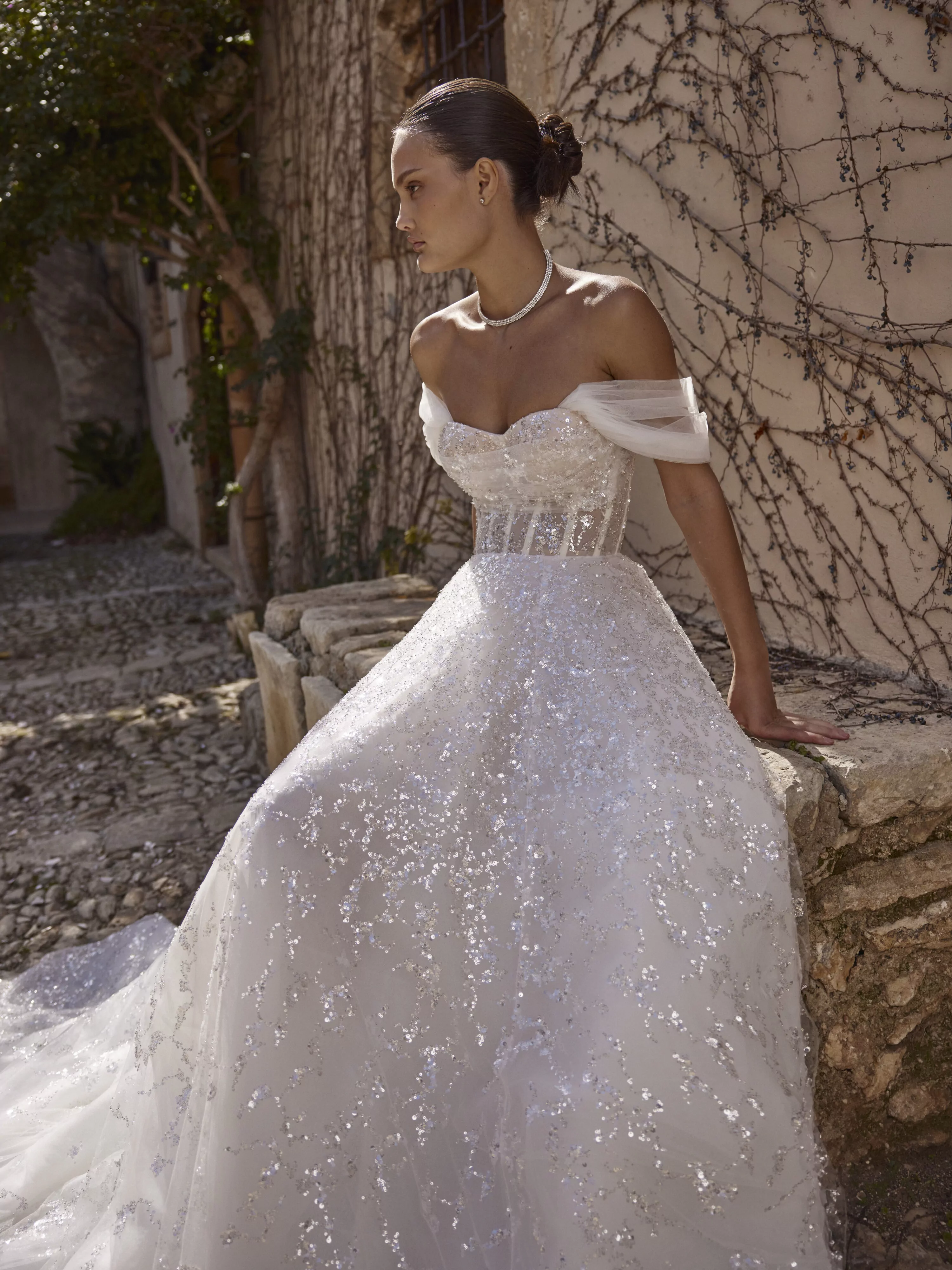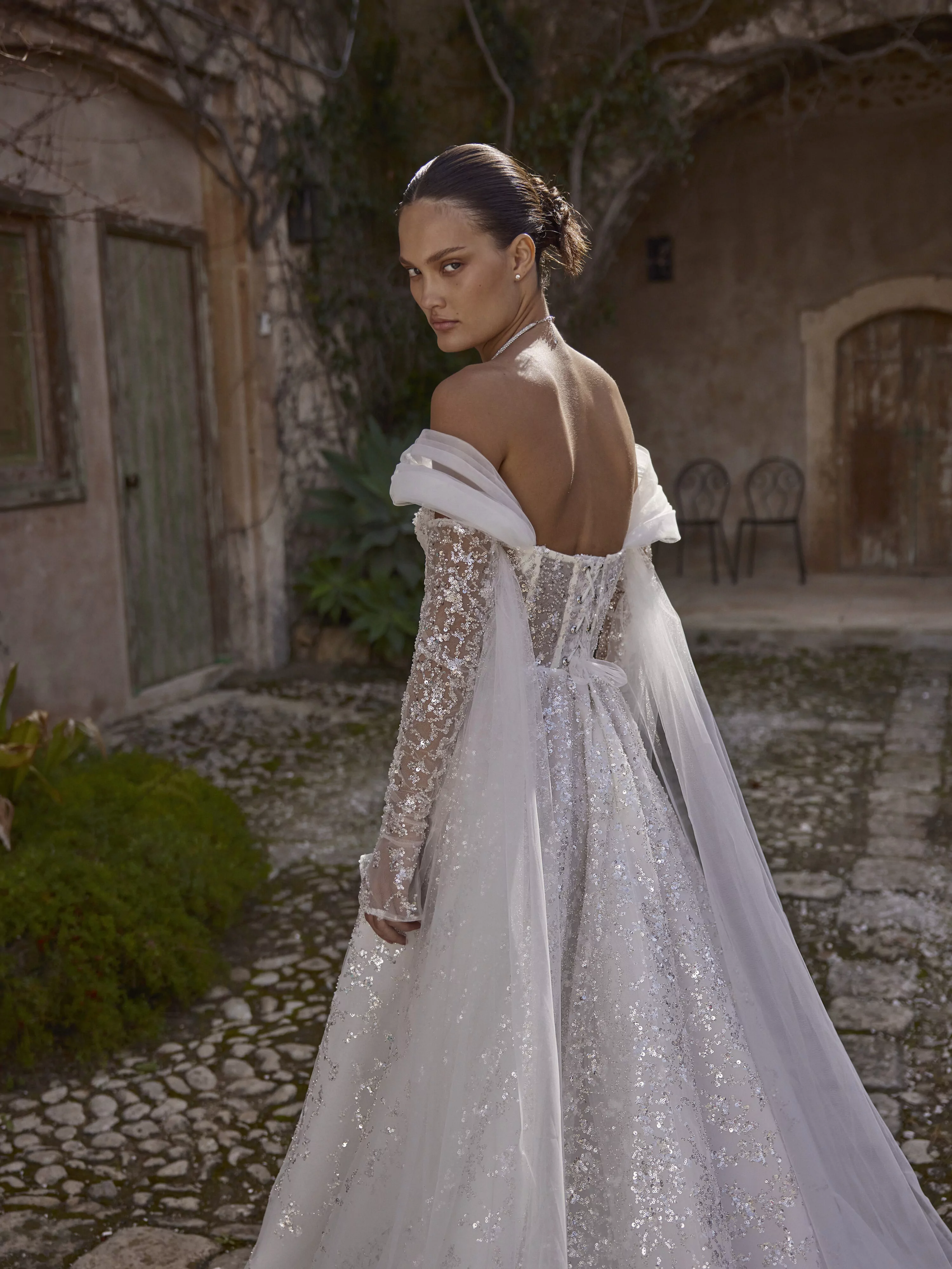 A-line dress in sparkling silver mesh with a semi-transparent corset and lace-up back. The dress has a soft, sculpted neckline and detachable, flowing sleeves that give the look a dreamy, ethereal feel.