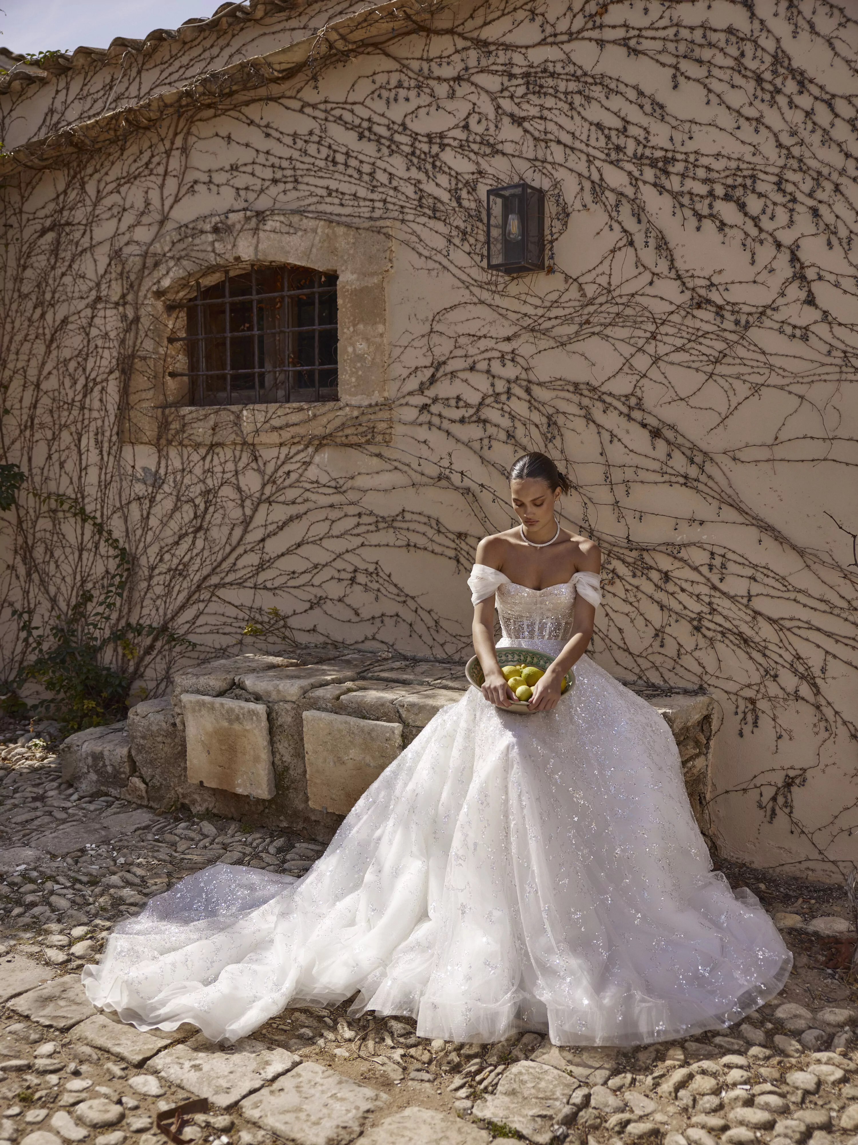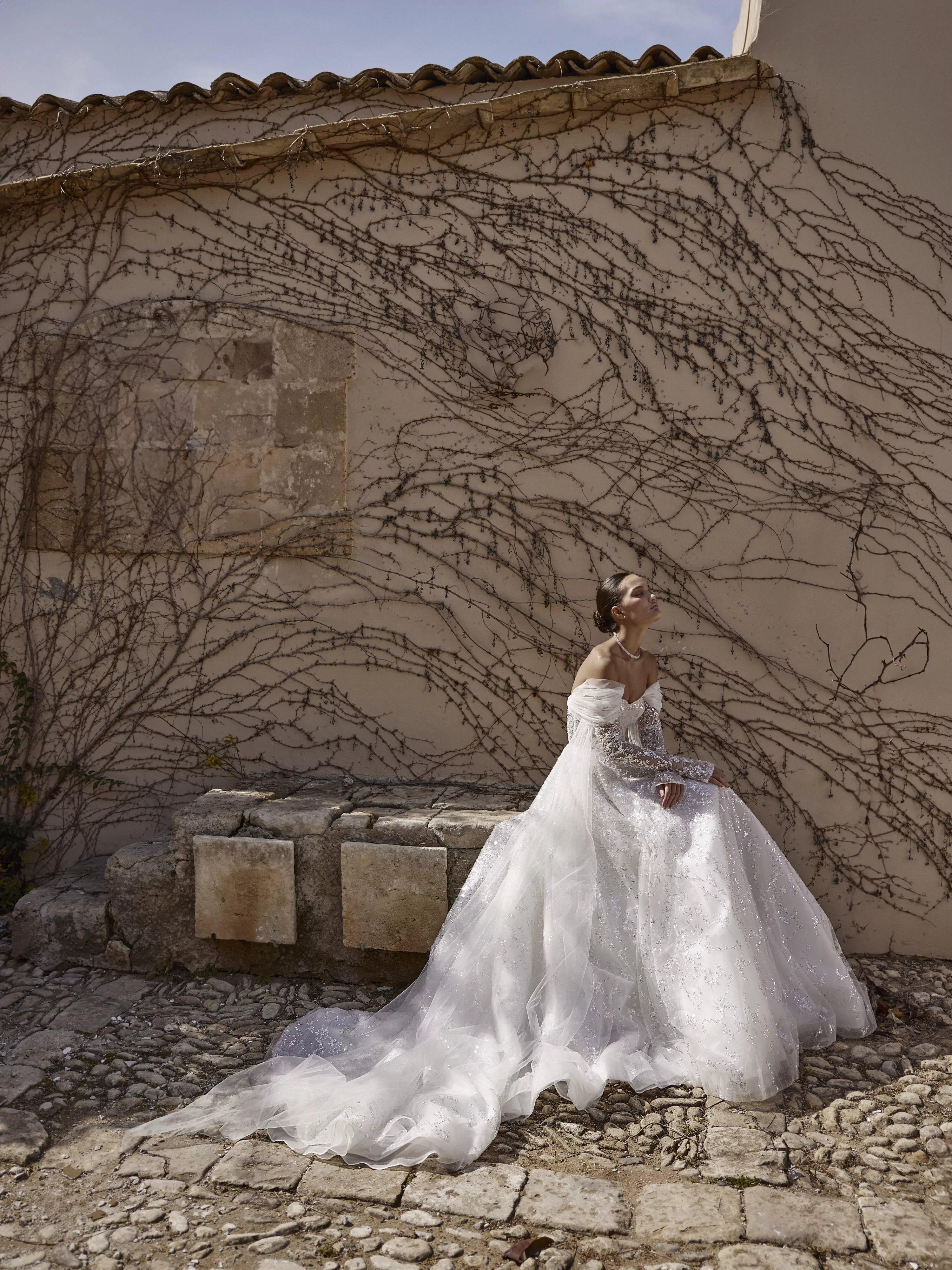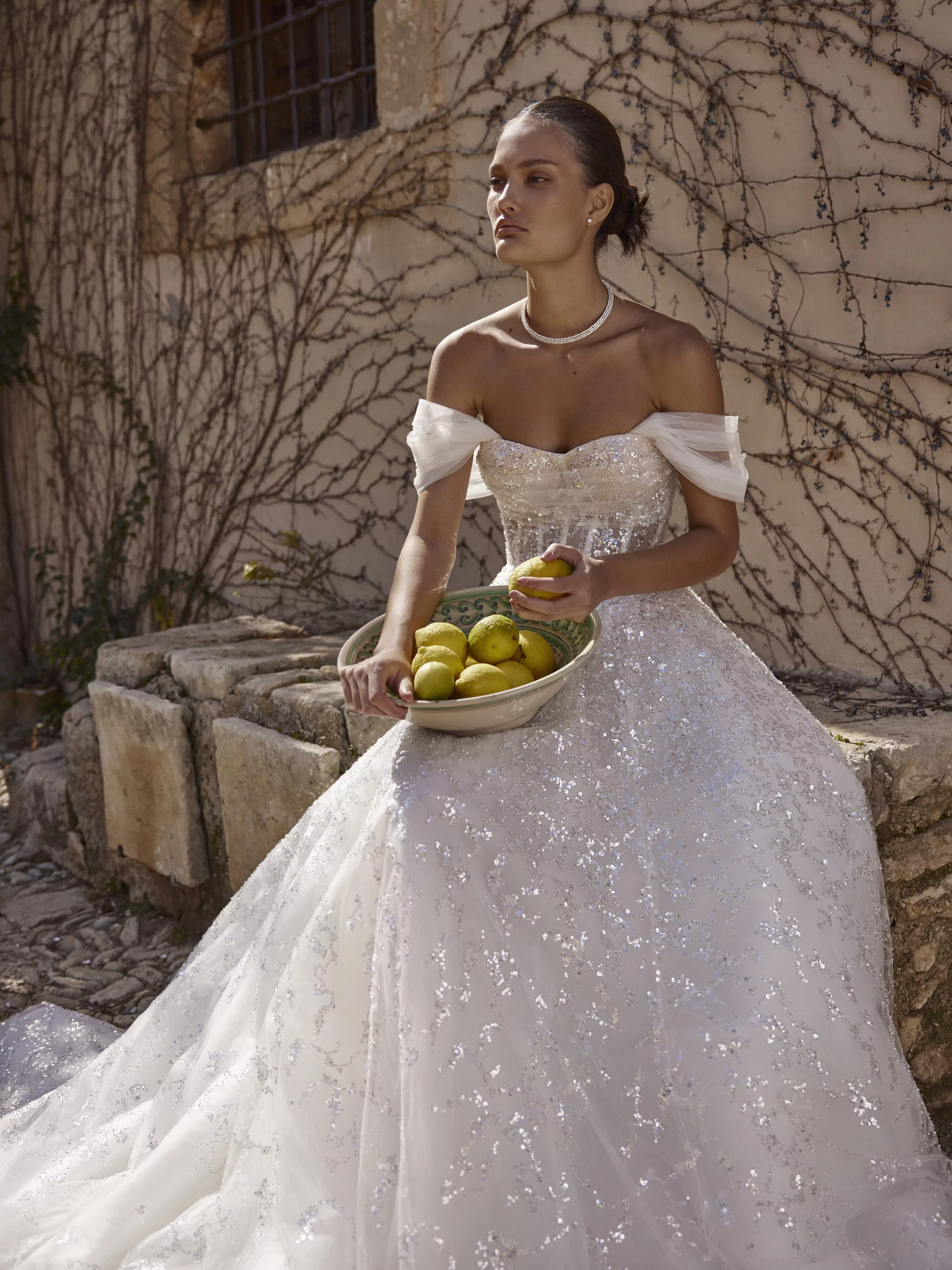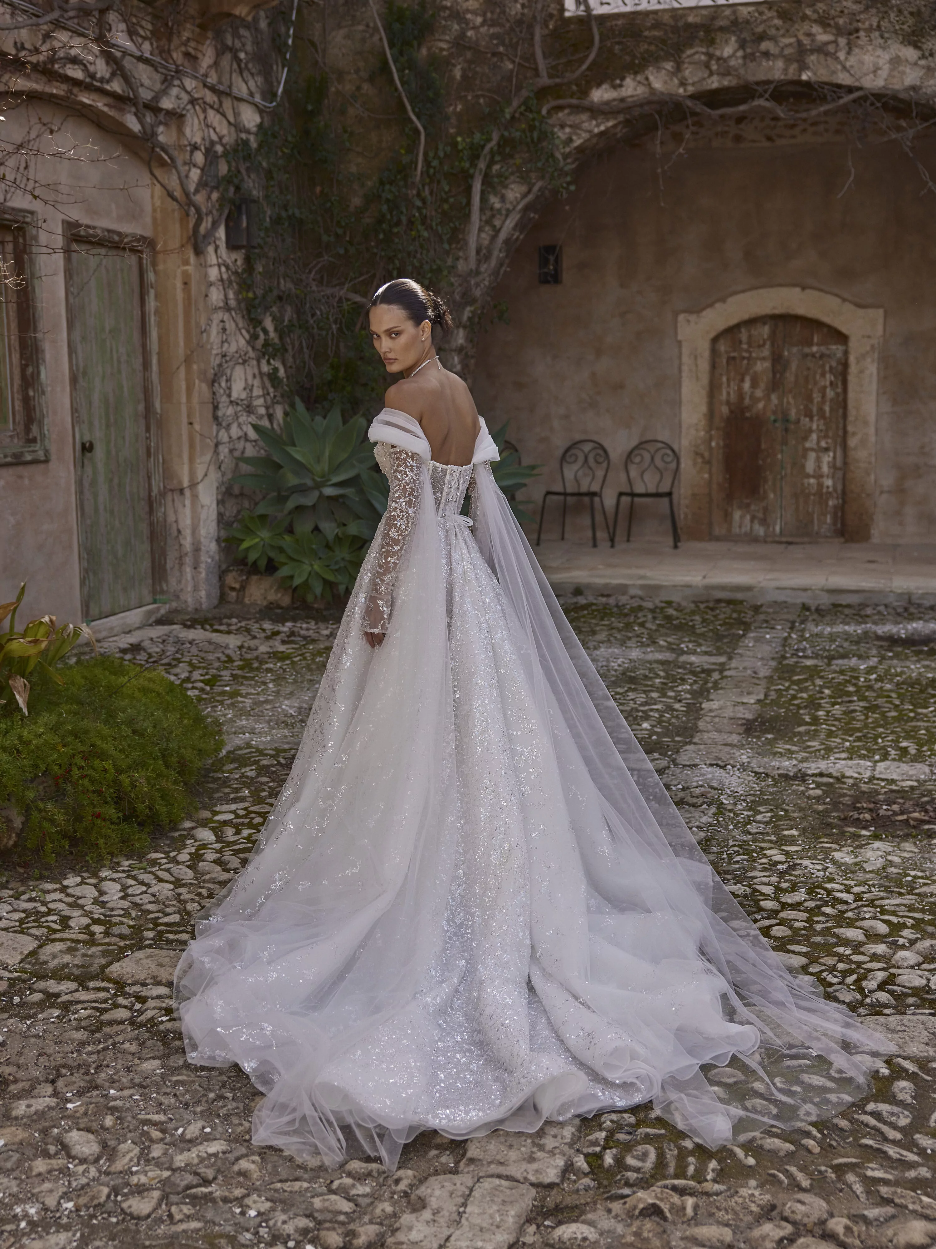 A-line dress in sparkling silver mesh with a semi-transparent corset and lace-up back. The dress has a soft, sculpted neckline and detachable, flowing sleeves that give the look a dreamy, ethereal feel.