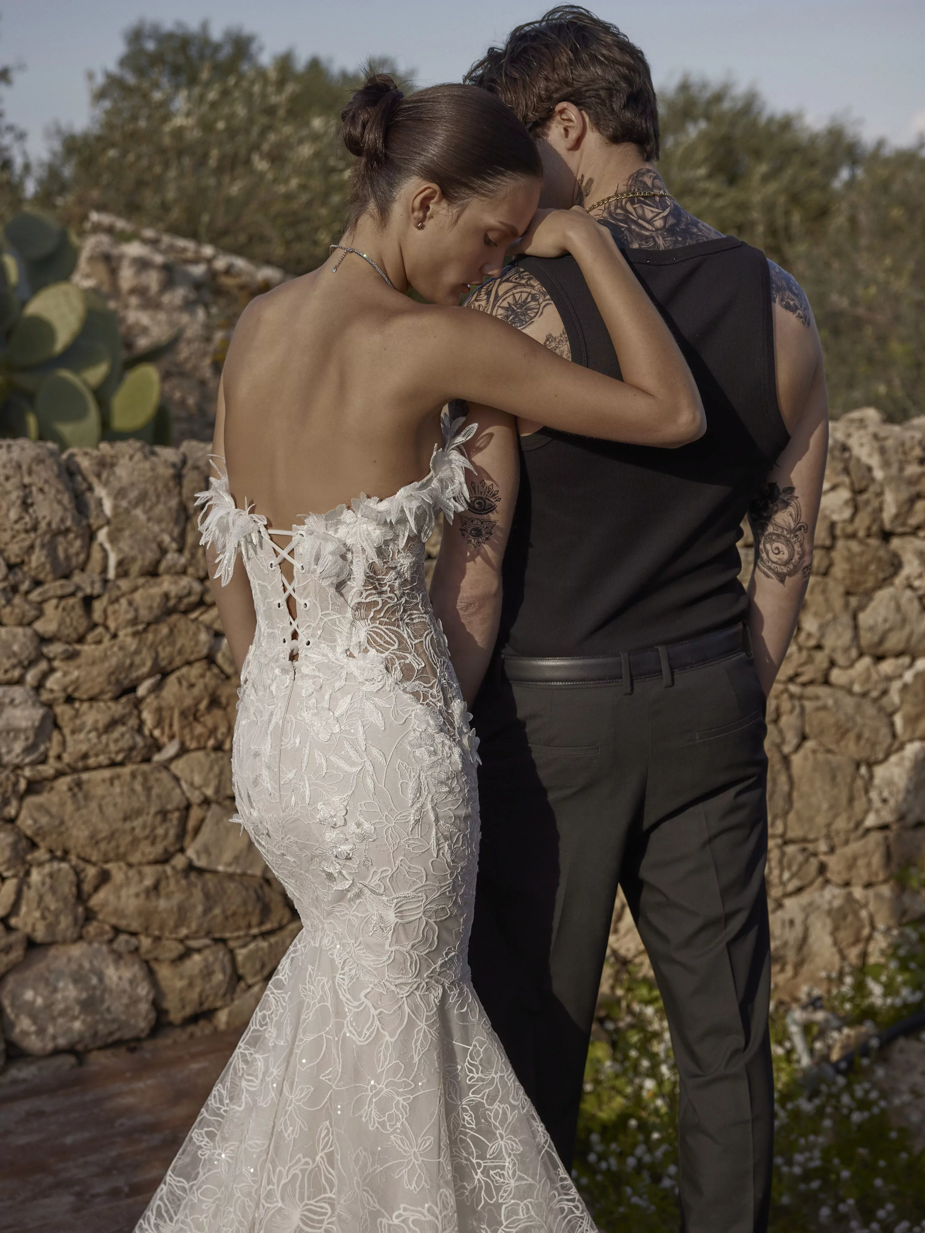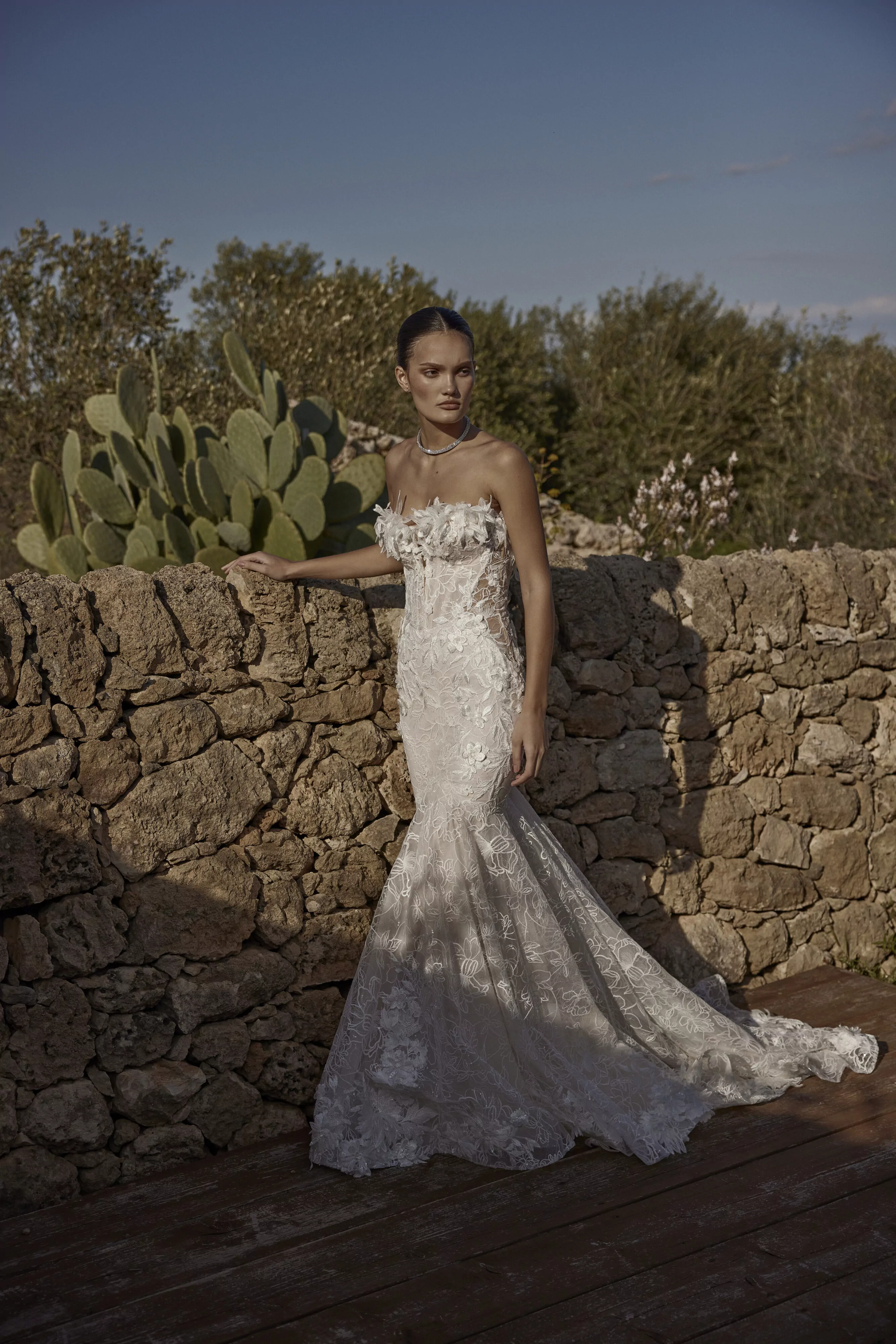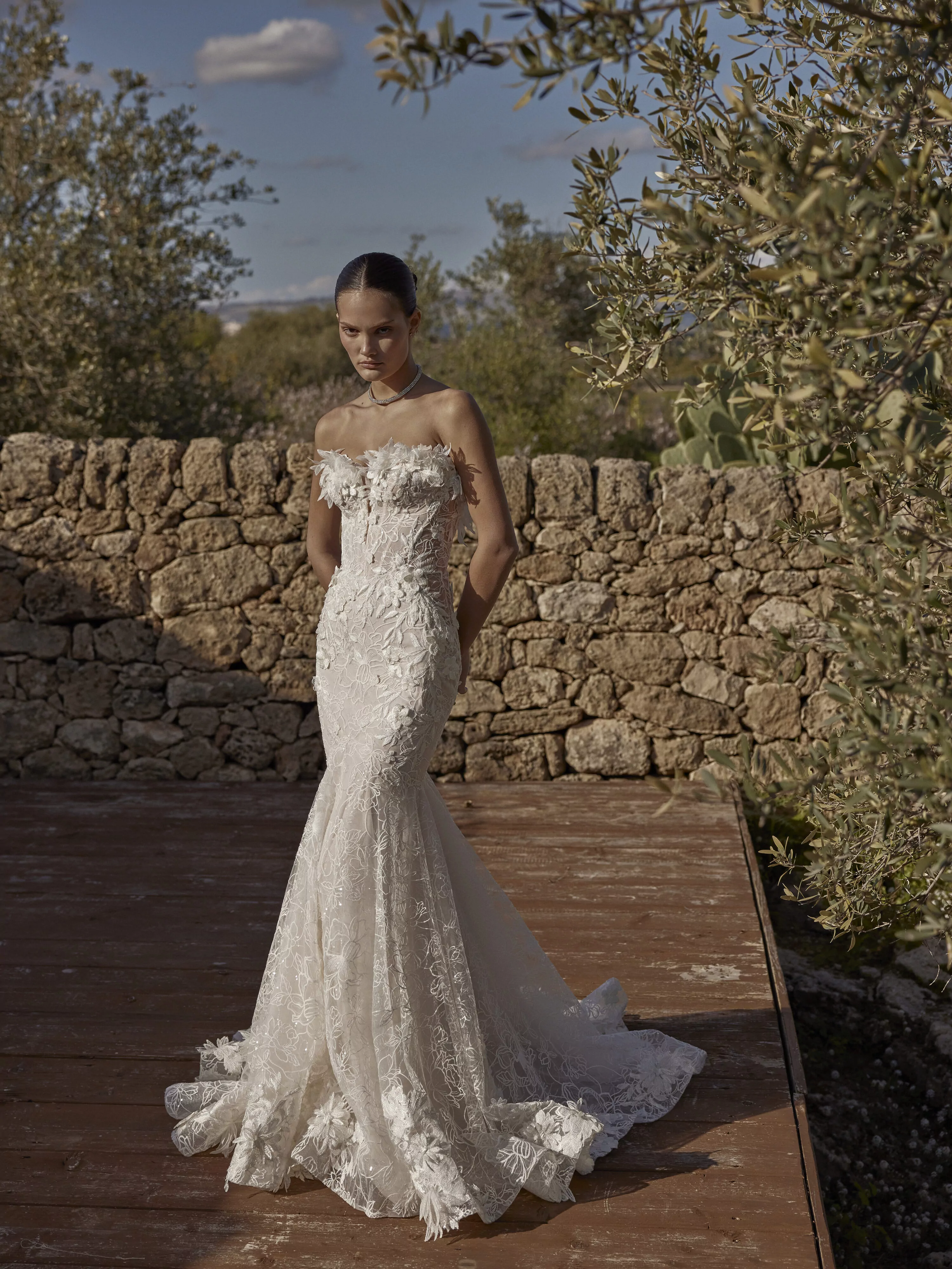 Mermaid silhouette dress made of delicate lace embellished with 3D lace appliqués in the shape of leaves. The dress is decorated with side inserts of transparent mesh, giving it a seductive look, and is complemented with removable flattened straps and long elegant sleeves, creating a refined and spectacular image.