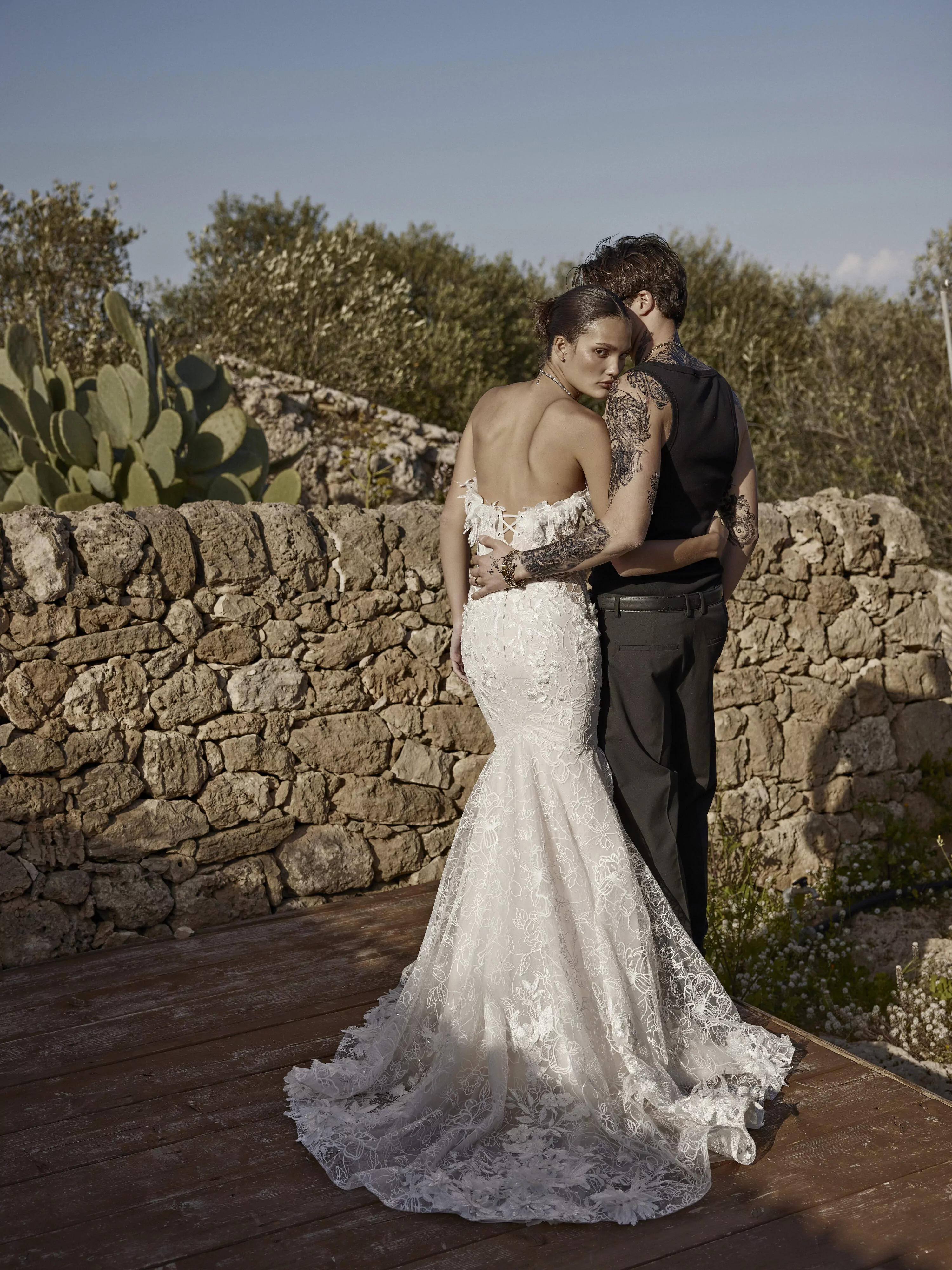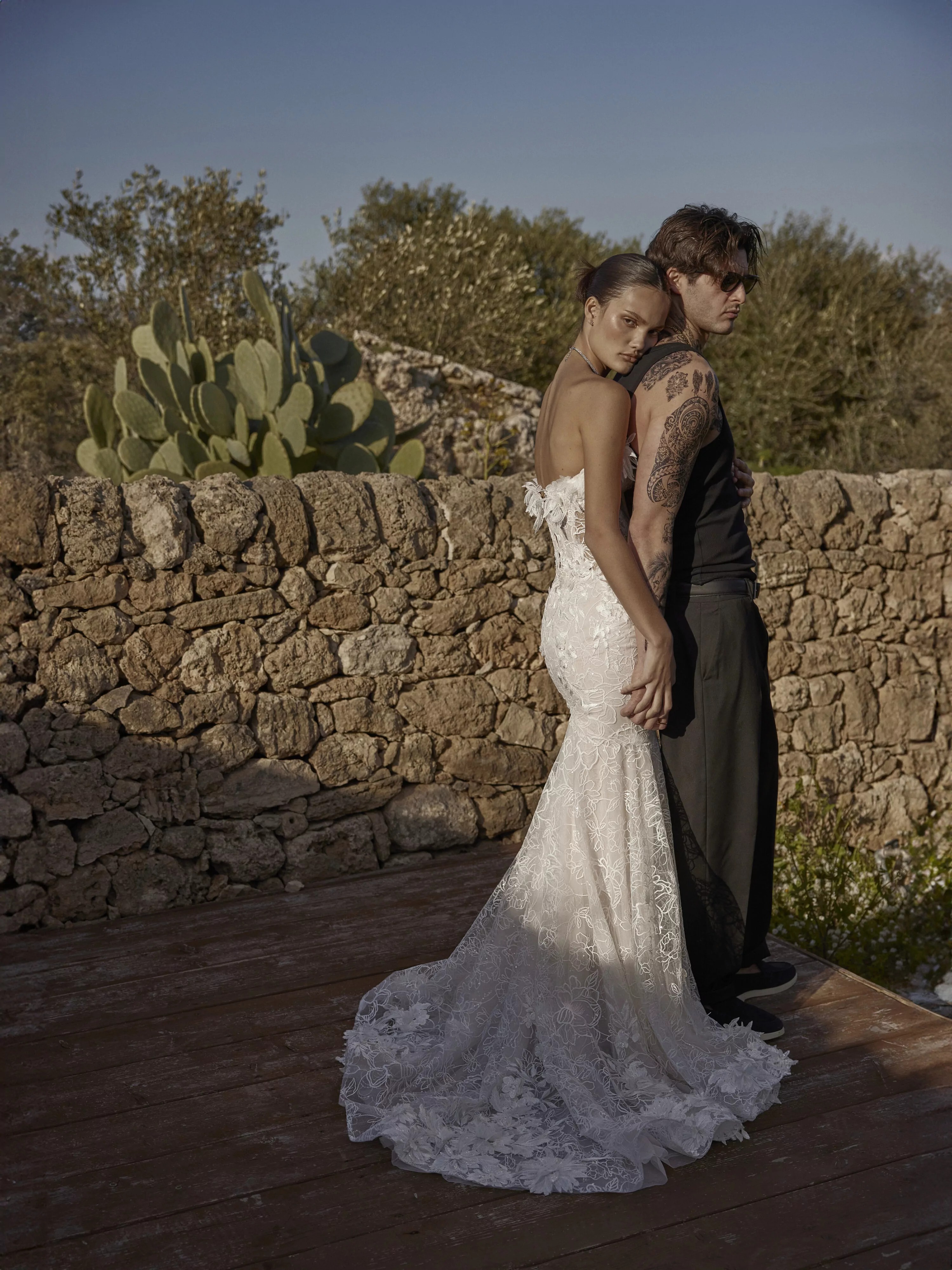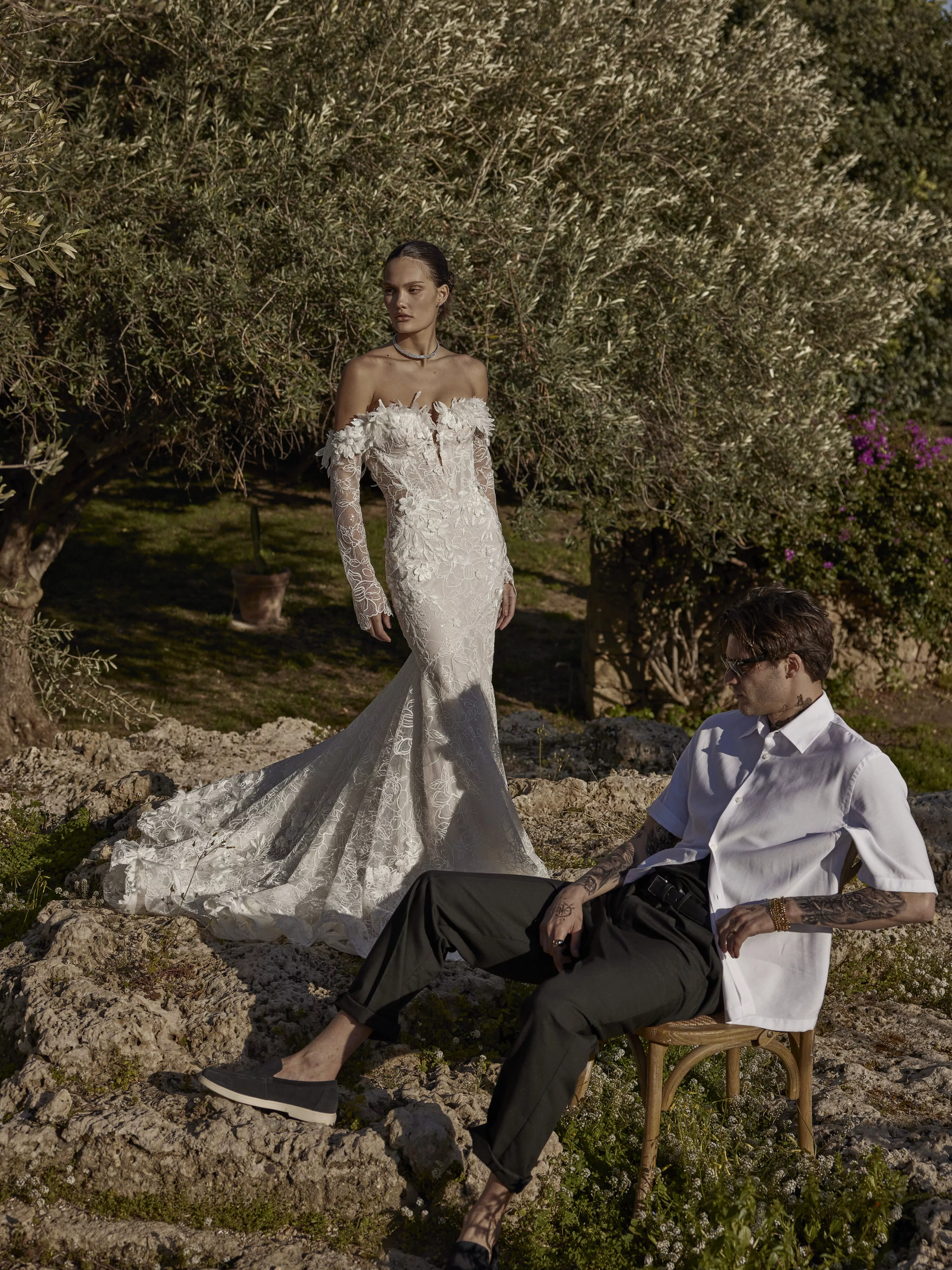 Mermaid silhouette dress made of delicate lace embellished with 3D lace appliqués in the shape of leaves. The dress is decorated with side inserts of transparent mesh, giving it a seductive look, and is complemented with removable flattened straps and long elegant sleeves, creating a refined and spectacular image.