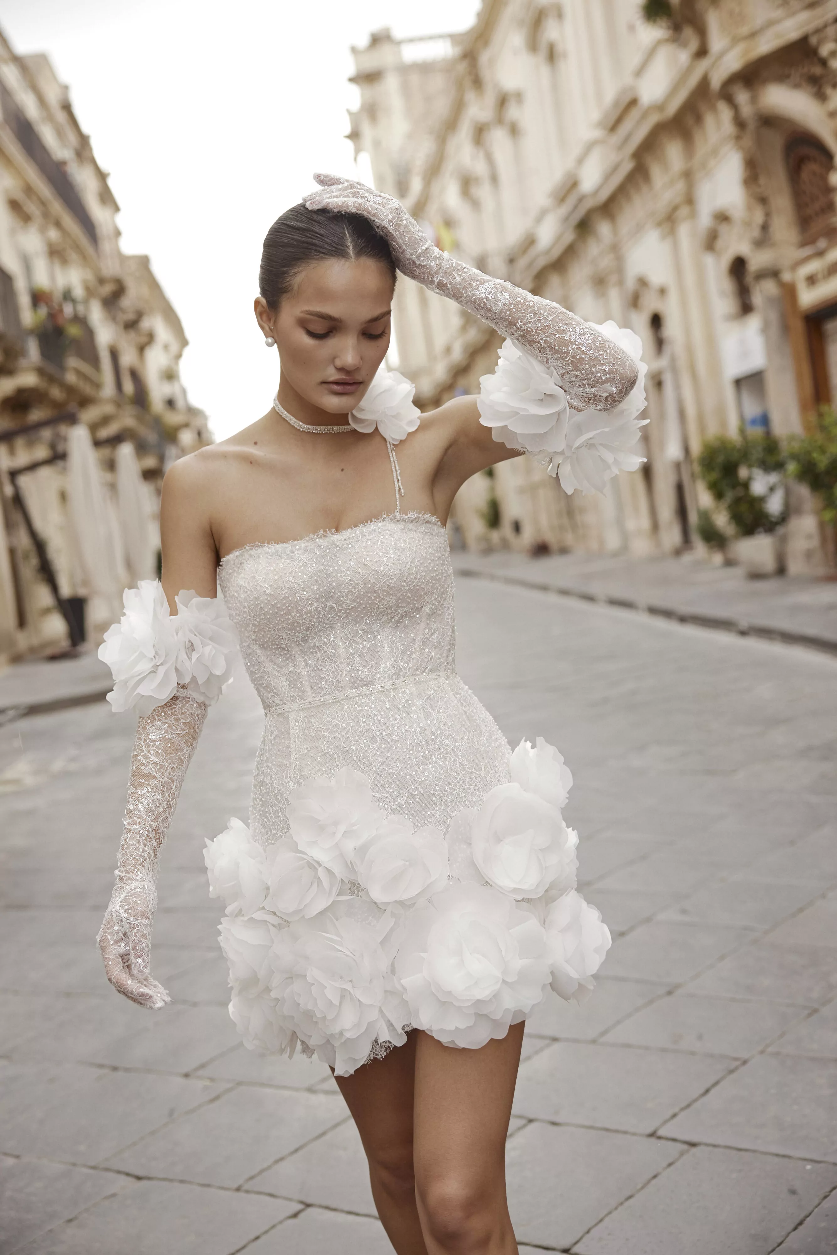 A dazzling strapless mini-bustier dress adorned with delicate lace, sequins, beads, and voluminous organza flowers. The dress can be complemented with gloves made from the same lace and floral decorations. Perfect as a second wedding dress or a go-out party dress