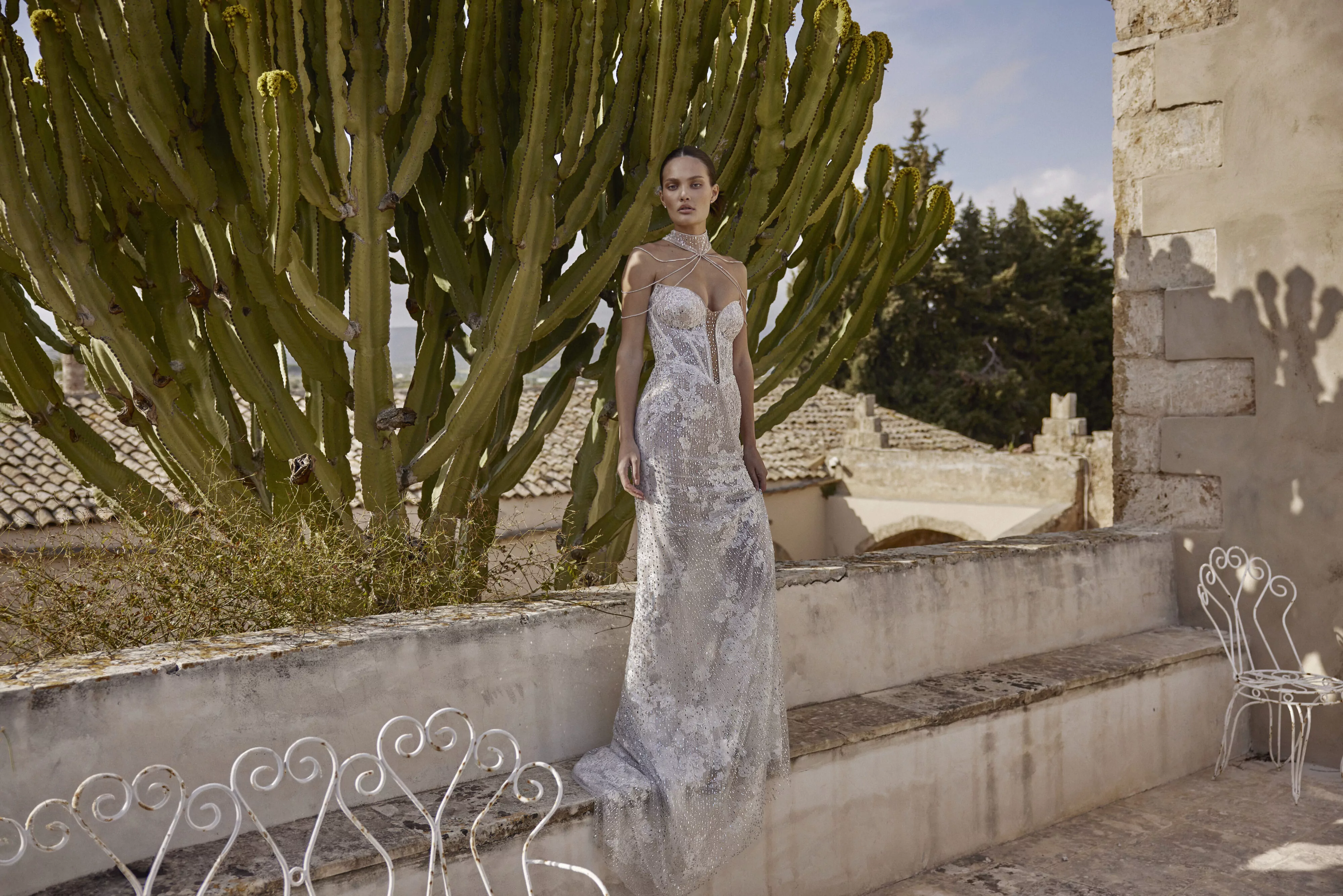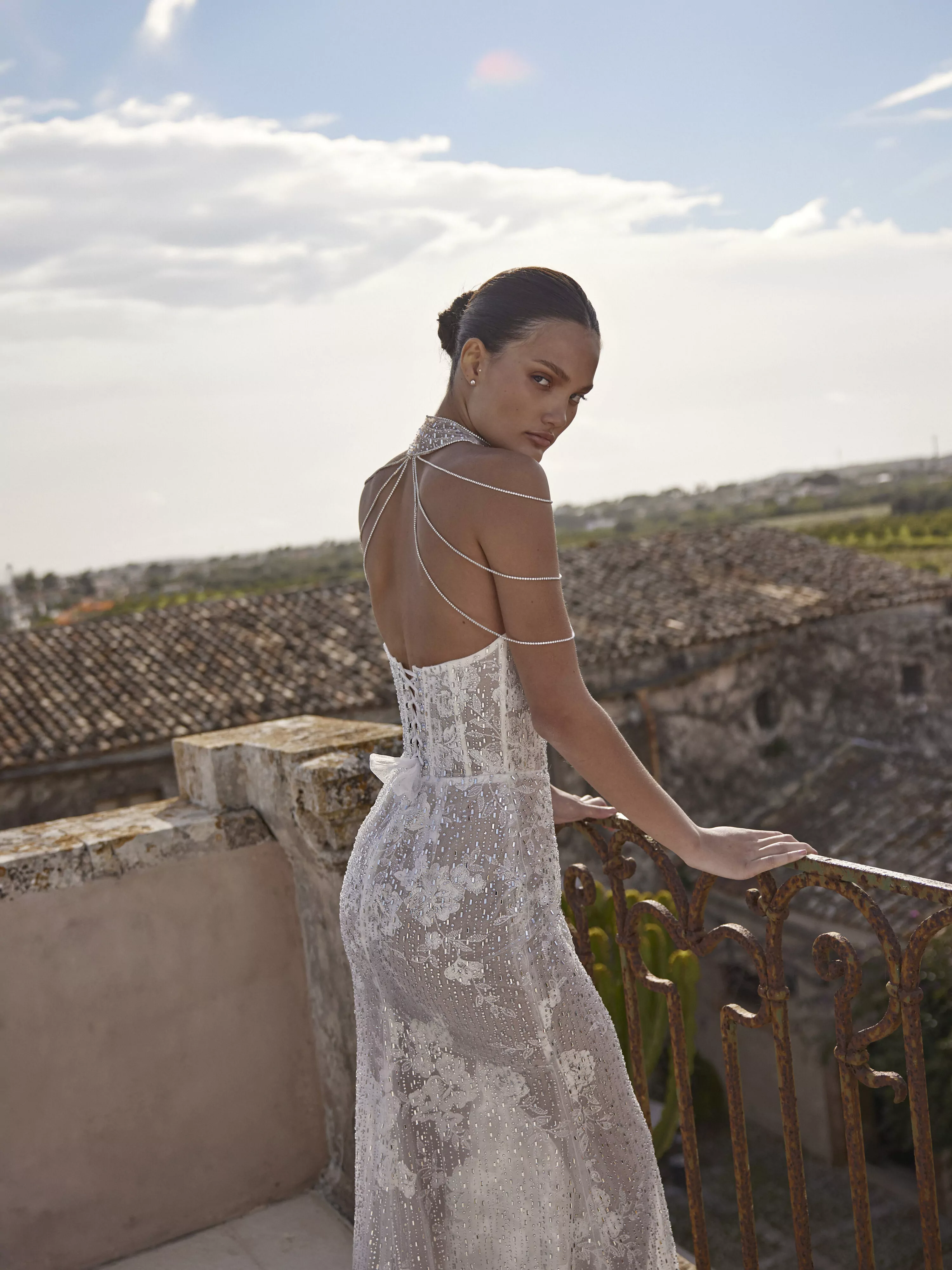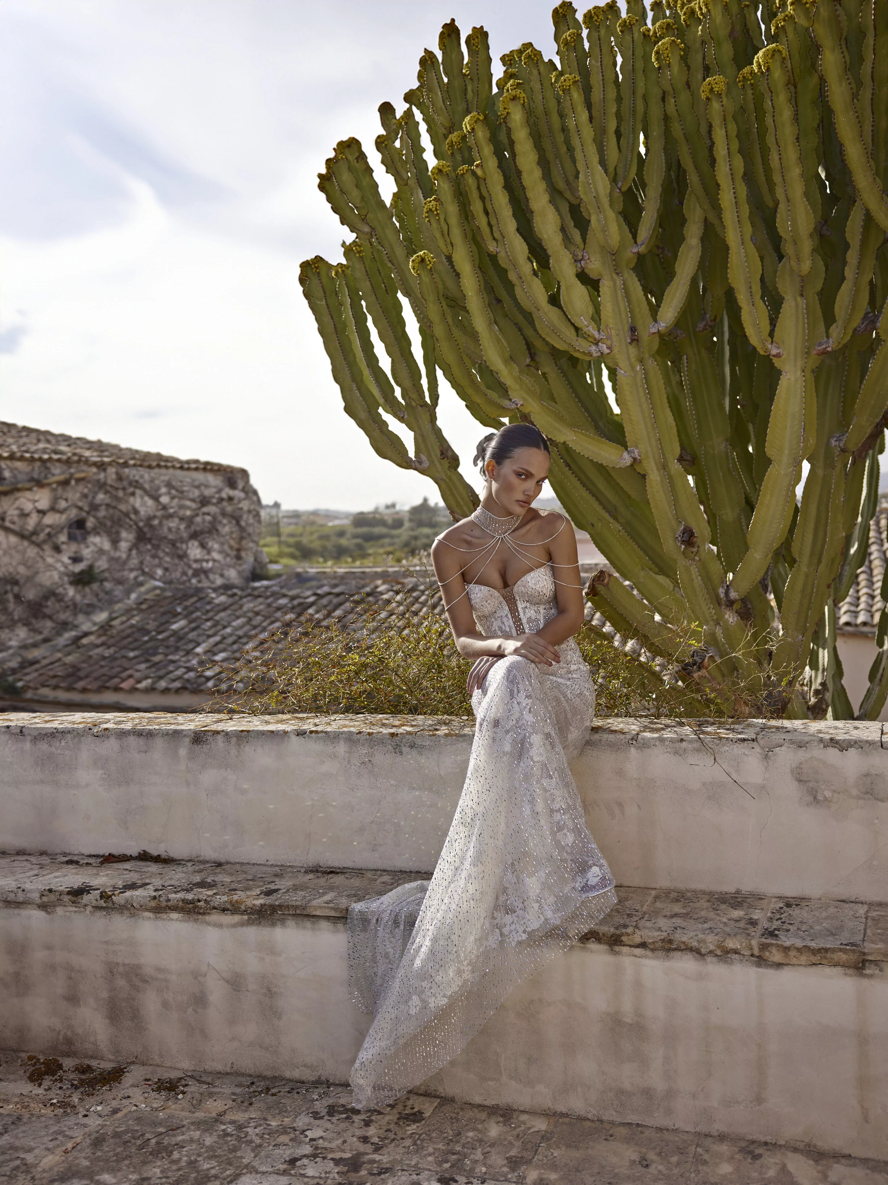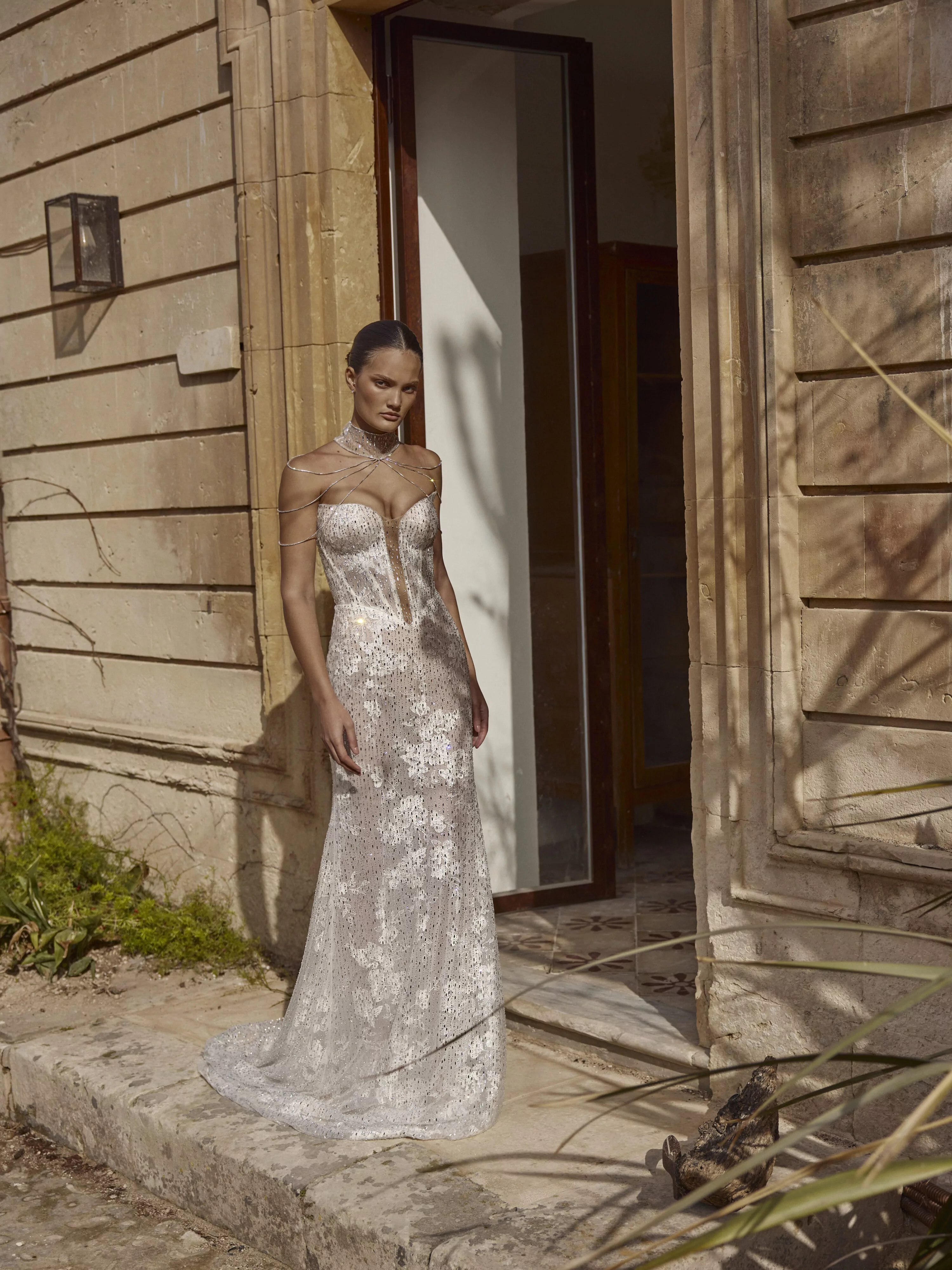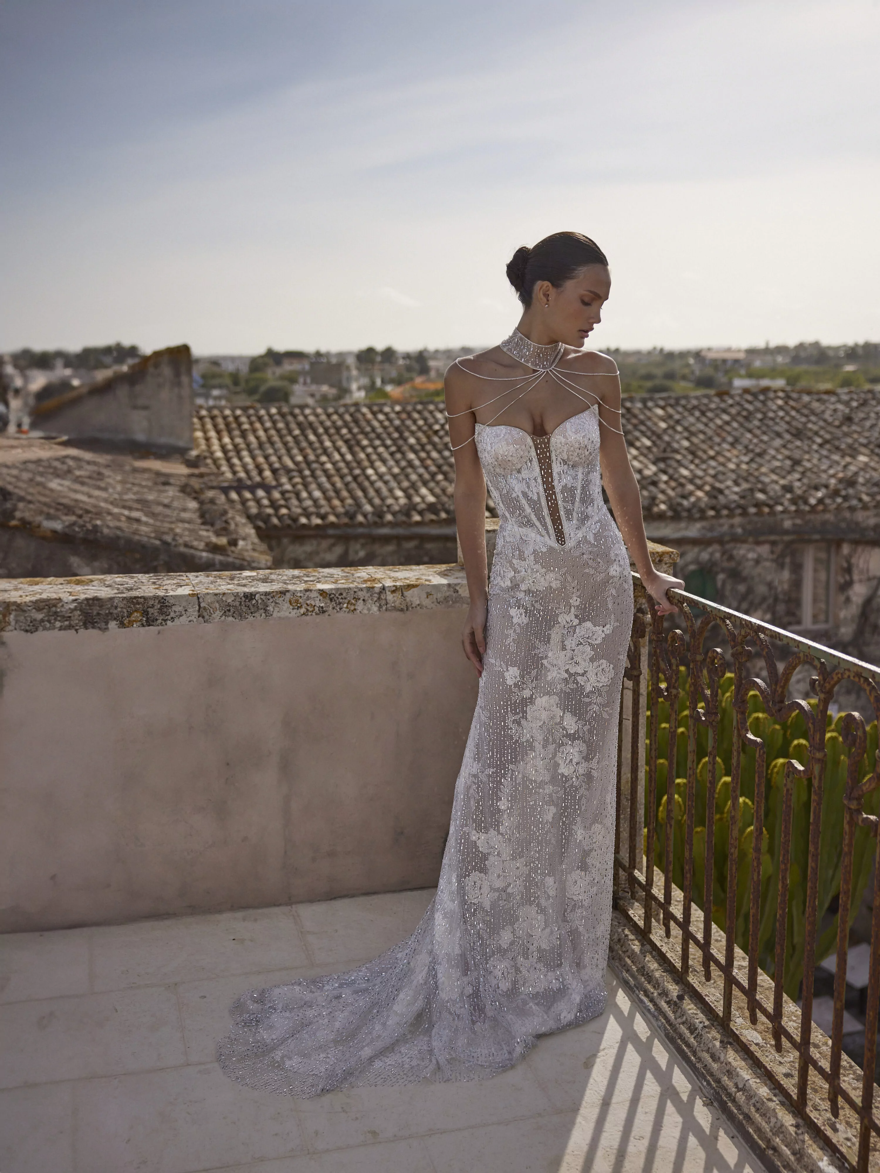 A glamorous semi-sheer straight dress, strapless and fully adorned. The dress features a daring illusion neckline embellished, and floral lace intertwined with crystals, creating a dazzling sparkle. Complete the look with a luxurious choker necklace cascading down the shoulders adorned with cristals accents.