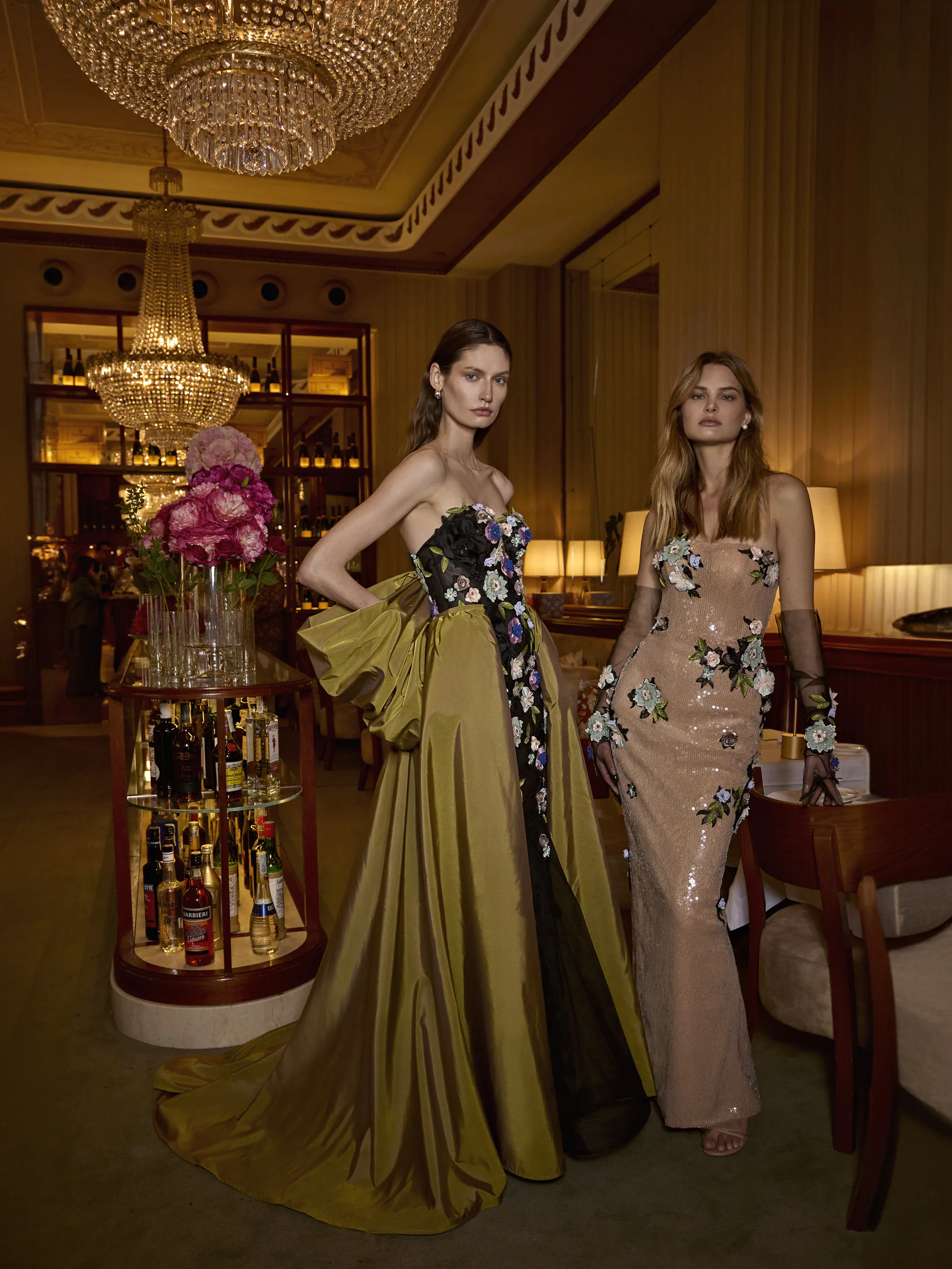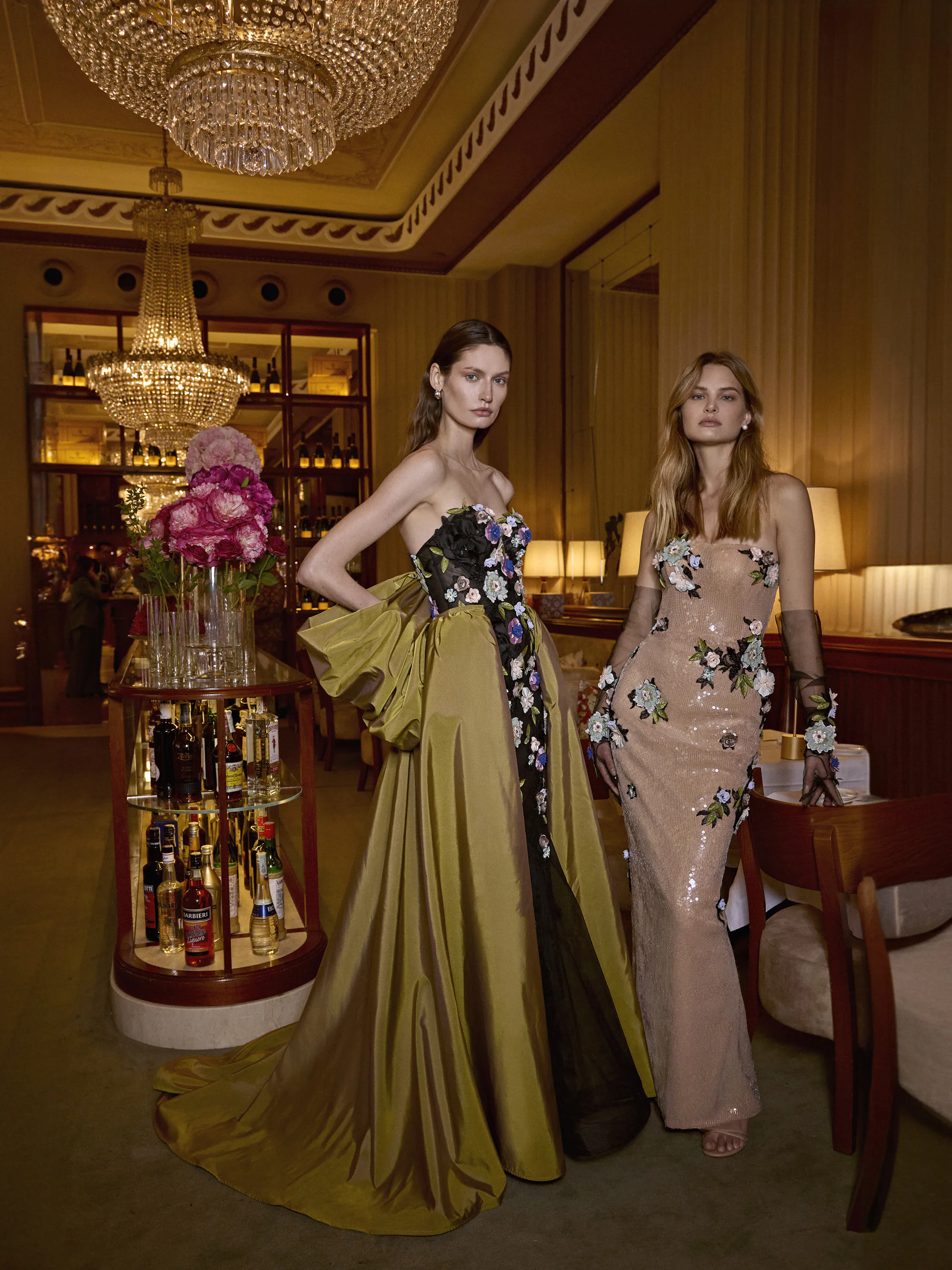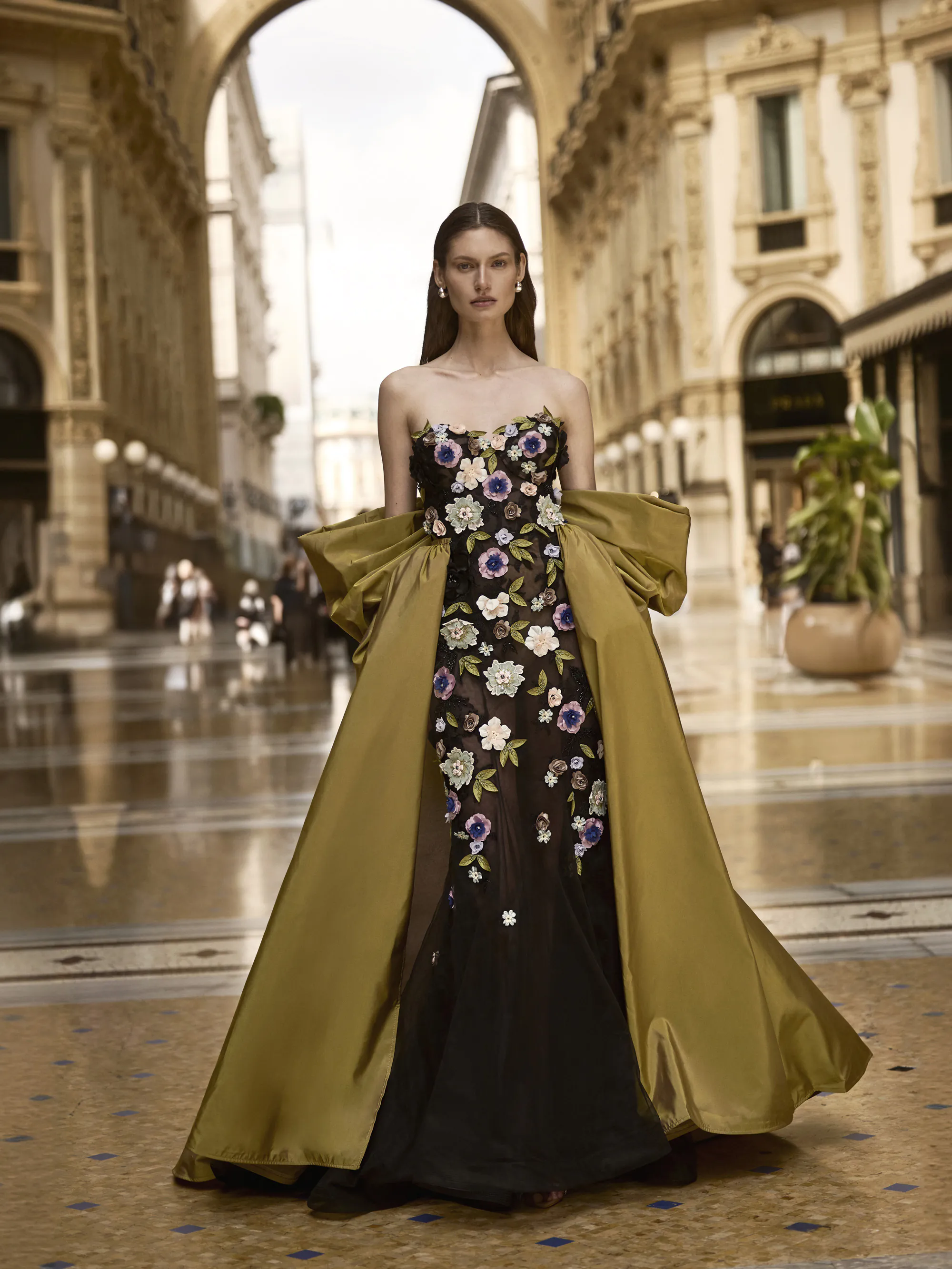 This black mesh mermaid gown is embellished with vibrant, multicolored 3D lace, creating a stunning floral effect. The dress features a detachable olive taffeta skirt that adds volume and drama, along with an oversized bow that can be worn on the arms for a romantic touch. A long train completes the look, adding elegance and sophistication to this show-stopping design.