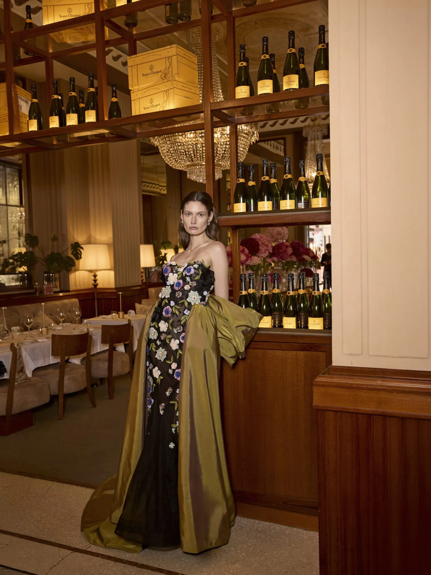 This black mesh mermaid gown is embellished with vibrant, multicolored 3D lace, creating a stunning floral effect. The dress features a detachable olive taffeta skirt that adds volume and drama, along with an oversized bow that can be worn on the arms for a romantic touch. A long train completes the look, adding elegance and sophistication to this show-stopping design.