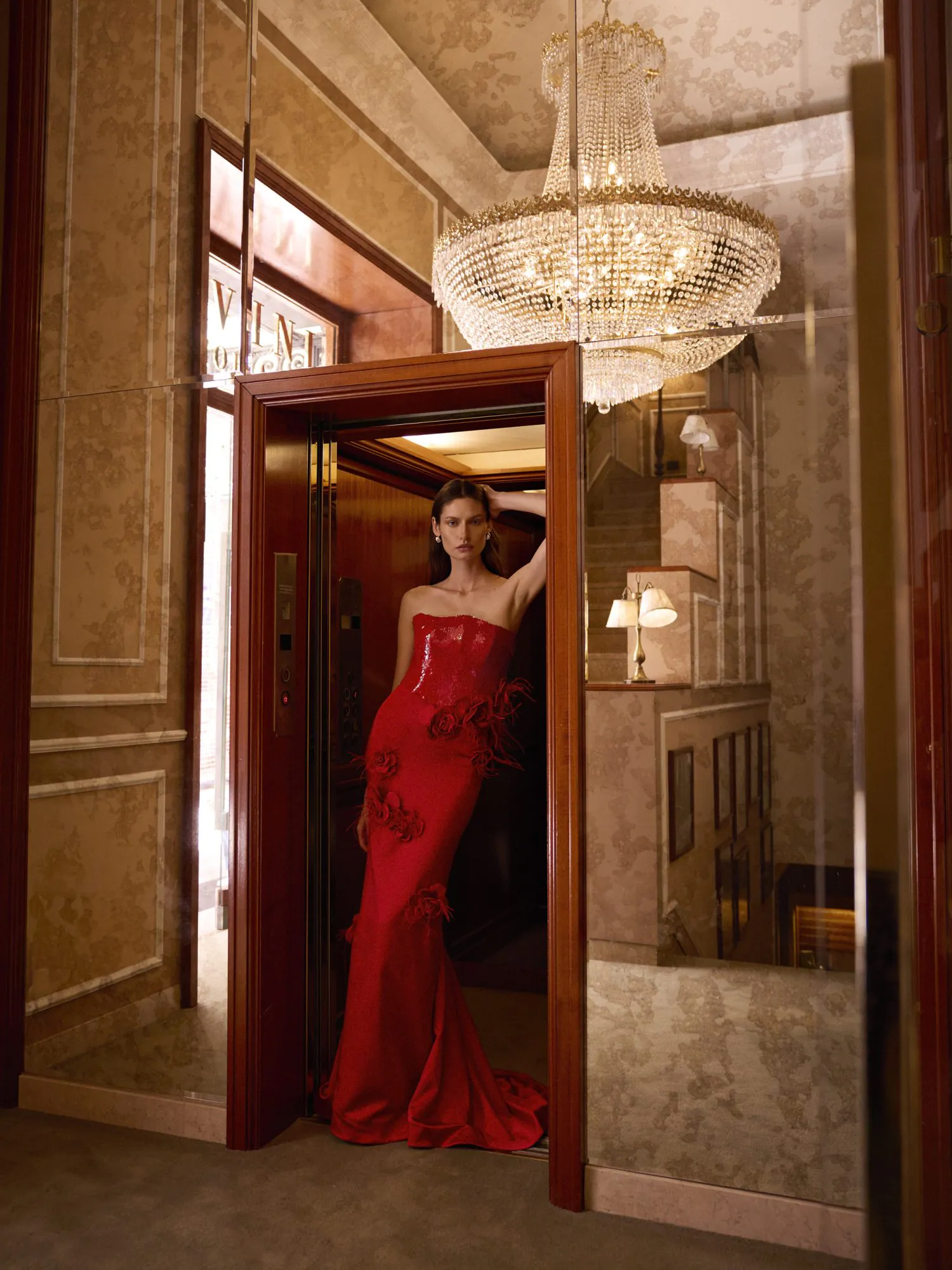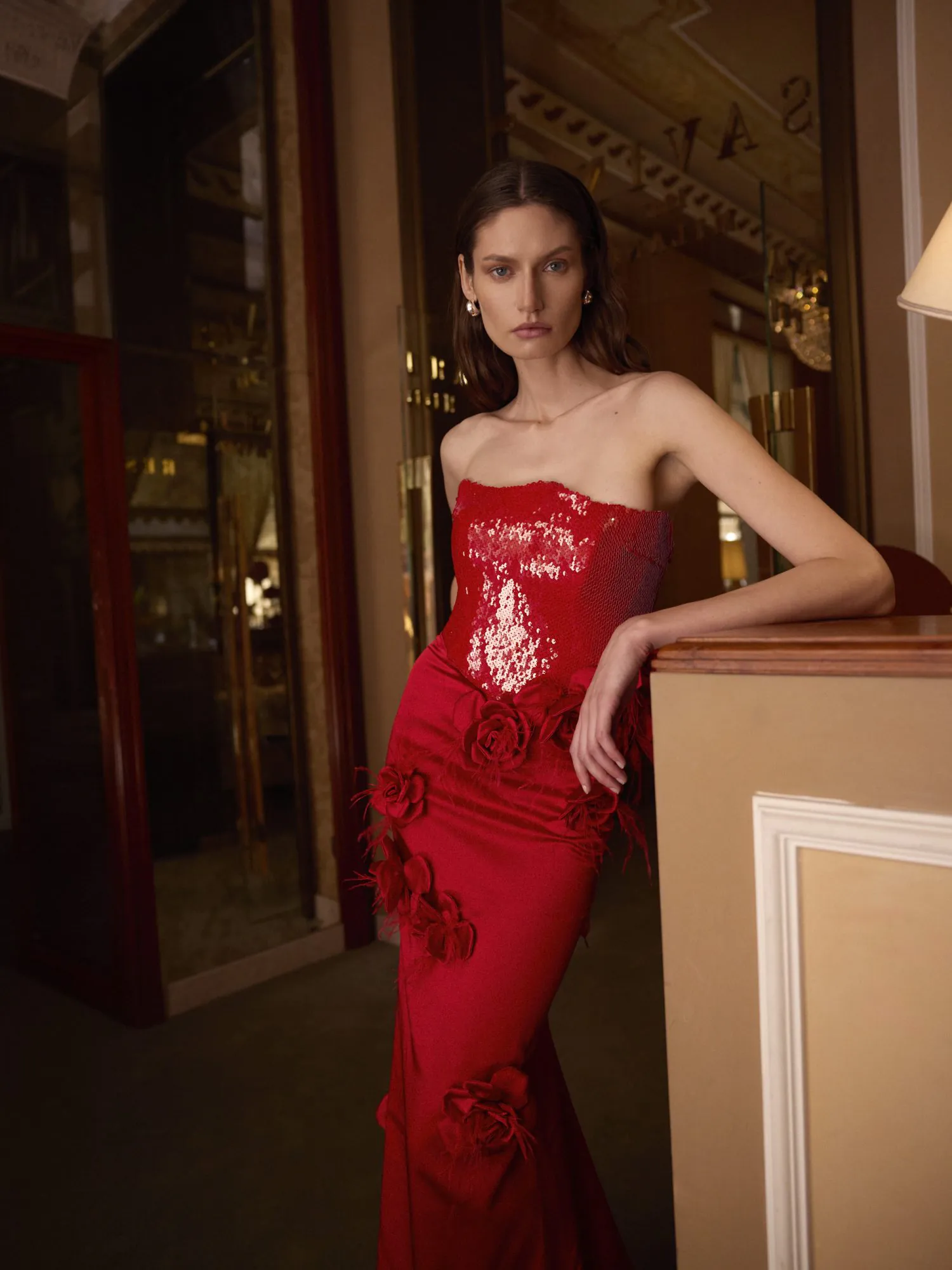 This red mermaid gown is crafted from stretch satin. The corset is adorned with shimmering sequins, adding a touch of glamour and sparkle. The dress is further decorated with elegant satin 3D roses and delicate feathers, creating a striking, romantic look.