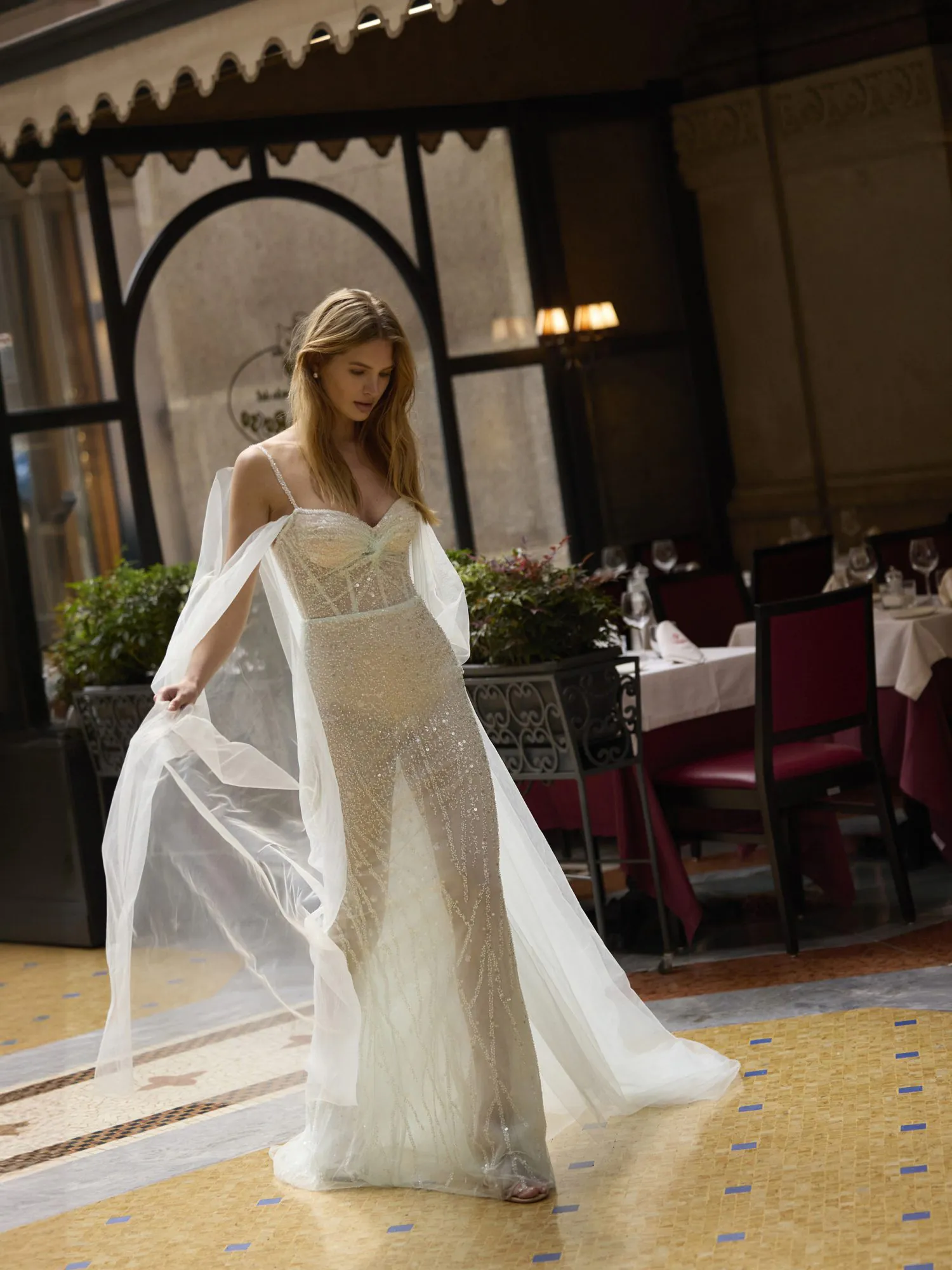 This semi-transparent mermaid-style dress in mint color is crafted from delicate lace, adorned with shimmering beads that add a subtle, sparkling detail. The nude-colored bodysuit underneath ensures comfort and coverage. Removable mesh wings complete the look, adding a whimsical and ethereal touch.